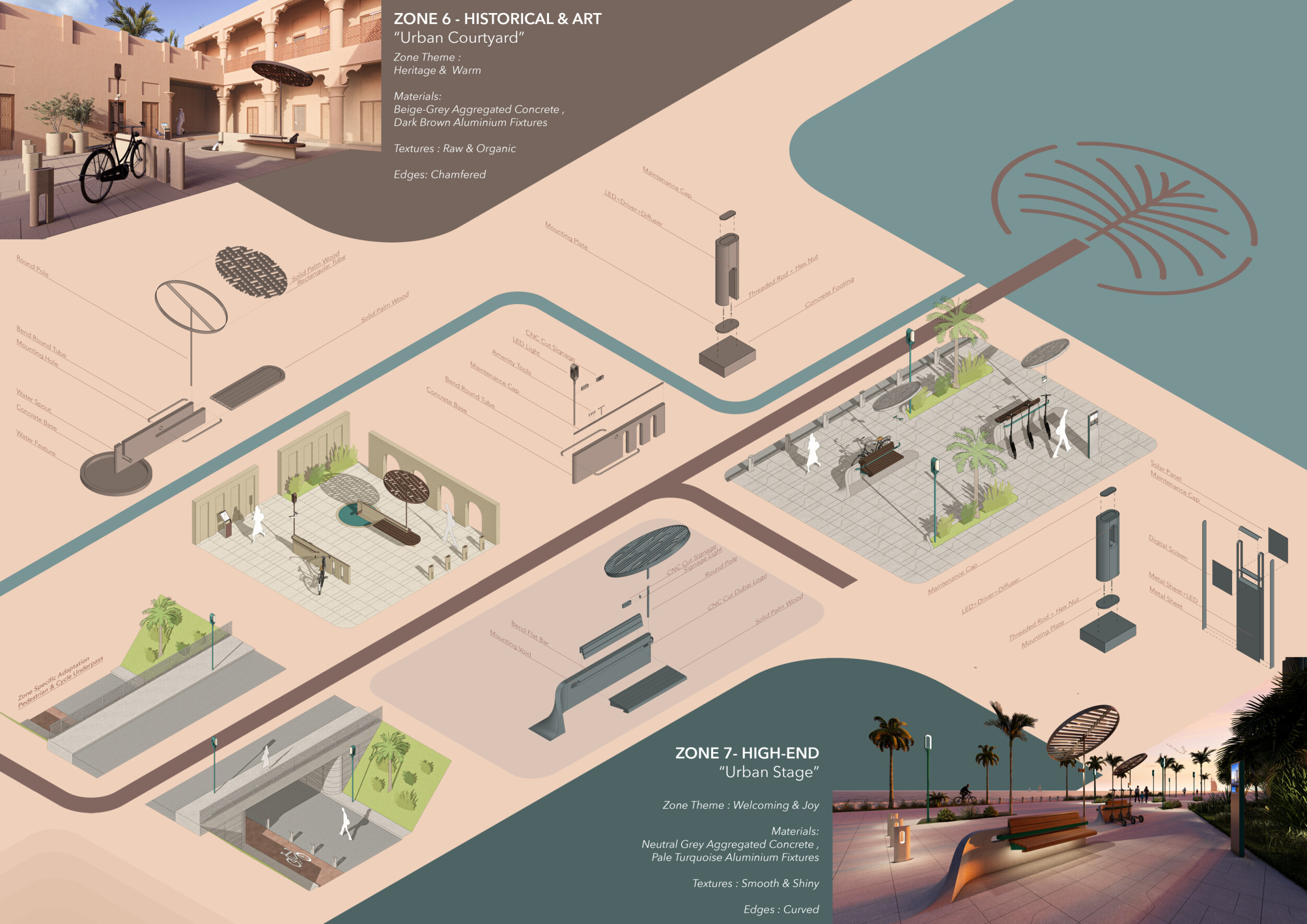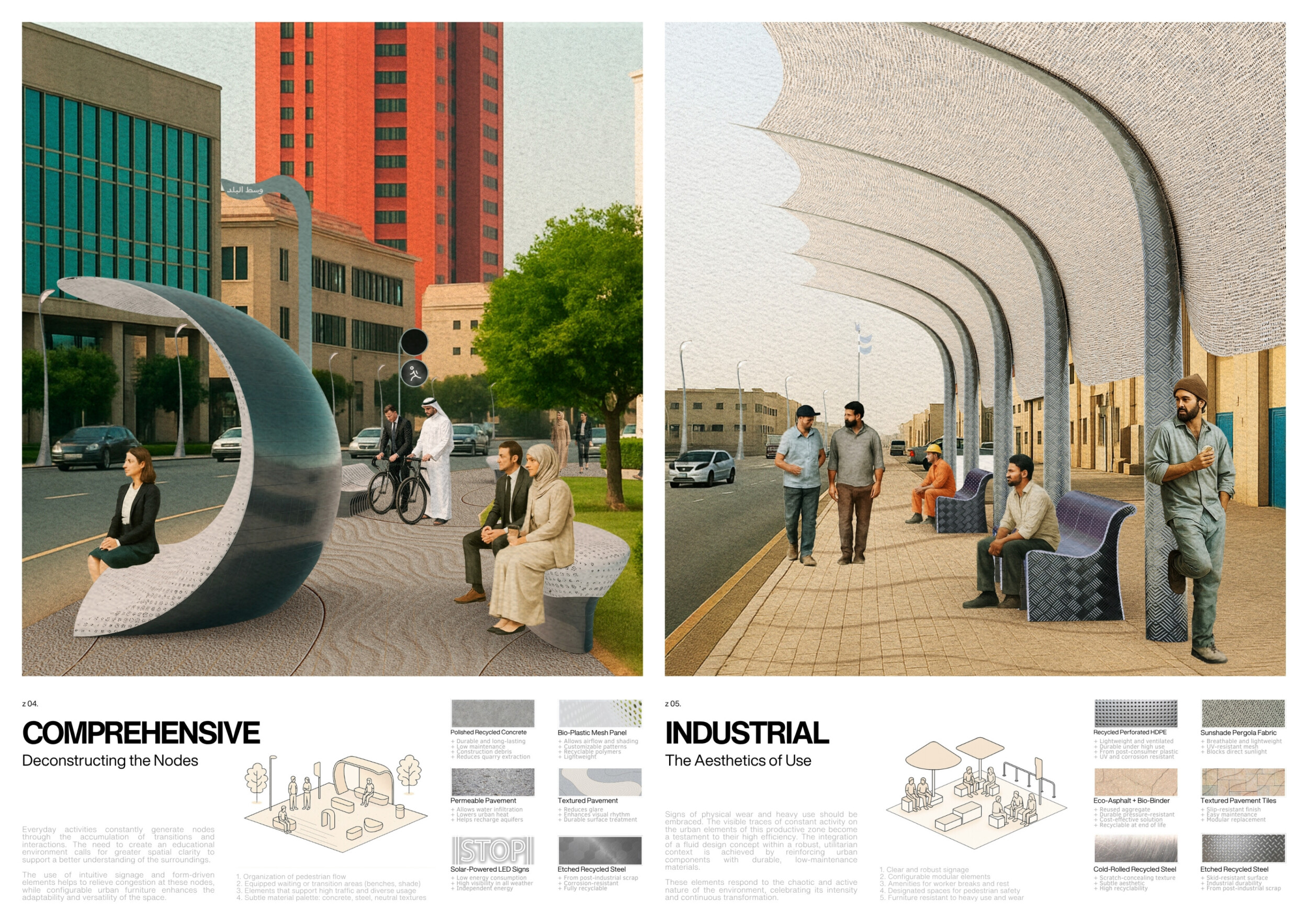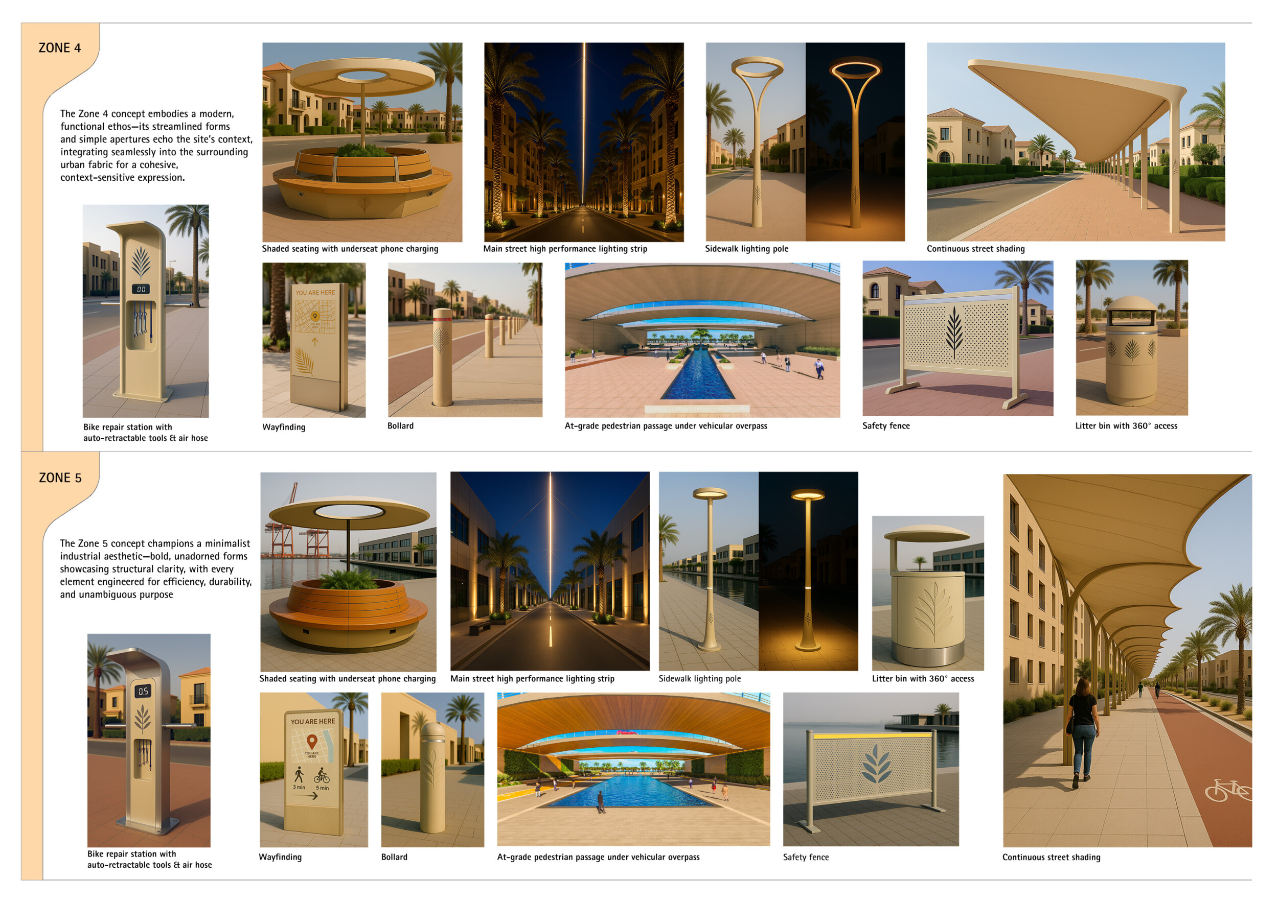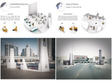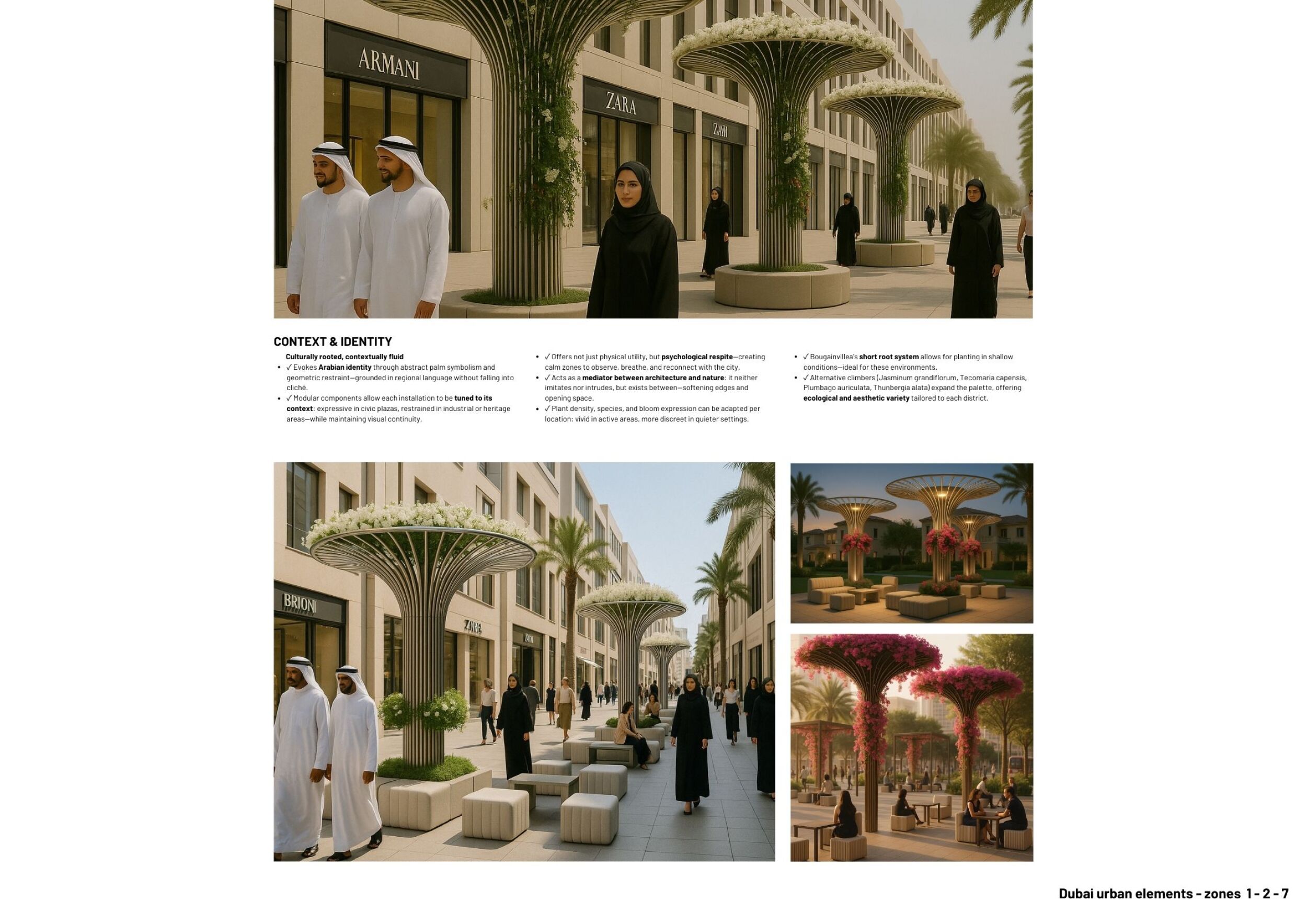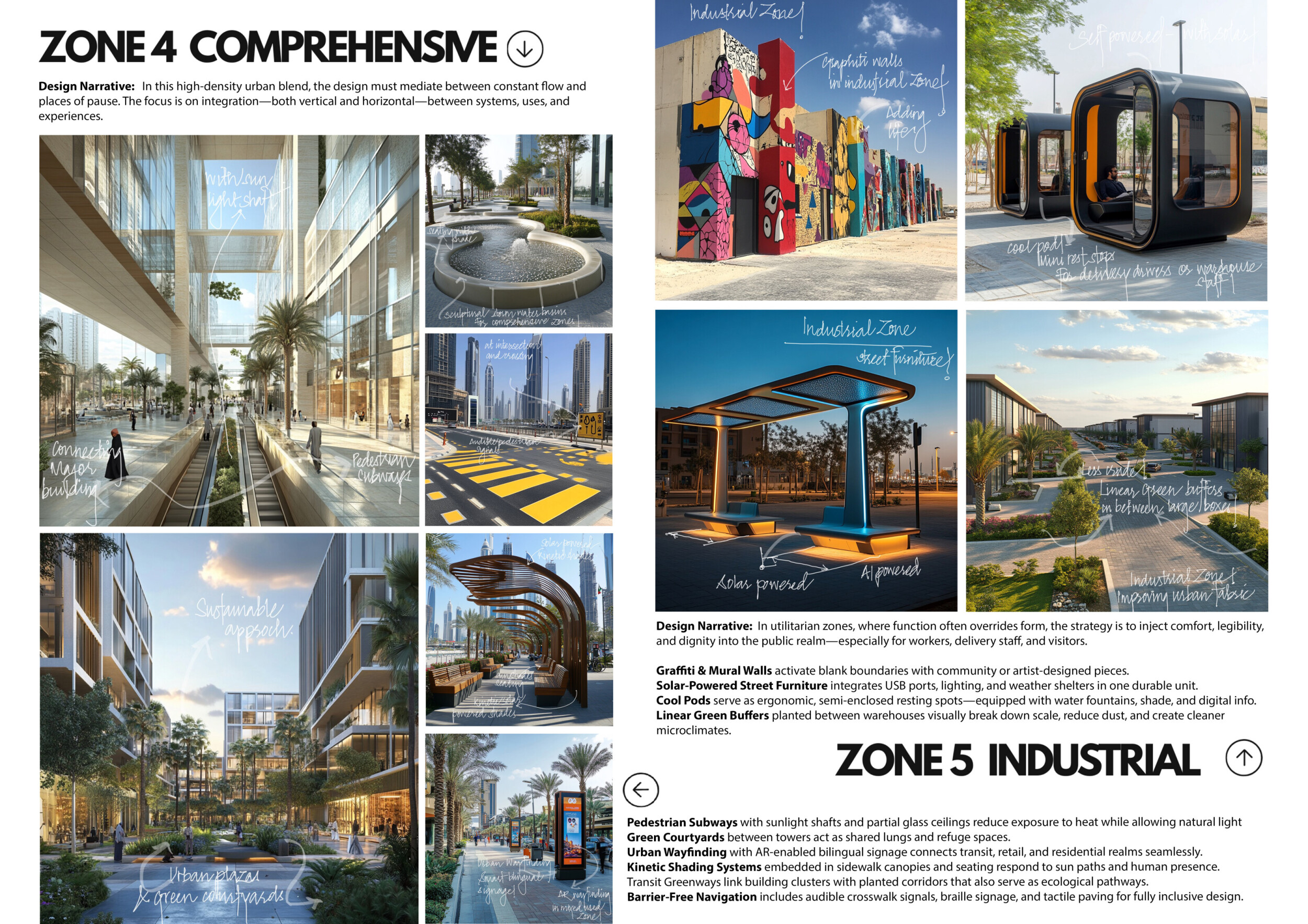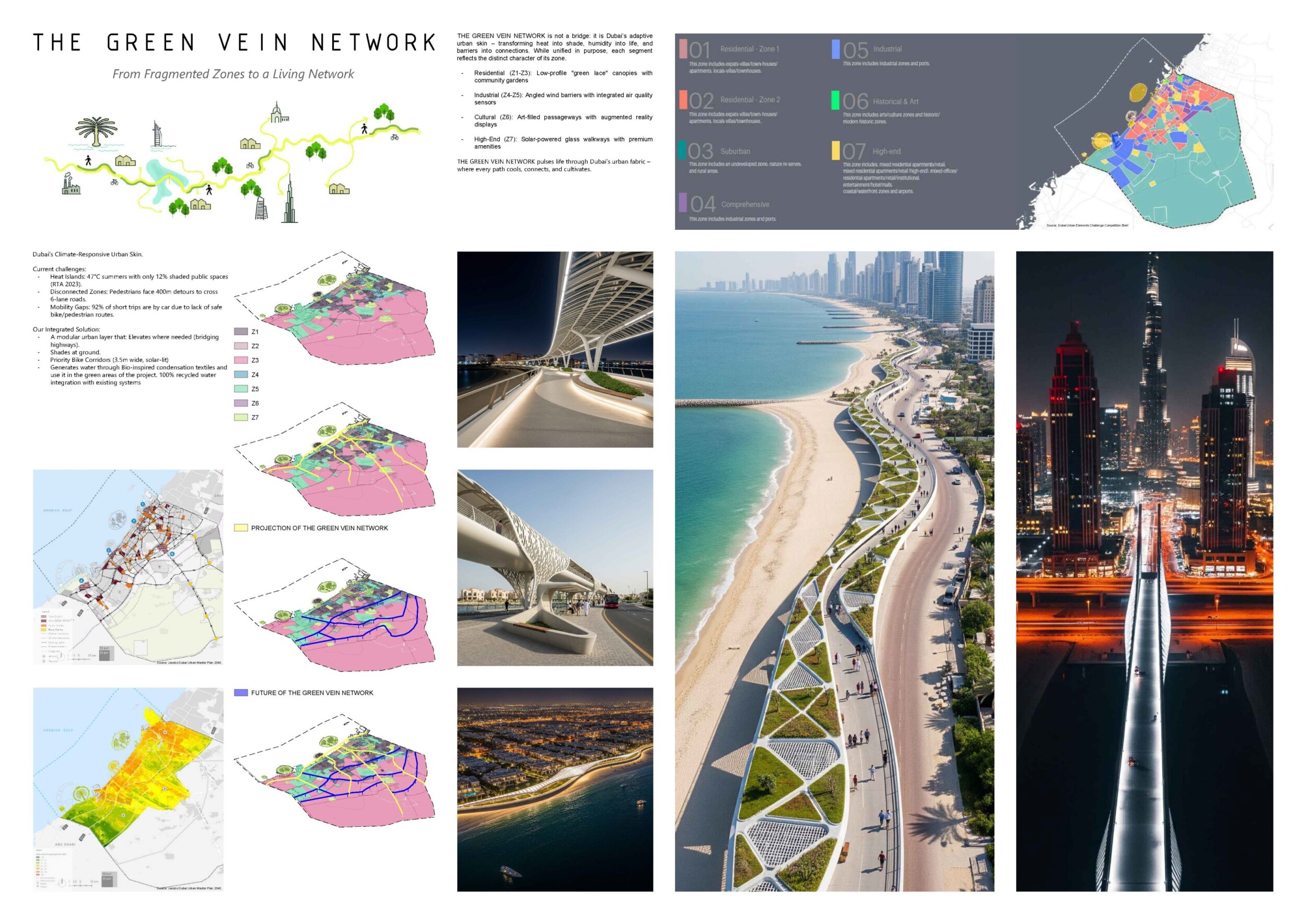 This proposal establishes a cohesive urban design system tailored to Dubai’s diverse zoning contexts, translating each area’s cultural, climatic, and programmatic character into a unified streetscape language. Seven distinct zone typologies—ranging from residential to industrial, heritage, and high-end—are articulated through a matrix of core geometries, modular shading elements, curated material palettes, and contextual wayfinding. Read more Each typology introduces unique visual identifiers: Z1 and Z2 draw on Islamic motifs and neighborhood intimacy, Z3 evokes Bedouin tents and soft landforms, while Z5 and Z7 leverage sharper geometries and premium finishes to express industrial rigor or luxury. The proposal integrates shading, pedestrian bridges, solar infrastructure, and street furniture into cohesive kit-of-parts systems adaptable across road hierarchies and public interfaces. Artistic co-design, climate-responsive strategies, and heritage continuity are embedded throughout, ensuring visual consistency while accommodating Dubai’s rapid growth, diverse urban fabrics, and the need for identity-driven public realm enhancements.