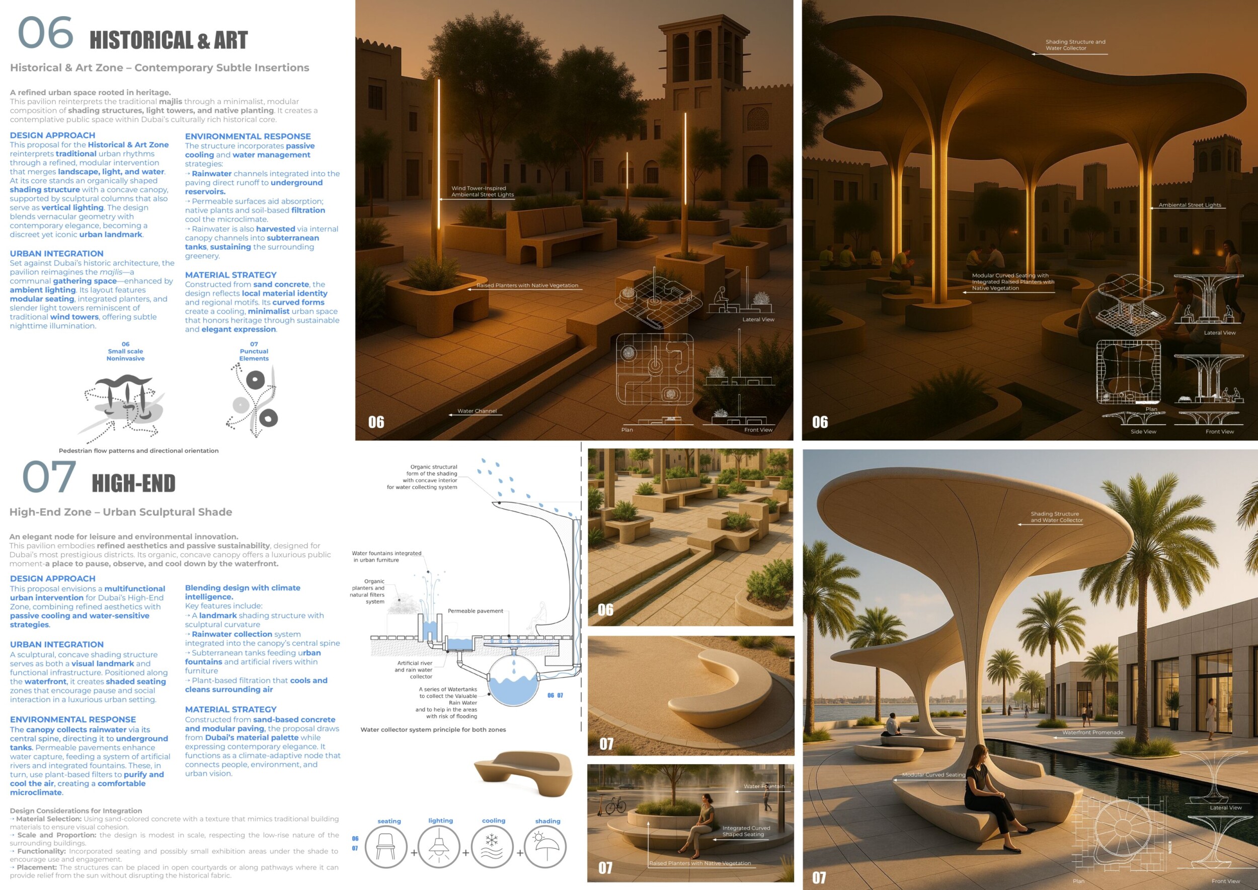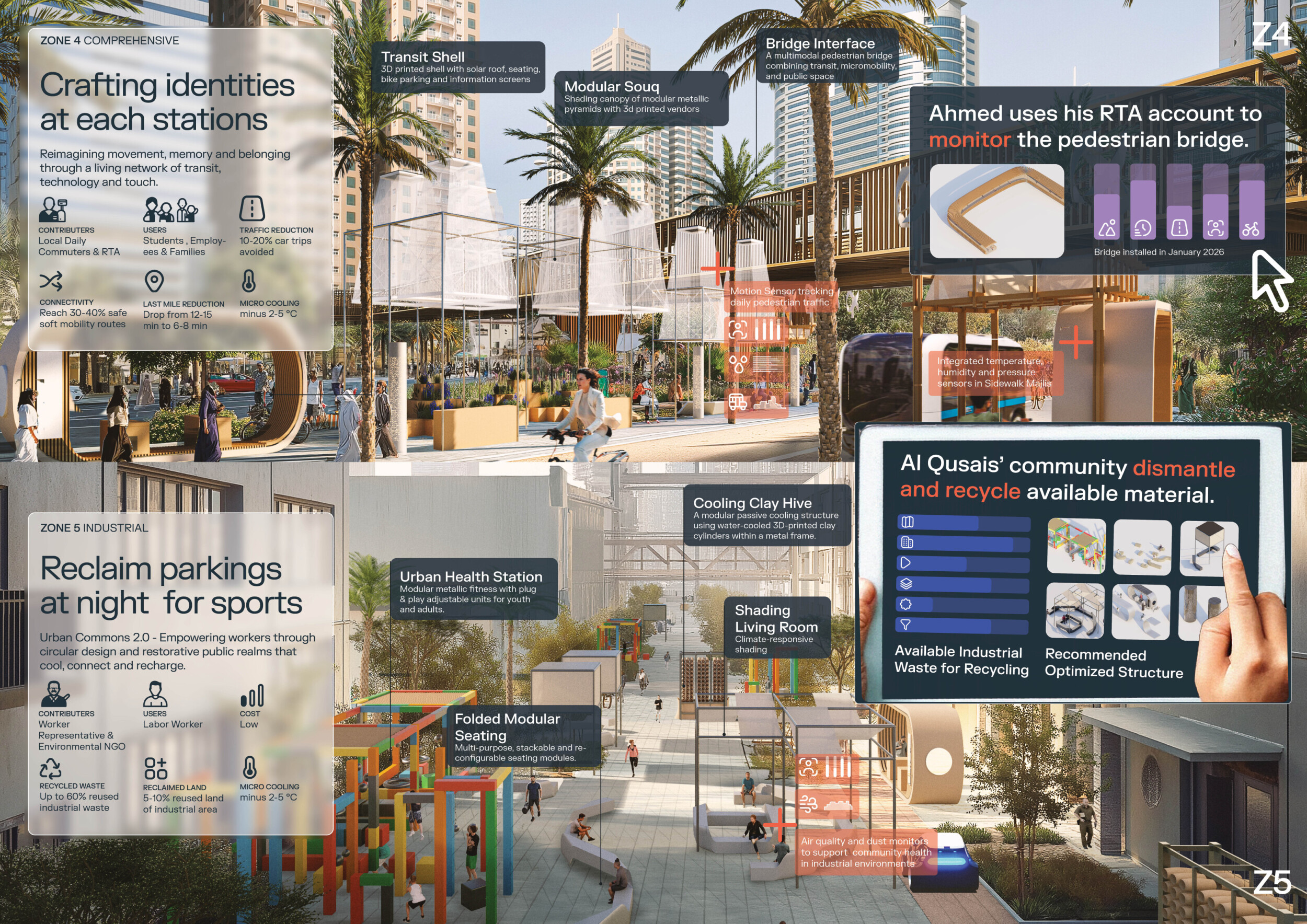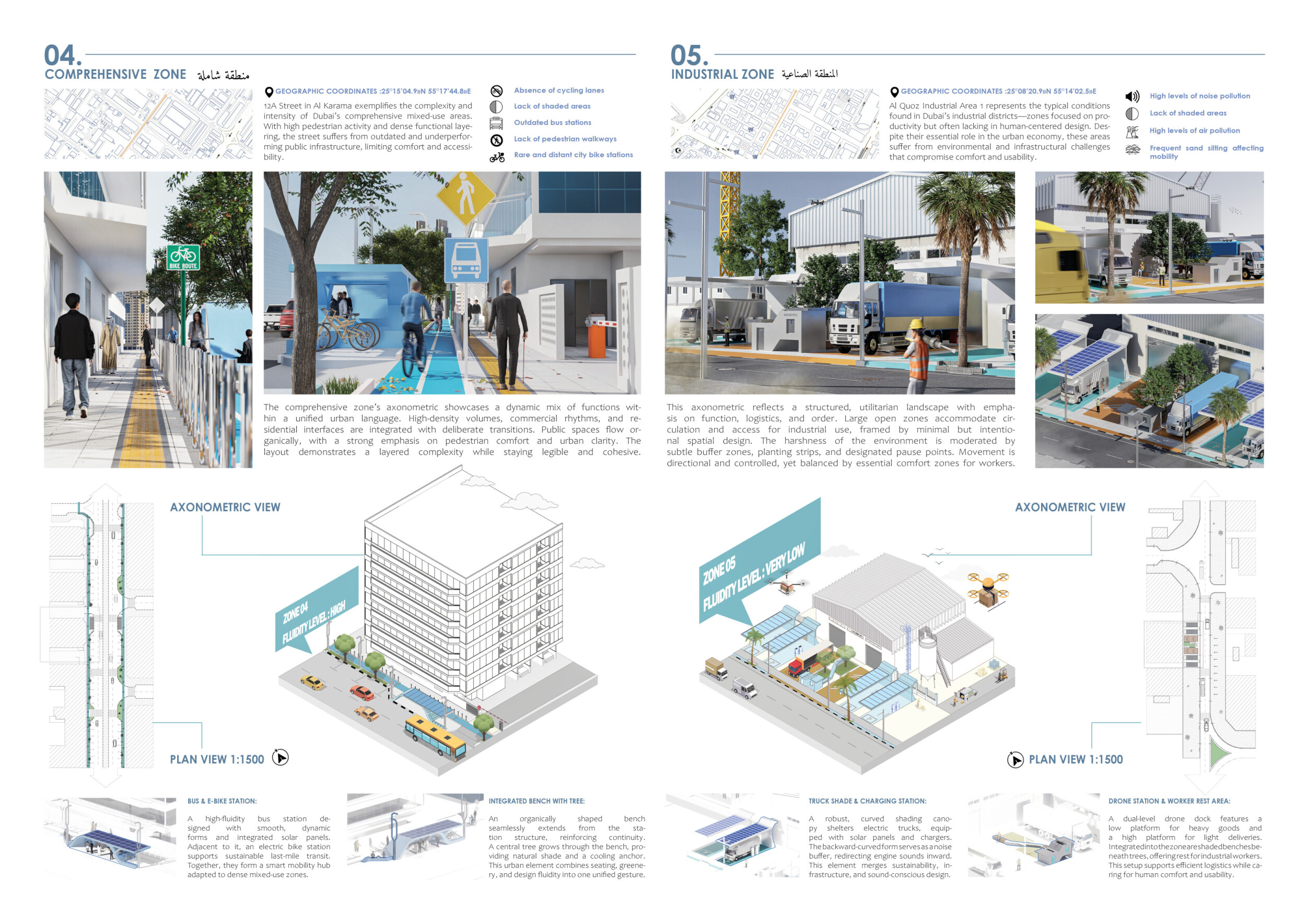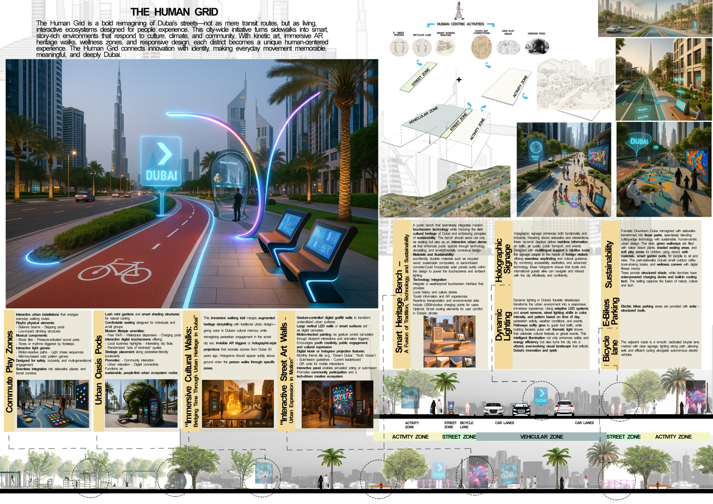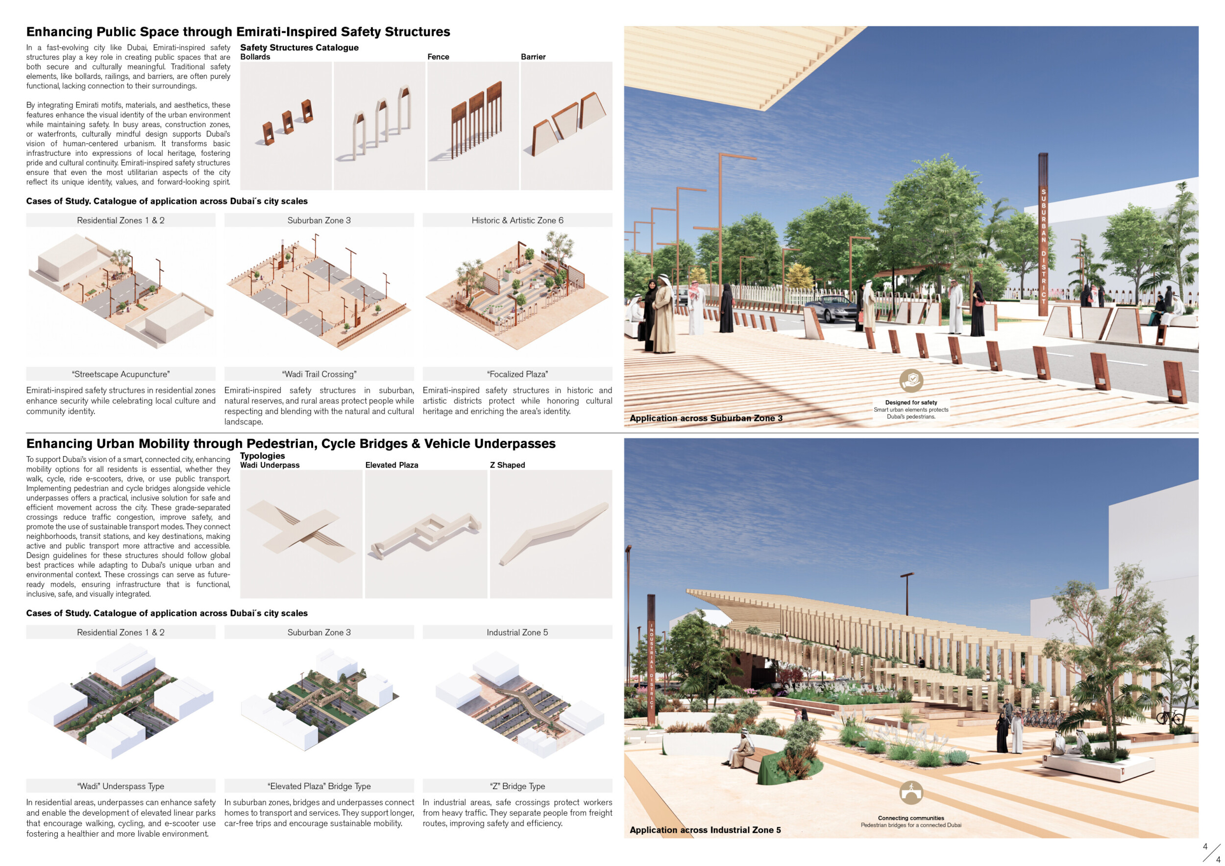 This proposal establishes a cohesive urban design system tailored to Dubai’s diverse zoning contexts, translating each area’s cultural, climatic, and programmatic character into a unified streetscape language. Seven distinct zone typologies—ranging from residential to industrial, heritage, and high-end—are articulated through a matrix of core geometries, modular shading elements, curated material palettes, and contextual wayfinding. Read more Each typology introduces unique visual identifiers: Z1 and Z2 draw on Islamic motifs and neighborhood intimacy, Z3 evokes Bedouin tents and soft landforms, while Z5 and Z7 leverage sharper geometries and premium finishes to express industrial rigor or luxury. The proposal integrates shading, pedestrian bridges, solar infrastructure, and street furniture into cohesive kit-of-parts systems adaptable across road hierarchies and public interfaces. Artistic co-design, climate-responsive strategies, and heritage continuity are embedded throughout, ensuring visual consistency while accommodating Dubai’s rapid growth, diverse urban fabrics, and the need for identity-driven public realm enhancements.