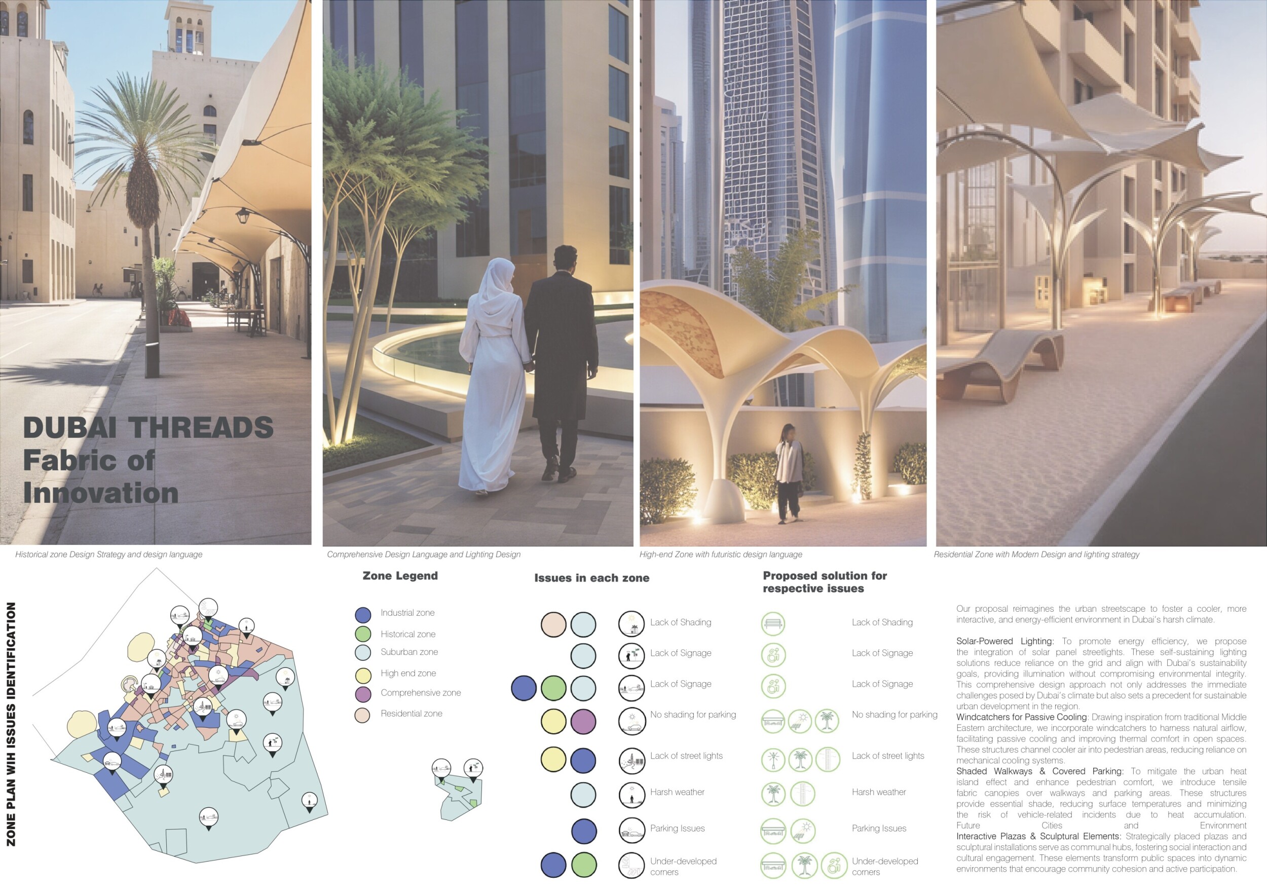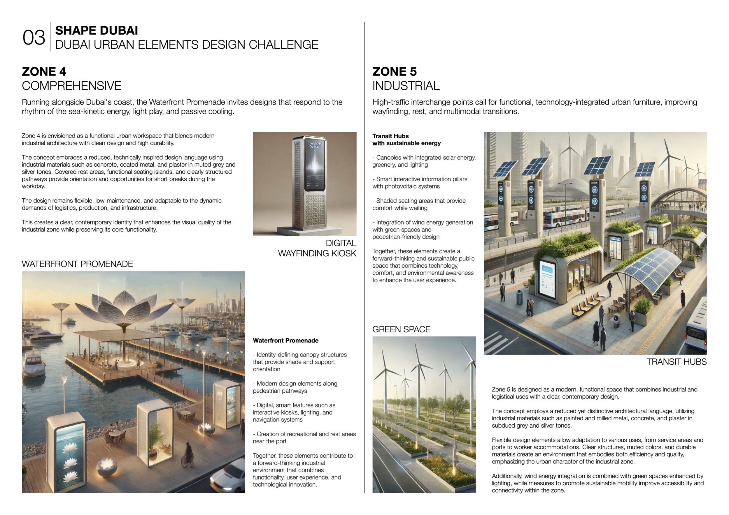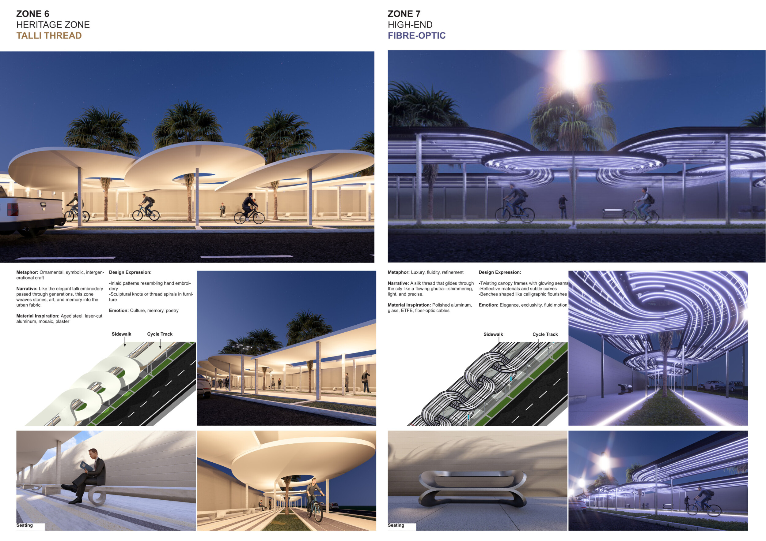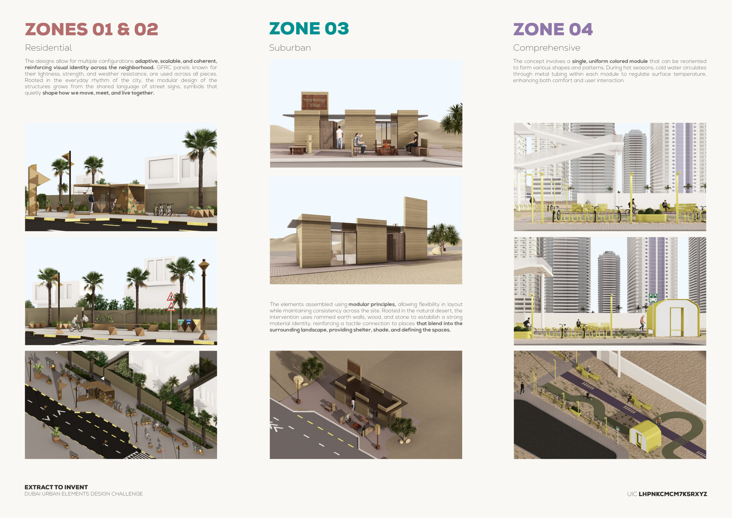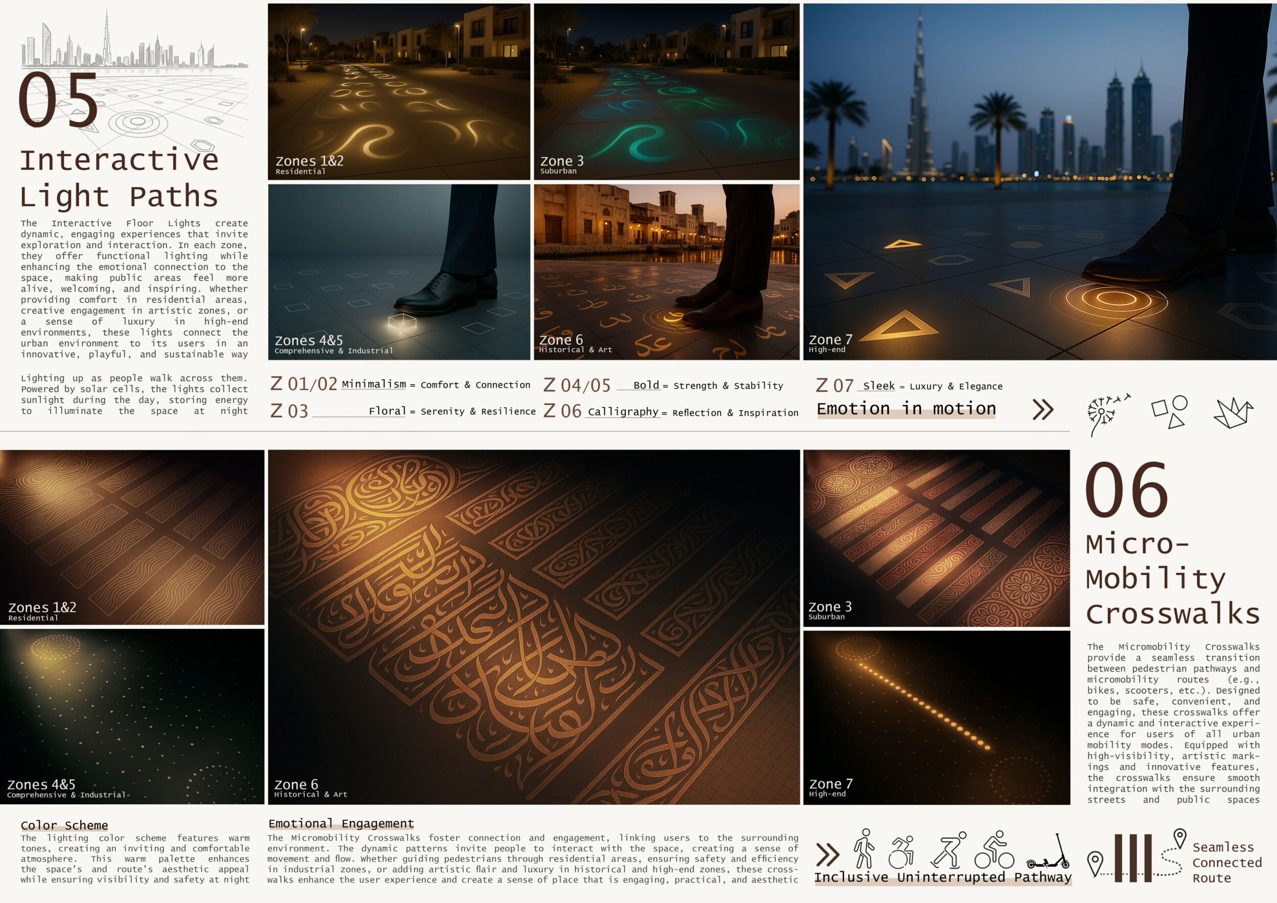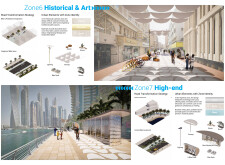This proposal establishes a cohesive urban design system tailored to Dubai’s diverse zoning contexts, translating each area’s cultural, climatic, and programmatic character into a unified streetscape language. Seven distinct zone typologies—ranging from residential to industrial, heritage, and high-end—are articulated through a matrix of core geometries, modular shading elements, curated material palettes, and contextual wayfinding. Read more Each typology introduces unique visual identifiers: Z1 and Z2 draw on Islamic motifs and neighborhood intimacy, Z3 evokes Bedouin tents and soft landforms, while Z5 and Z7 leverage sharper geometries and premium finishes to express industrial rigor or luxury. The proposal integrates shading, pedestrian bridges, solar infrastructure, and street furniture into cohesive kit-of-parts systems adaptable across road hierarchies and public interfaces. Artistic co-design, climate-responsive strategies, and heritage continuity are embedded throughout, ensuring visual consistency while accommodating Dubai’s rapid growth, diverse urban fabrics, and the need for identity-driven public realm enhancements.