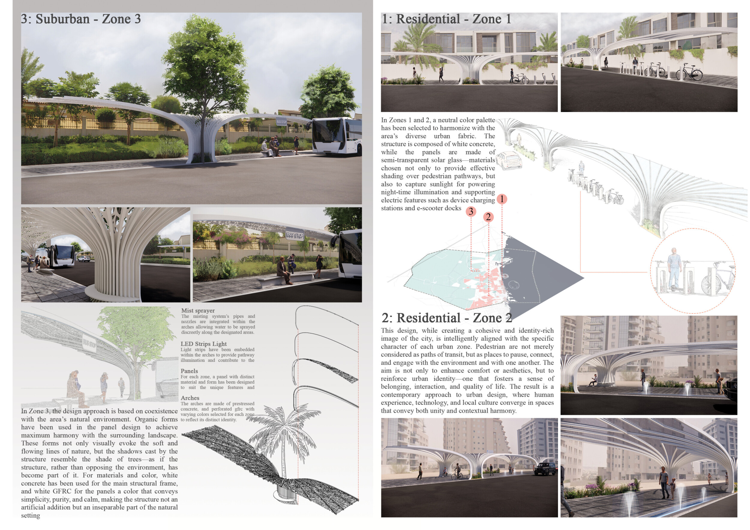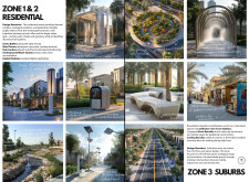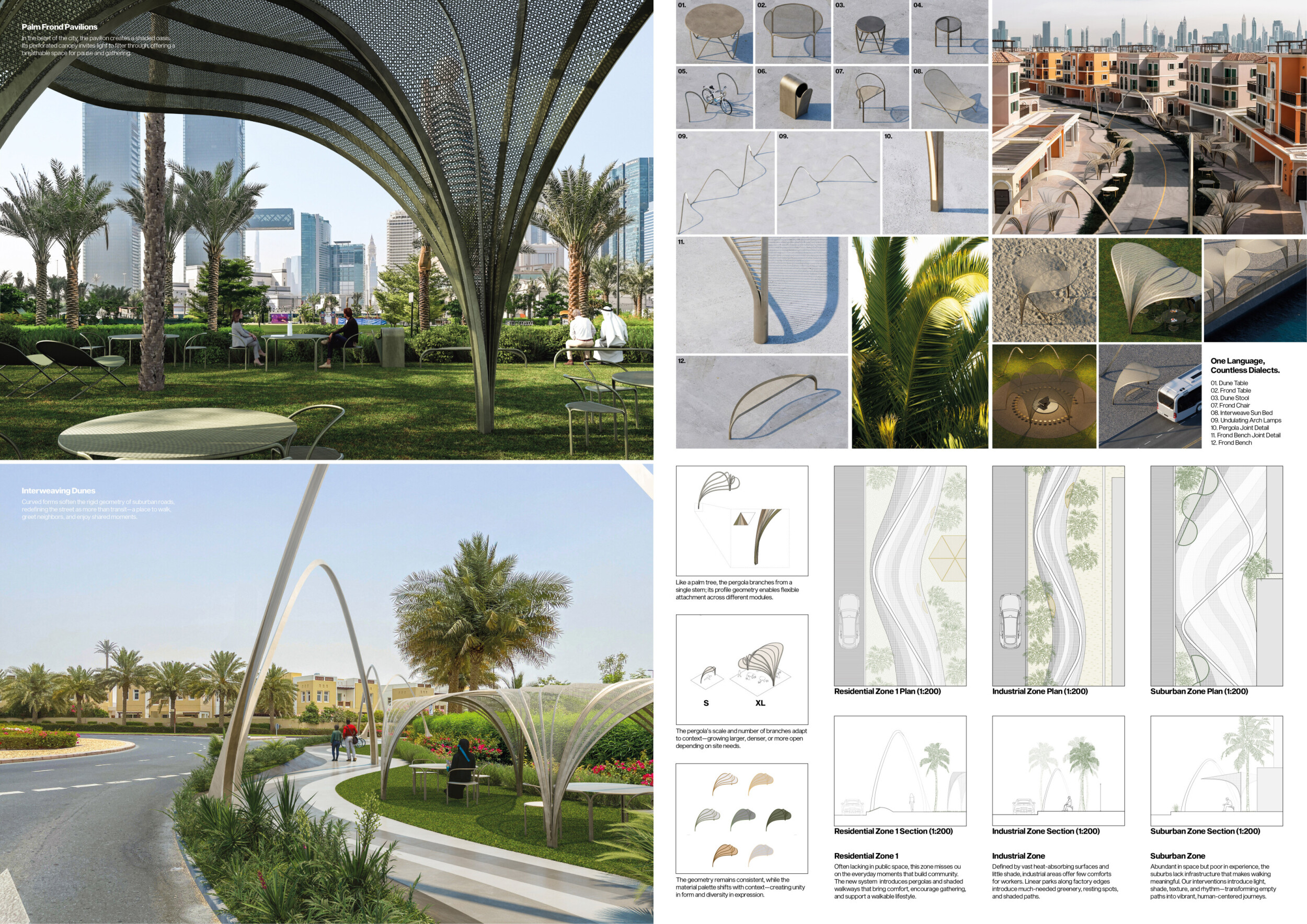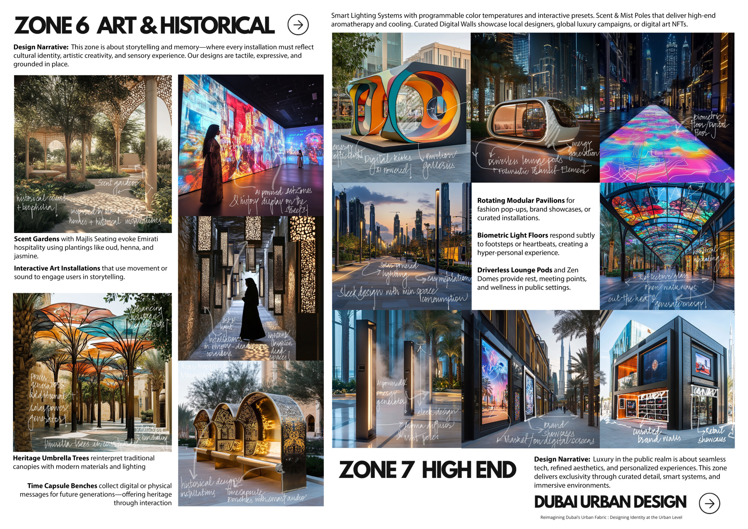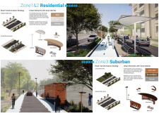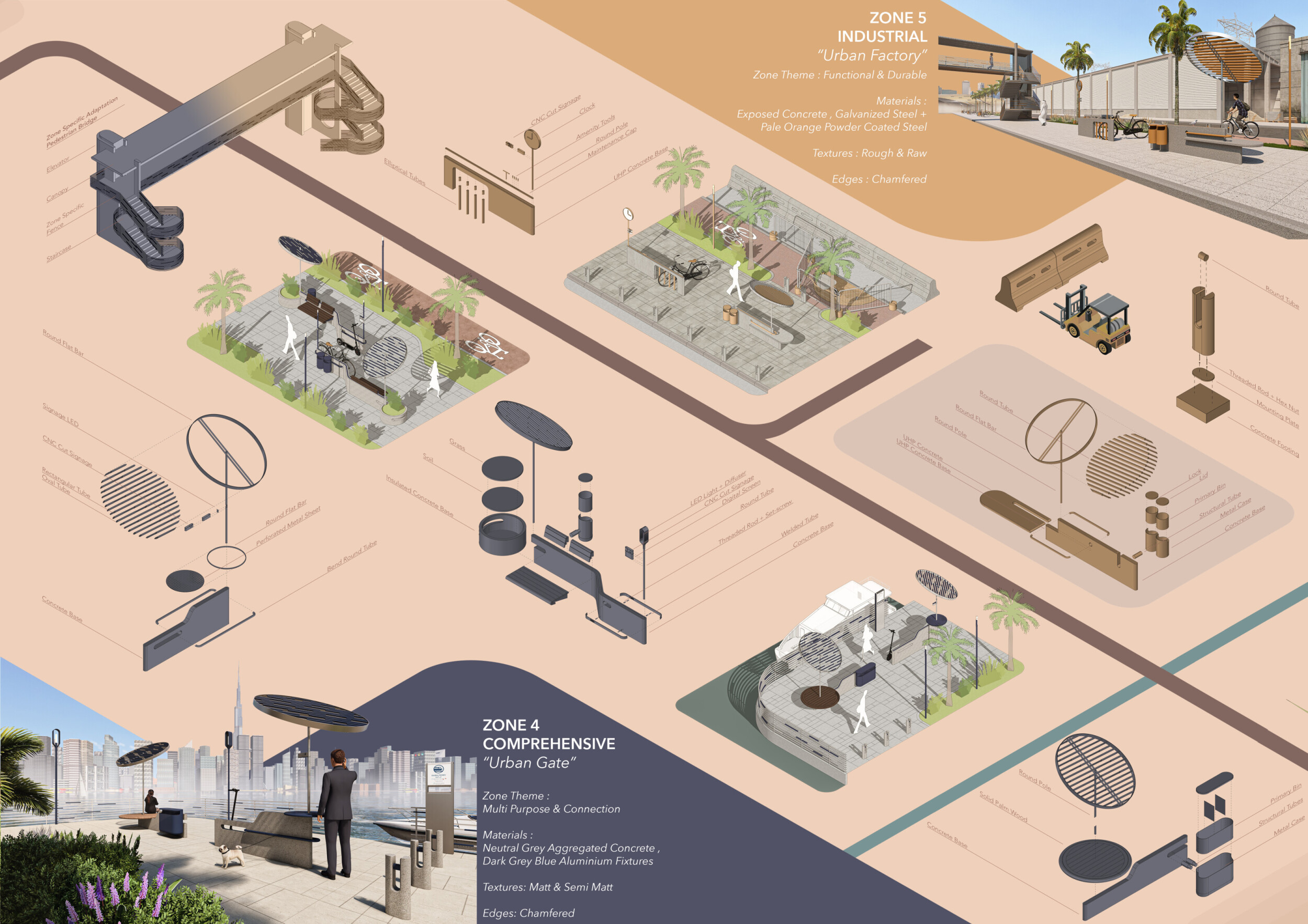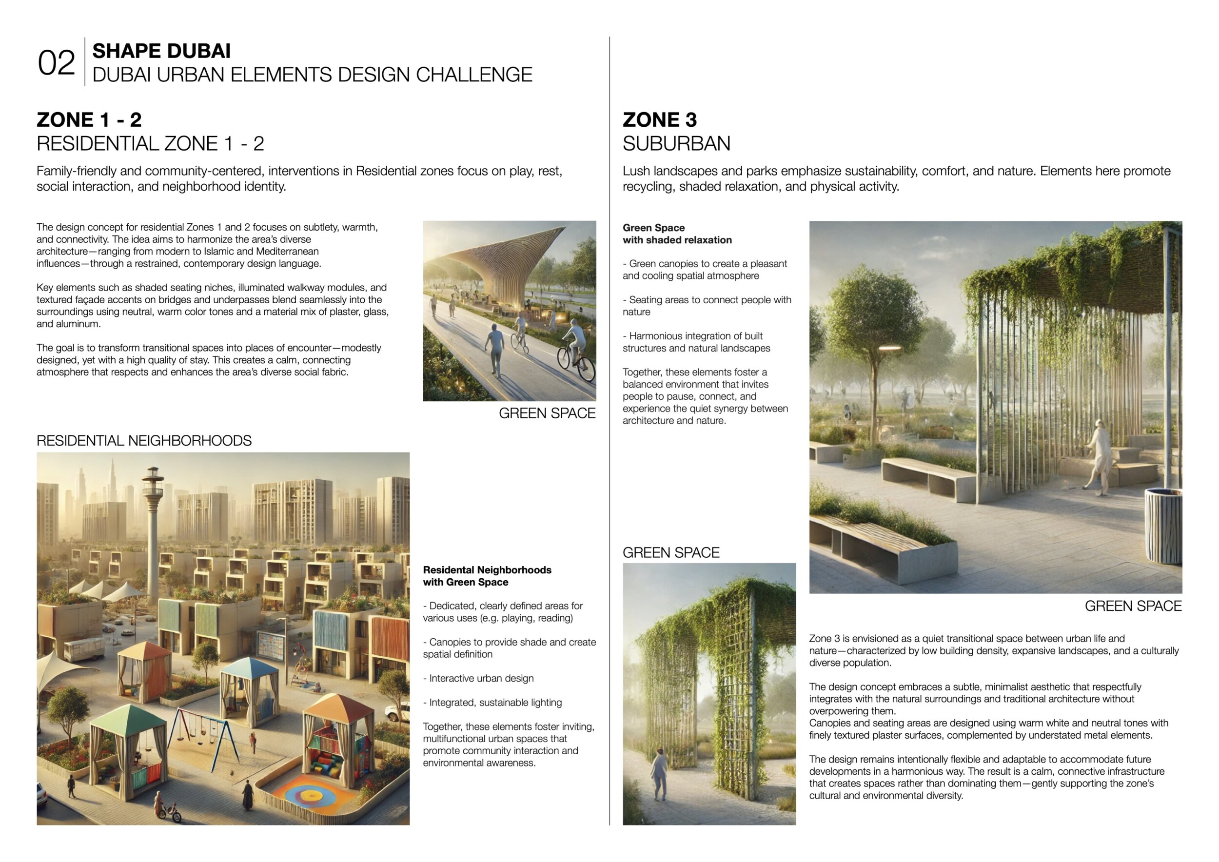 This proposal establishes a cohesive urban design system tailored to Dubai’s diverse zoning contexts, translating each area’s cultural, climatic, and programmatic character into a unified streetscape language. Seven distinct zone typologies—ranging from residential to industrial, heritage, and high-end—are articulated through a matrix of core geometries, modular shading elements, curated material palettes, and contextual wayfinding. Read more Each typology introduces unique visual identifiers: Z1 and Z2 draw on Islamic motifs and neighborhood intimacy, Z3 evokes Bedouin tents and soft landforms, while Z5 and Z7 leverage sharper geometries and premium finishes to express industrial rigor or luxury. The proposal integrates shading, pedestrian bridges, solar infrastructure, and street furniture into cohesive kit-of-parts systems adaptable across road hierarchies and public interfaces. Artistic co-design, climate-responsive strategies, and heritage continuity are embedded throughout, ensuring visual consistency while accommodating Dubai’s rapid growth, diverse urban fabrics, and the need for identity-driven public realm enhancements.