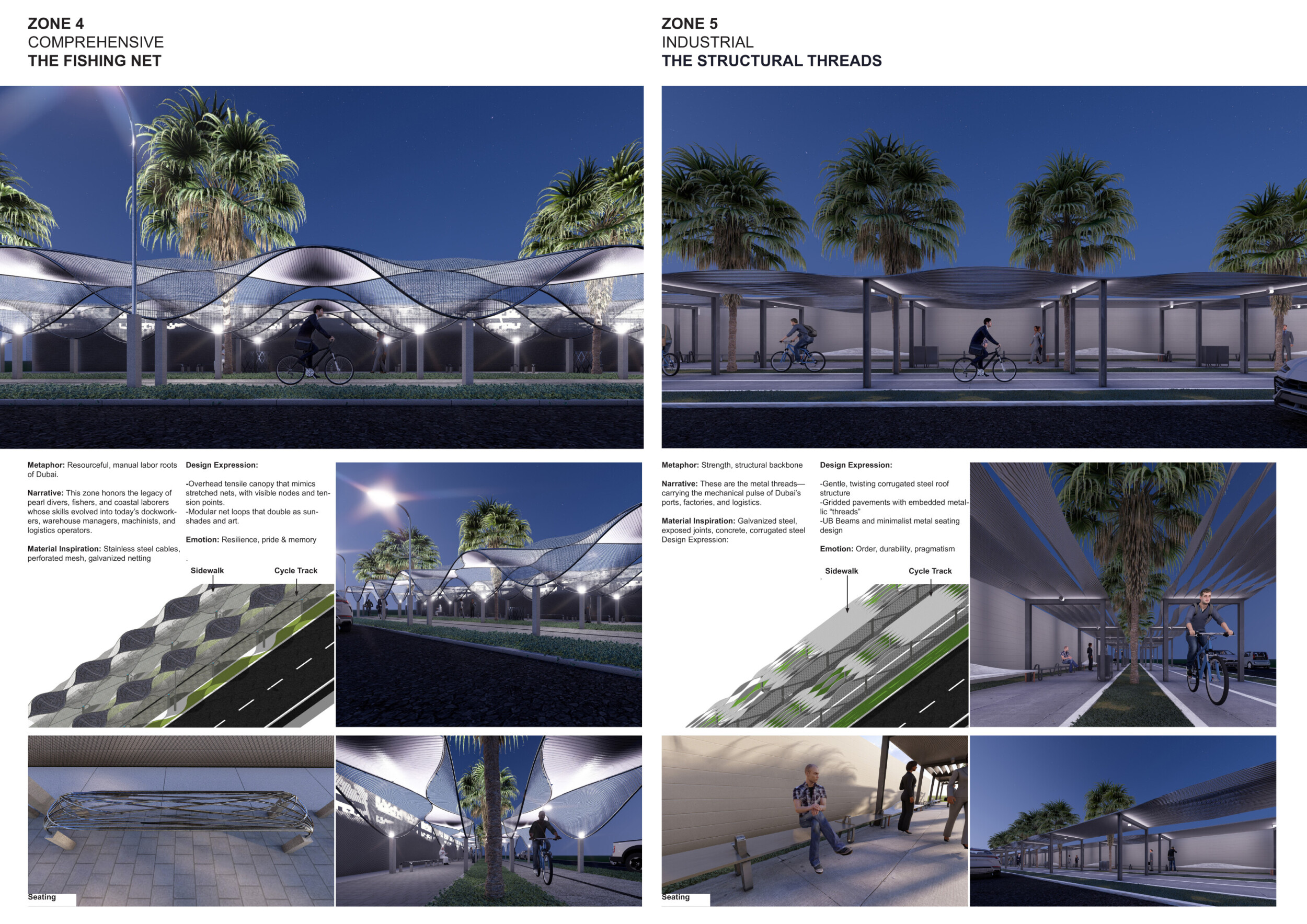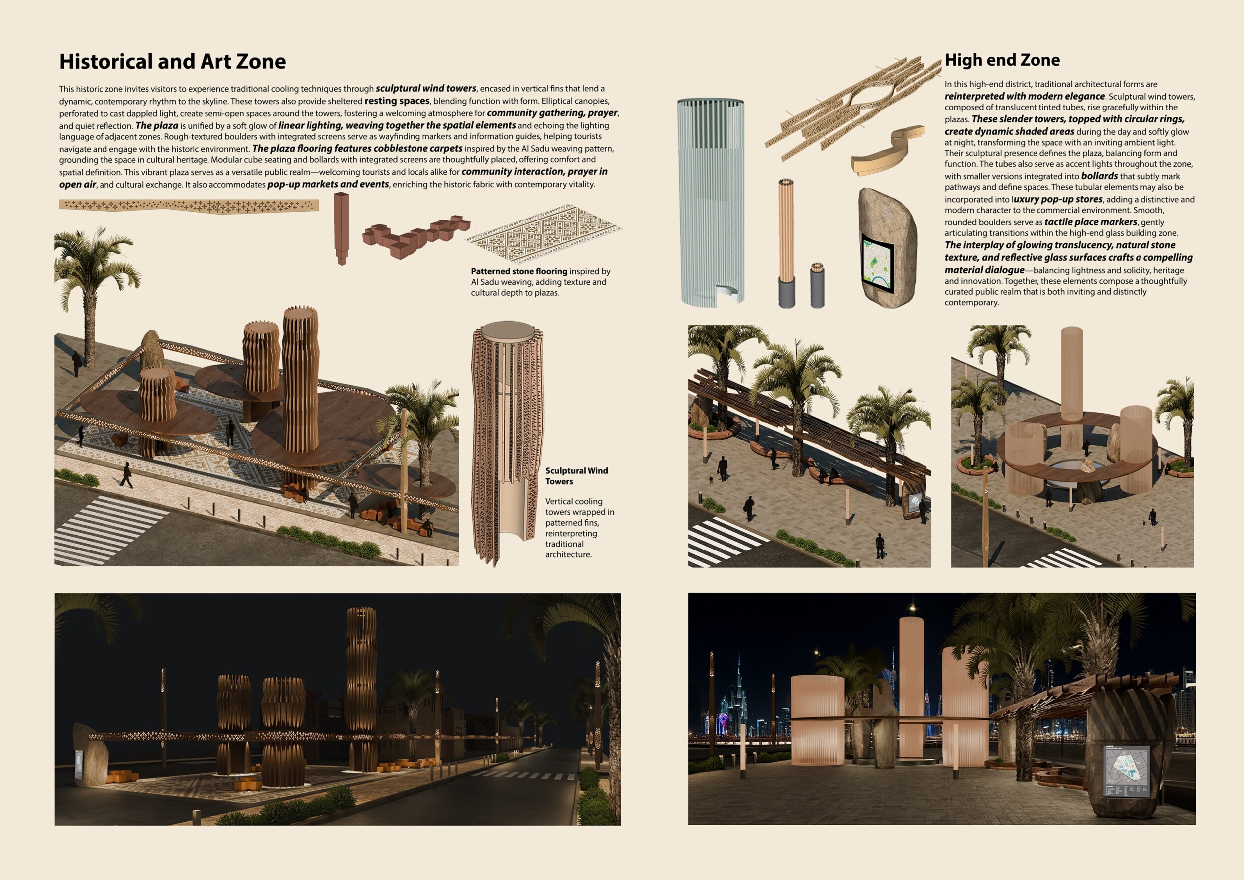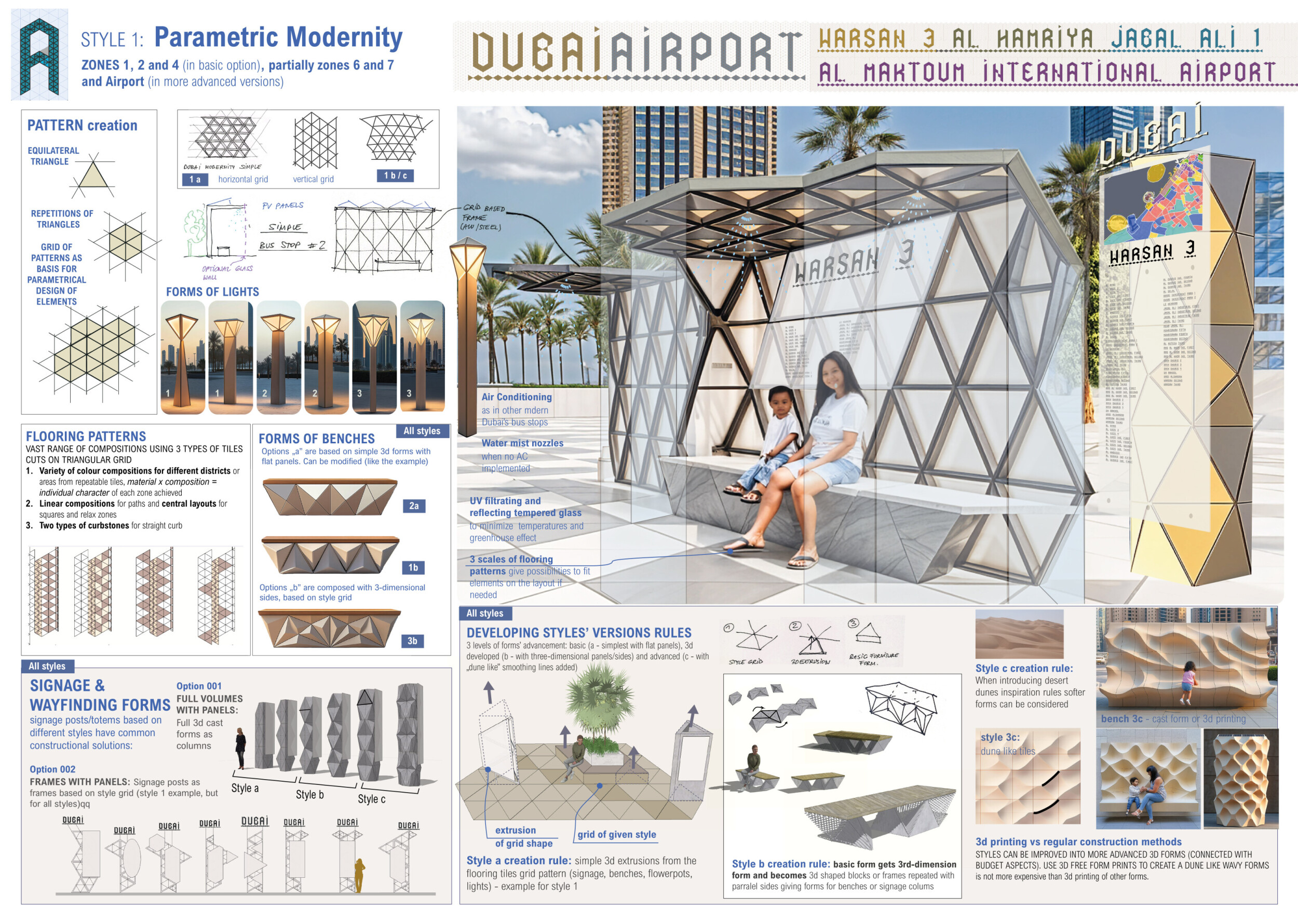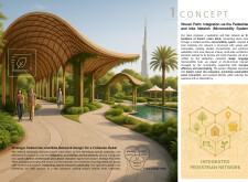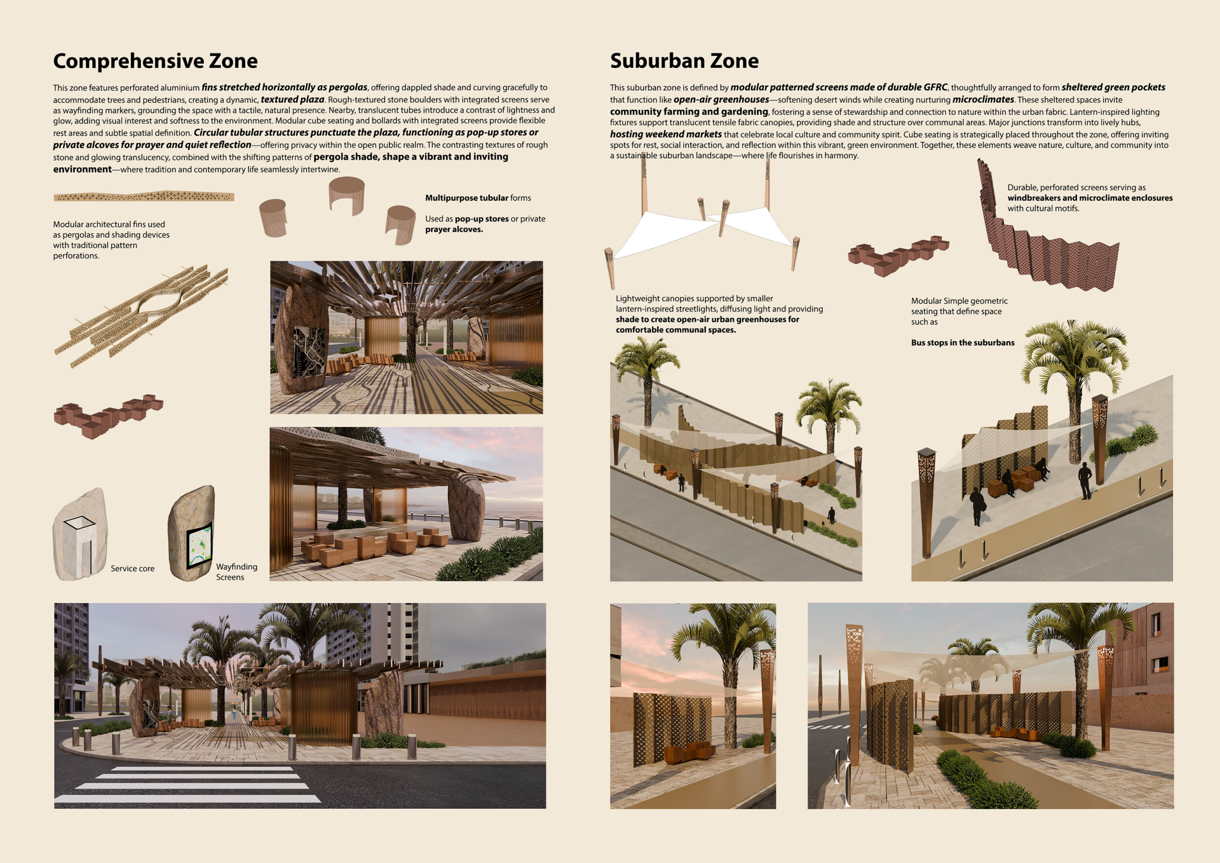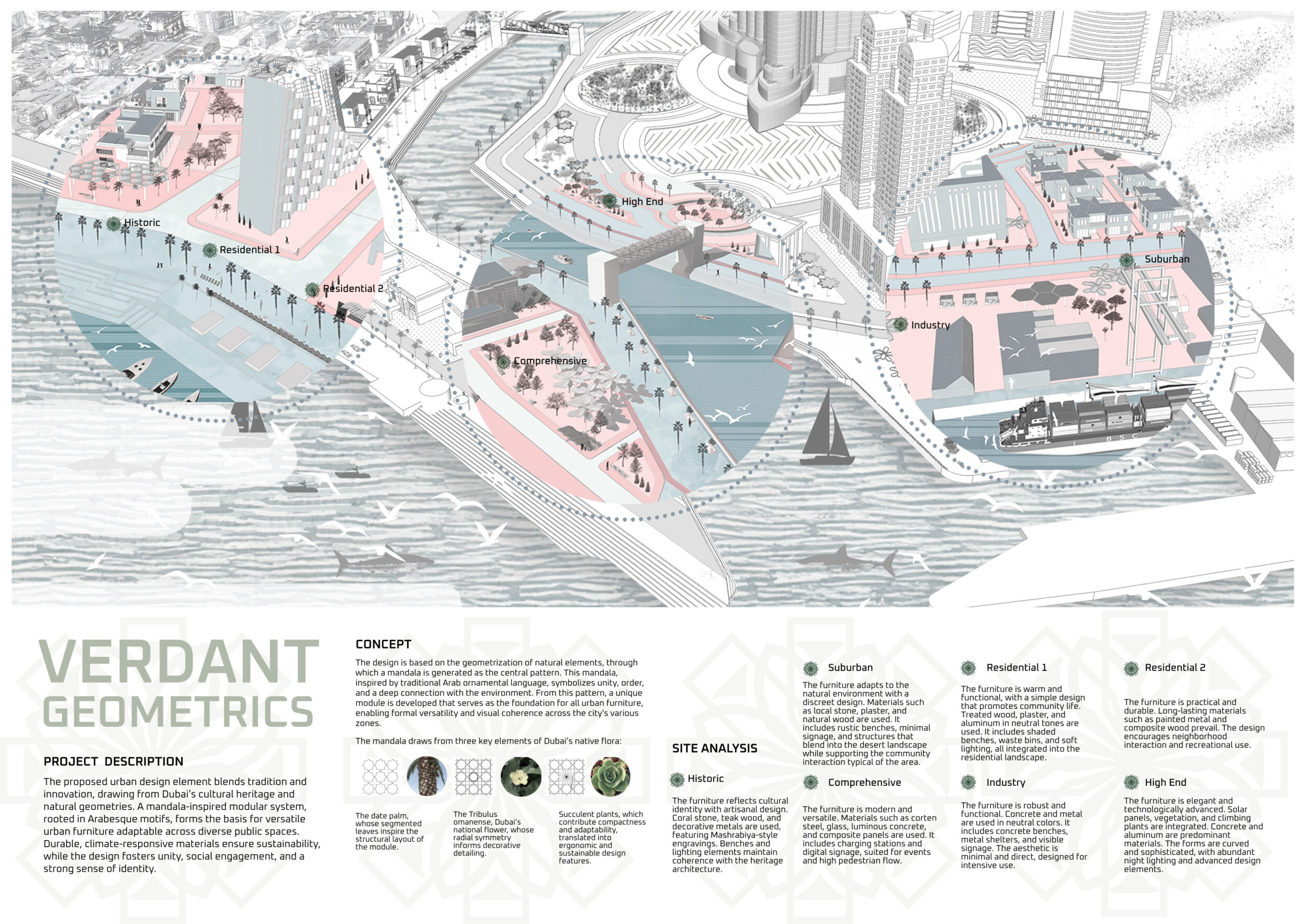 This proposal establishes a cohesive urban design system tailored to Dubai’s diverse zoning contexts, translating each area’s cultural, climatic, and programmatic character into a unified streetscape language. Seven distinct zone typologies—ranging from residential to industrial, heritage, and high-end—are articulated through a matrix of core geometries, modular shading elements, curated material palettes, and contextual wayfinding. Read more Each typology introduces unique visual identifiers: Z1 and Z2 draw on Islamic motifs and neighborhood intimacy, Z3 evokes Bedouin tents and soft landforms, while Z5 and Z7 leverage sharper geometries and premium finishes to express industrial rigor or luxury. The proposal integrates shading, pedestrian bridges, solar infrastructure, and street furniture into cohesive kit-of-parts systems adaptable across road hierarchies and public interfaces. Artistic co-design, climate-responsive strategies, and heritage continuity are embedded throughout, ensuring visual consistency while accommodating Dubai’s rapid growth, diverse urban fabrics, and the need for identity-driven public realm enhancements.