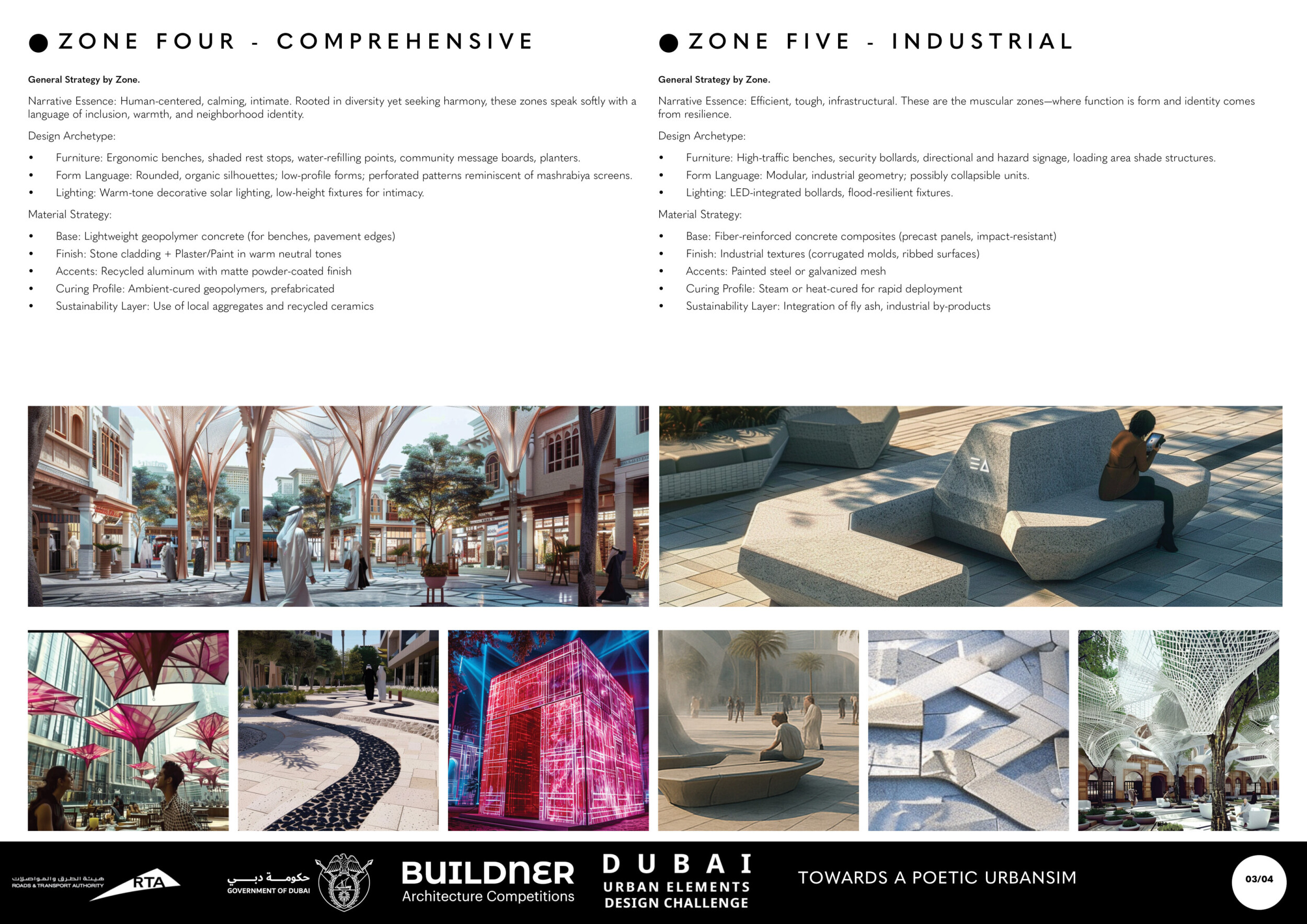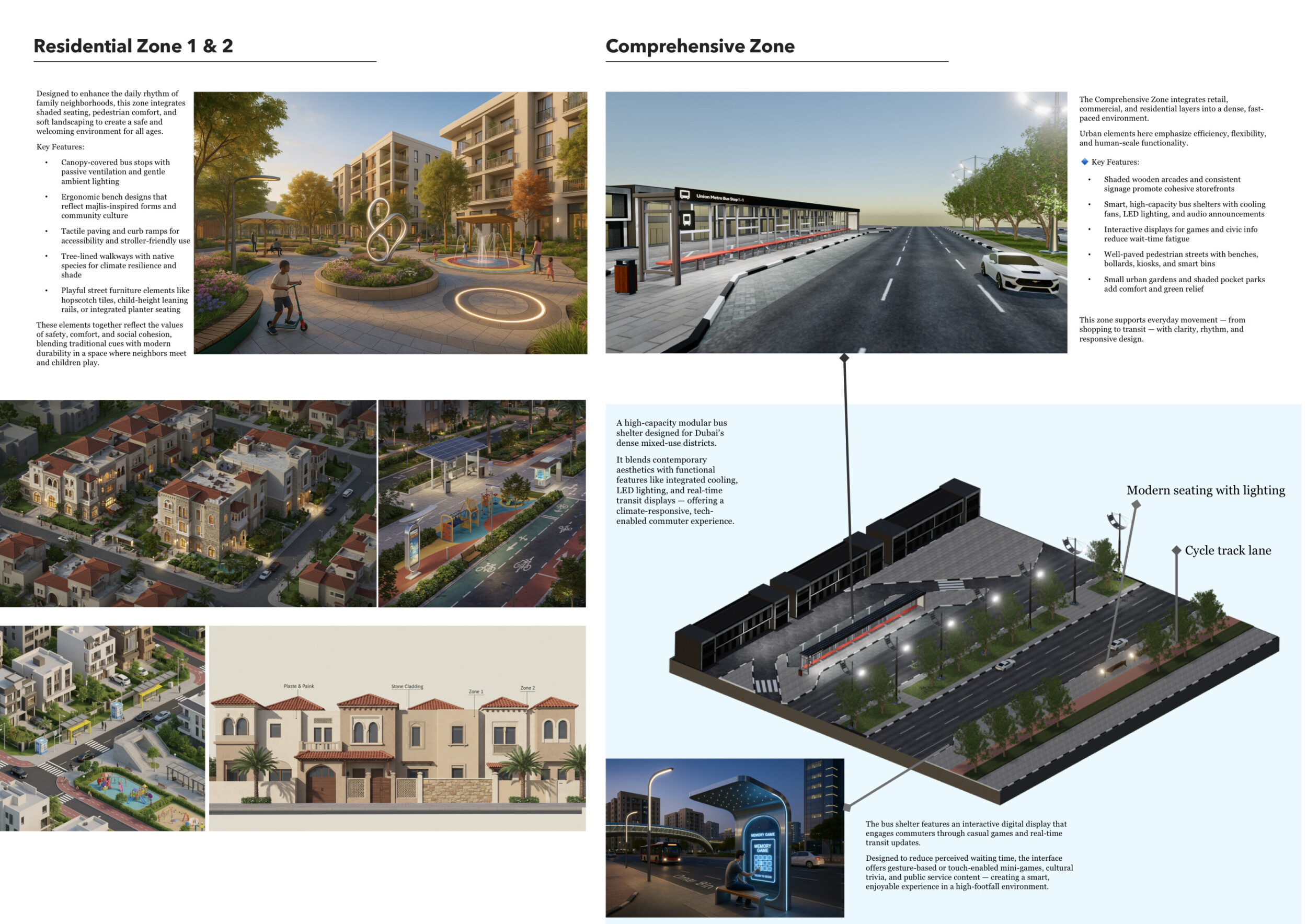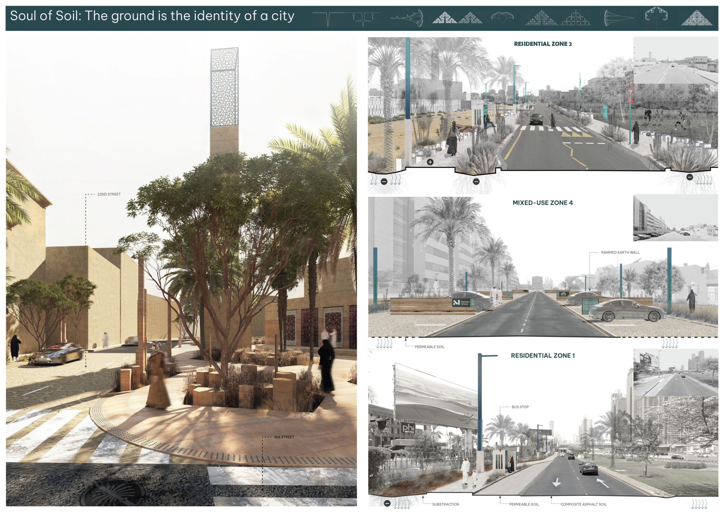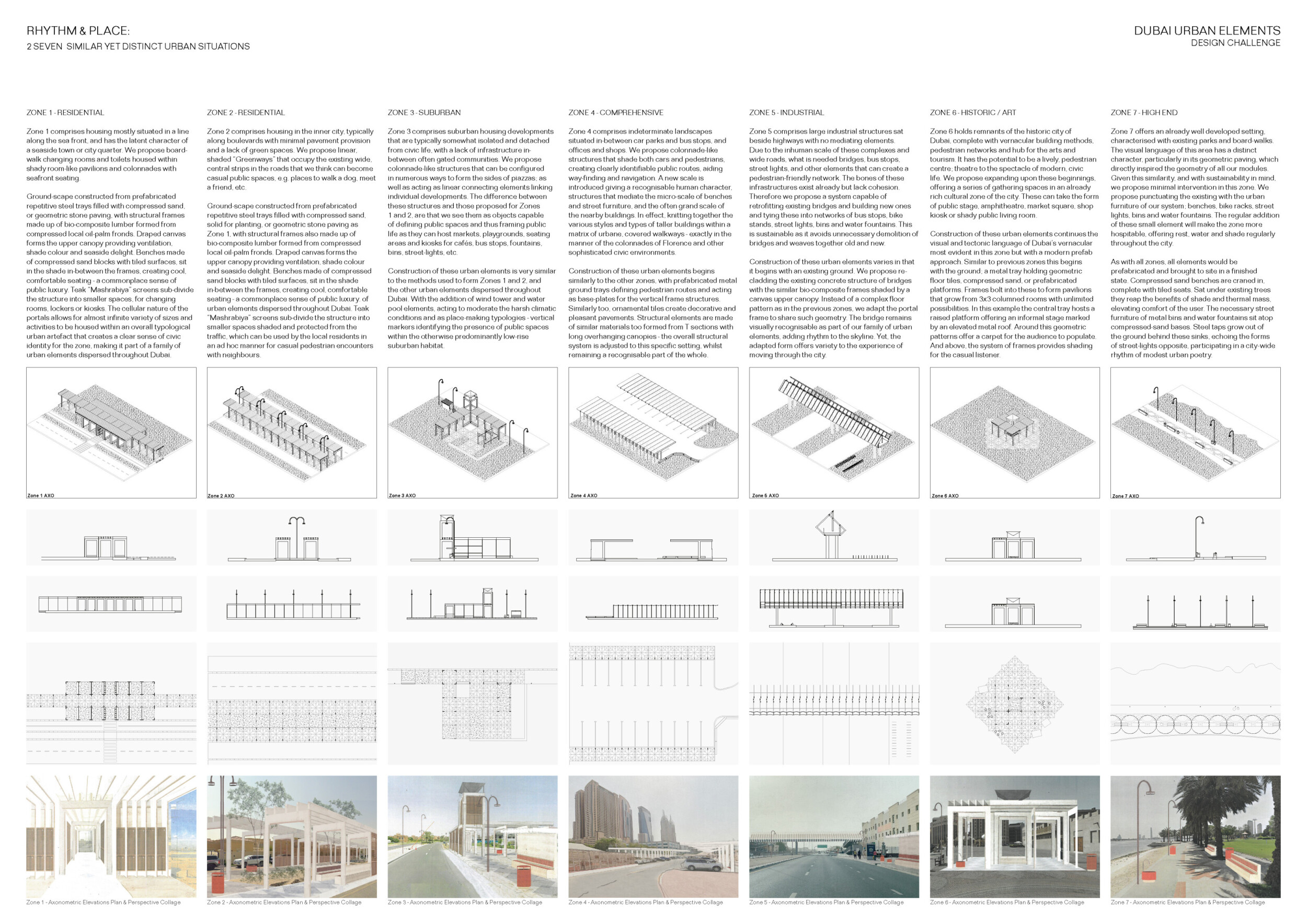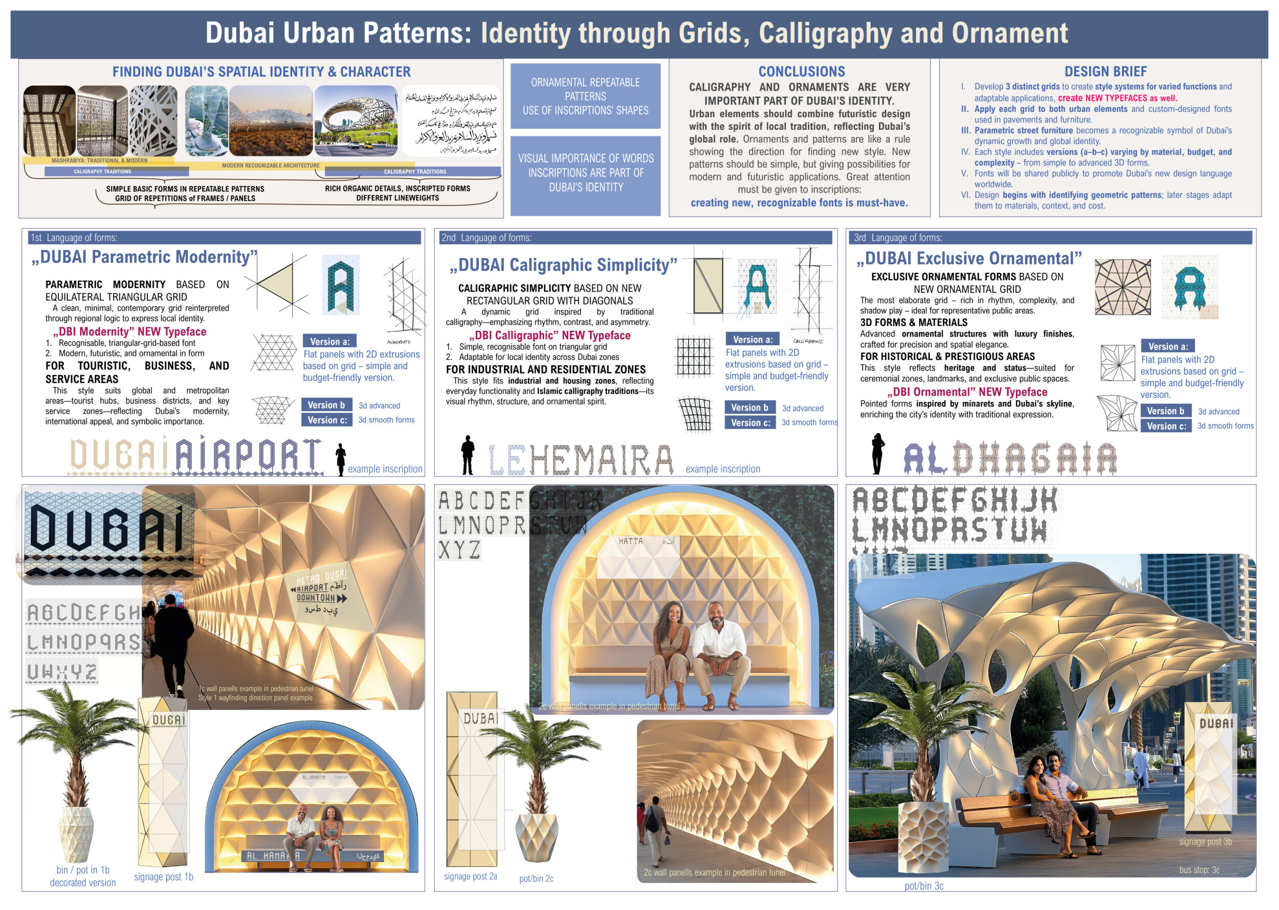 This proposal establishes a cohesive urban design system tailored to Dubai’s diverse zoning contexts, translating each area’s cultural, climatic, and programmatic character into a unified streetscape language. Seven distinct zone typologies—ranging from residential to industrial, heritage, and high-end—are articulated through a matrix of core geometries, modular shading elements, curated material palettes, and contextual wayfinding. Read more Each typology introduces unique visual identifiers: Z1 and Z2 draw on Islamic motifs and neighborhood intimacy, Z3 evokes Bedouin tents and soft landforms, while Z5 and Z7 leverage sharper geometries and premium finishes to express industrial rigor or luxury. The proposal integrates shading, pedestrian bridges, solar infrastructure, and street furniture into cohesive kit-of-parts systems adaptable across road hierarchies and public interfaces. Artistic co-design, climate-responsive strategies, and heritage continuity are embedded throughout, ensuring visual consistency while accommodating Dubai’s rapid growth, diverse urban fabrics, and the need for identity-driven public realm enhancements.