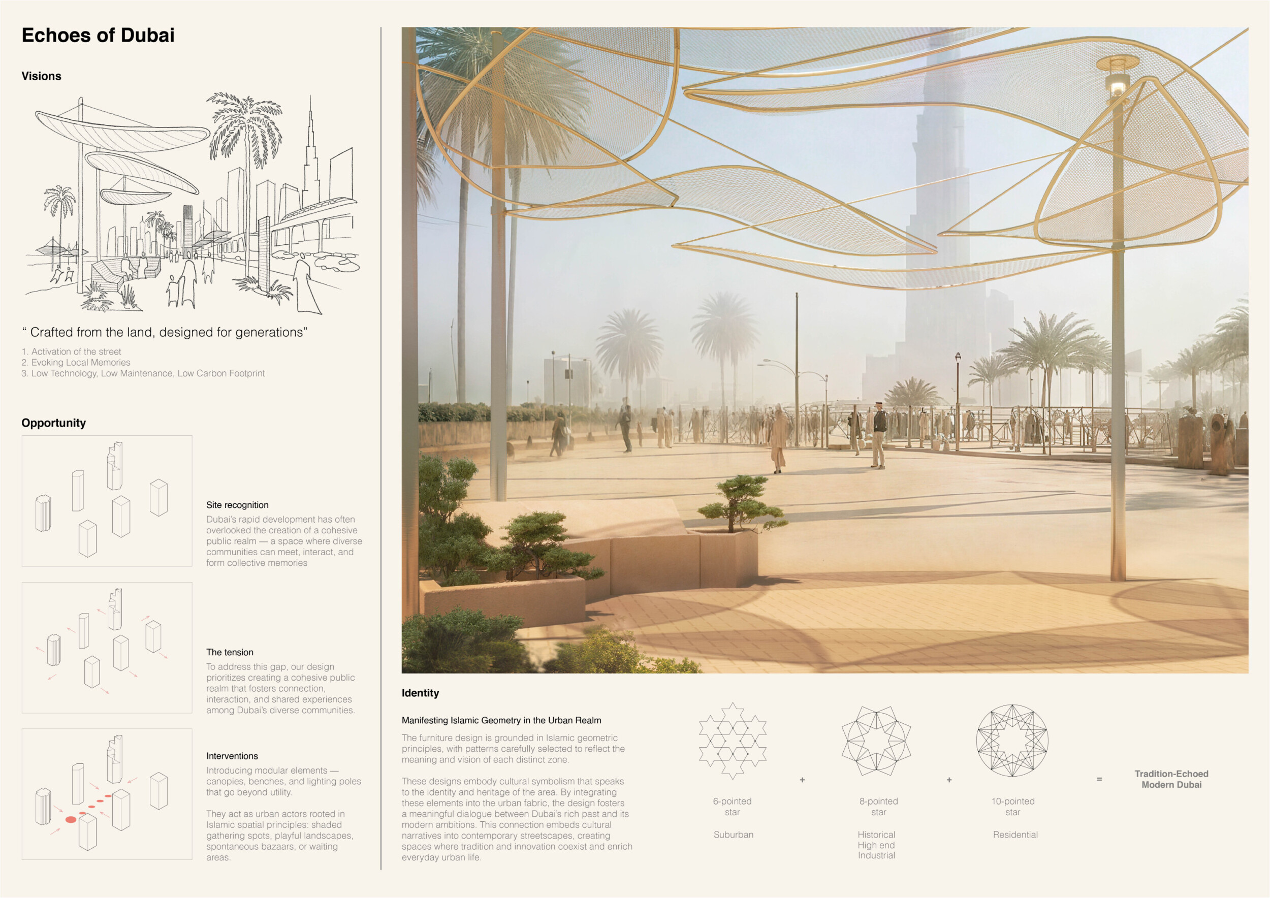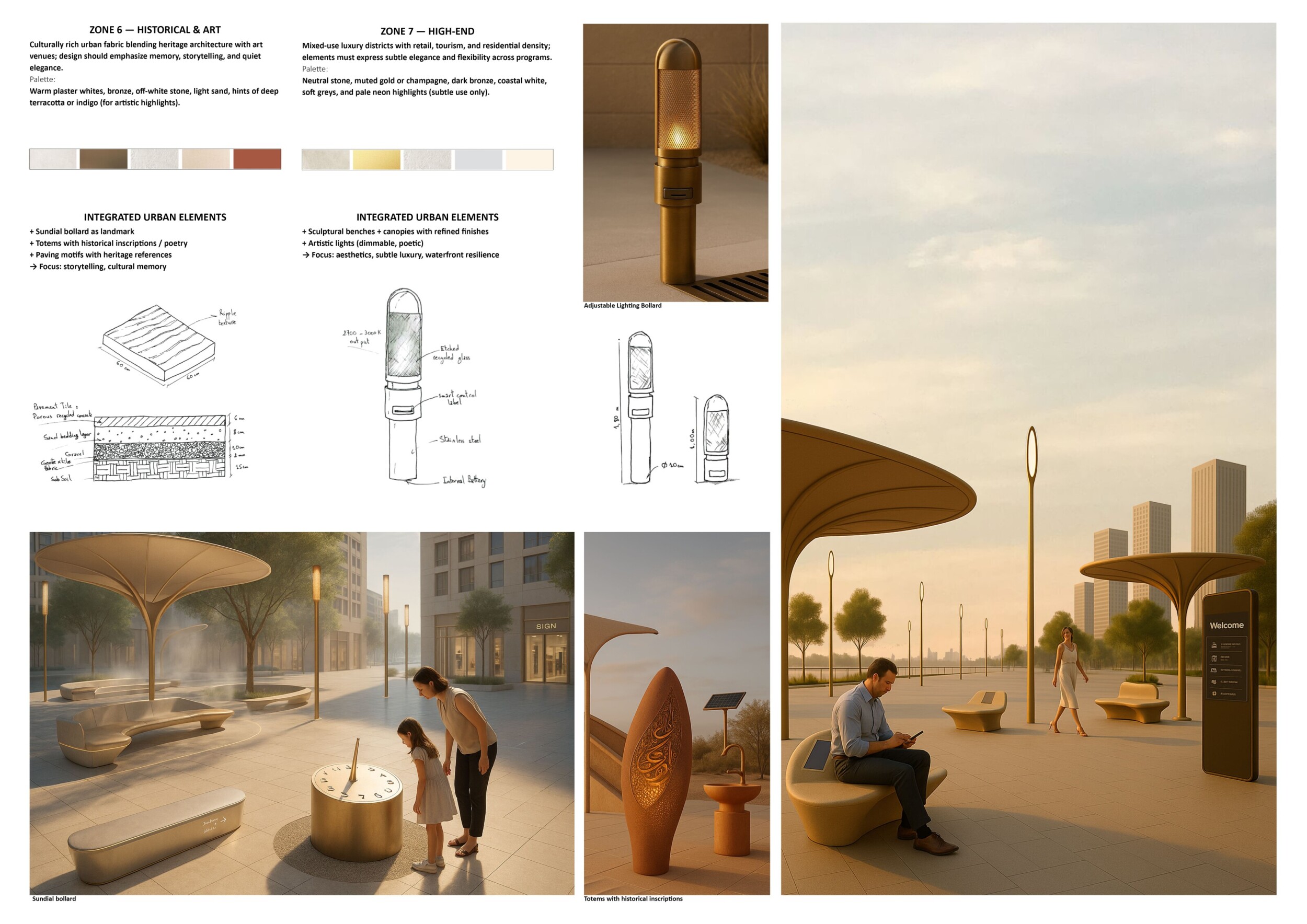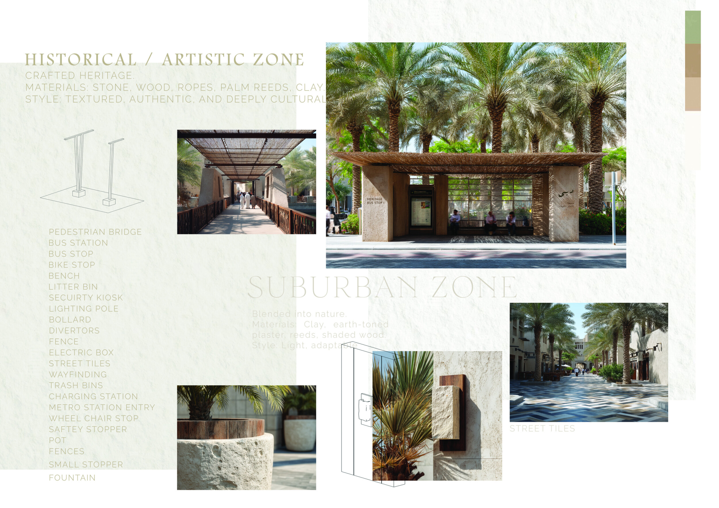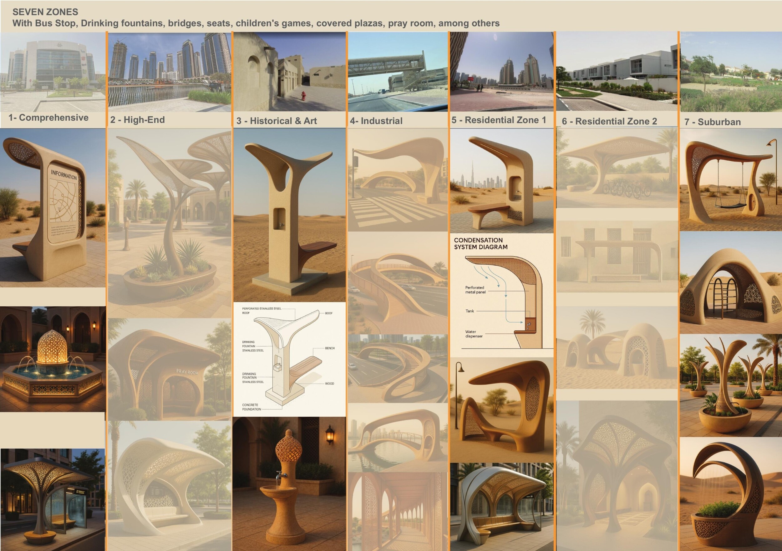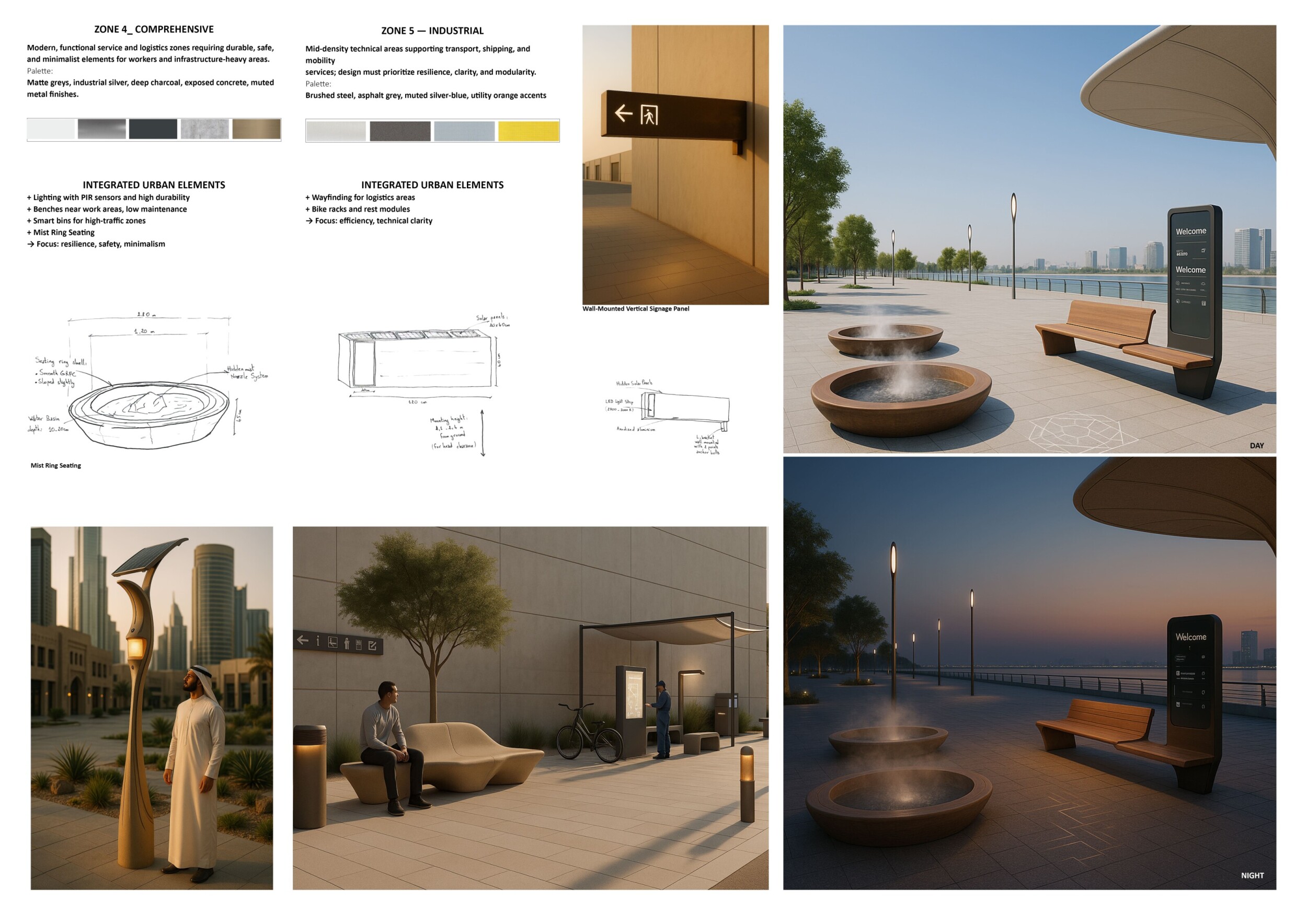 This proposal establishes a cohesive urban design system tailored to Dubai’s diverse zoning contexts, translating each area’s cultural, climatic, and programmatic character into a unified streetscape language. Seven distinct zone typologies—ranging from residential to industrial, heritage, and high-end—are articulated through a matrix of core geometries, modular shading elements, curated material palettes, and contextual wayfinding. Read more Each typology introduces unique visual identifiers: Z1 and Z2 draw on Islamic motifs and neighborhood intimacy, Z3 evokes Bedouin tents and soft landforms, while Z5 and Z7 leverage sharper geometries and premium finishes to express industrial rigor or luxury. The proposal integrates shading, pedestrian bridges, solar infrastructure, and street furniture into cohesive kit-of-parts systems adaptable across road hierarchies and public interfaces. Artistic co-design, climate-responsive strategies, and heritage continuity are embedded throughout, ensuring visual consistency while accommodating Dubai’s rapid growth, diverse urban fabrics, and the need for identity-driven public realm enhancements.