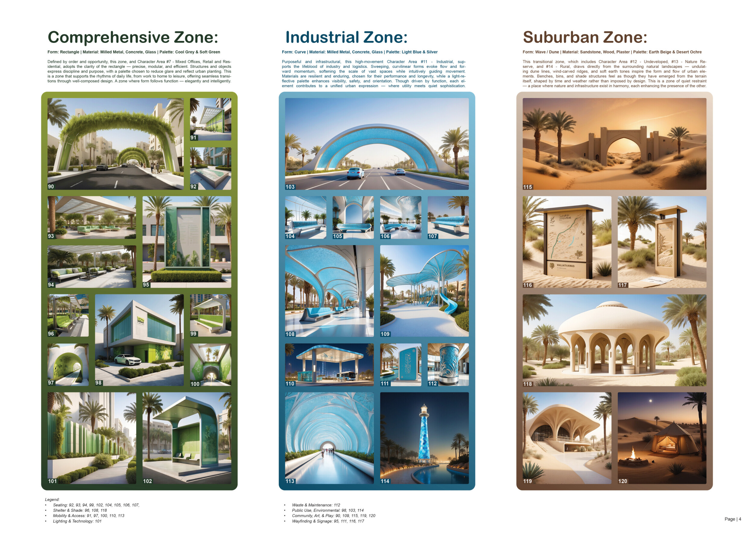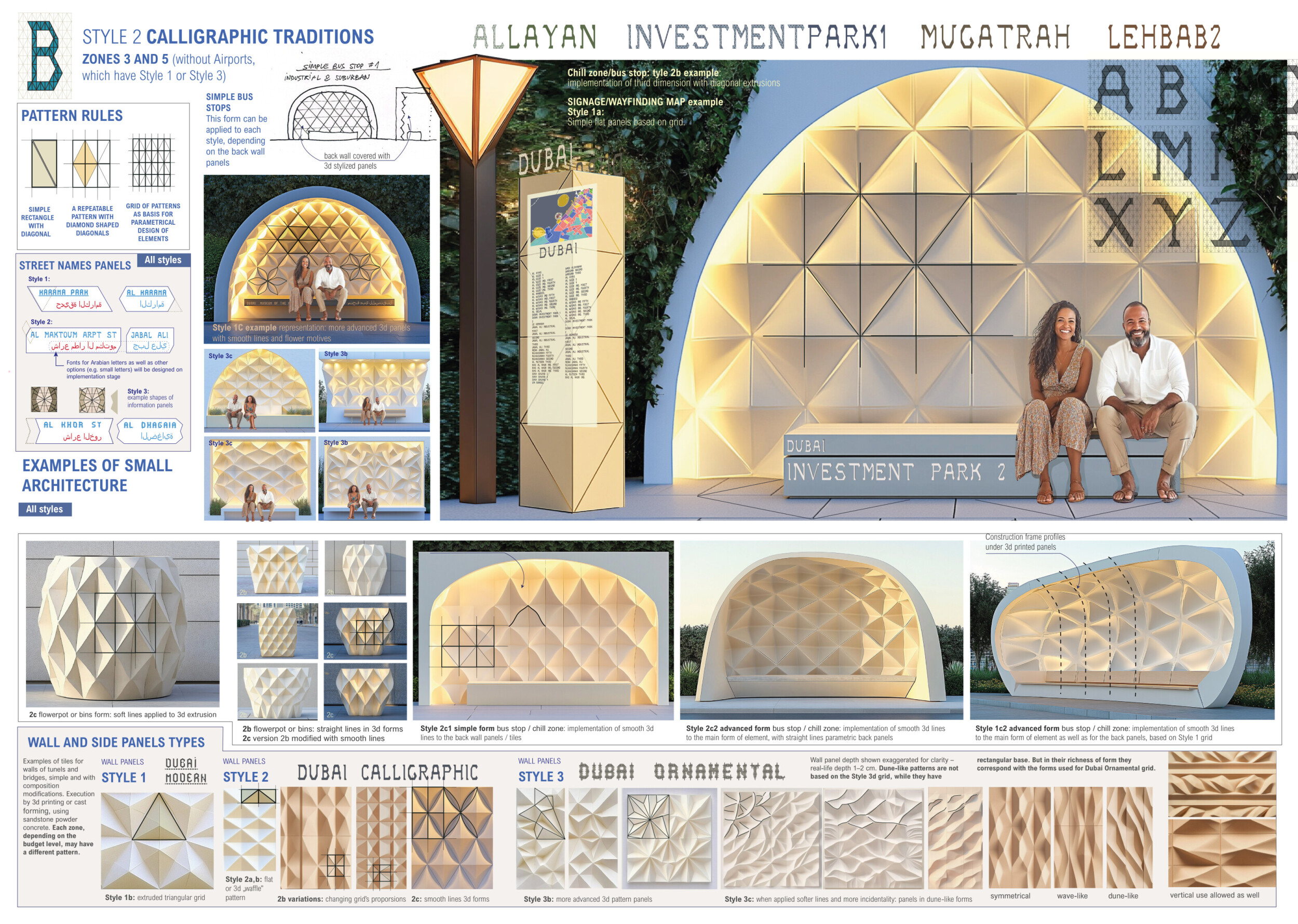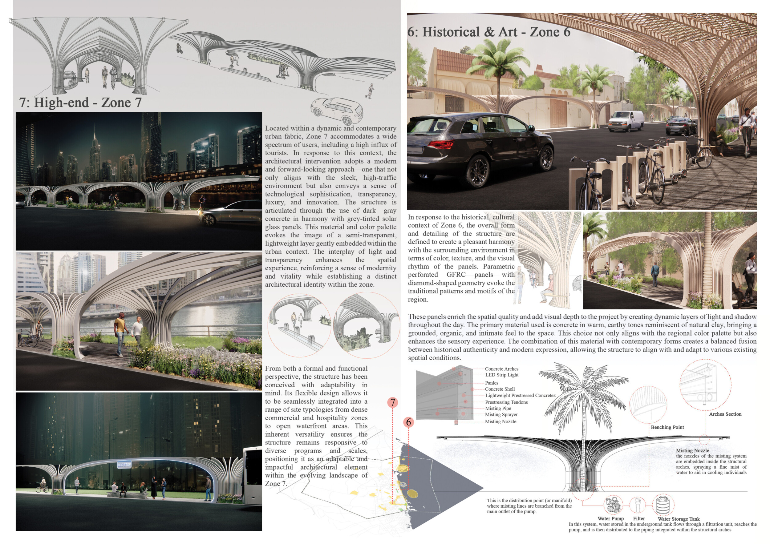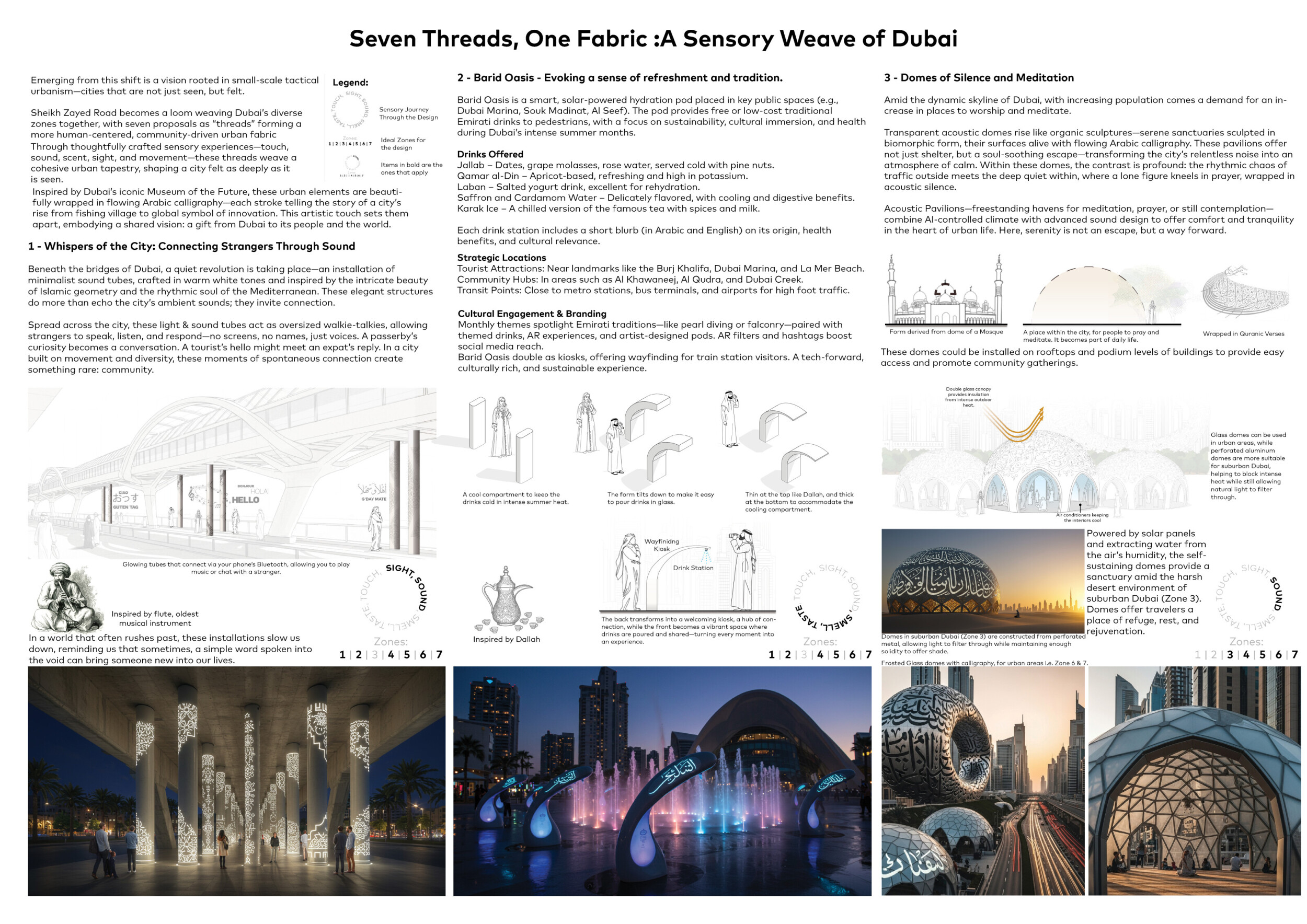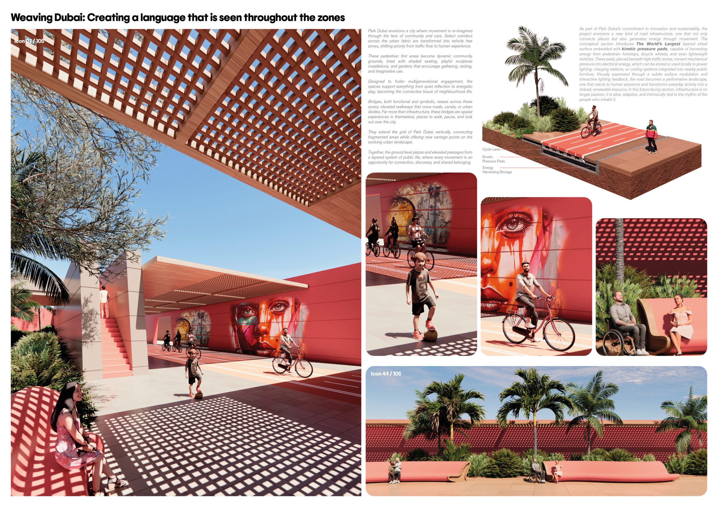 This proposal establishes a cohesive urban design system tailored to Dubai’s diverse zoning contexts, translating each area’s cultural, climatic, and programmatic character into a unified streetscape language. Seven distinct zone typologies—ranging from residential to industrial, heritage, and high-end—are articulated through a matrix of core geometries, modular shading elements, curated material palettes, and contextual wayfinding. Read more Each typology introduces unique visual identifiers: Z1 and Z2 draw on Islamic motifs and neighborhood intimacy, Z3 evokes Bedouin tents and soft landforms, while Z5 and Z7 leverage sharper geometries and premium finishes to express industrial rigor or luxury. The proposal integrates shading, pedestrian bridges, solar infrastructure, and street furniture into cohesive kit-of-parts systems adaptable across road hierarchies and public interfaces. Artistic co-design, climate-responsive strategies, and heritage continuity are embedded throughout, ensuring visual consistency while accommodating Dubai’s rapid growth, diverse urban fabrics, and the need for identity-driven public realm enhancements.