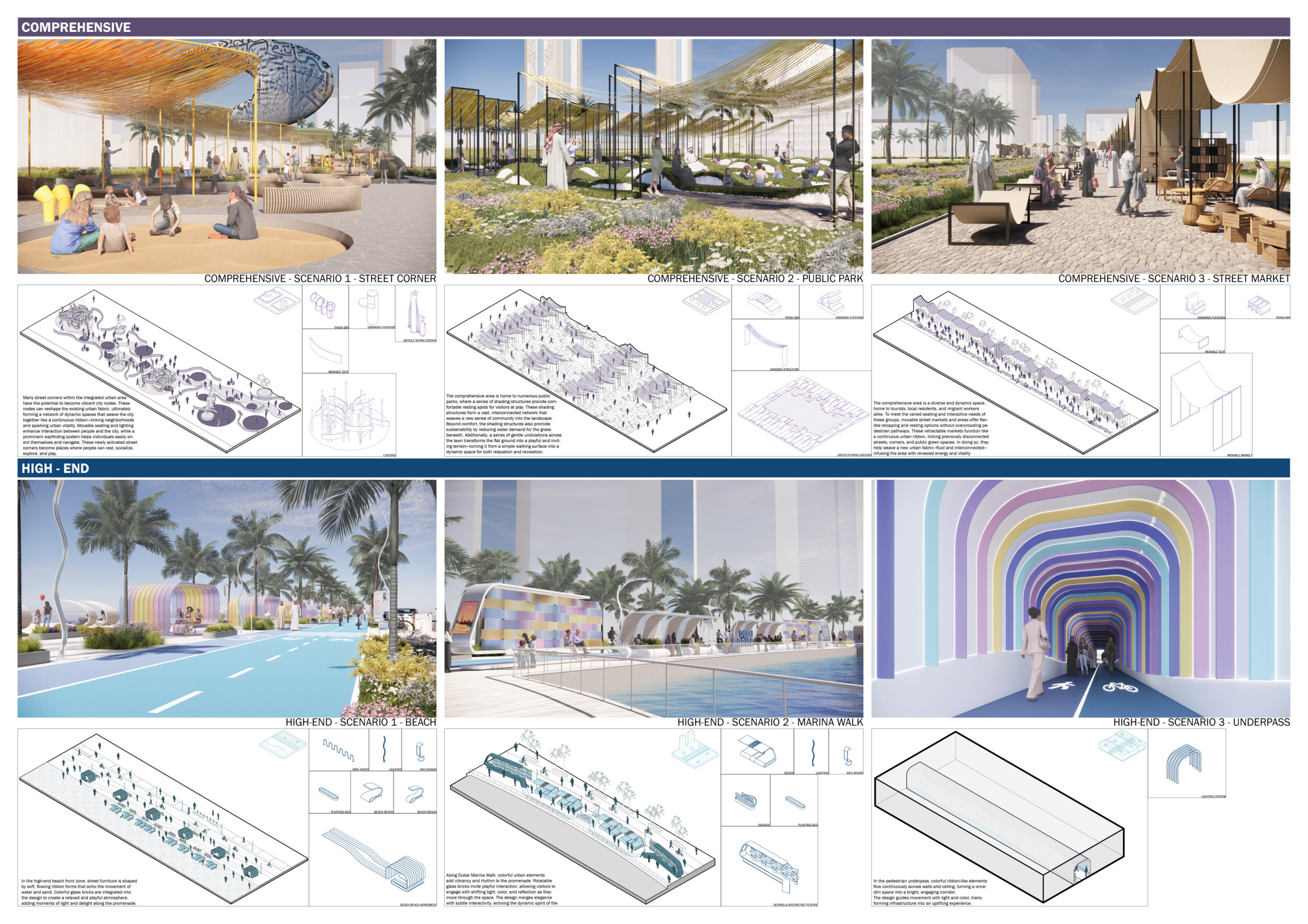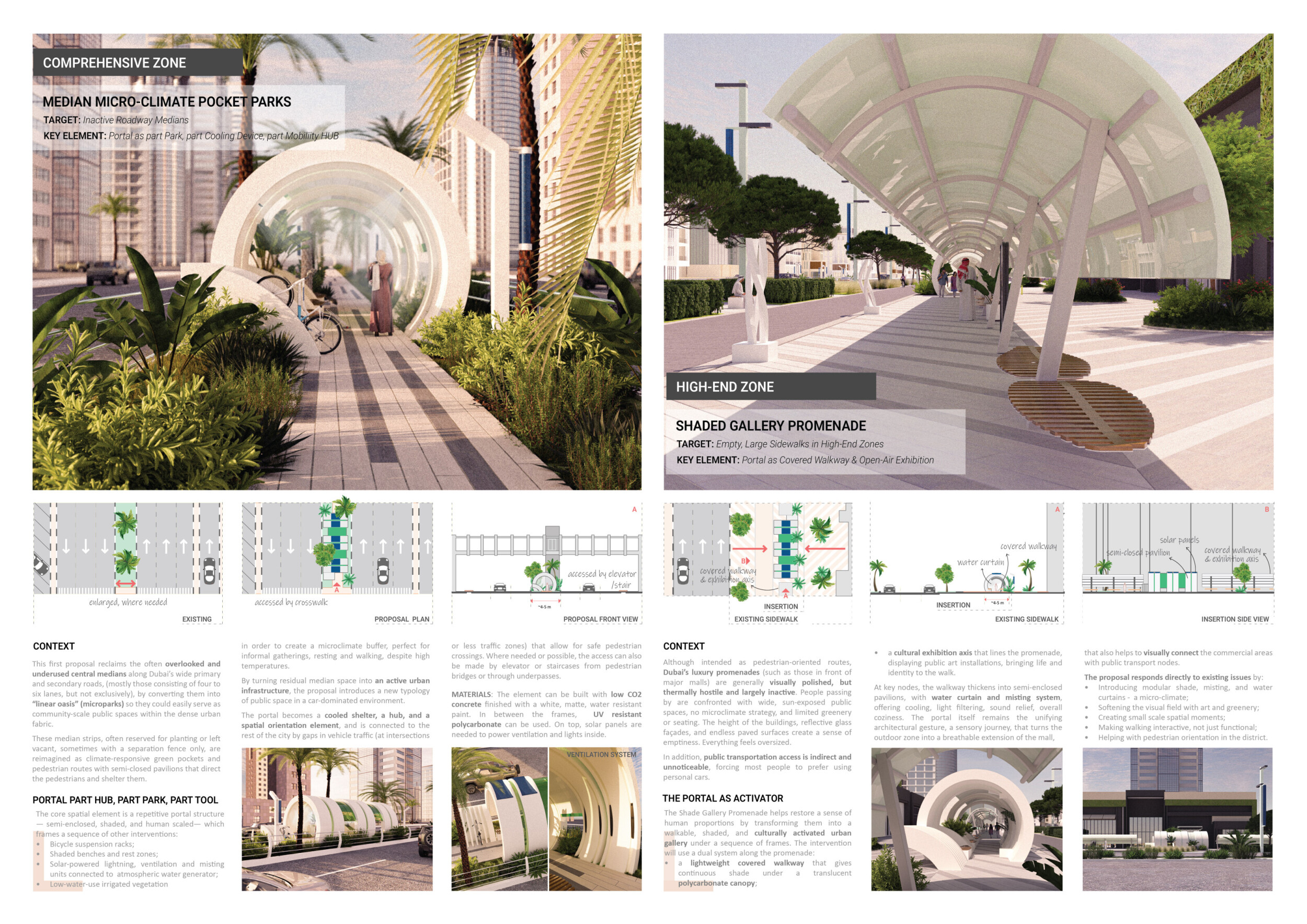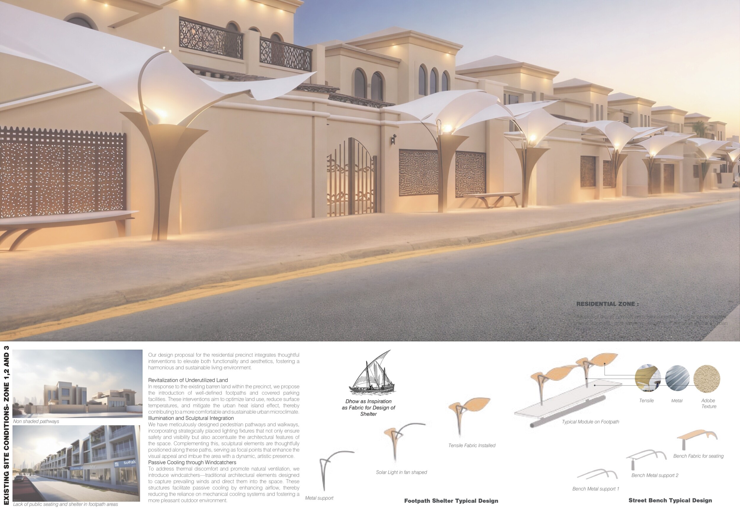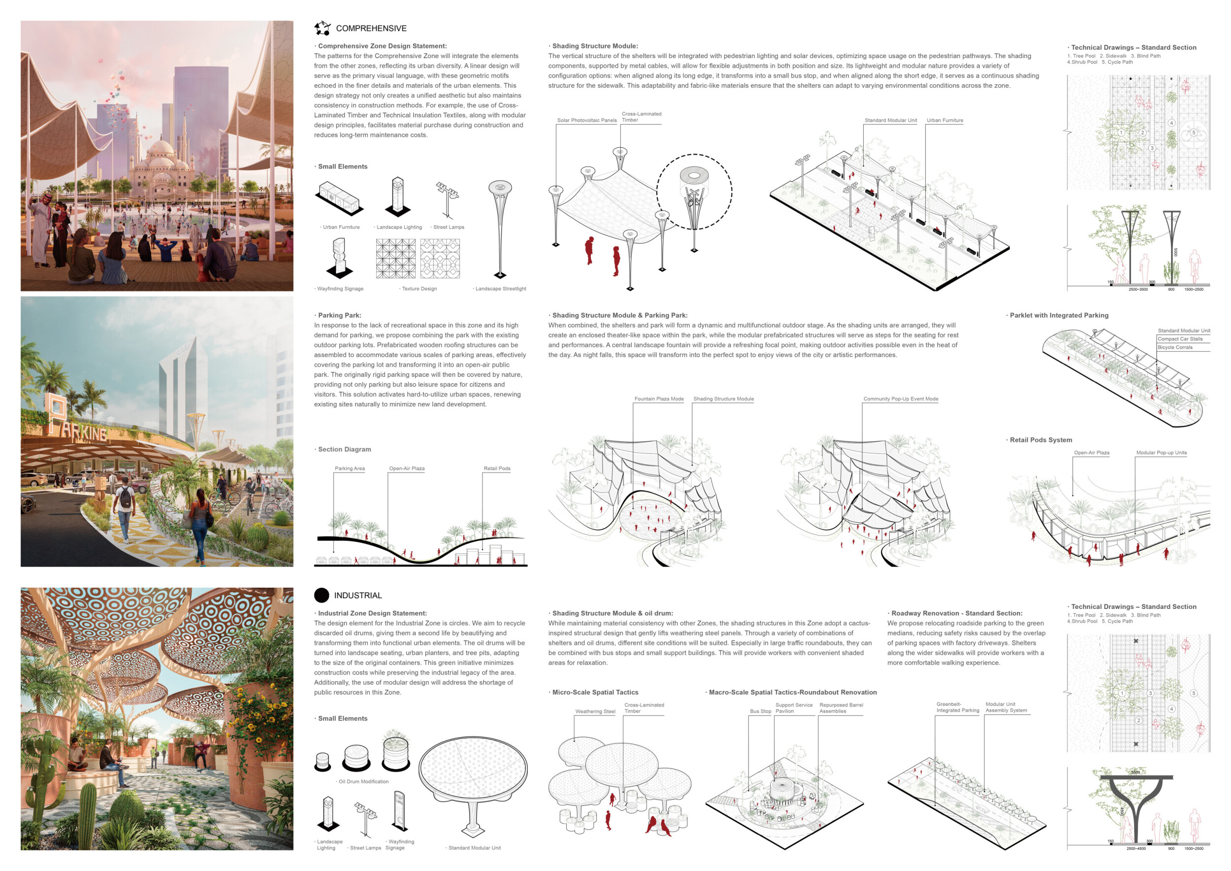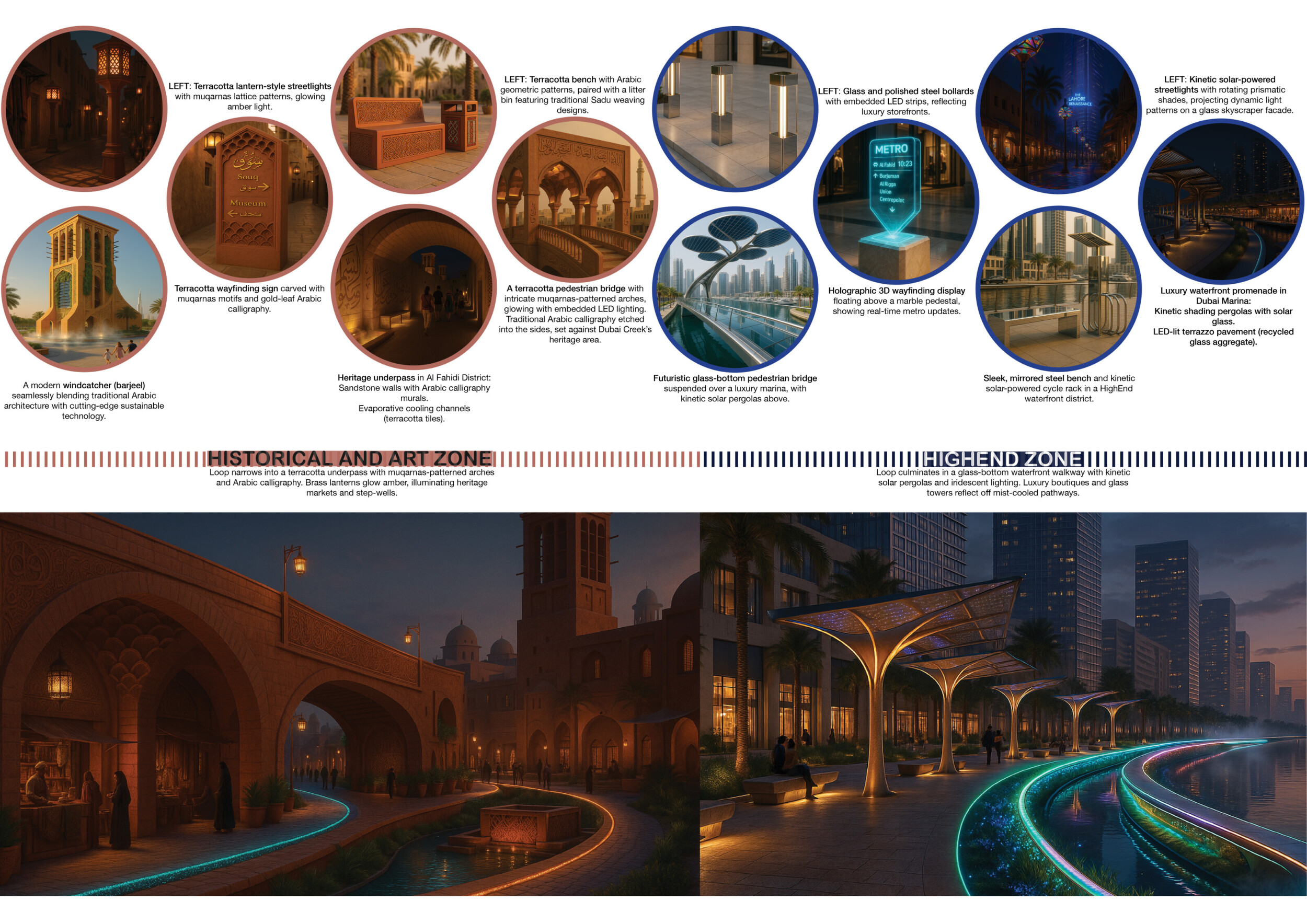 This proposal establishes a cohesive urban design system tailored to Dubai’s diverse zoning contexts, translating each area’s cultural, climatic, and programmatic character into a unified streetscape language. Seven distinct zone typologies—ranging from residential to industrial, heritage, and high-end—are articulated through a matrix of core geometries, modular shading elements, curated material palettes, and contextual wayfinding. Read more Each typology introduces unique visual identifiers: Z1 and Z2 draw on Islamic motifs and neighborhood intimacy, Z3 evokes Bedouin tents and soft landforms, while Z5 and Z7 leverage sharper geometries and premium finishes to express industrial rigor or luxury. The proposal integrates shading, pedestrian bridges, solar infrastructure, and street furniture into cohesive kit-of-parts systems adaptable across road hierarchies and public interfaces. Artistic co-design, climate-responsive strategies, and heritage continuity are embedded throughout, ensuring visual consistency while accommodating Dubai’s rapid growth, diverse urban fabrics, and the need for identity-driven public realm enhancements.