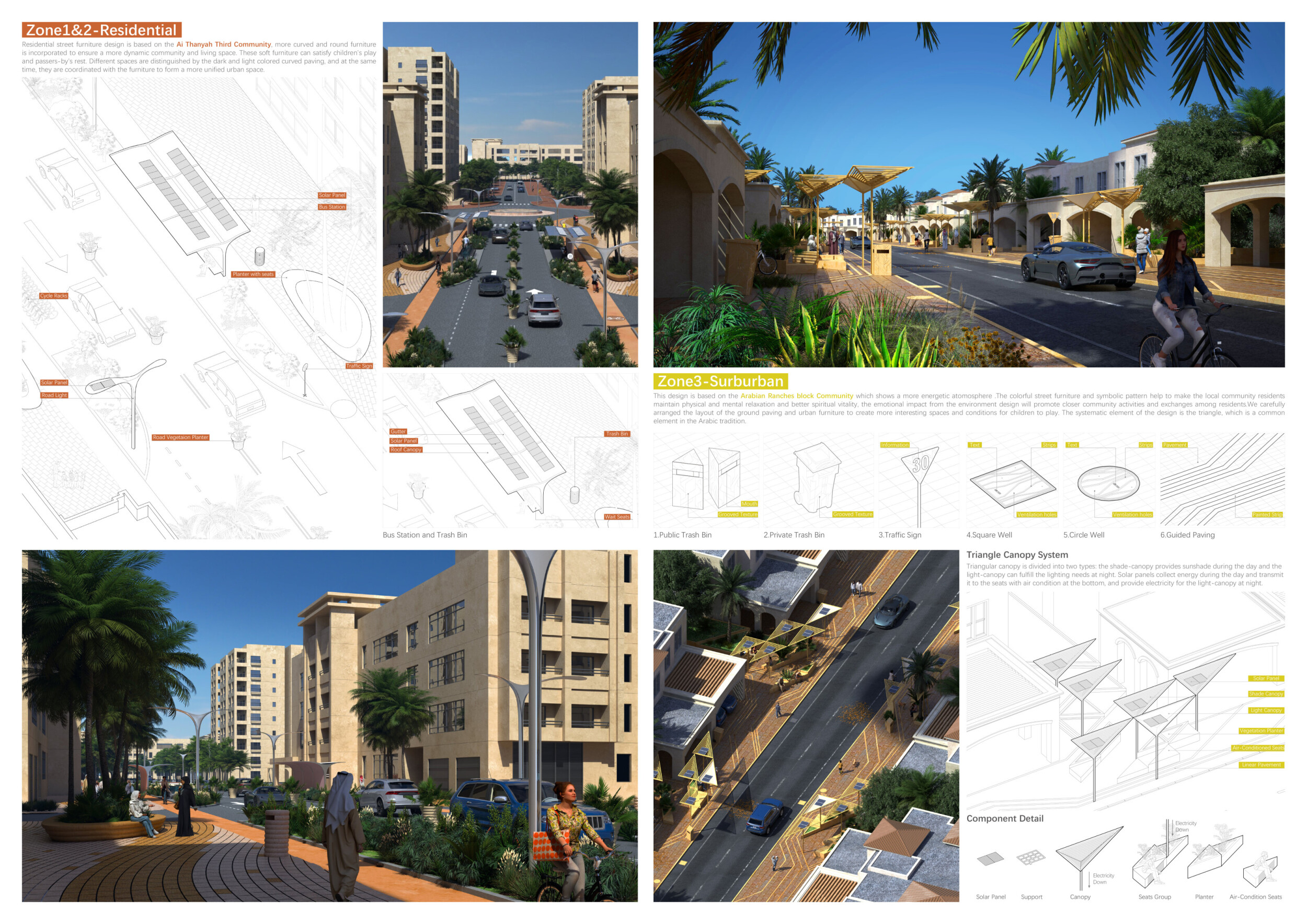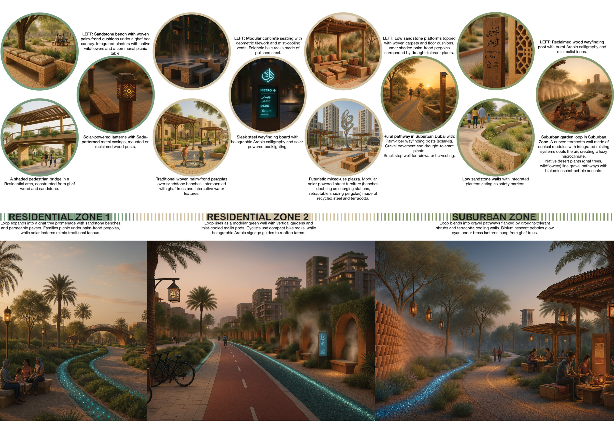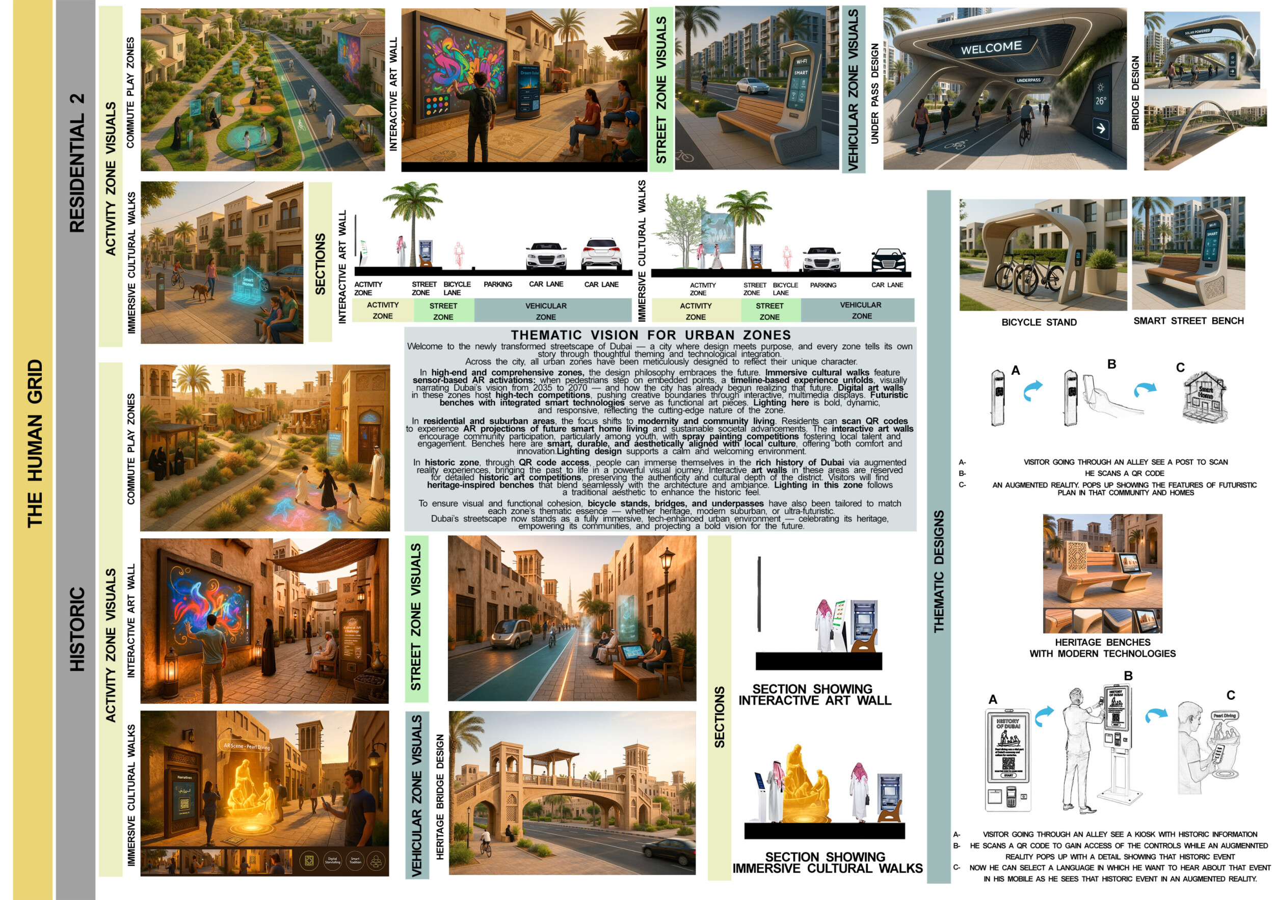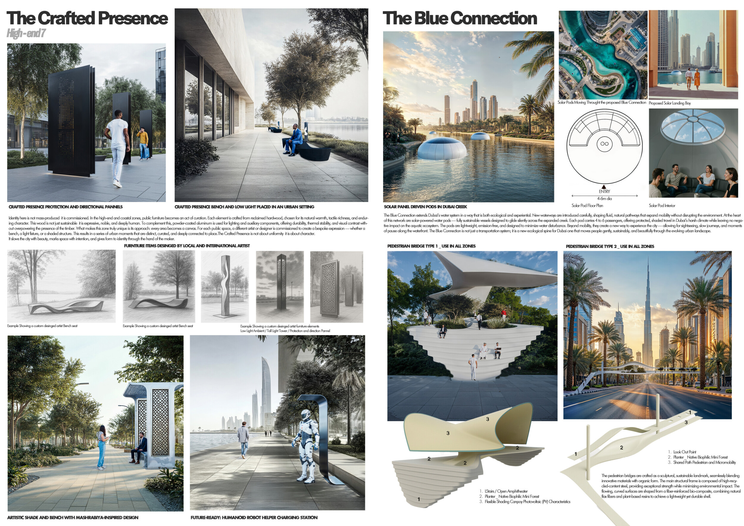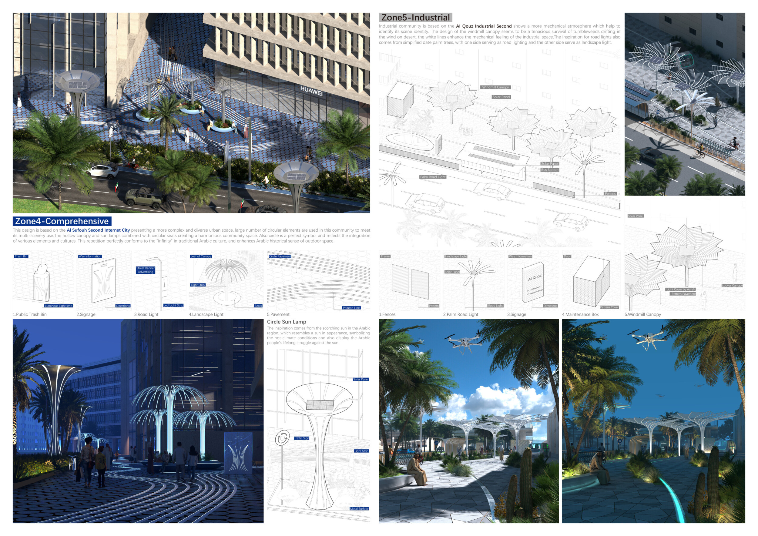 This proposal establishes a cohesive urban design system tailored to Dubai’s diverse zoning contexts, translating each area’s cultural, climatic, and programmatic character into a unified streetscape language. Seven distinct zone typologies—ranging from residential to industrial, heritage, and high-end—are articulated through a matrix of core geometries, modular shading elements, curated material palettes, and contextual wayfinding. Read more Each typology introduces unique visual identifiers: Z1 and Z2 draw on Islamic motifs and neighborhood intimacy, Z3 evokes Bedouin tents and soft landforms, while Z5 and Z7 leverage sharper geometries and premium finishes to express industrial rigor or luxury. The proposal integrates shading, pedestrian bridges, solar infrastructure, and street furniture into cohesive kit-of-parts systems adaptable across road hierarchies and public interfaces. Artistic co-design, climate-responsive strategies, and heritage continuity are embedded throughout, ensuring visual consistency while accommodating Dubai’s rapid growth, diverse urban fabrics, and the need for identity-driven public realm enhancements.