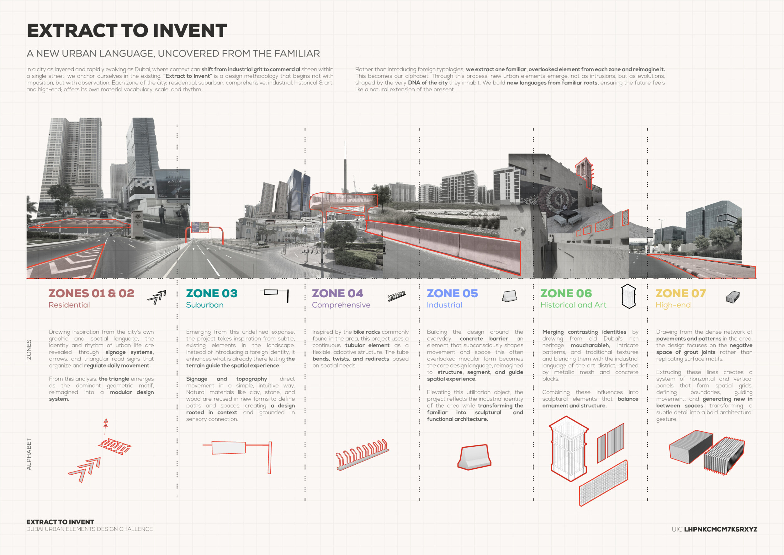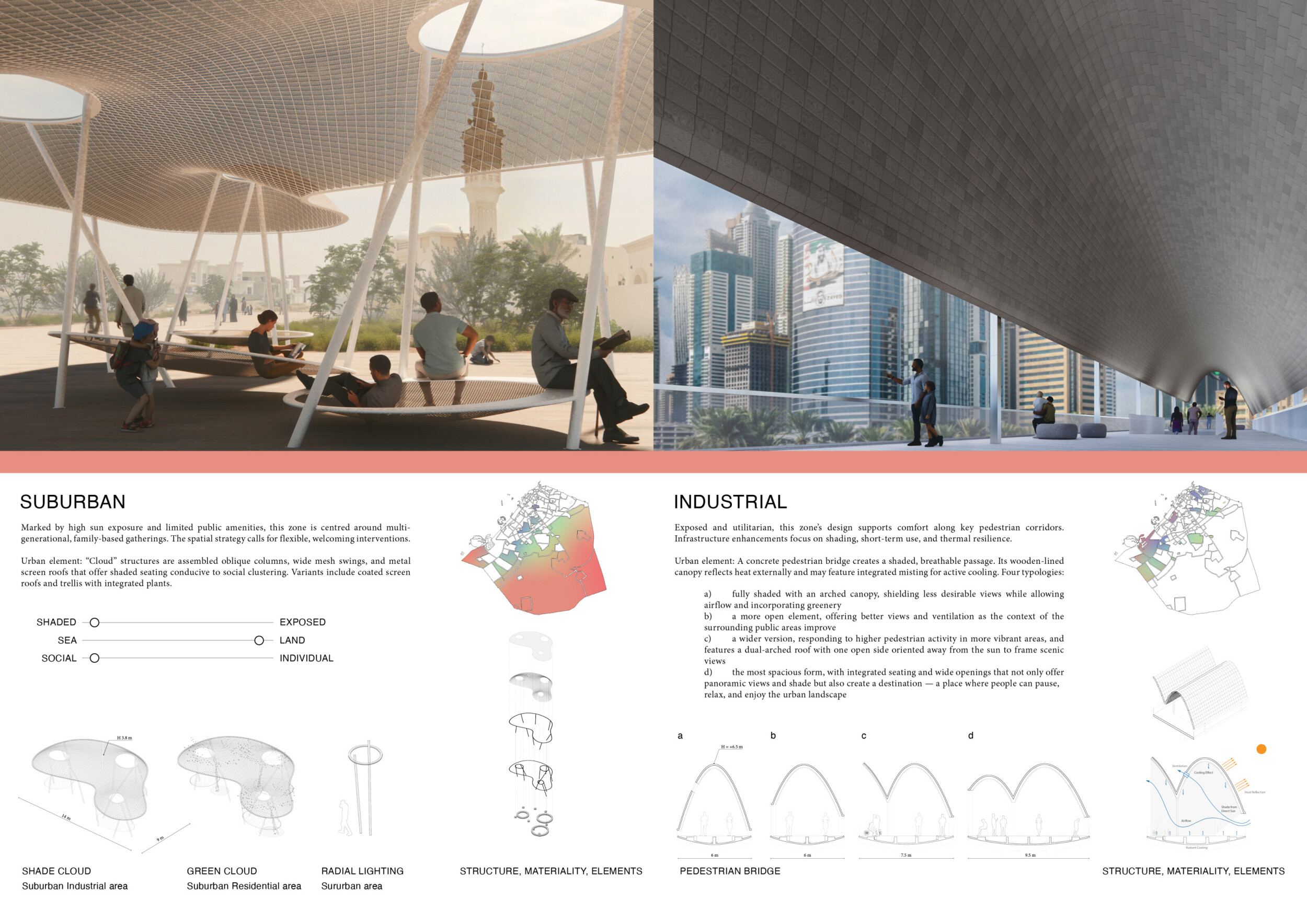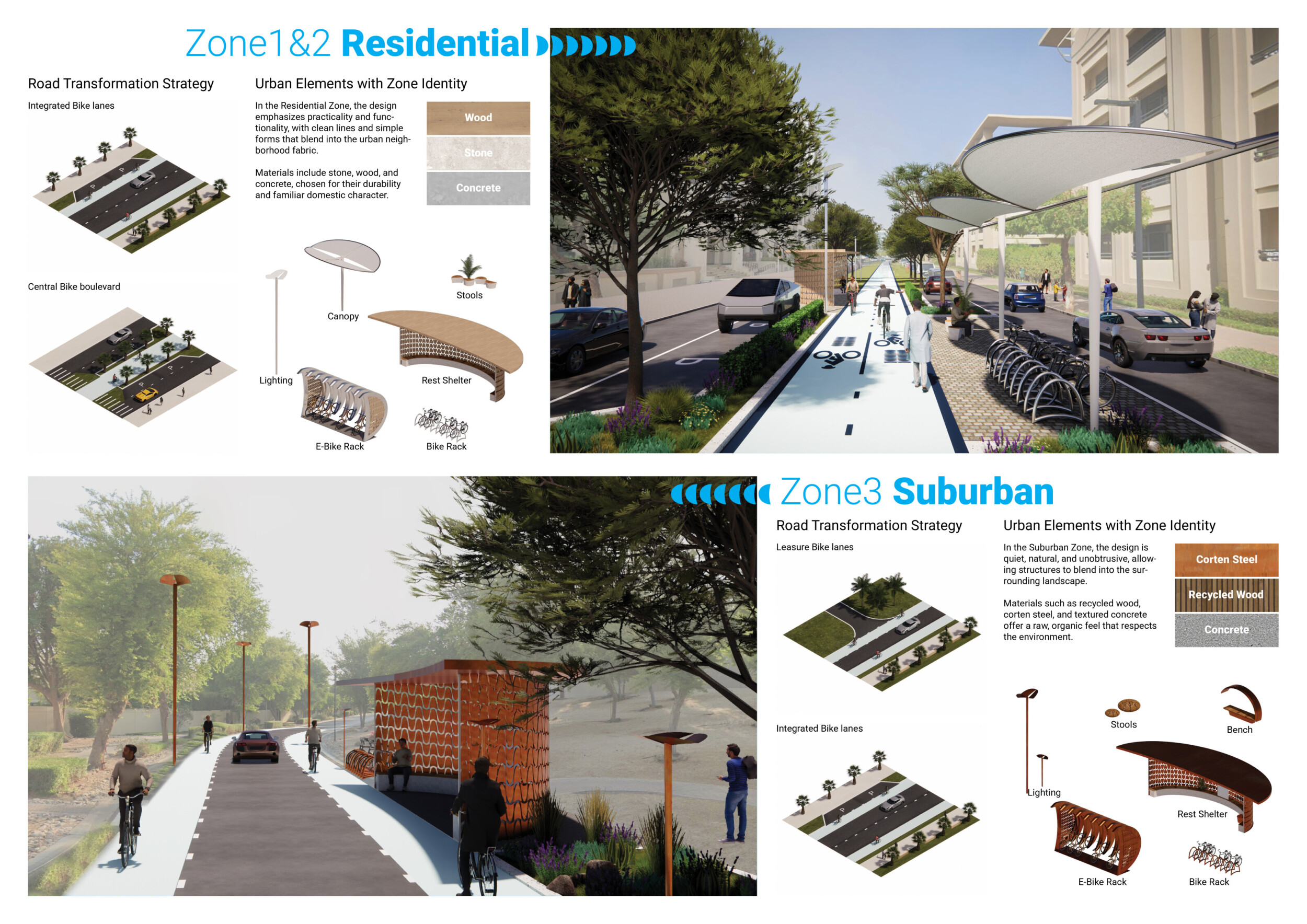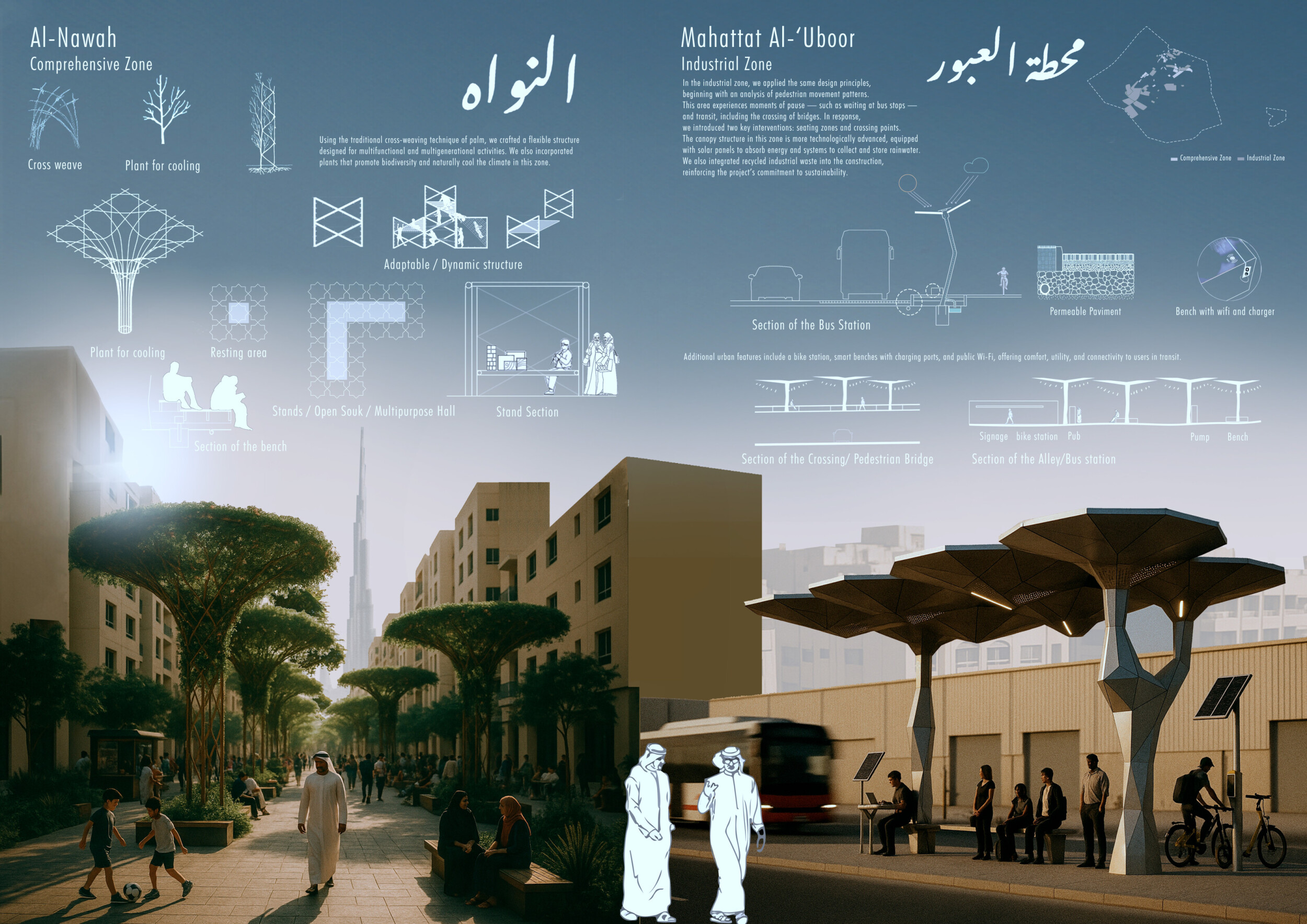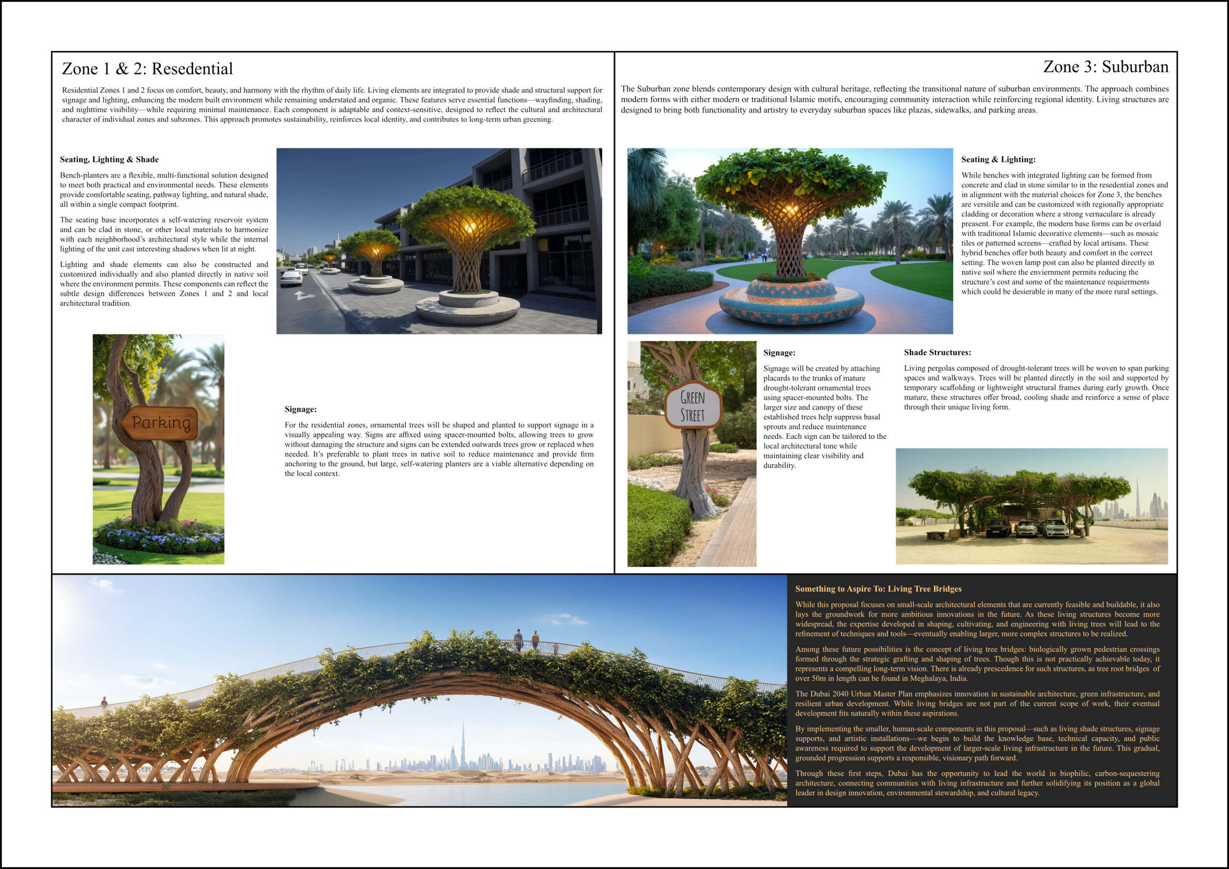 This proposal establishes a cohesive urban design system tailored to Dubai’s diverse zoning contexts, translating each area’s cultural, climatic, and programmatic character into a unified streetscape language. Seven distinct zone typologies—ranging from residential to industrial, heritage, and high-end—are articulated through a matrix of core geometries, modular shading elements, curated material palettes, and contextual wayfinding. Read more Each typology introduces unique visual identifiers: Z1 and Z2 draw on Islamic motifs and neighborhood intimacy, Z3 evokes Bedouin tents and soft landforms, while Z5 and Z7 leverage sharper geometries and premium finishes to express industrial rigor or luxury. The proposal integrates shading, pedestrian bridges, solar infrastructure, and street furniture into cohesive kit-of-parts systems adaptable across road hierarchies and public interfaces. Artistic co-design, climate-responsive strategies, and heritage continuity are embedded throughout, ensuring visual consistency while accommodating Dubai’s rapid growth, diverse urban fabrics, and the need for identity-driven public realm enhancements.