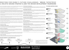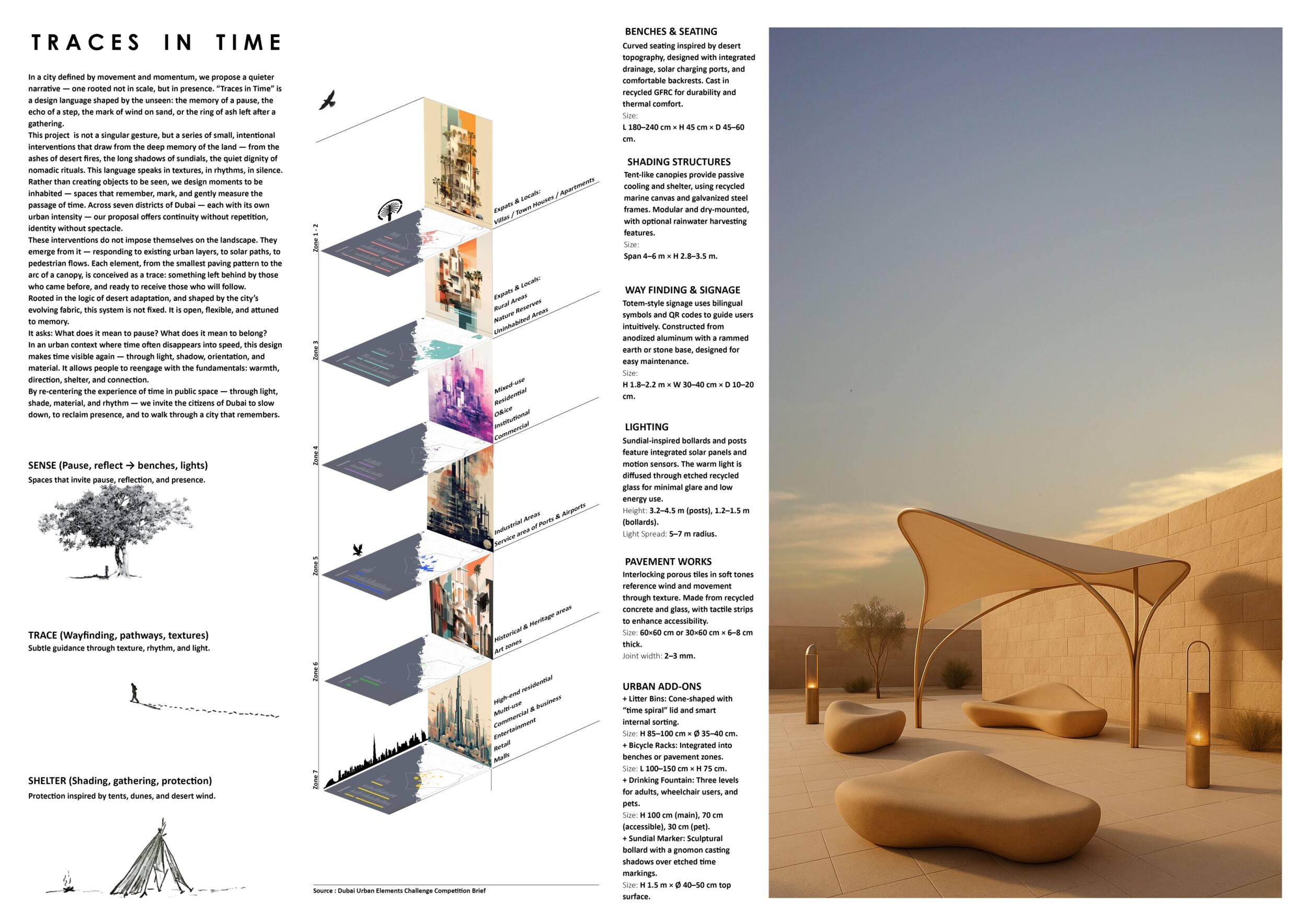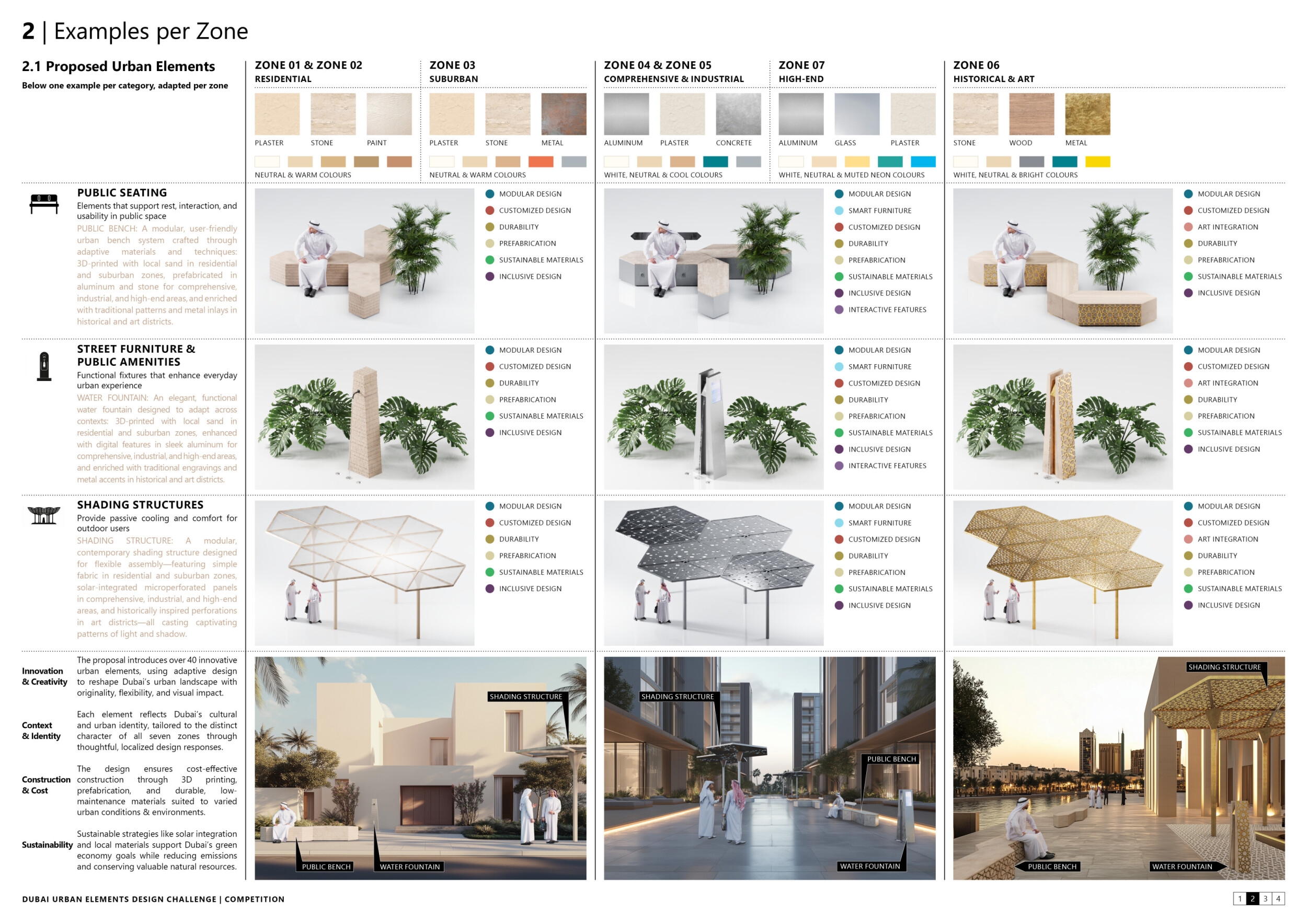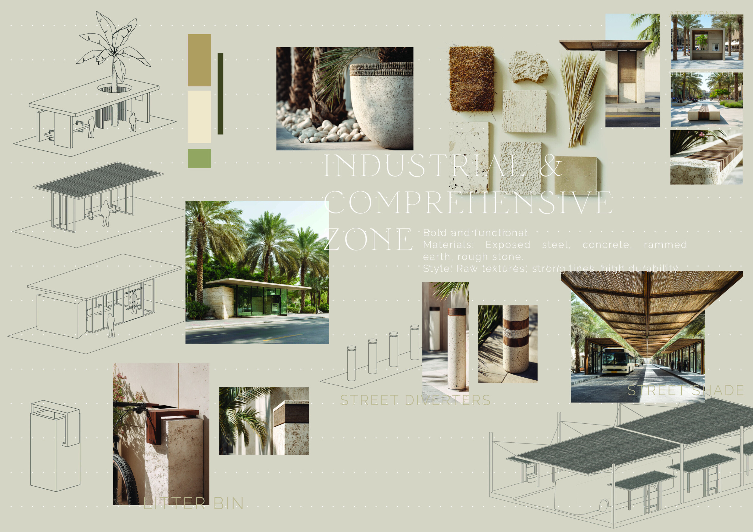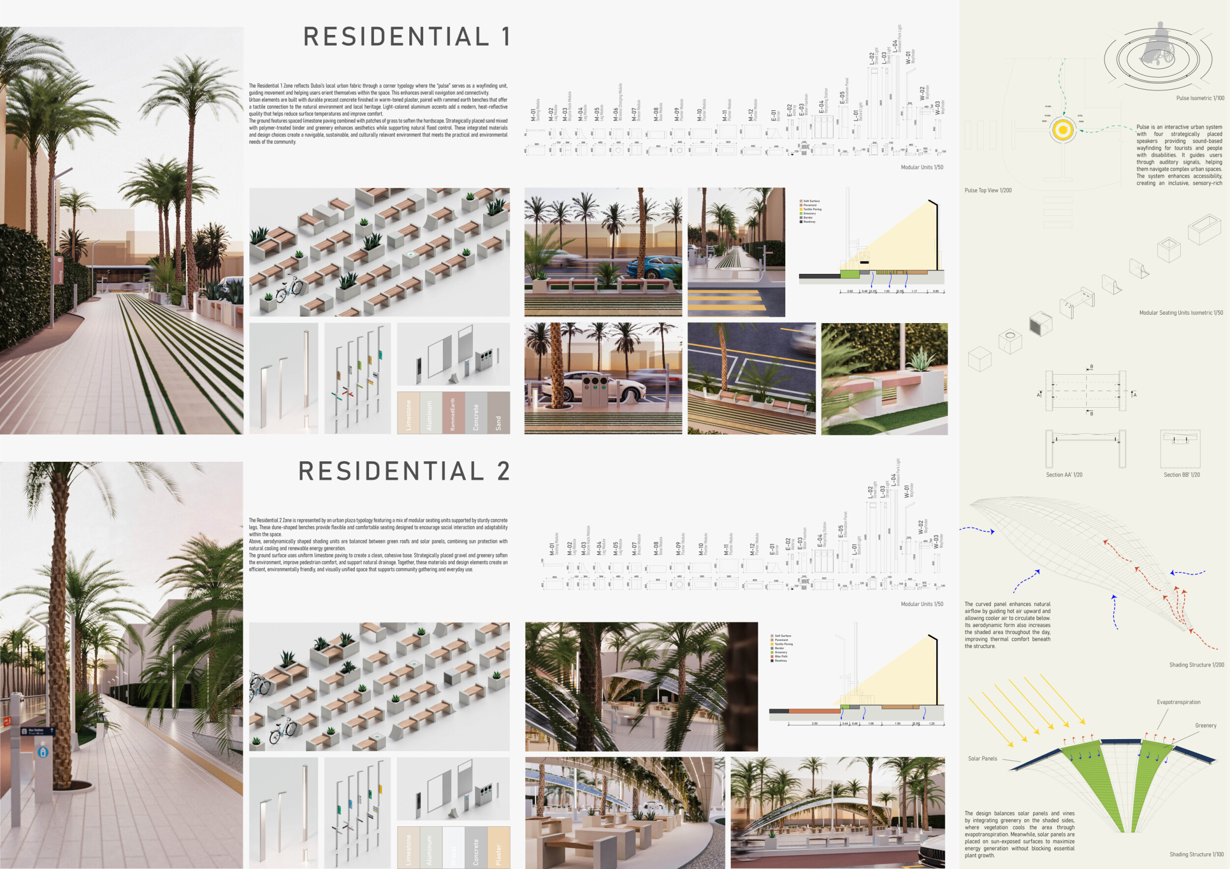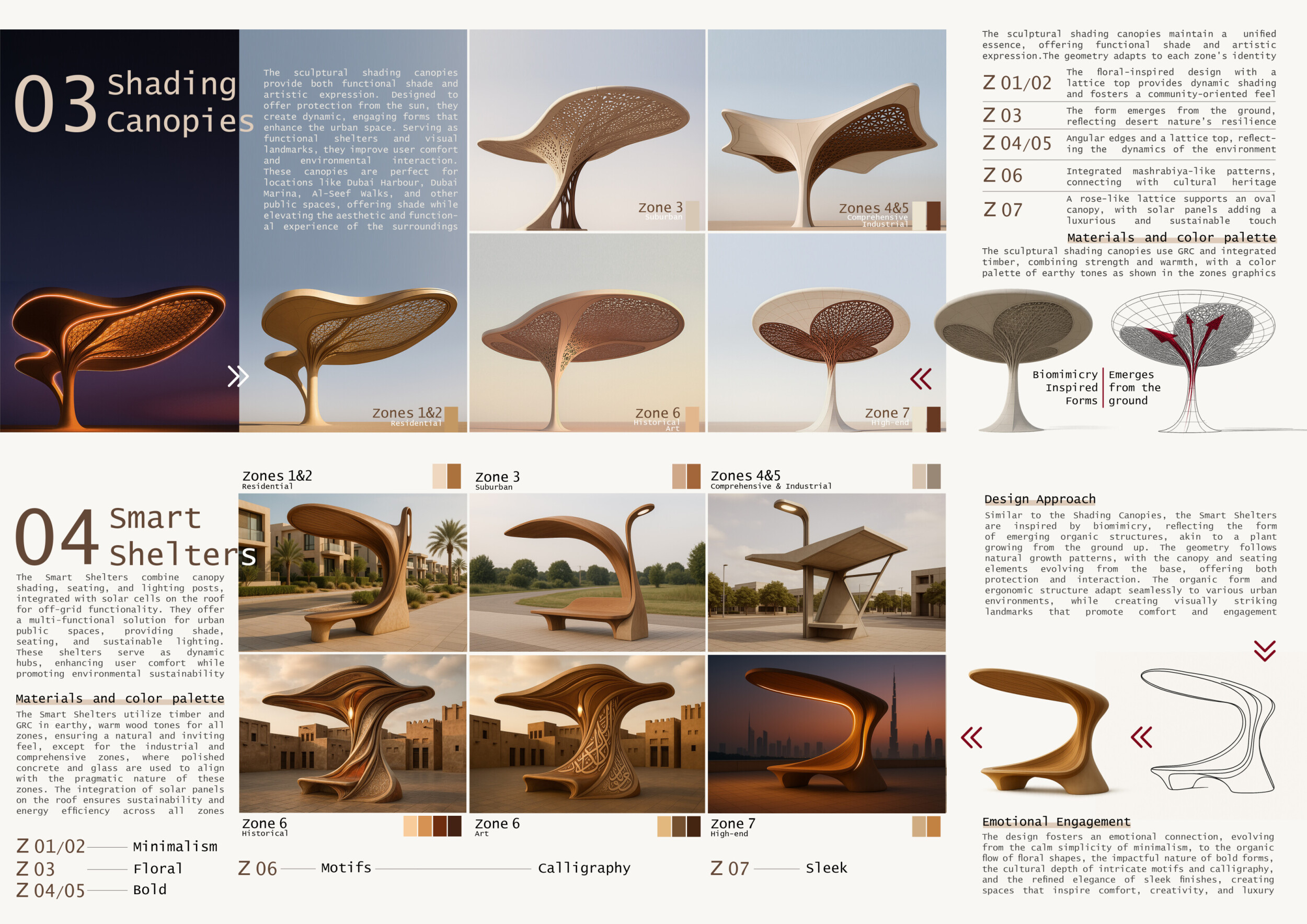 This proposal establishes a cohesive urban design system tailored to Dubai’s diverse zoning contexts, translating each area’s cultural, climatic, and programmatic character into a unified streetscape language. Seven distinct zone typologies—ranging from residential to industrial, heritage, and high-end—are articulated through a matrix of core geometries, modular shading elements, curated material palettes, and contextual wayfinding. Read more Each typology introduces unique visual identifiers: Z1 and Z2 draw on Islamic motifs and neighborhood intimacy, Z3 evokes Bedouin tents and soft landforms, while Z5 and Z7 leverage sharper geometries and premium finishes to express industrial rigor or luxury. The proposal integrates shading, pedestrian bridges, solar infrastructure, and street furniture into cohesive kit-of-parts systems adaptable across road hierarchies and public interfaces. Artistic co-design, climate-responsive strategies, and heritage continuity are embedded throughout, ensuring visual consistency while accommodating Dubai’s rapid growth, diverse urban fabrics, and the need for identity-driven public realm enhancements.