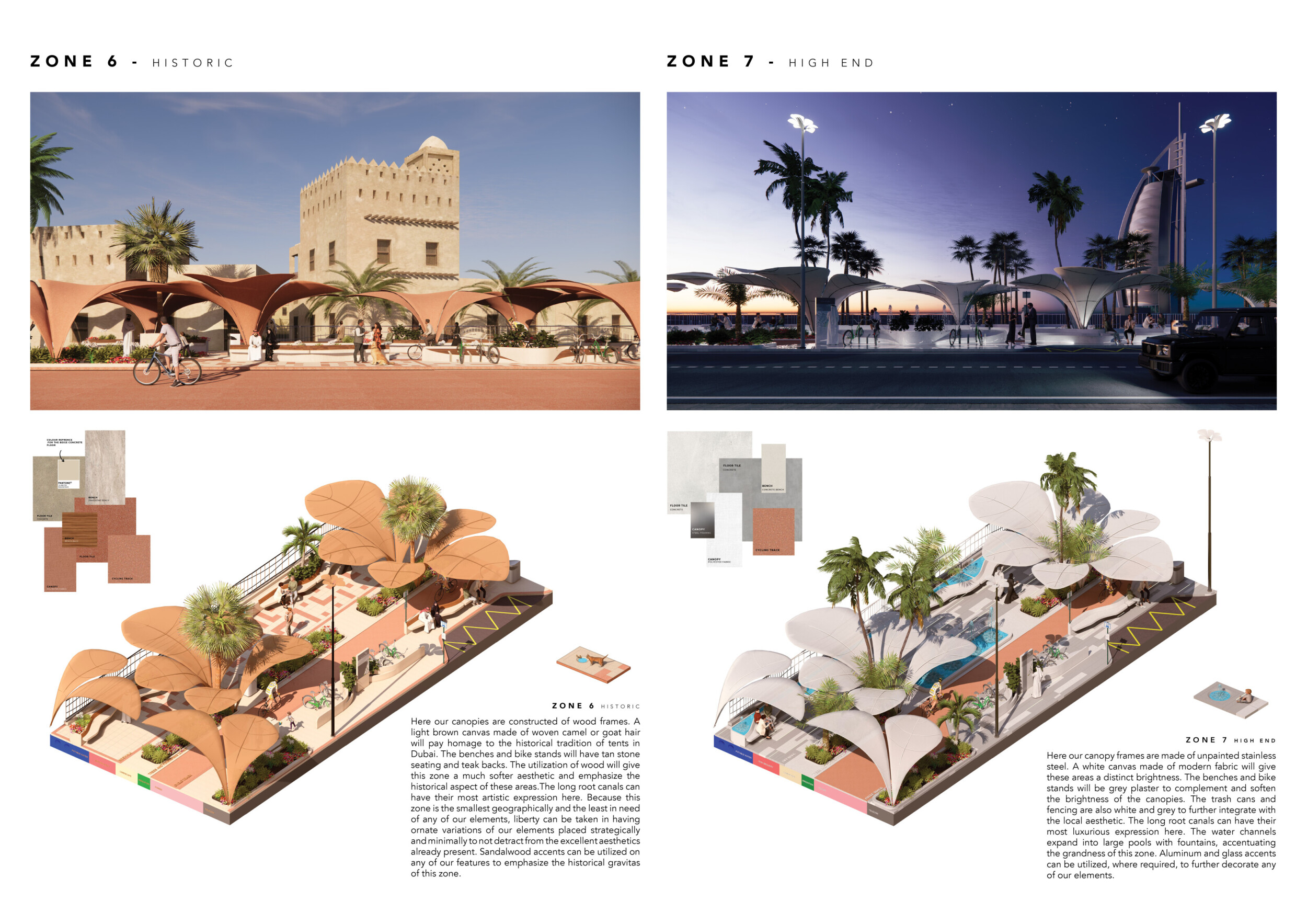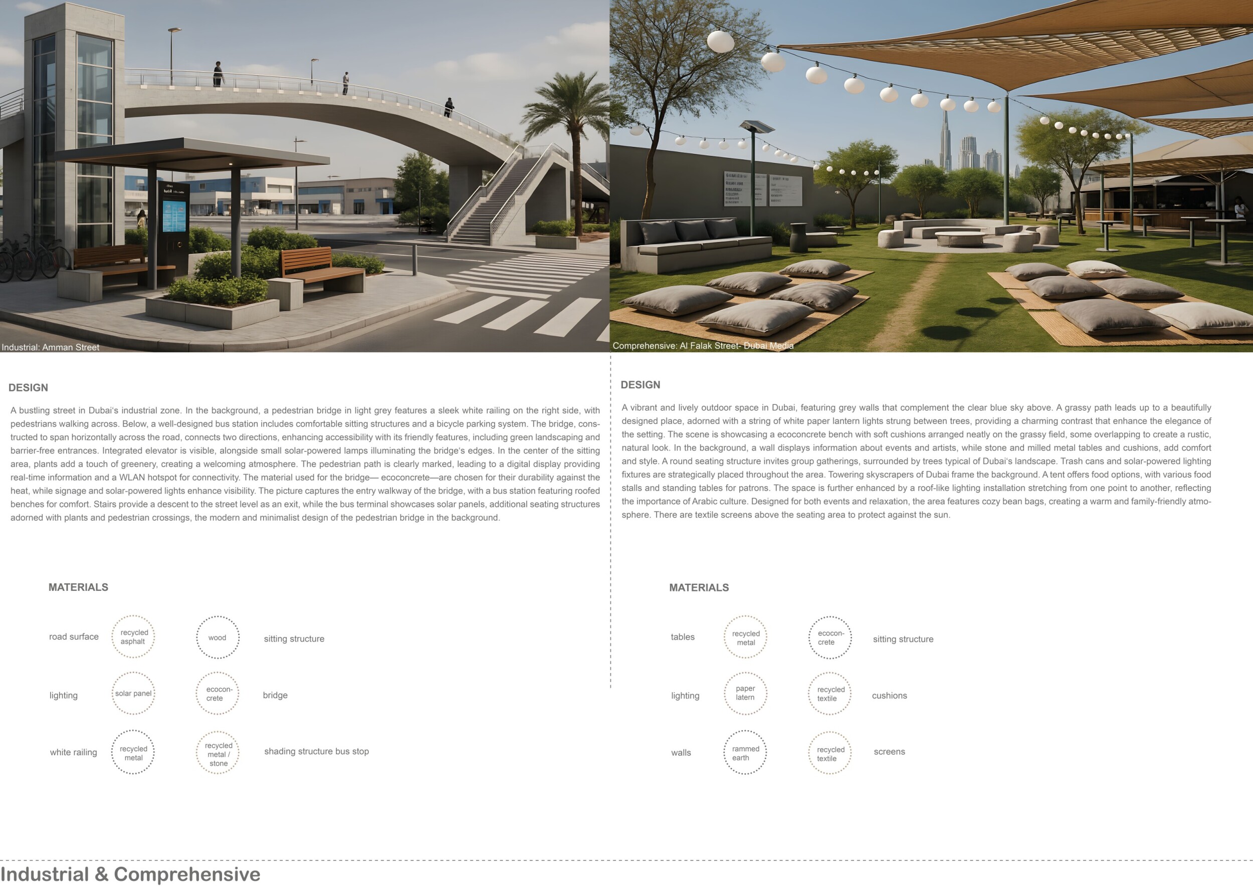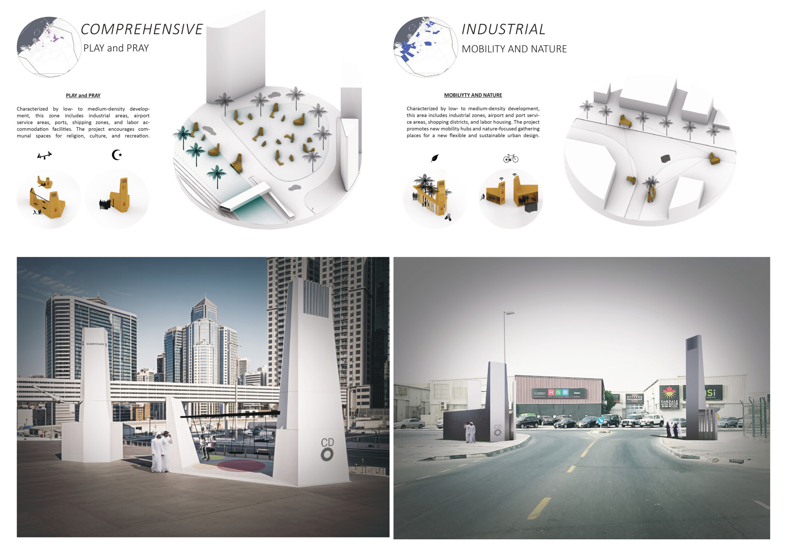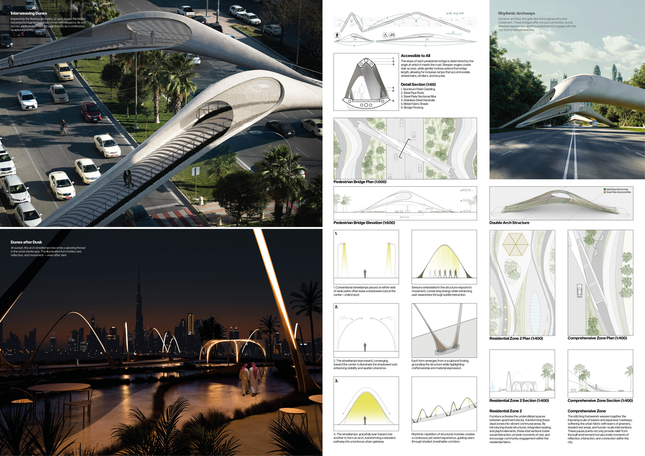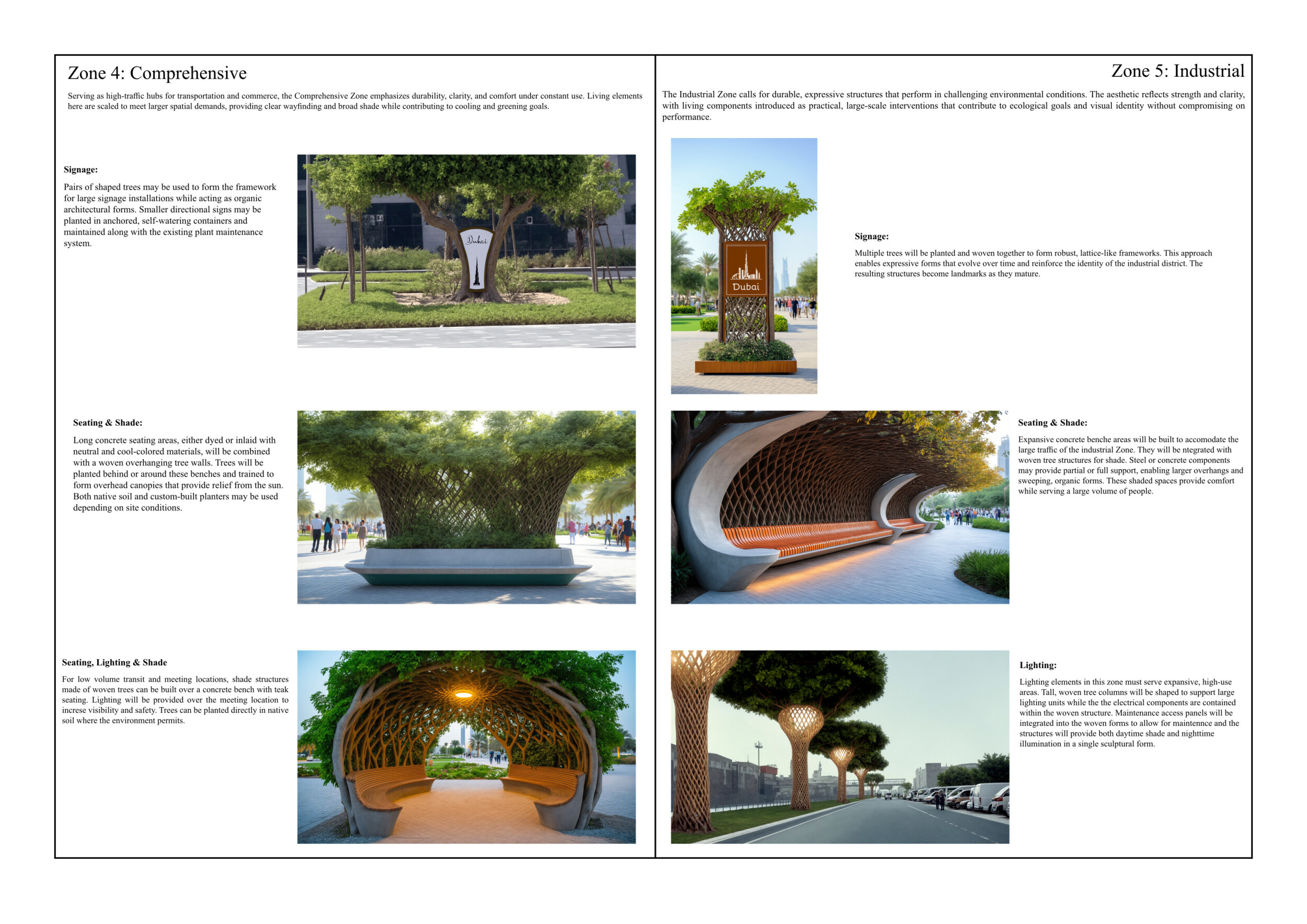 This proposal establishes a cohesive urban design system tailored to Dubai’s diverse zoning contexts, translating each area’s cultural, climatic, and programmatic character into a unified streetscape language. Seven distinct zone typologies—ranging from residential to industrial, heritage, and high-end—are articulated through a matrix of core geometries, modular shading elements, curated material palettes, and contextual wayfinding. Read more Each typology introduces unique visual identifiers: Z1 and Z2 draw on Islamic motifs and neighborhood intimacy, Z3 evokes Bedouin tents and soft landforms, while Z5 and Z7 leverage sharper geometries and premium finishes to express industrial rigor or luxury. The proposal integrates shading, pedestrian bridges, solar infrastructure, and street furniture into cohesive kit-of-parts systems adaptable across road hierarchies and public interfaces. Artistic co-design, climate-responsive strategies, and heritage continuity are embedded throughout, ensuring visual consistency while accommodating Dubai’s rapid growth, diverse urban fabrics, and the need for identity-driven public realm enhancements.