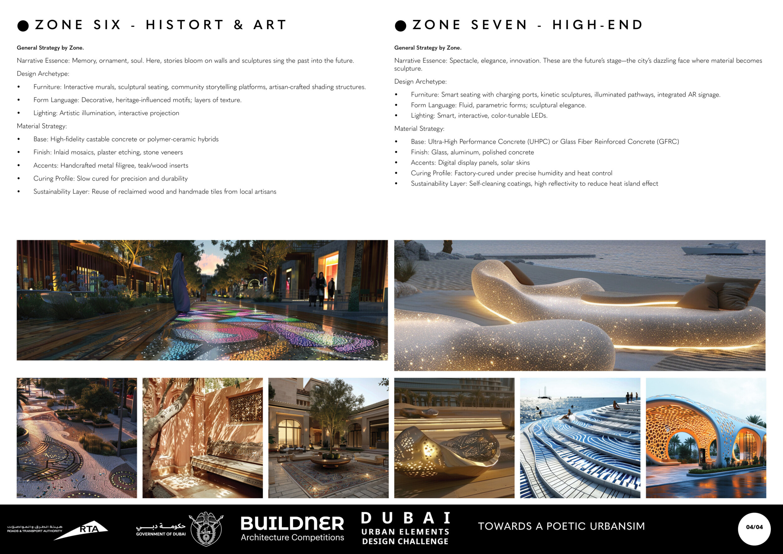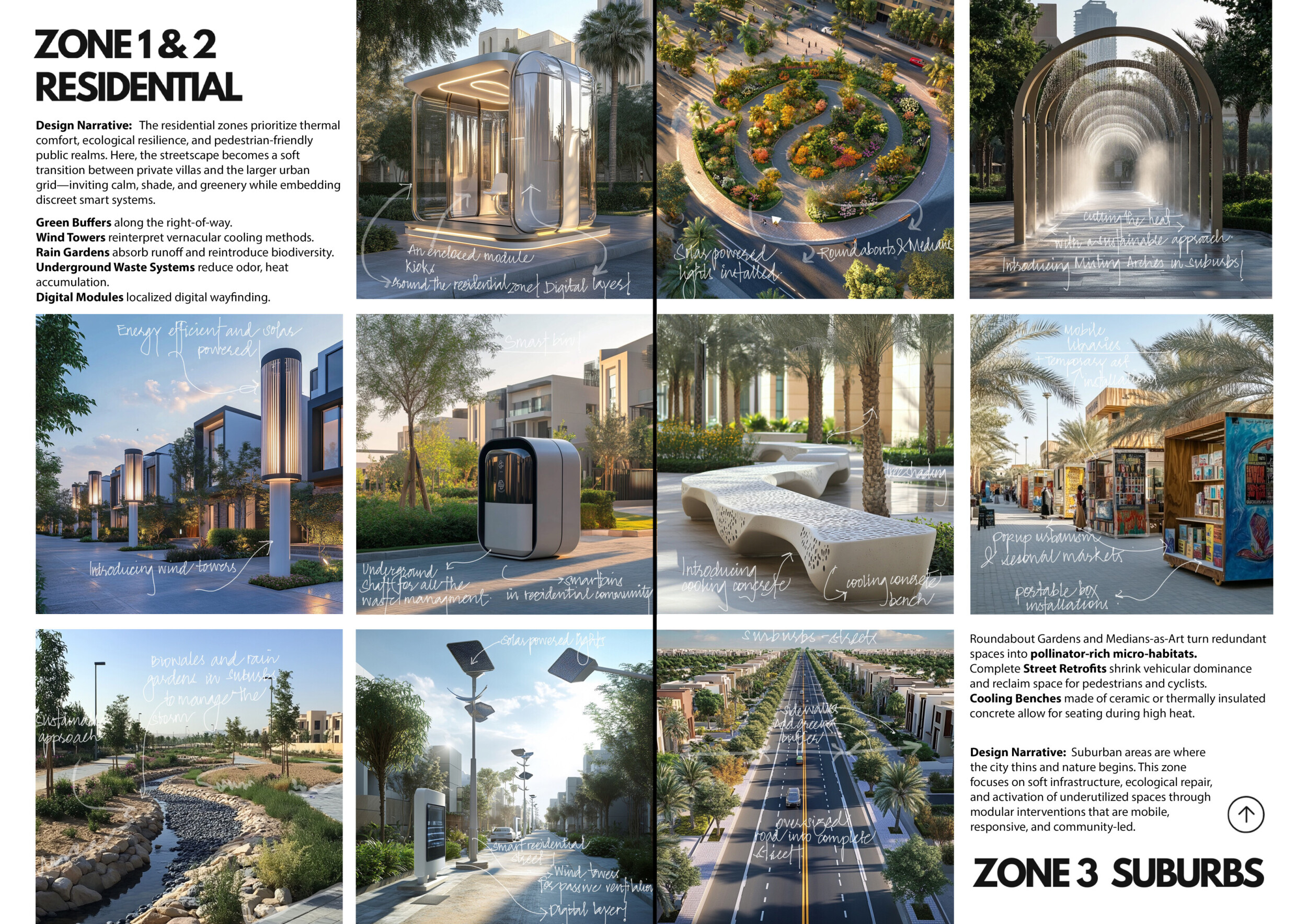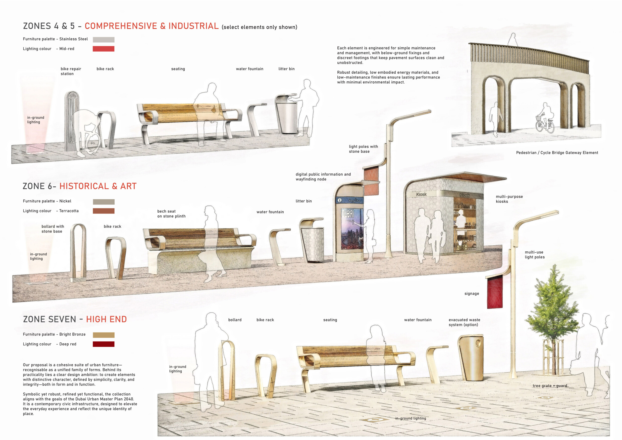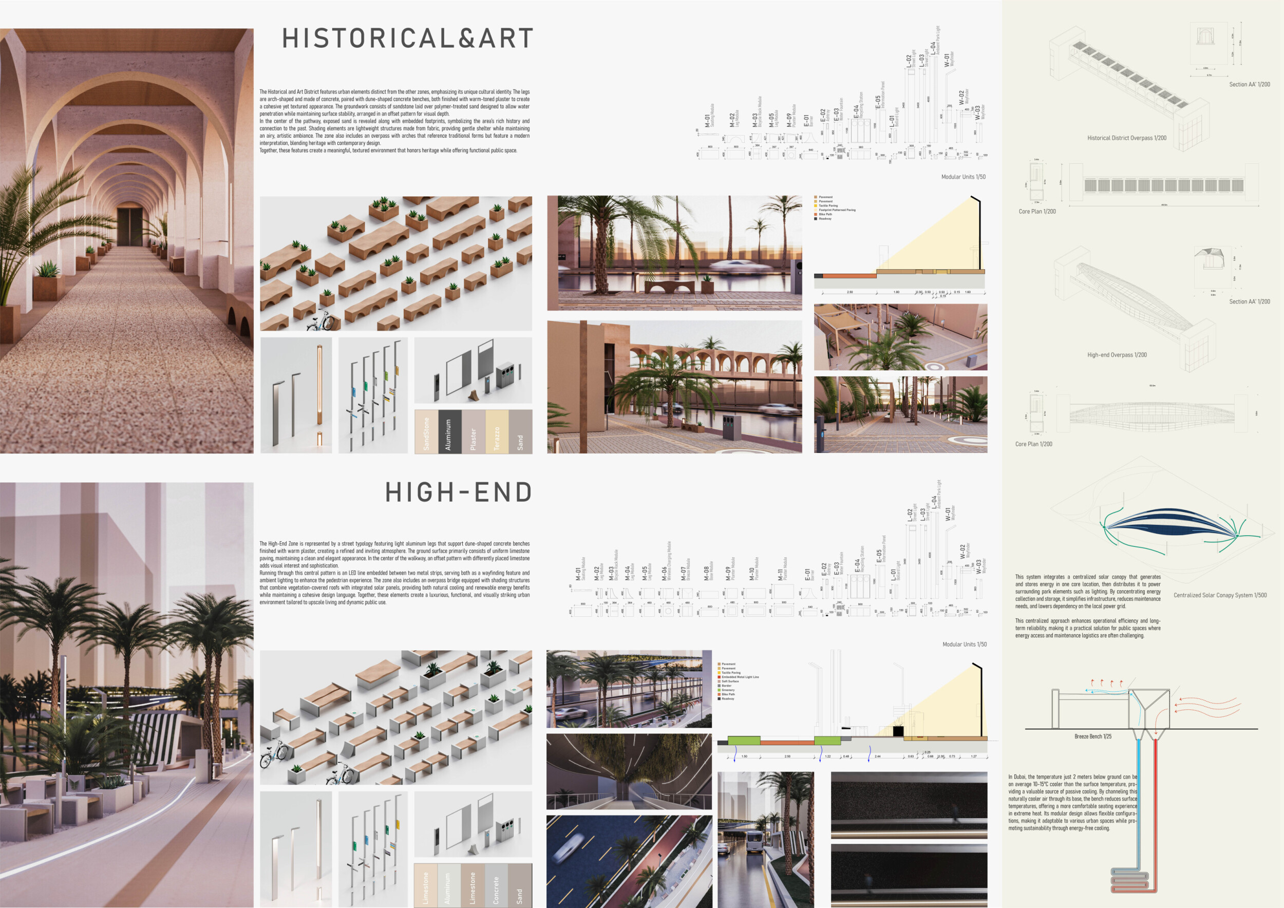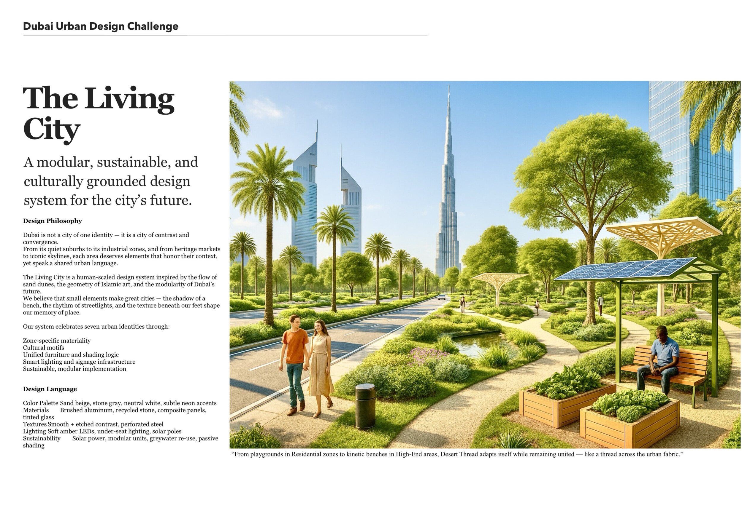 This proposal establishes a cohesive urban design system tailored to Dubai’s diverse zoning contexts, translating each area’s cultural, climatic, and programmatic character into a unified streetscape language. Seven distinct zone typologies—ranging from residential to industrial, heritage, and high-end—are articulated through a matrix of core geometries, modular shading elements, curated material palettes, and contextual wayfinding. Read more Each typology introduces unique visual identifiers: Z1 and Z2 draw on Islamic motifs and neighborhood intimacy, Z3 evokes Bedouin tents and soft landforms, while Z5 and Z7 leverage sharper geometries and premium finishes to express industrial rigor or luxury. The proposal integrates shading, pedestrian bridges, solar infrastructure, and street furniture into cohesive kit-of-parts systems adaptable across road hierarchies and public interfaces. Artistic co-design, climate-responsive strategies, and heritage continuity are embedded throughout, ensuring visual consistency while accommodating Dubai’s rapid growth, diverse urban fabrics, and the need for identity-driven public realm enhancements.