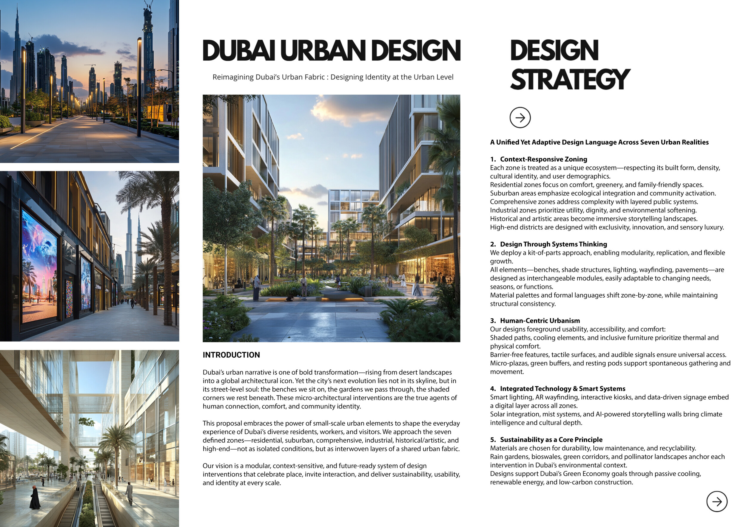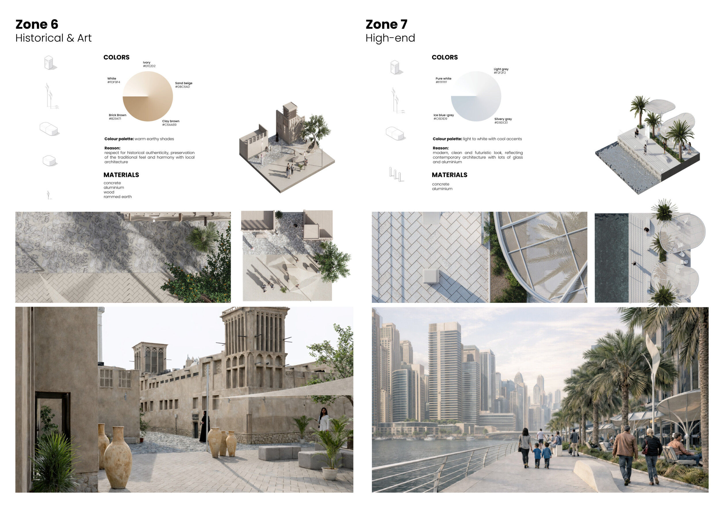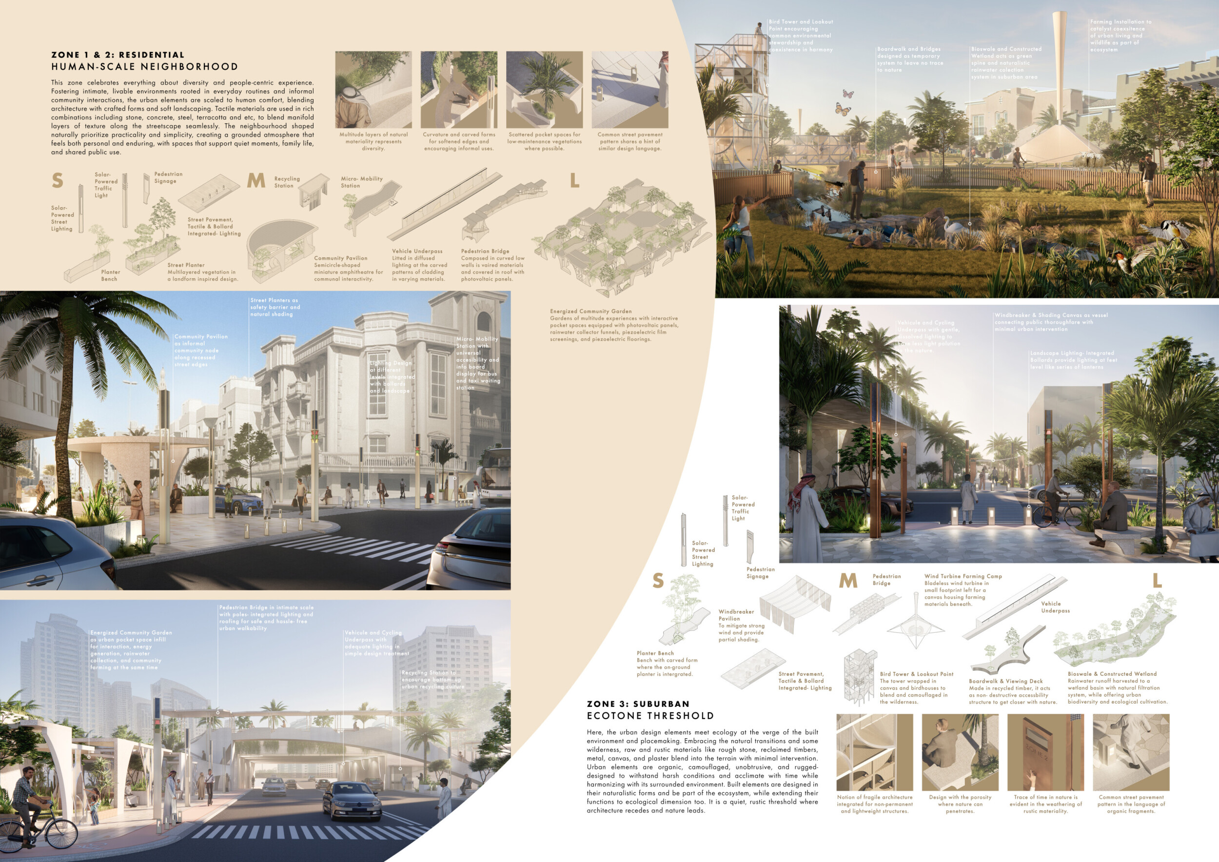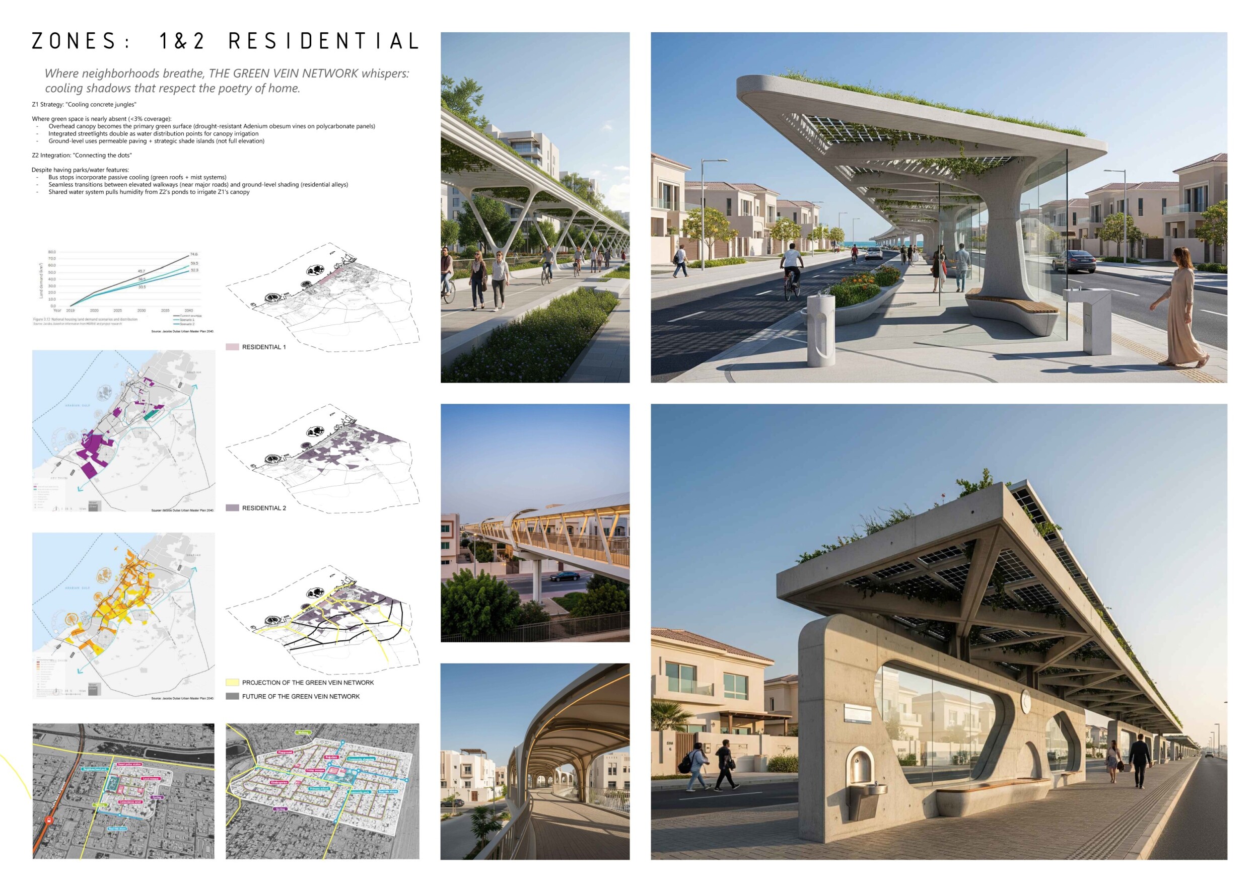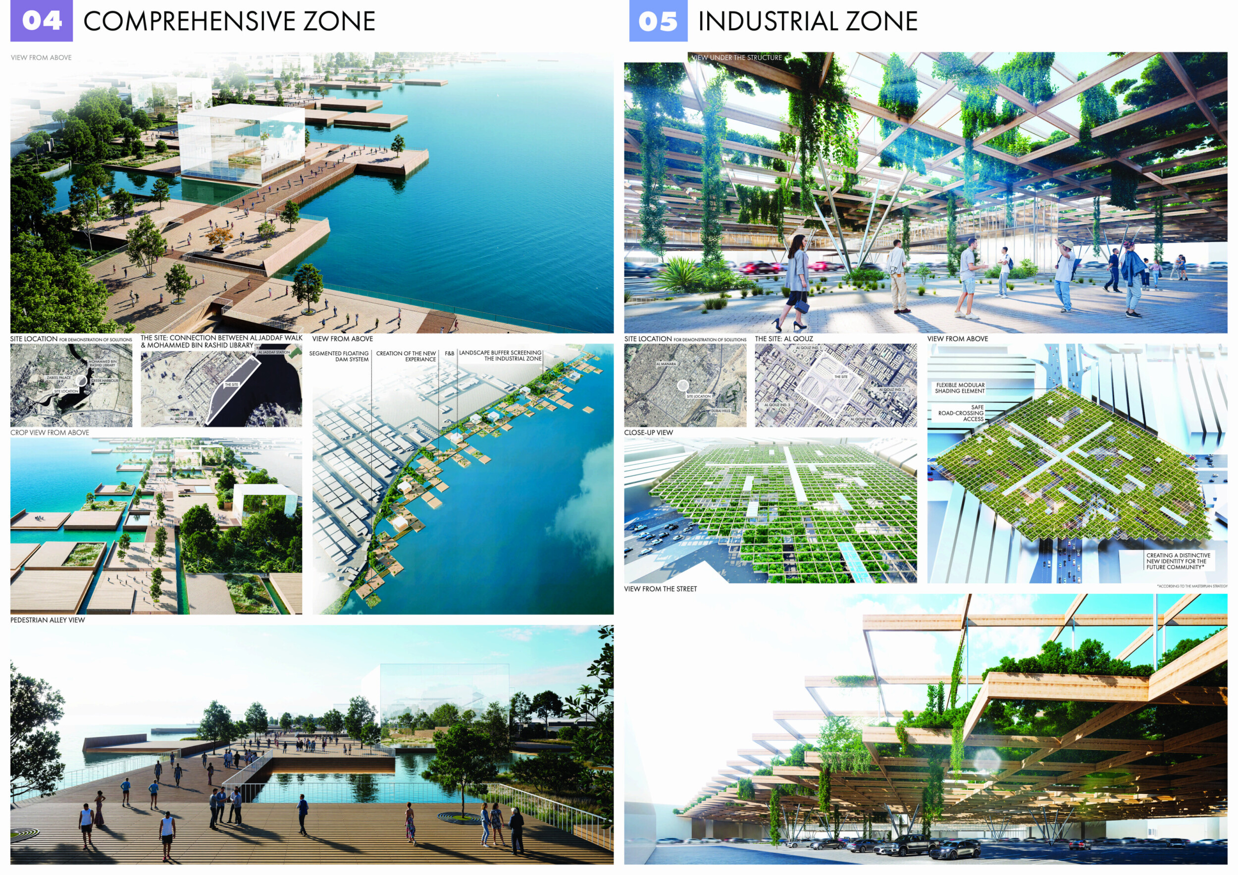 This proposal establishes a cohesive urban design system tailored to Dubai’s diverse zoning contexts, translating each area’s cultural, climatic, and programmatic character into a unified streetscape language. Seven distinct zone typologies—ranging from residential to industrial, heritage, and high-end—are articulated through a matrix of core geometries, modular shading elements, curated material palettes, and contextual wayfinding. Read more Each typology introduces unique visual identifiers: Z1 and Z2 draw on Islamic motifs and neighborhood intimacy, Z3 evokes Bedouin tents and soft landforms, while Z5 and Z7 leverage sharper geometries and premium finishes to express industrial rigor or luxury. The proposal integrates shading, pedestrian bridges, solar infrastructure, and street furniture into cohesive kit-of-parts systems adaptable across road hierarchies and public interfaces. Artistic co-design, climate-responsive strategies, and heritage continuity are embedded throughout, ensuring visual consistency while accommodating Dubai’s rapid growth, diverse urban fabrics, and the need for identity-driven public realm enhancements.