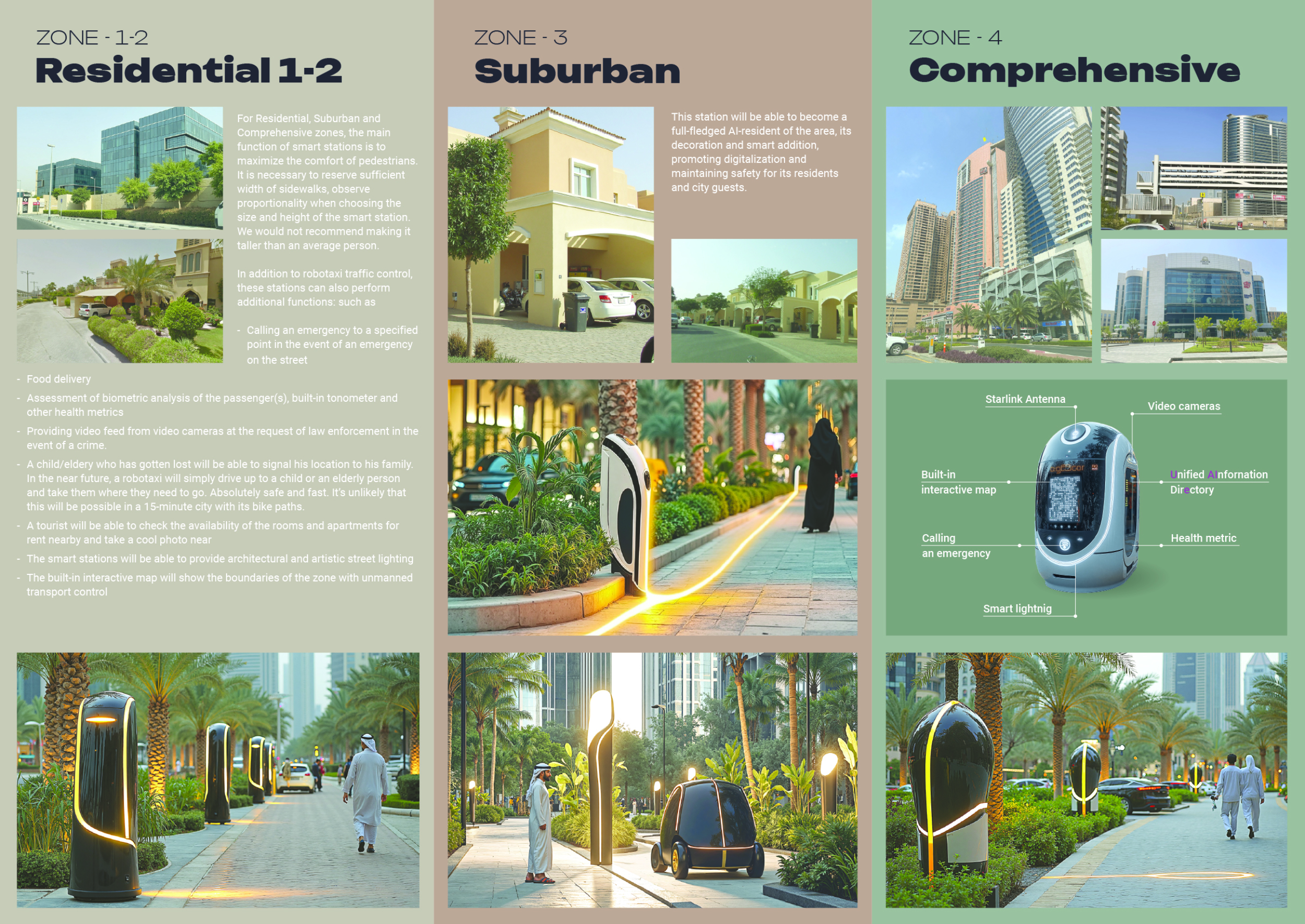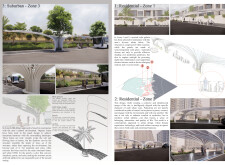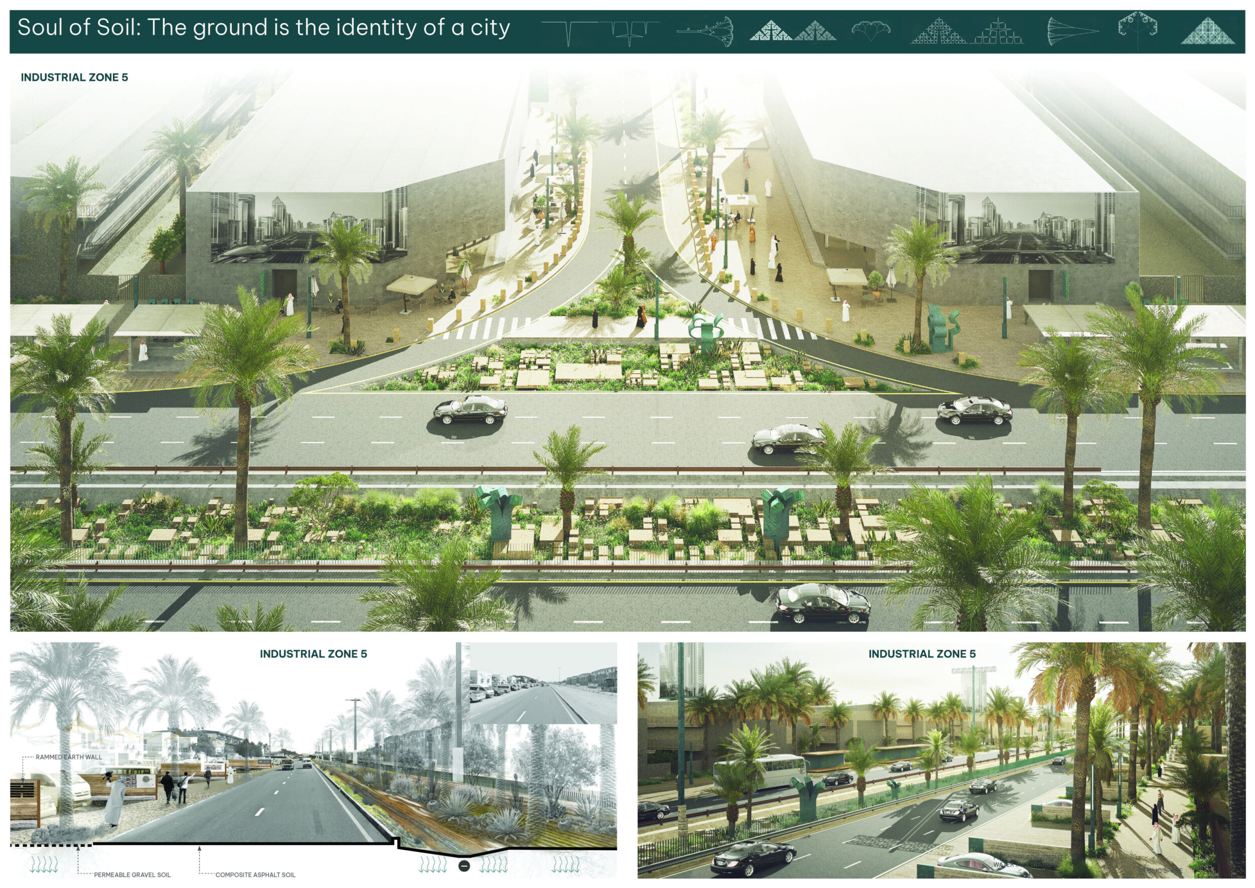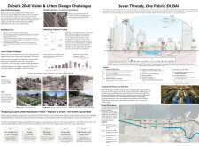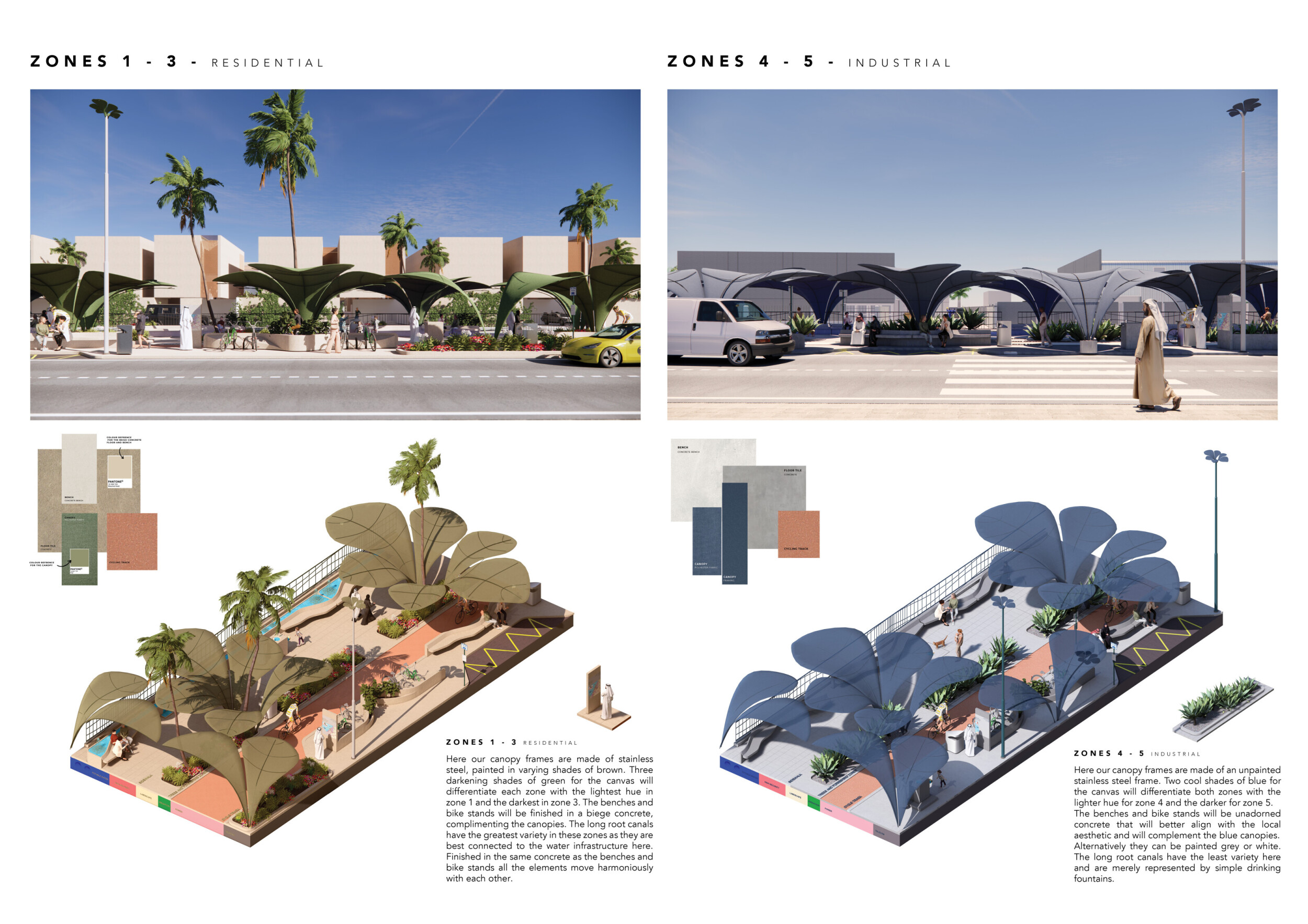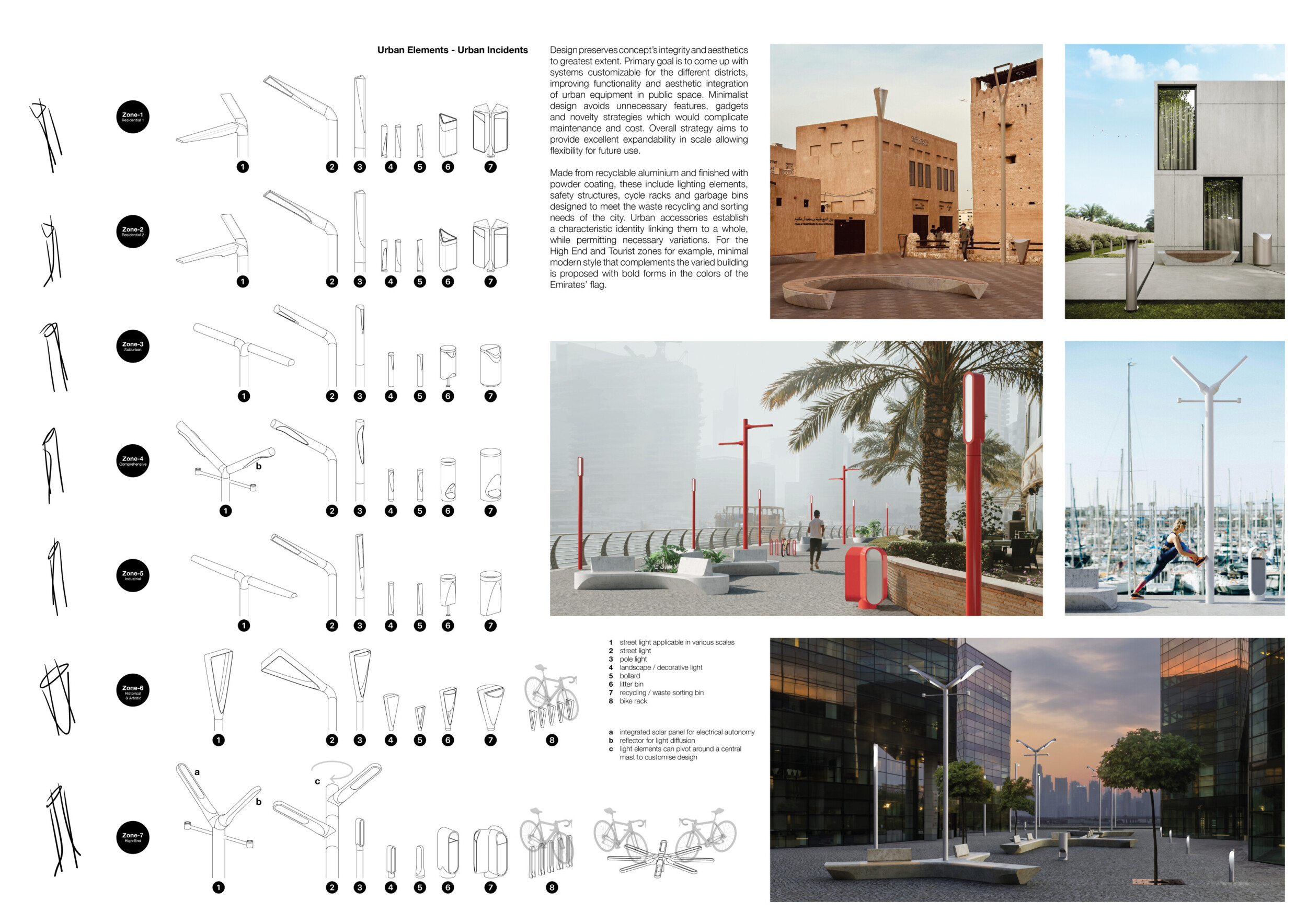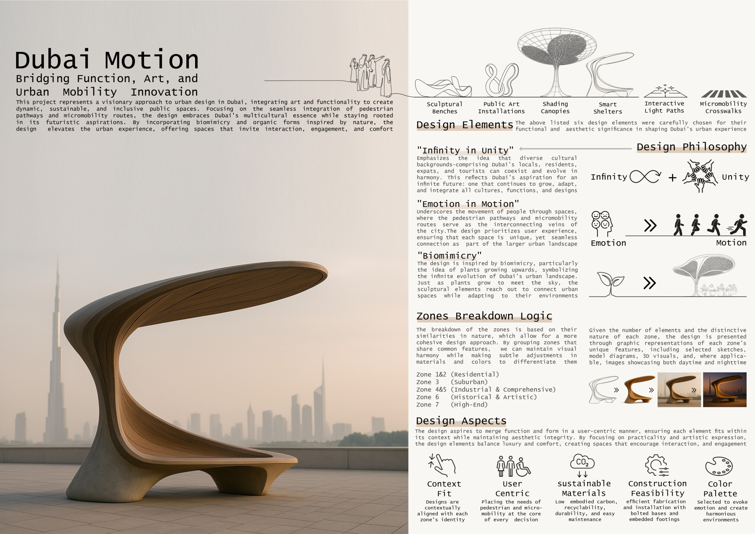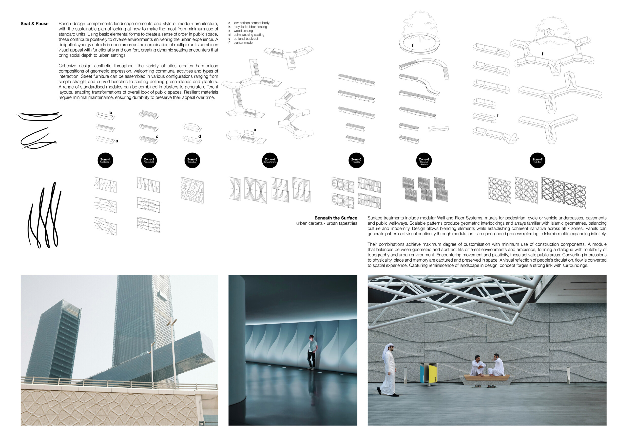 This proposal establishes a cohesive urban design system tailored to Dubai’s diverse zoning contexts, translating each area’s cultural, climatic, and programmatic character into a unified streetscape language. Seven distinct zone typologies—ranging from residential to industrial, heritage, and high-end—are articulated through a matrix of core geometries, modular shading elements, curated material palettes, and contextual wayfinding. Read more Each typology introduces unique visual identifiers: Z1 and Z2 draw on Islamic motifs and neighborhood intimacy, Z3 evokes Bedouin tents and soft landforms, while Z5 and Z7 leverage sharper geometries and premium finishes to express industrial rigor or luxury. The proposal integrates shading, pedestrian bridges, solar infrastructure, and street furniture into cohesive kit-of-parts systems adaptable across road hierarchies and public interfaces. Artistic co-design, climate-responsive strategies, and heritage continuity are embedded throughout, ensuring visual consistency while accommodating Dubai’s rapid growth, diverse urban fabrics, and the need for identity-driven public realm enhancements.