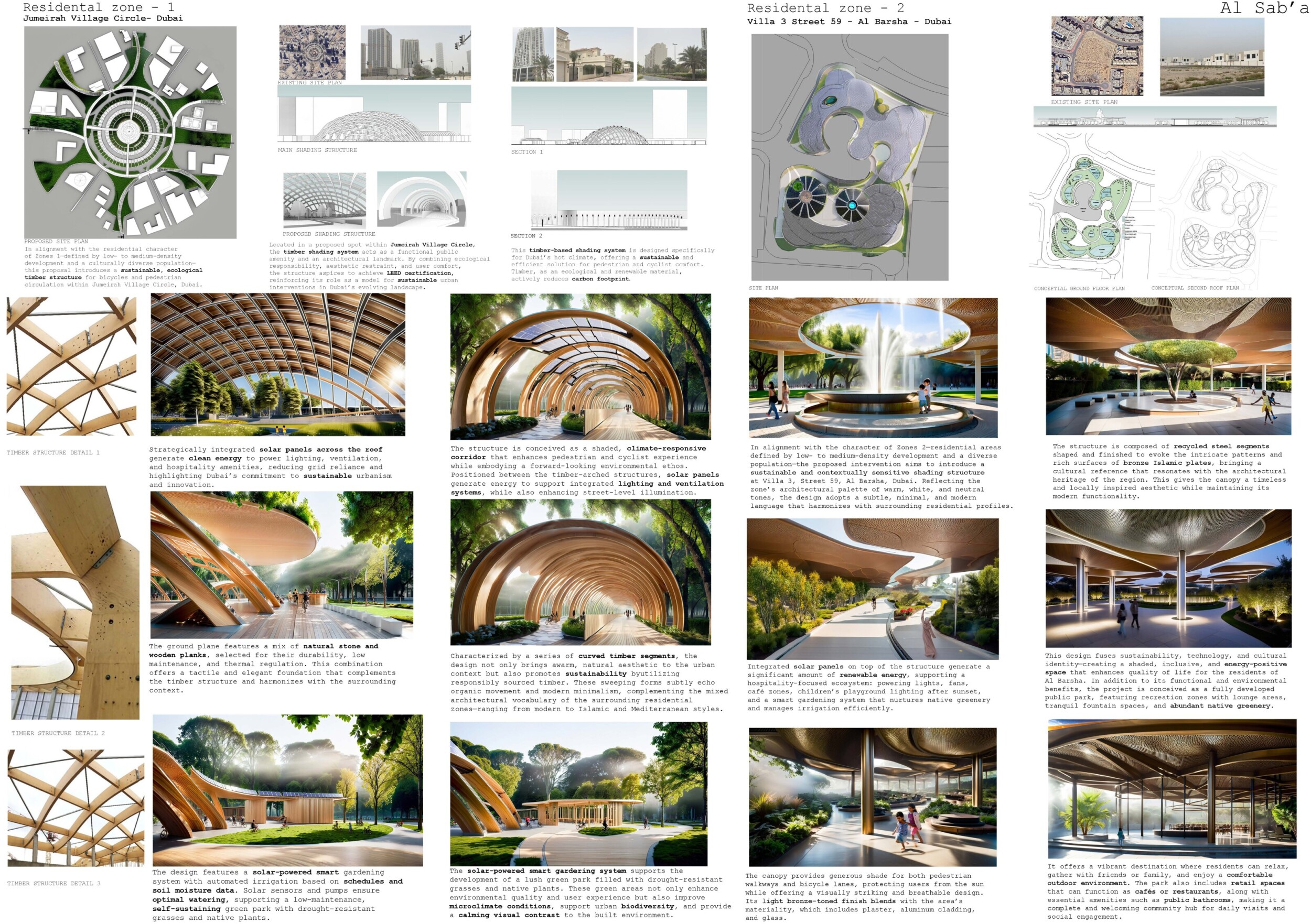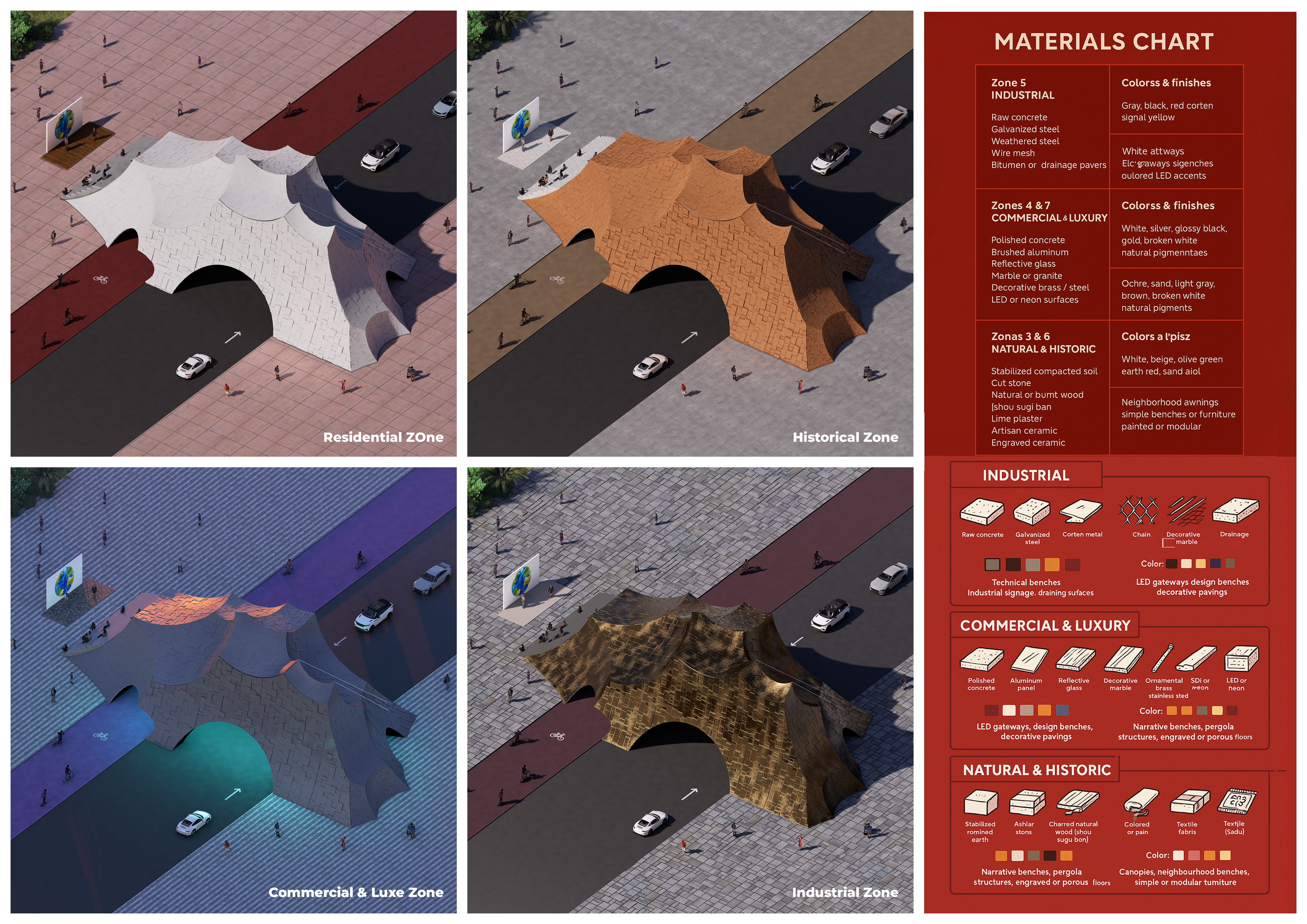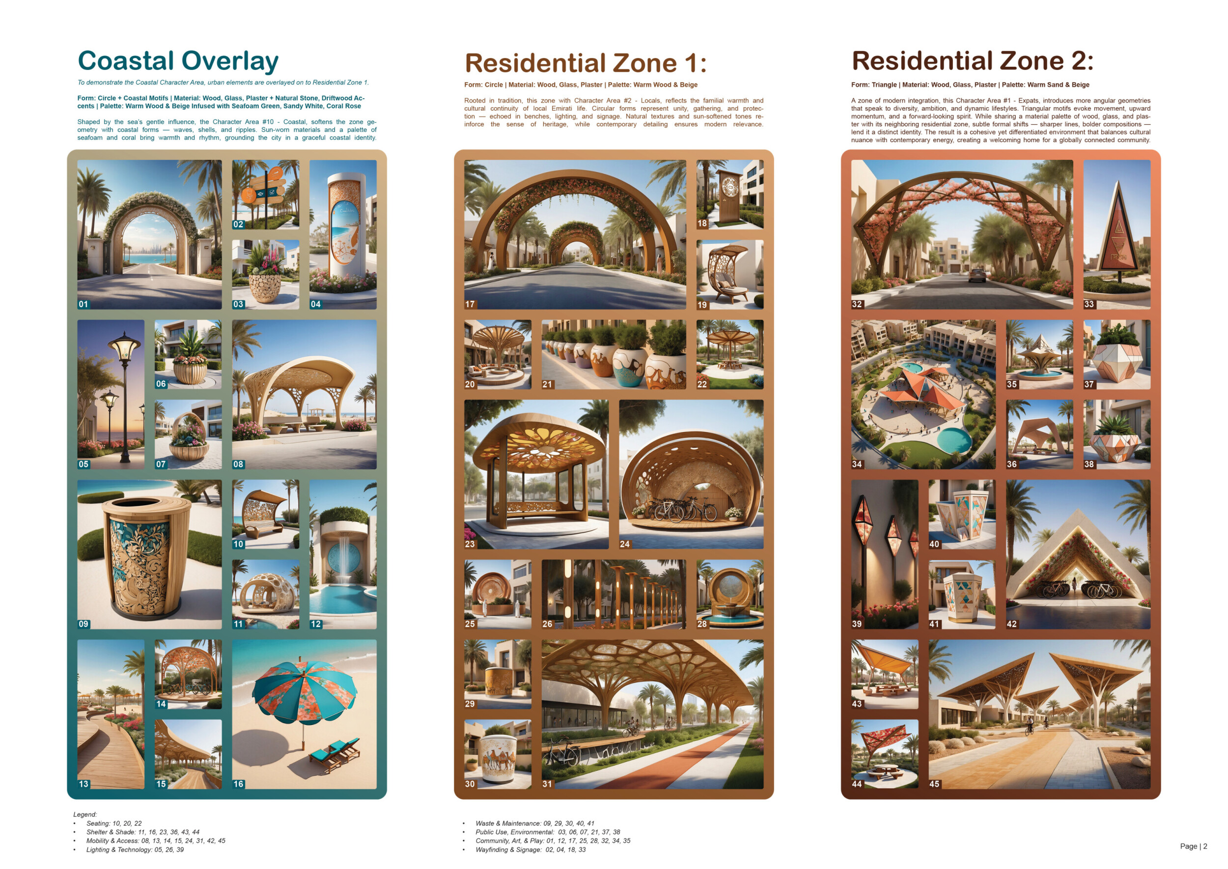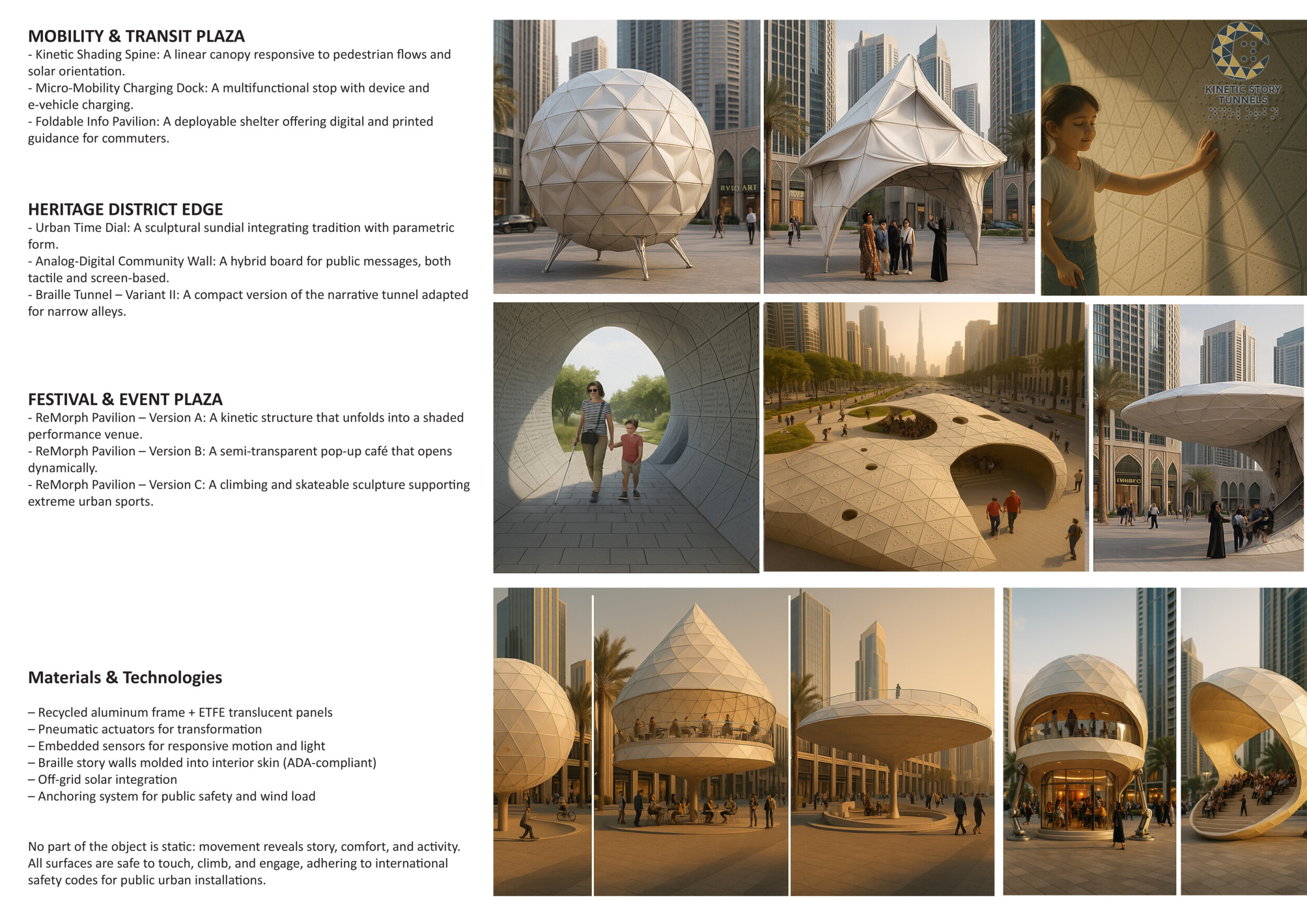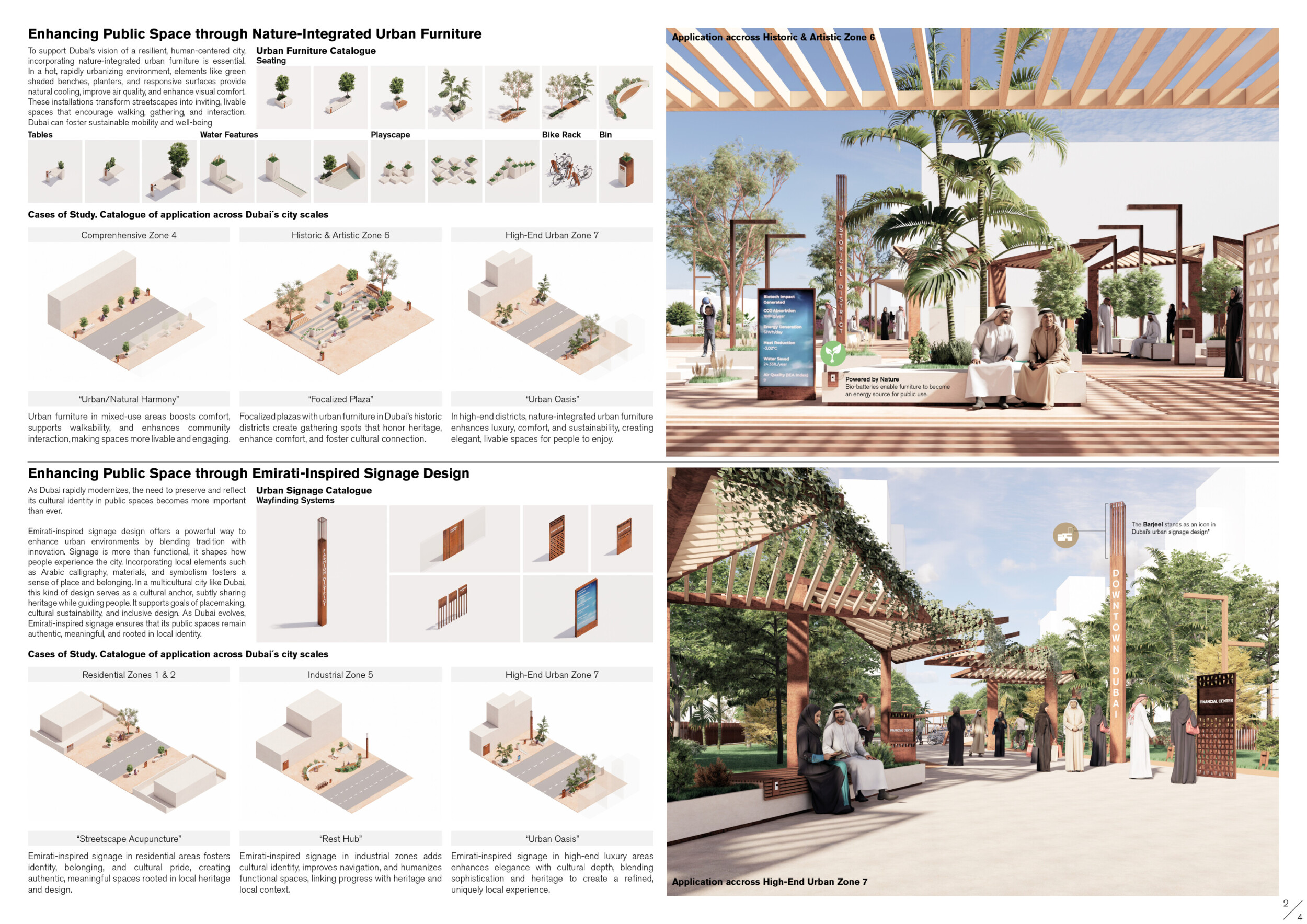 This proposal establishes a cohesive urban design system tailored to Dubai’s diverse zoning contexts, translating each area’s cultural, climatic, and programmatic character into a unified streetscape language. Seven distinct zone typologies—ranging from residential to industrial, heritage, and high-end—are articulated through a matrix of core geometries, modular shading elements, curated material palettes, and contextual wayfinding. Read more Each typology introduces unique visual identifiers: Z1 and Z2 draw on Islamic motifs and neighborhood intimacy, Z3 evokes Bedouin tents and soft landforms, while Z5 and Z7 leverage sharper geometries and premium finishes to express industrial rigor or luxury. The proposal integrates shading, pedestrian bridges, solar infrastructure, and street furniture into cohesive kit-of-parts systems adaptable across road hierarchies and public interfaces. Artistic co-design, climate-responsive strategies, and heritage continuity are embedded throughout, ensuring visual consistency while accommodating Dubai’s rapid growth, diverse urban fabrics, and the need for identity-driven public realm enhancements.