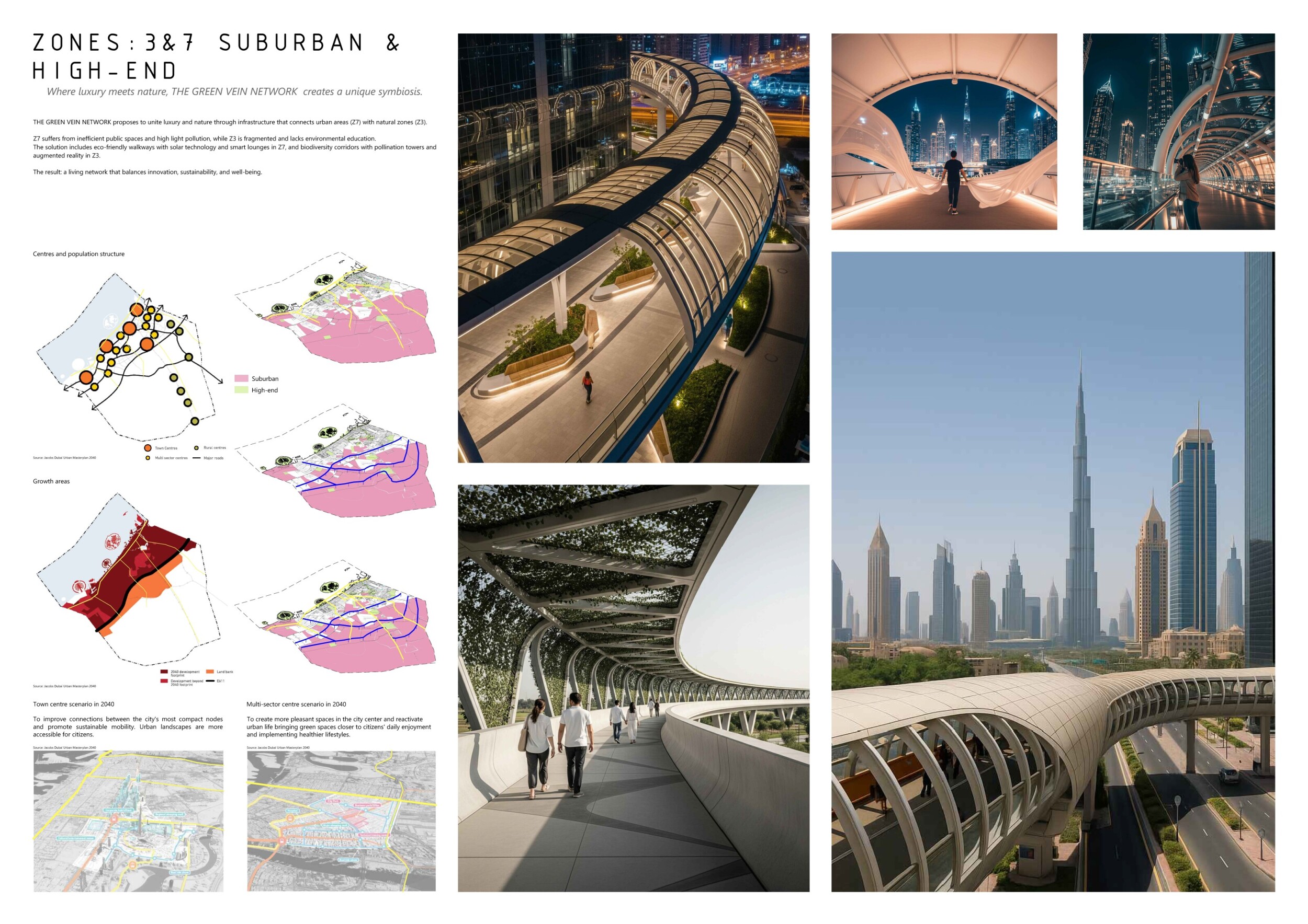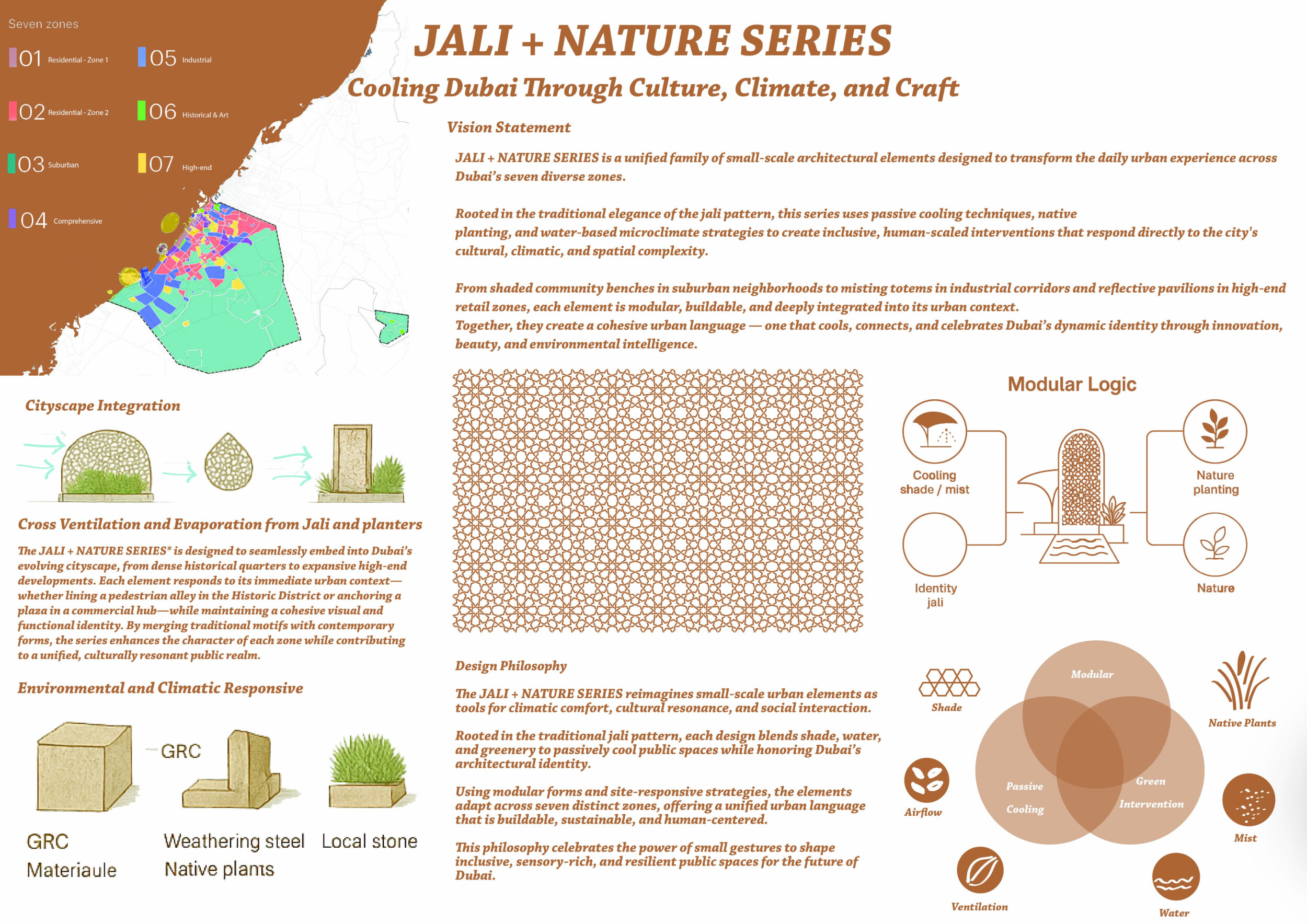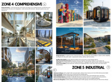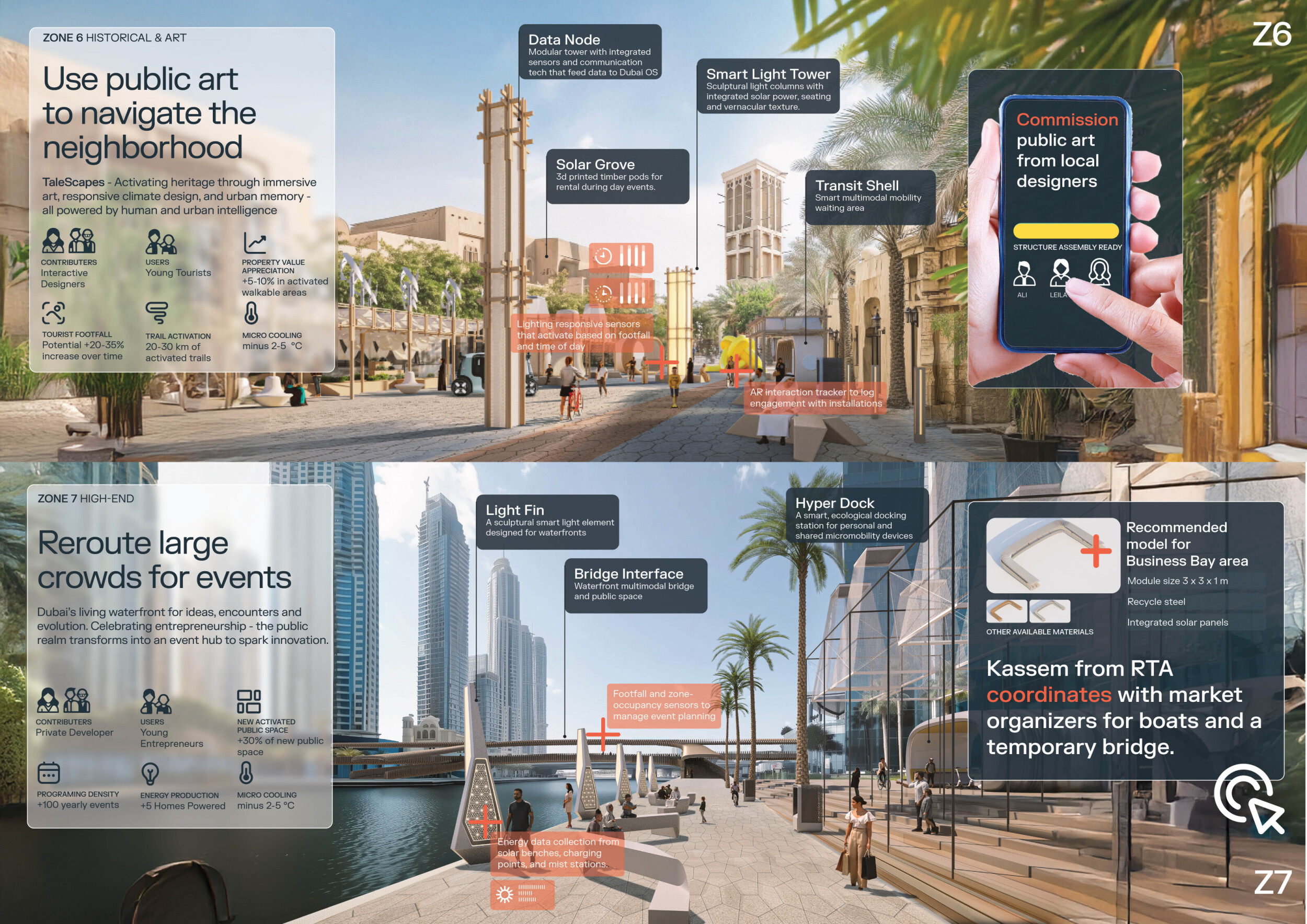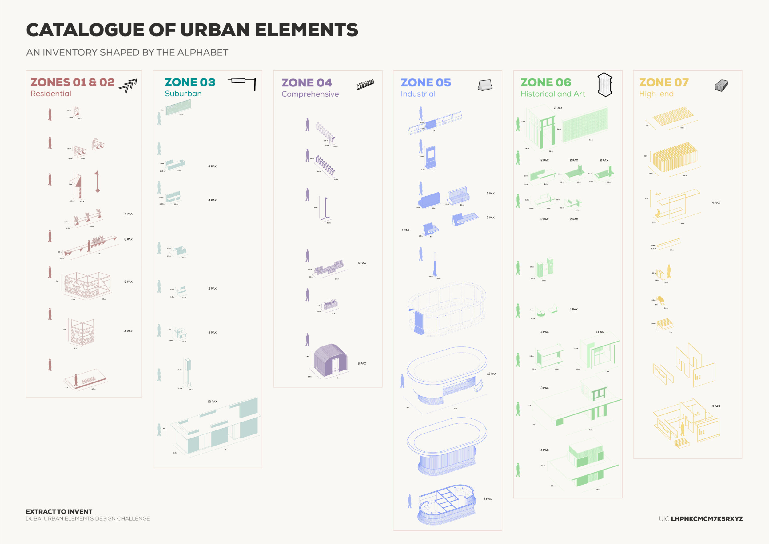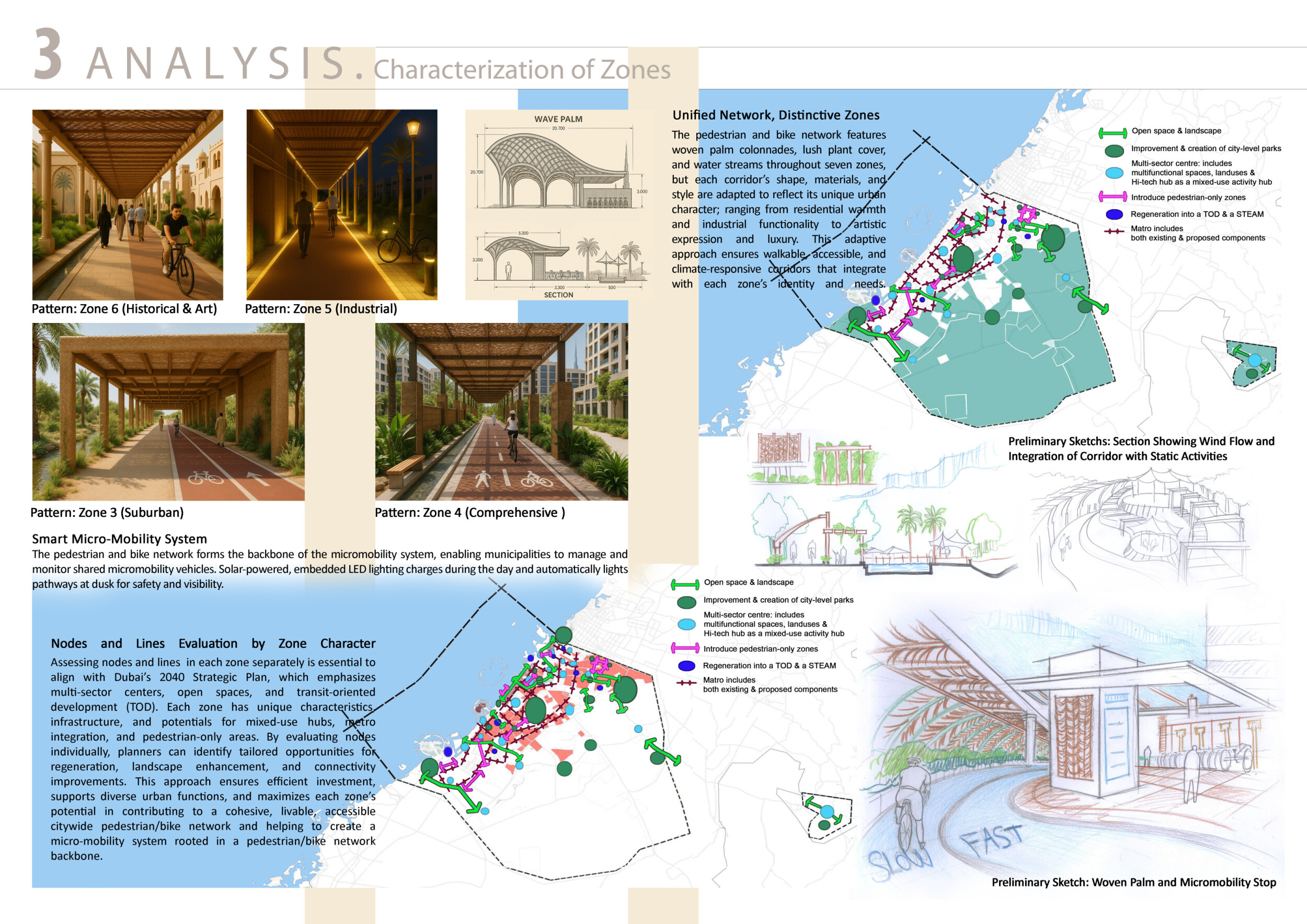 This proposal establishes a cohesive urban design system tailored to Dubai’s diverse zoning contexts, translating each area’s cultural, climatic, and programmatic character into a unified streetscape language. Seven distinct zone typologies—ranging from residential to industrial, heritage, and high-end—are articulated through a matrix of core geometries, modular shading elements, curated material palettes, and contextual wayfinding. Read more Each typology introduces unique visual identifiers: Z1 and Z2 draw on Islamic motifs and neighborhood intimacy, Z3 evokes Bedouin tents and soft landforms, while Z5 and Z7 leverage sharper geometries and premium finishes to express industrial rigor or luxury. The proposal integrates shading, pedestrian bridges, solar infrastructure, and street furniture into cohesive kit-of-parts systems adaptable across road hierarchies and public interfaces. Artistic co-design, climate-responsive strategies, and heritage continuity are embedded throughout, ensuring visual consistency while accommodating Dubai’s rapid growth, diverse urban fabrics, and the need for identity-driven public realm enhancements.