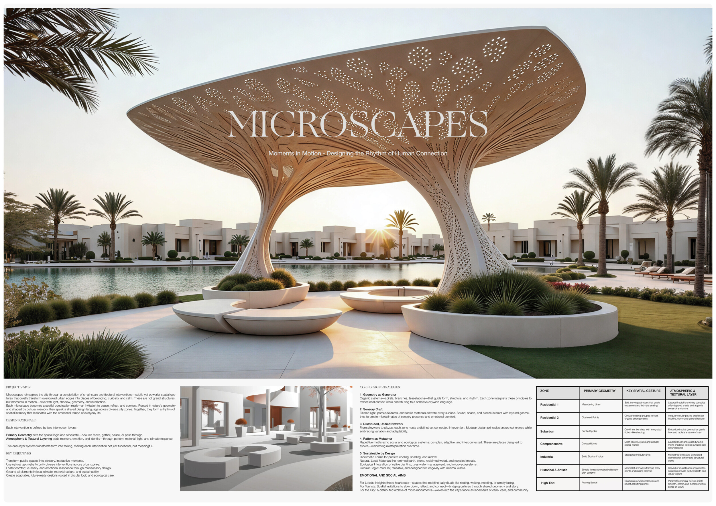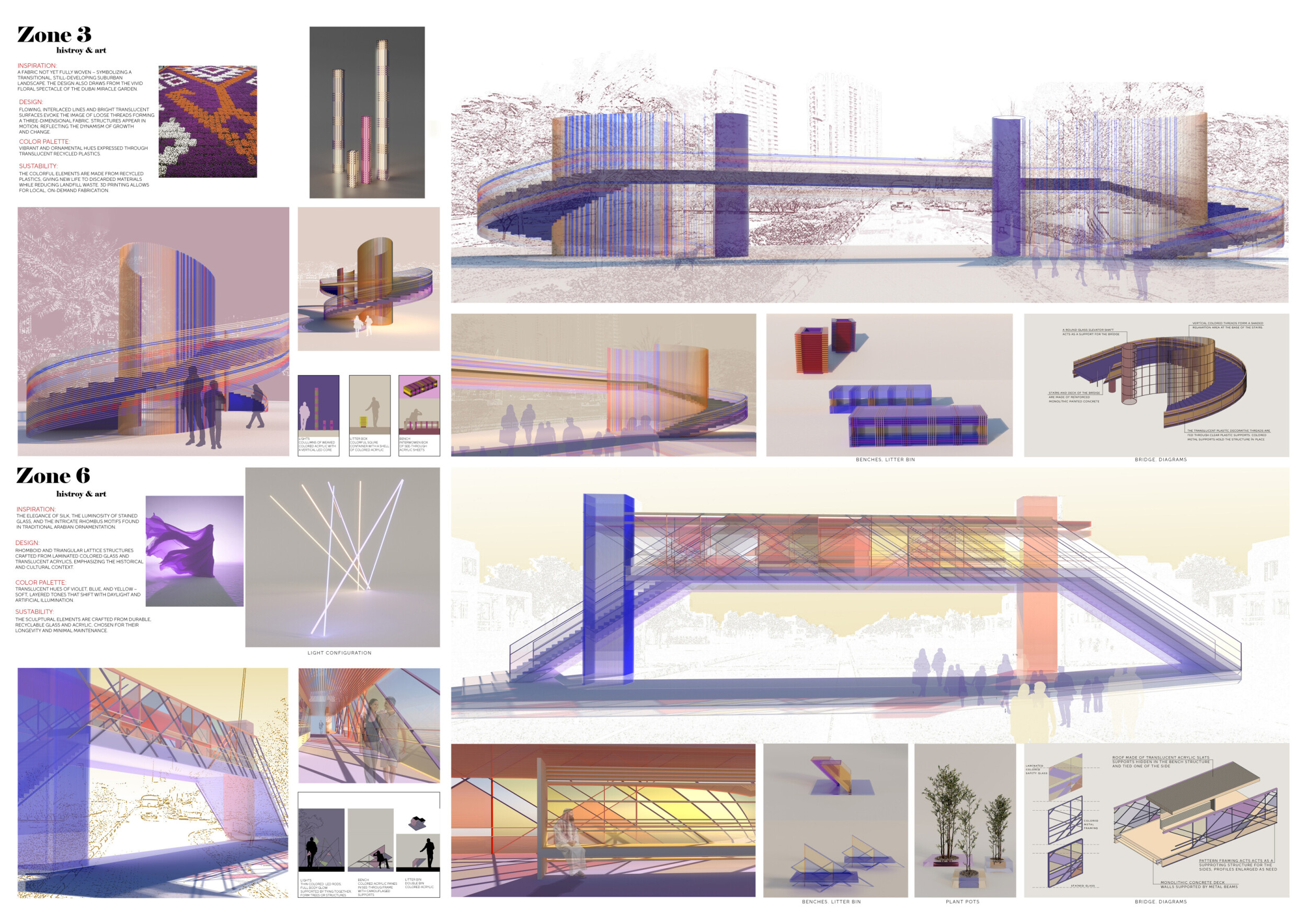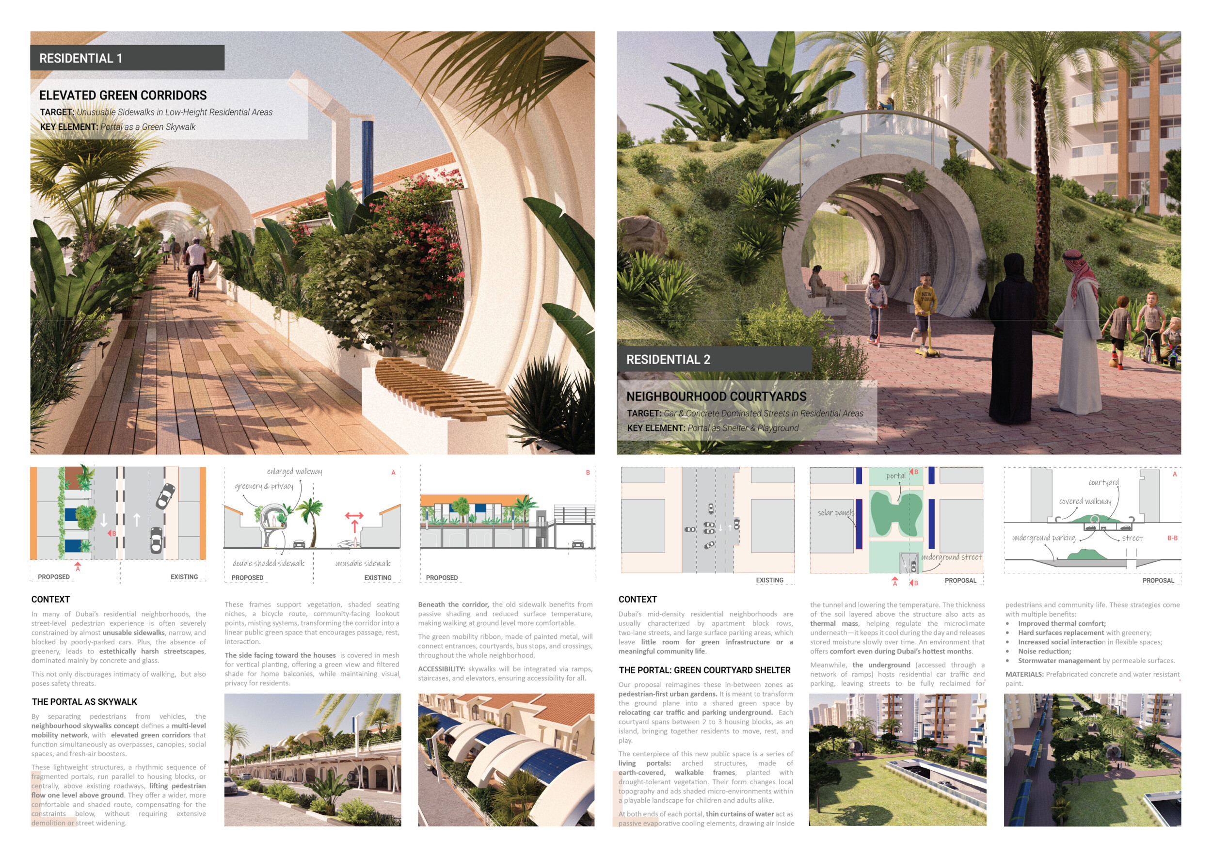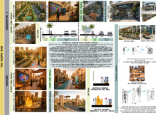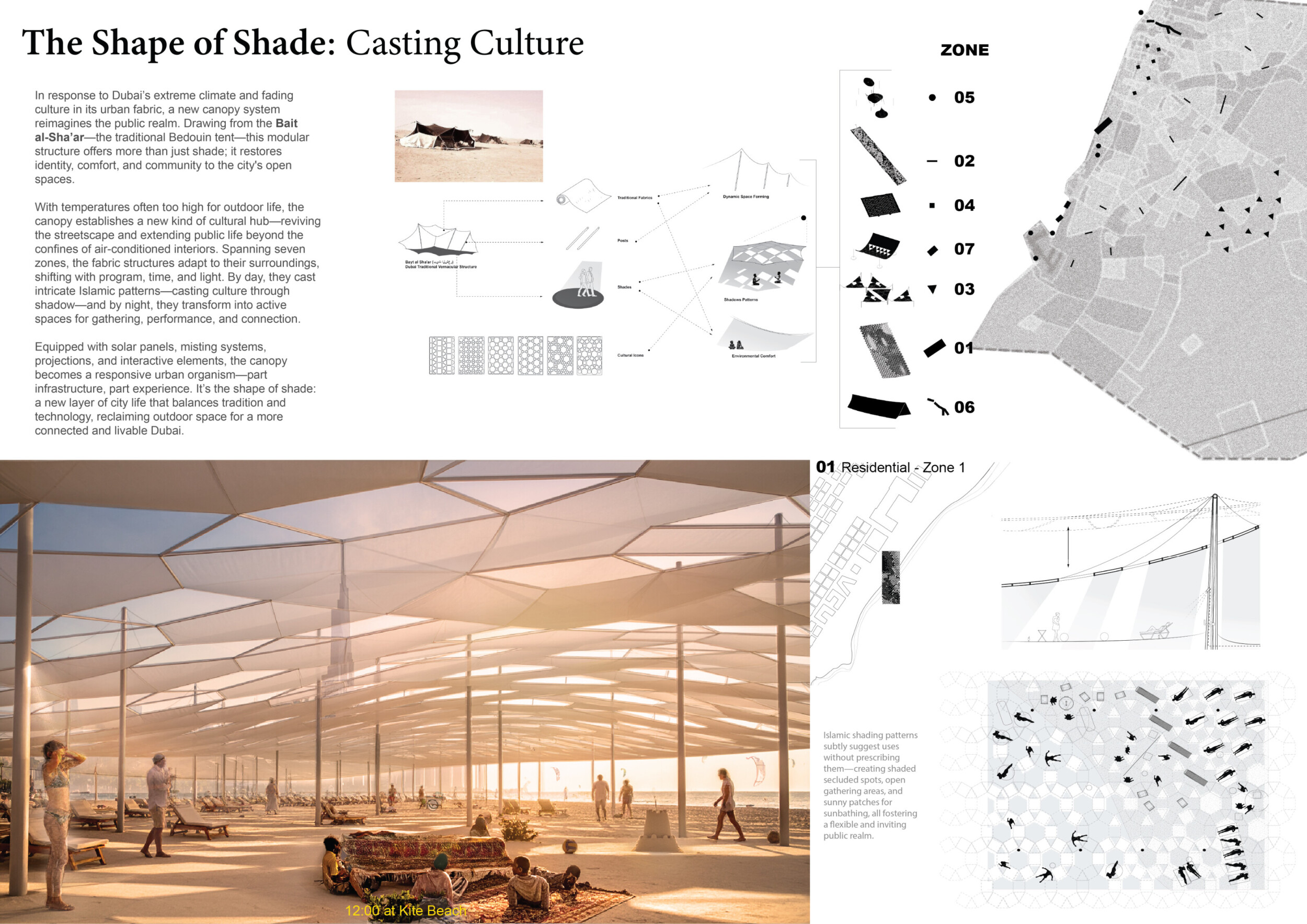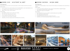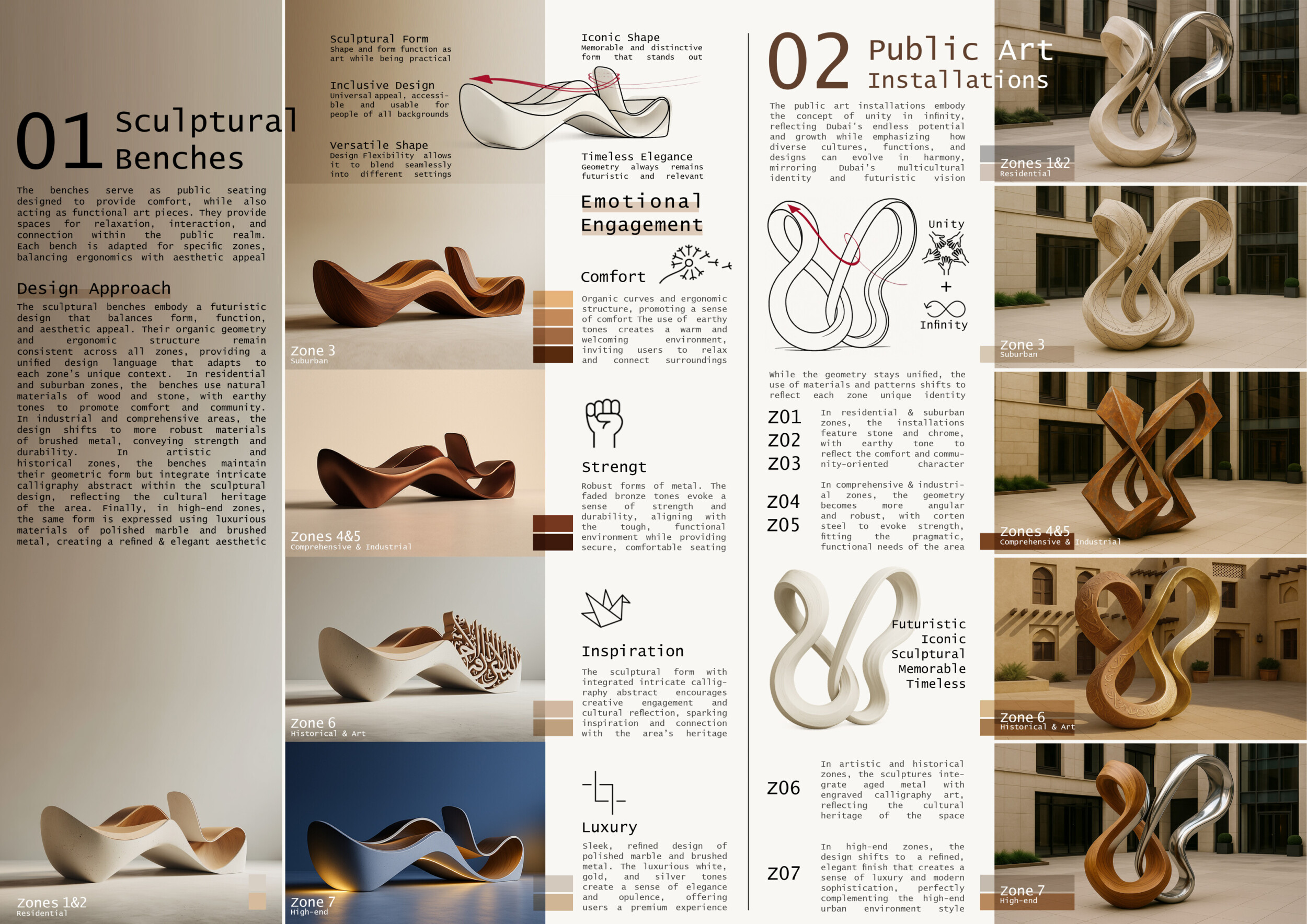 This proposal establishes a cohesive urban design system tailored to Dubai’s diverse zoning contexts, translating each area’s cultural, climatic, and programmatic character into a unified streetscape language. Seven distinct zone typologies—ranging from residential to industrial, heritage, and high-end—are articulated through a matrix of core geometries, modular shading elements, curated material palettes, and contextual wayfinding. Read more Each typology introduces unique visual identifiers: Z1 and Z2 draw on Islamic motifs and neighborhood intimacy, Z3 evokes Bedouin tents and soft landforms, while Z5 and Z7 leverage sharper geometries and premium finishes to express industrial rigor or luxury. The proposal integrates shading, pedestrian bridges, solar infrastructure, and street furniture into cohesive kit-of-parts systems adaptable across road hierarchies and public interfaces. Artistic co-design, climate-responsive strategies, and heritage continuity are embedded throughout, ensuring visual consistency while accommodating Dubai’s rapid growth, diverse urban fabrics, and the need for identity-driven public realm enhancements.