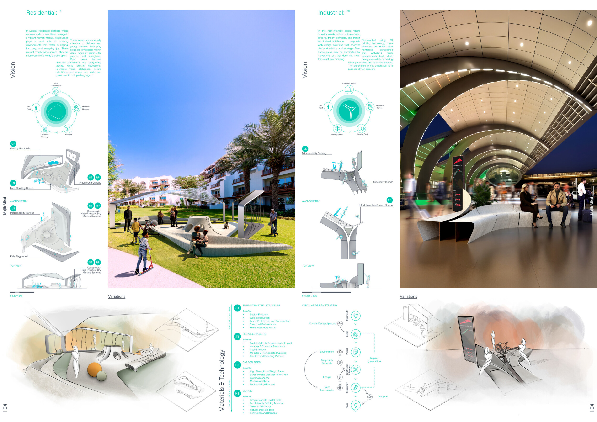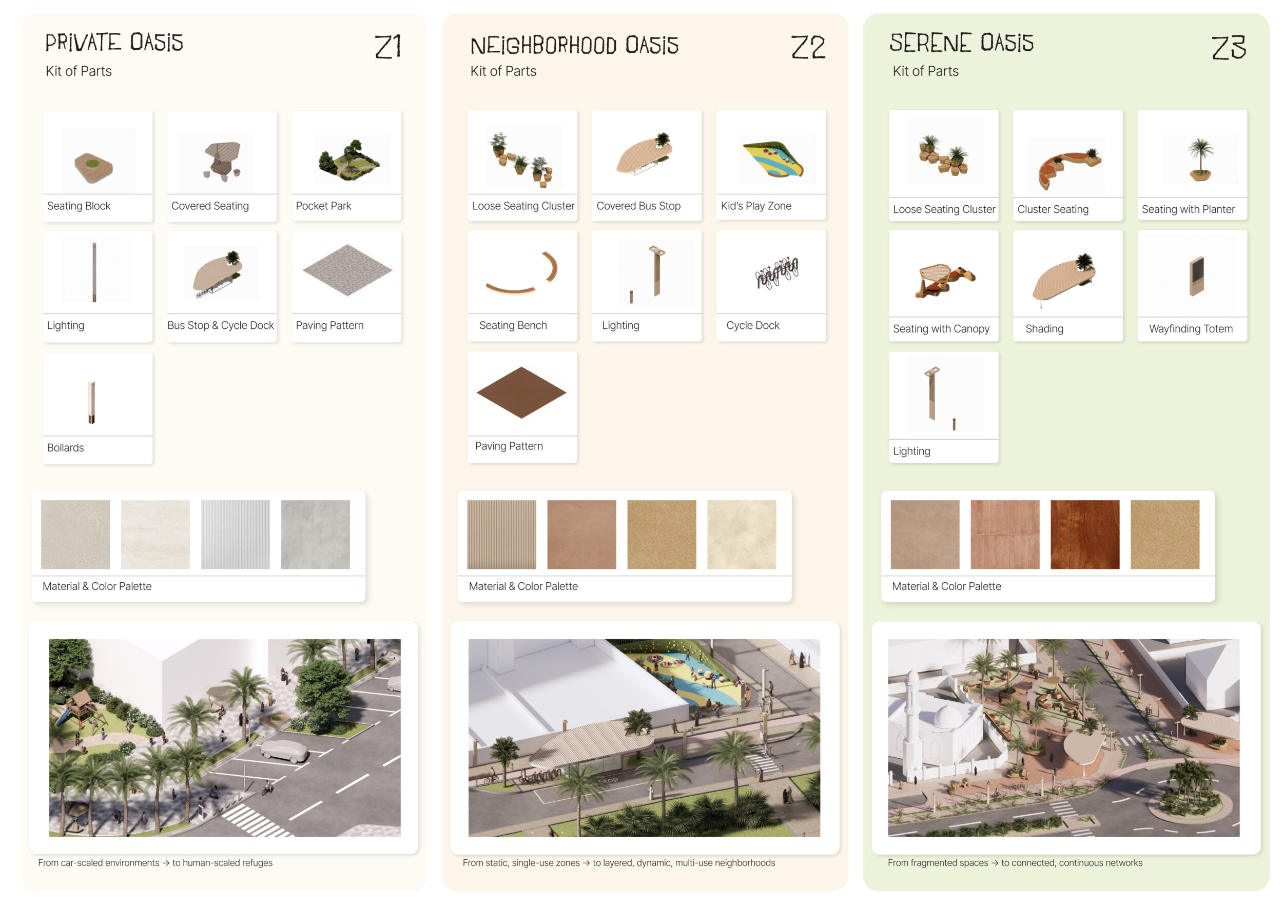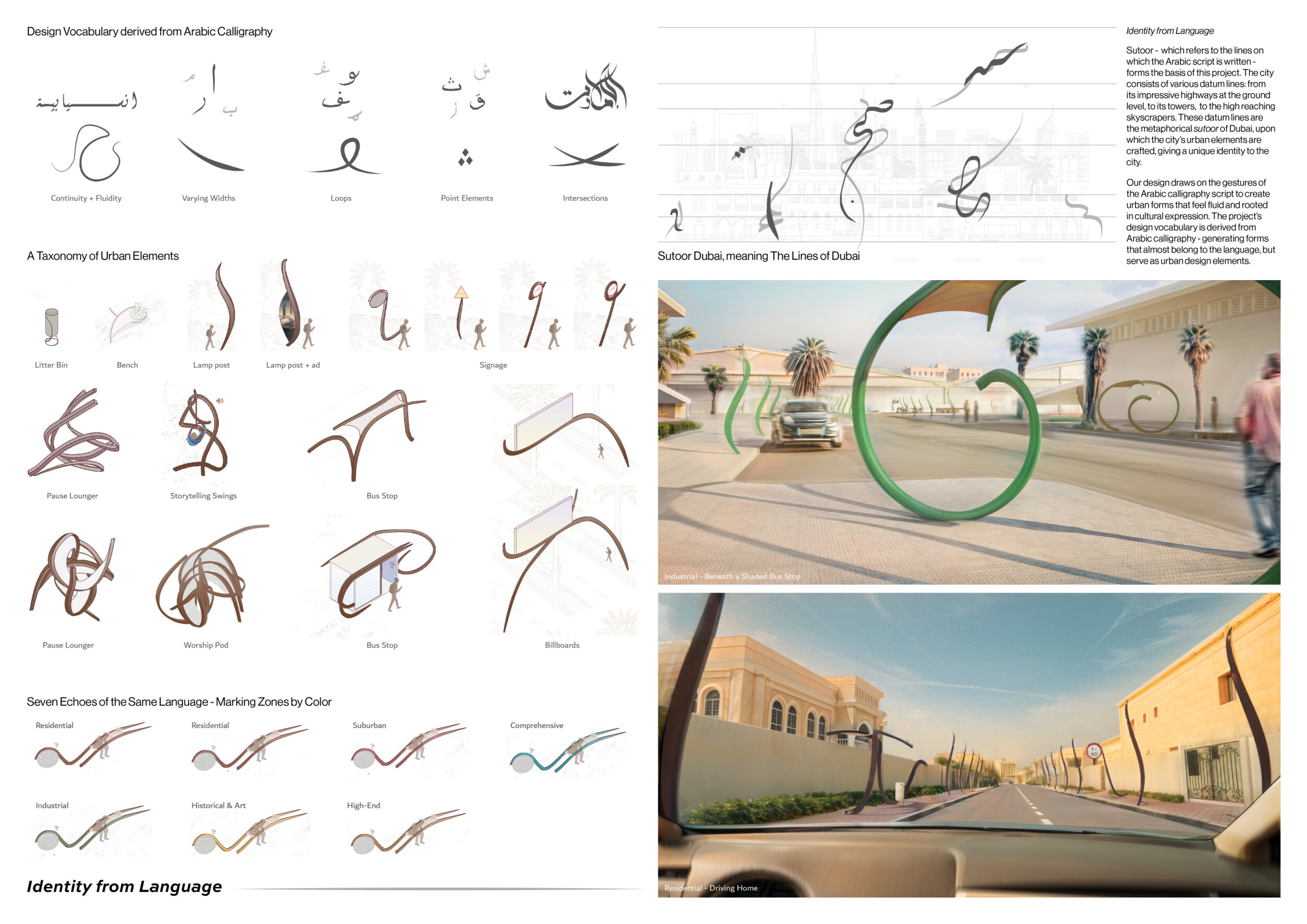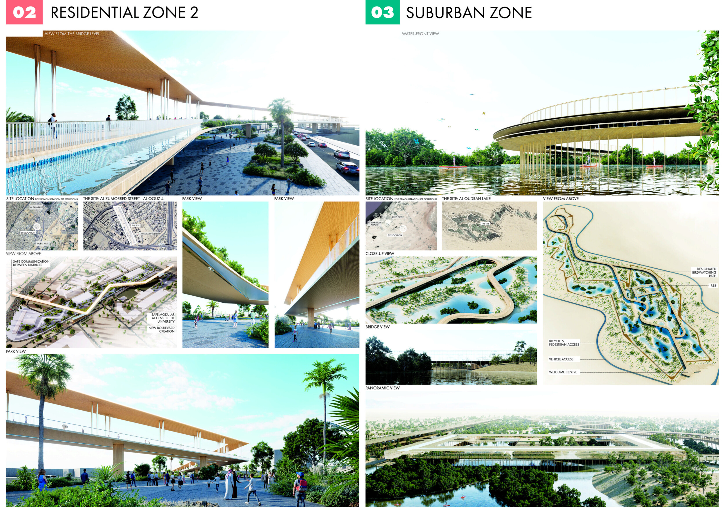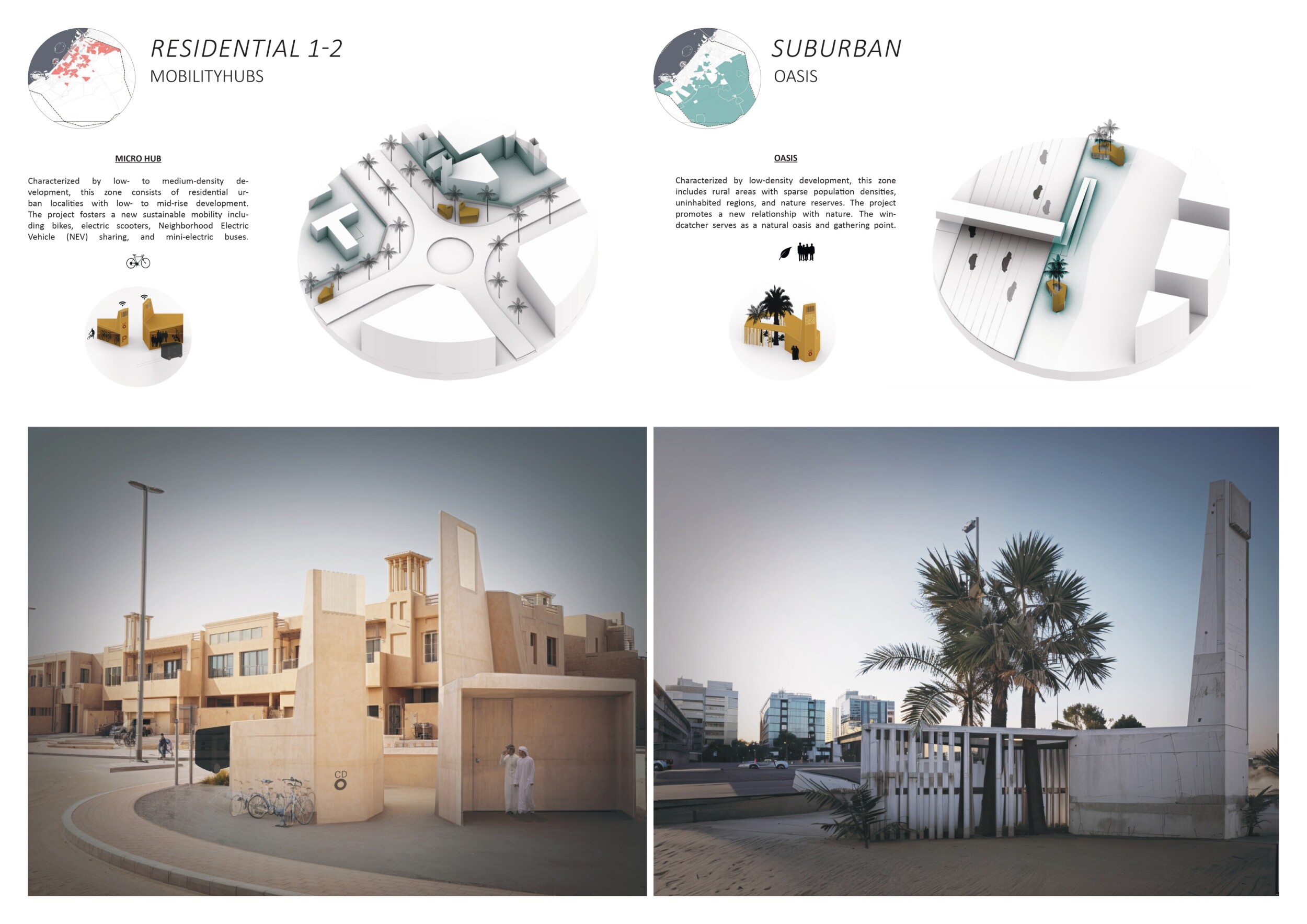 This proposal establishes a cohesive urban design system tailored to Dubai’s diverse zoning contexts, translating each area’s cultural, climatic, and programmatic character into a unified streetscape language. Seven distinct zone typologies—ranging from residential to industrial, heritage, and high-end—are articulated through a matrix of core geometries, modular shading elements, curated material palettes, and contextual wayfinding. Read more Each typology introduces unique visual identifiers: Z1 and Z2 draw on Islamic motifs and neighborhood intimacy, Z3 evokes Bedouin tents and soft landforms, while Z5 and Z7 leverage sharper geometries and premium finishes to express industrial rigor or luxury. The proposal integrates shading, pedestrian bridges, solar infrastructure, and street furniture into cohesive kit-of-parts systems adaptable across road hierarchies and public interfaces. Artistic co-design, climate-responsive strategies, and heritage continuity are embedded throughout, ensuring visual consistency while accommodating Dubai’s rapid growth, diverse urban fabrics, and the need for identity-driven public realm enhancements.