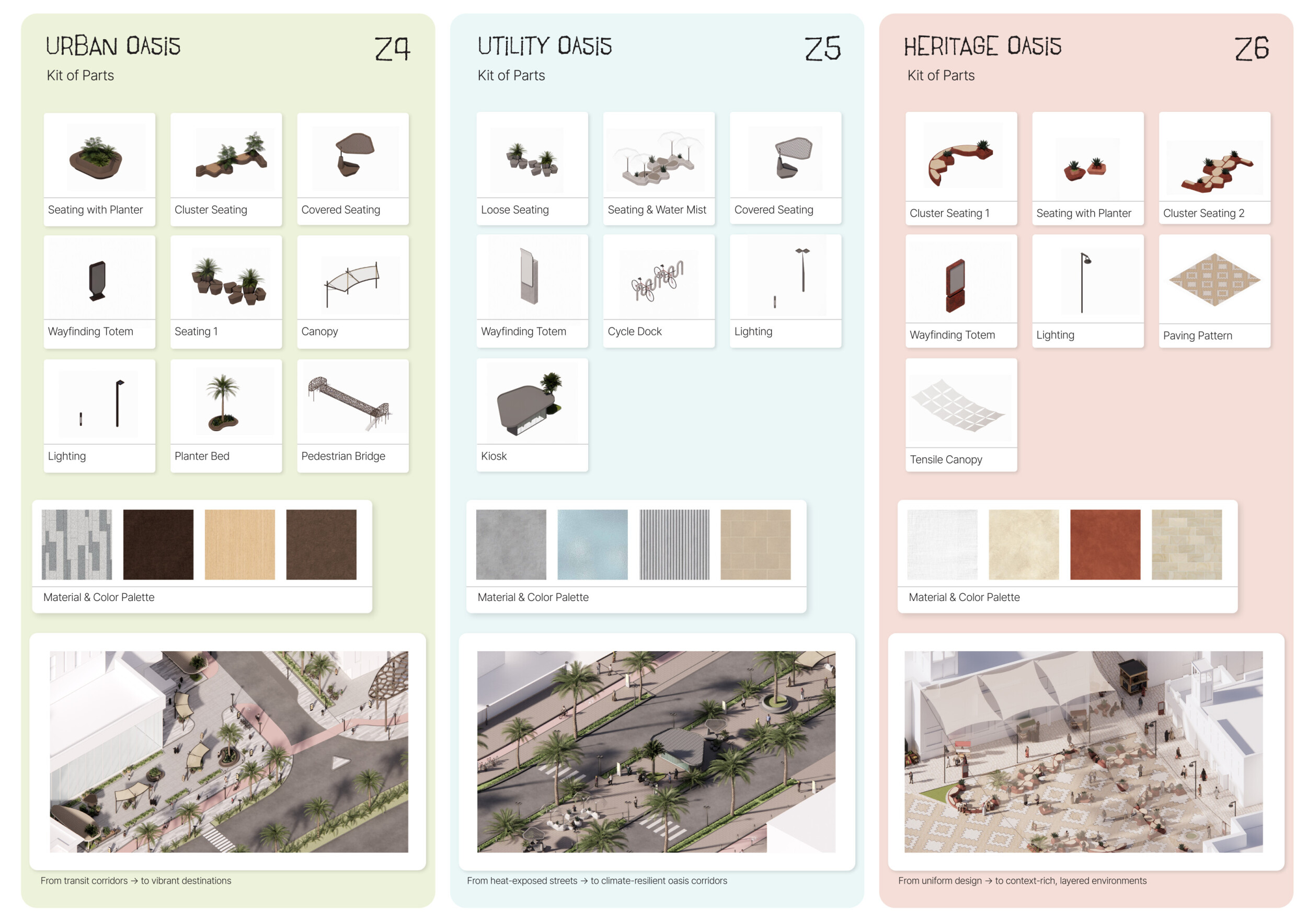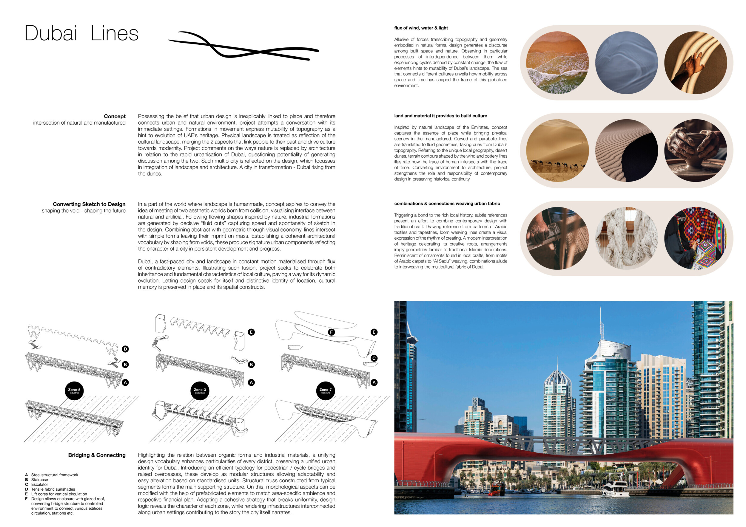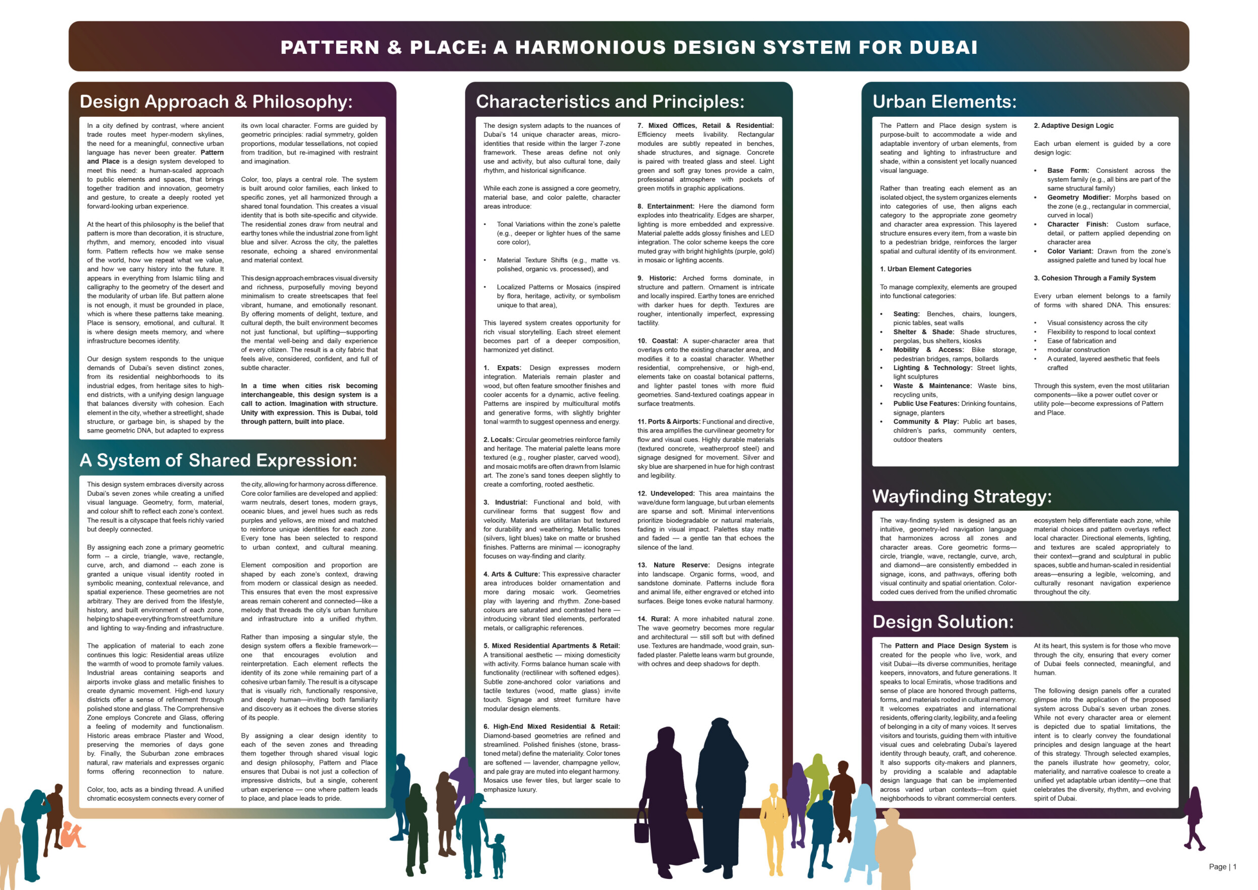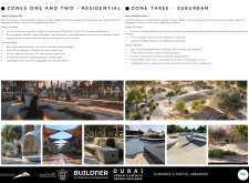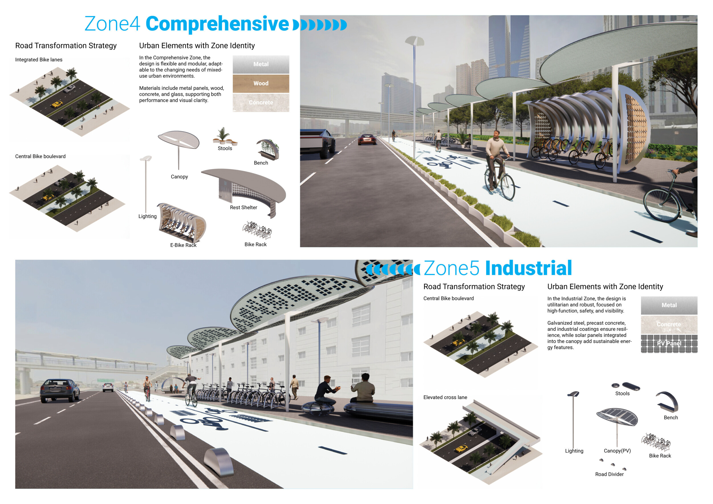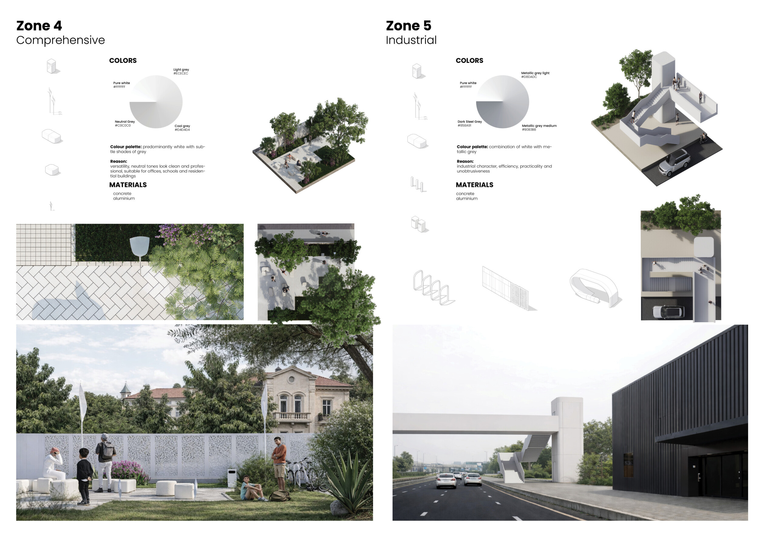 This proposal establishes a cohesive urban design system tailored to Dubai’s diverse zoning contexts, translating each area’s cultural, climatic, and programmatic character into a unified streetscape language. Seven distinct zone typologies—ranging from residential to industrial, heritage, and high-end—are articulated through a matrix of core geometries, modular shading elements, curated material palettes, and contextual wayfinding. Read more Each typology introduces unique visual identifiers: Z1 and Z2 draw on Islamic motifs and neighborhood intimacy, Z3 evokes Bedouin tents and soft landforms, while Z5 and Z7 leverage sharper geometries and premium finishes to express industrial rigor or luxury. The proposal integrates shading, pedestrian bridges, solar infrastructure, and street furniture into cohesive kit-of-parts systems adaptable across road hierarchies and public interfaces. Artistic co-design, climate-responsive strategies, and heritage continuity are embedded throughout, ensuring visual consistency while accommodating Dubai’s rapid growth, diverse urban fabrics, and the need for identity-driven public realm enhancements.