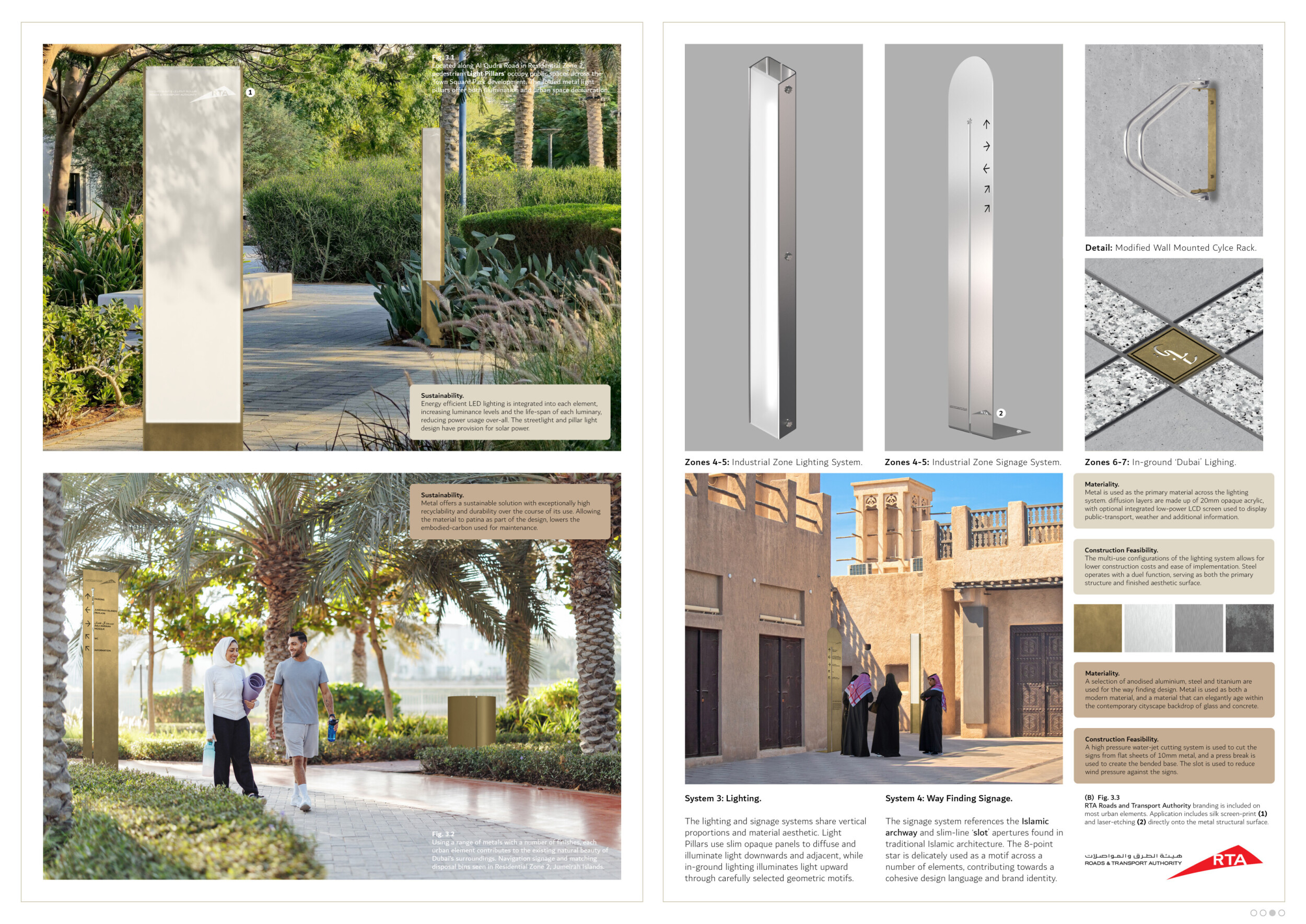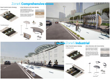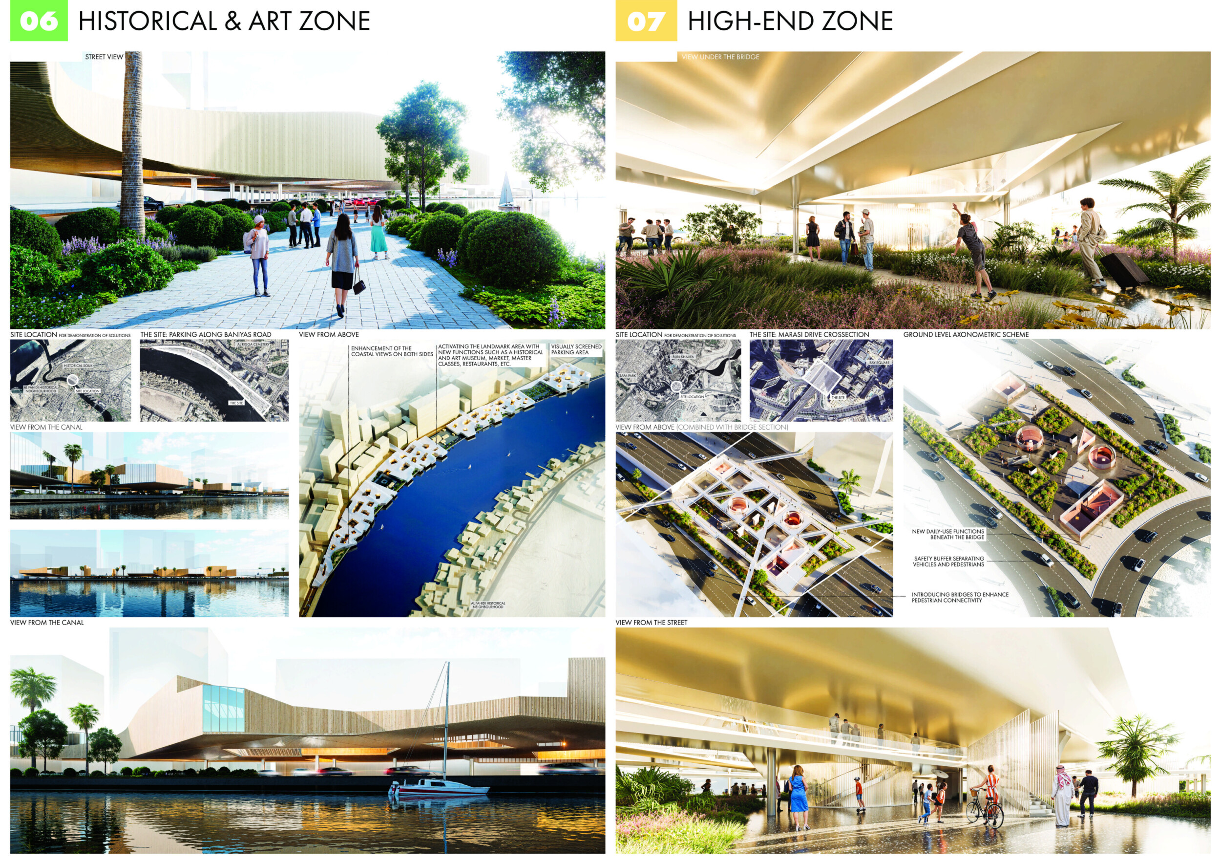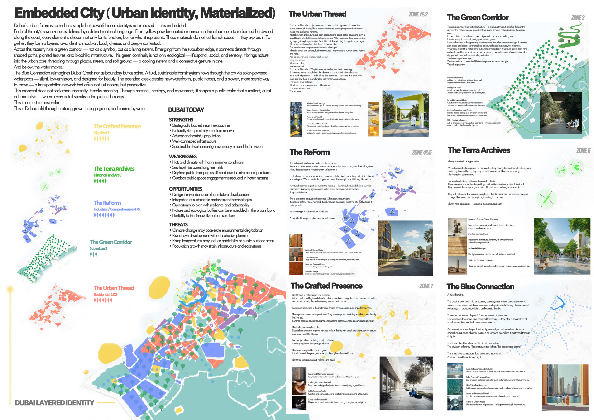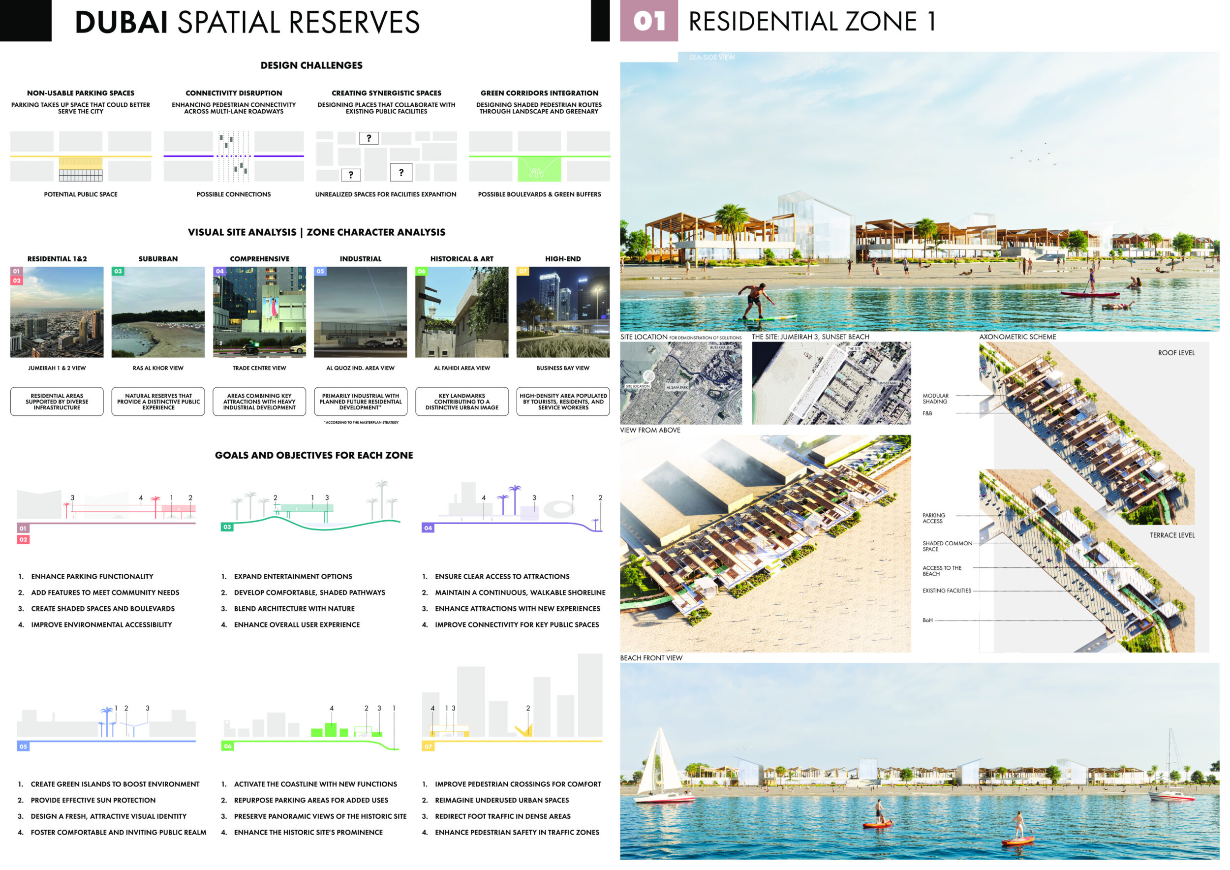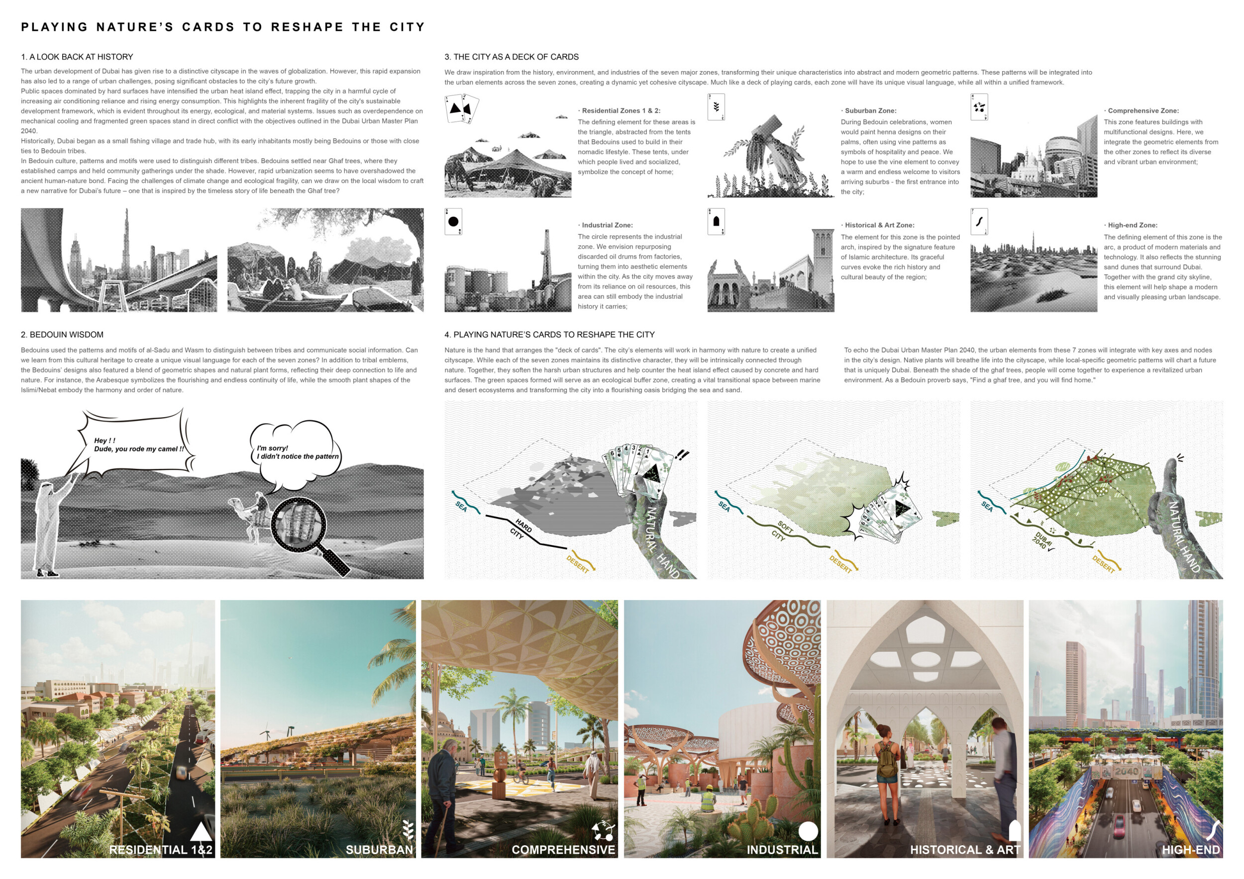 This proposal establishes a cohesive urban design system tailored to Dubai’s diverse zoning contexts, translating each area’s cultural, climatic, and programmatic character into a unified streetscape language. Seven distinct zone typologies—ranging from residential to industrial, heritage, and high-end—are articulated through a matrix of core geometries, modular shading elements, curated material palettes, and contextual wayfinding. Read more Each typology introduces unique visual identifiers: Z1 and Z2 draw on Islamic motifs and neighborhood intimacy, Z3 evokes Bedouin tents and soft landforms, while Z5 and Z7 leverage sharper geometries and premium finishes to express industrial rigor or luxury. The proposal integrates shading, pedestrian bridges, solar infrastructure, and street furniture into cohesive kit-of-parts systems adaptable across road hierarchies and public interfaces. Artistic co-design, climate-responsive strategies, and heritage continuity are embedded throughout, ensuring visual consistency while accommodating Dubai’s rapid growth, diverse urban fabrics, and the need for identity-driven public realm enhancements.