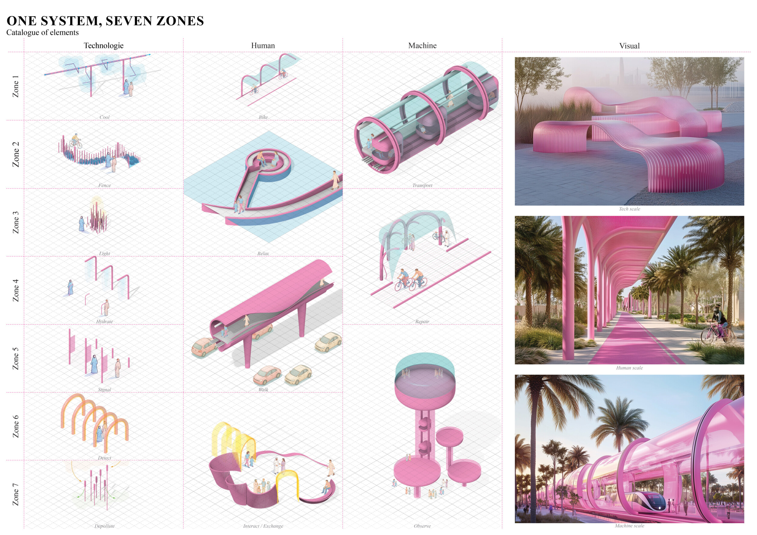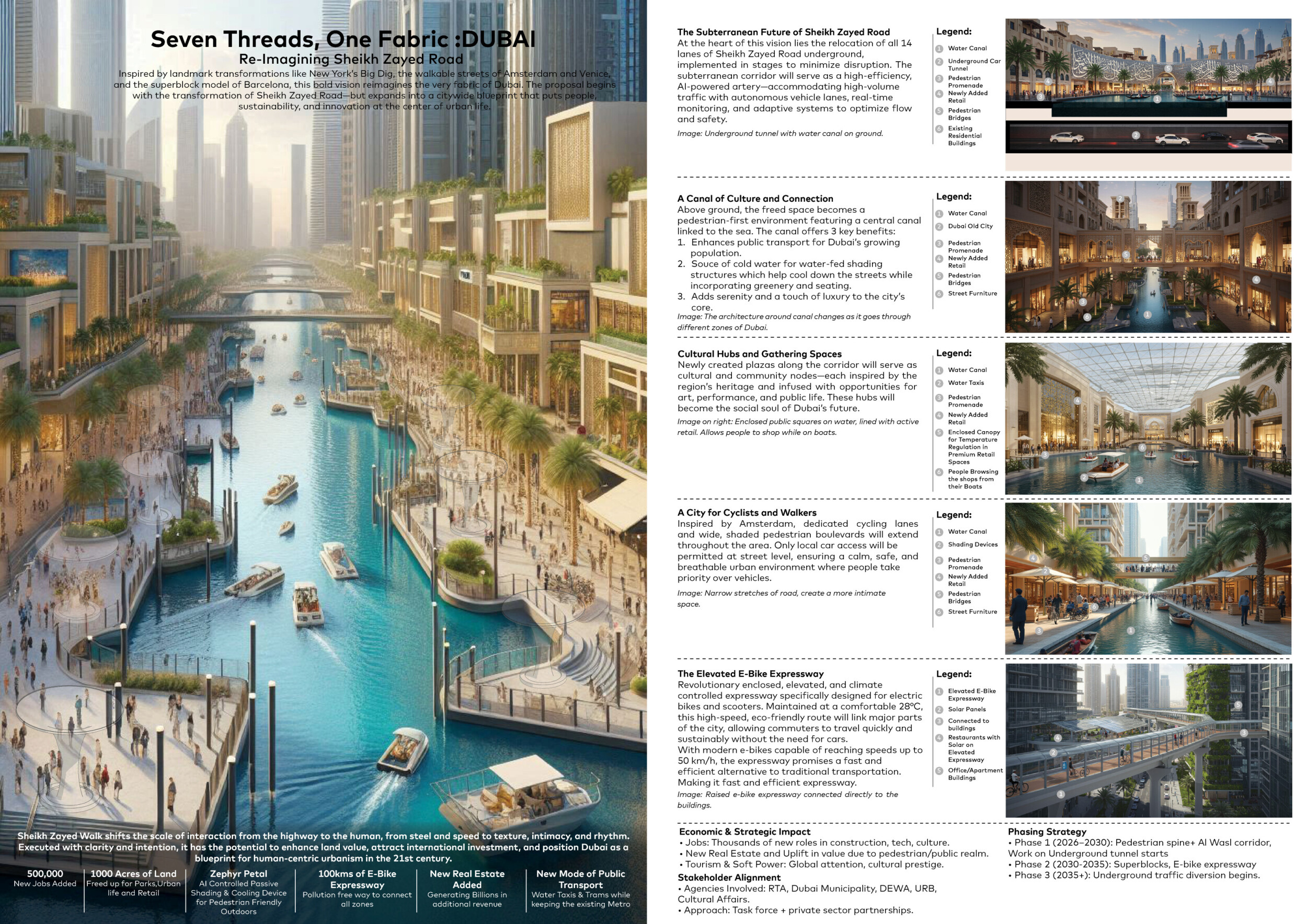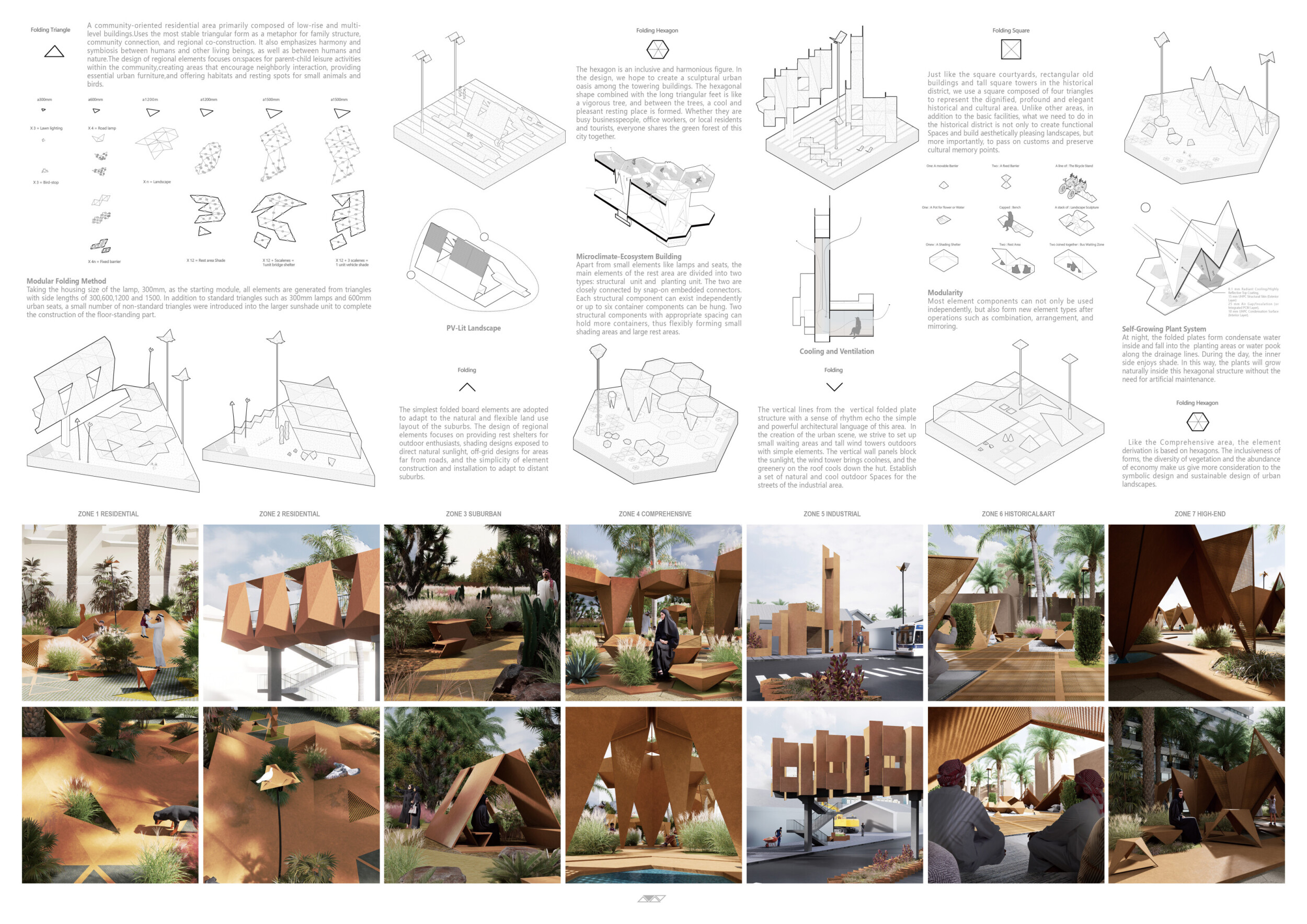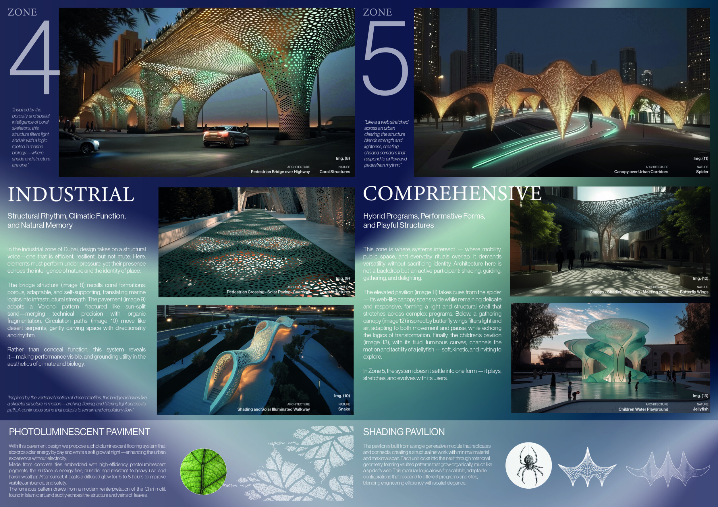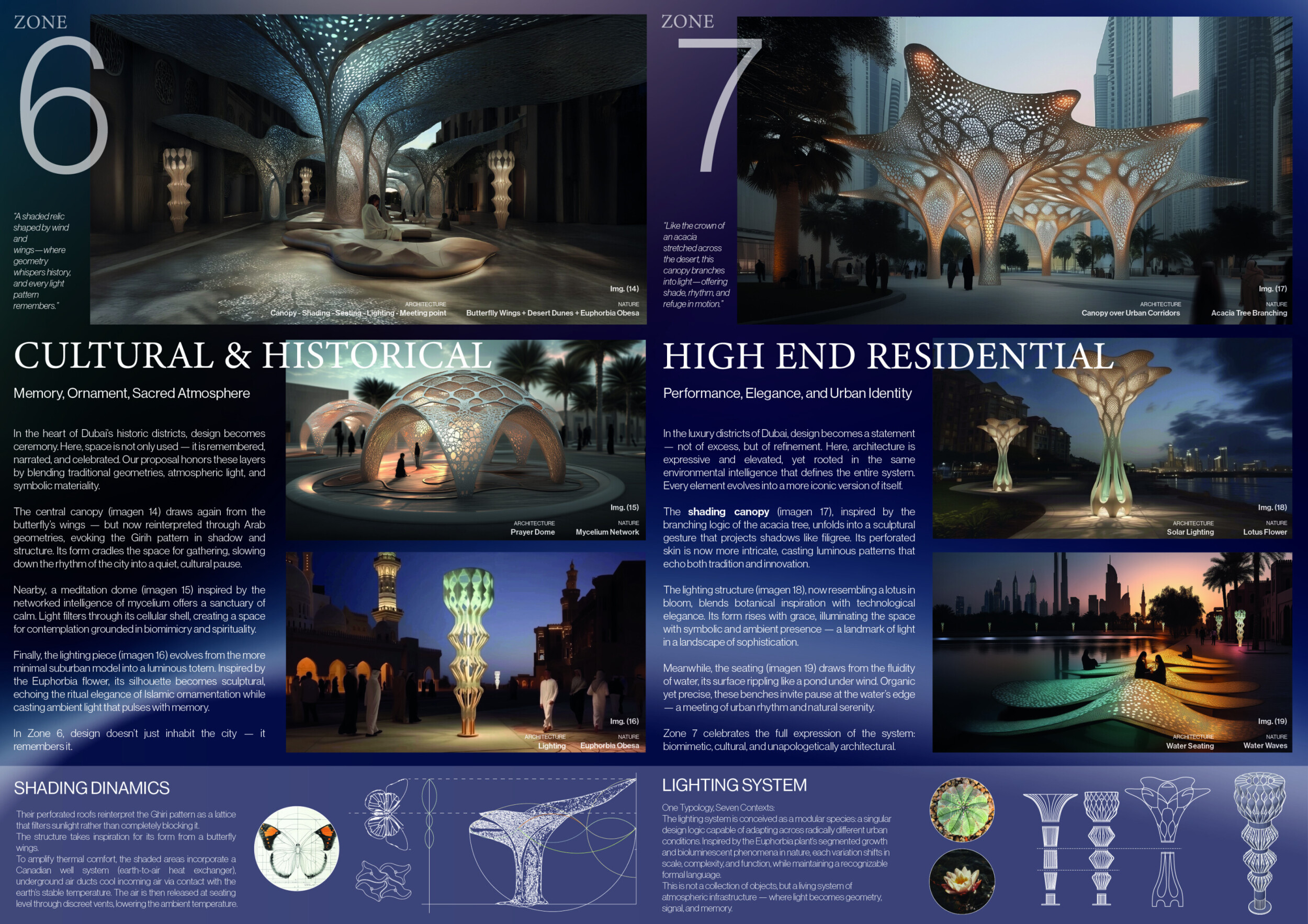 This proposal establishes a cohesive urban design system tailored to Dubai’s diverse zoning contexts, translating each area’s cultural, climatic, and programmatic character into a unified streetscape language. Seven distinct zone typologies—ranging from residential to industrial, heritage, and high-end—are articulated through a matrix of core geometries, modular shading elements, curated material palettes, and contextual wayfinding. Read more Each typology introduces unique visual identifiers: Z1 and Z2 draw on Islamic motifs and neighborhood intimacy, Z3 evokes Bedouin tents and soft landforms, while Z5 and Z7 leverage sharper geometries and premium finishes to express industrial rigor or luxury. The proposal integrates shading, pedestrian bridges, solar infrastructure, and street furniture into cohesive kit-of-parts systems adaptable across road hierarchies and public interfaces. Artistic co-design, climate-responsive strategies, and heritage continuity are embedded throughout, ensuring visual consistency while accommodating Dubai’s rapid growth, diverse urban fabrics, and the need for identity-driven public realm enhancements.