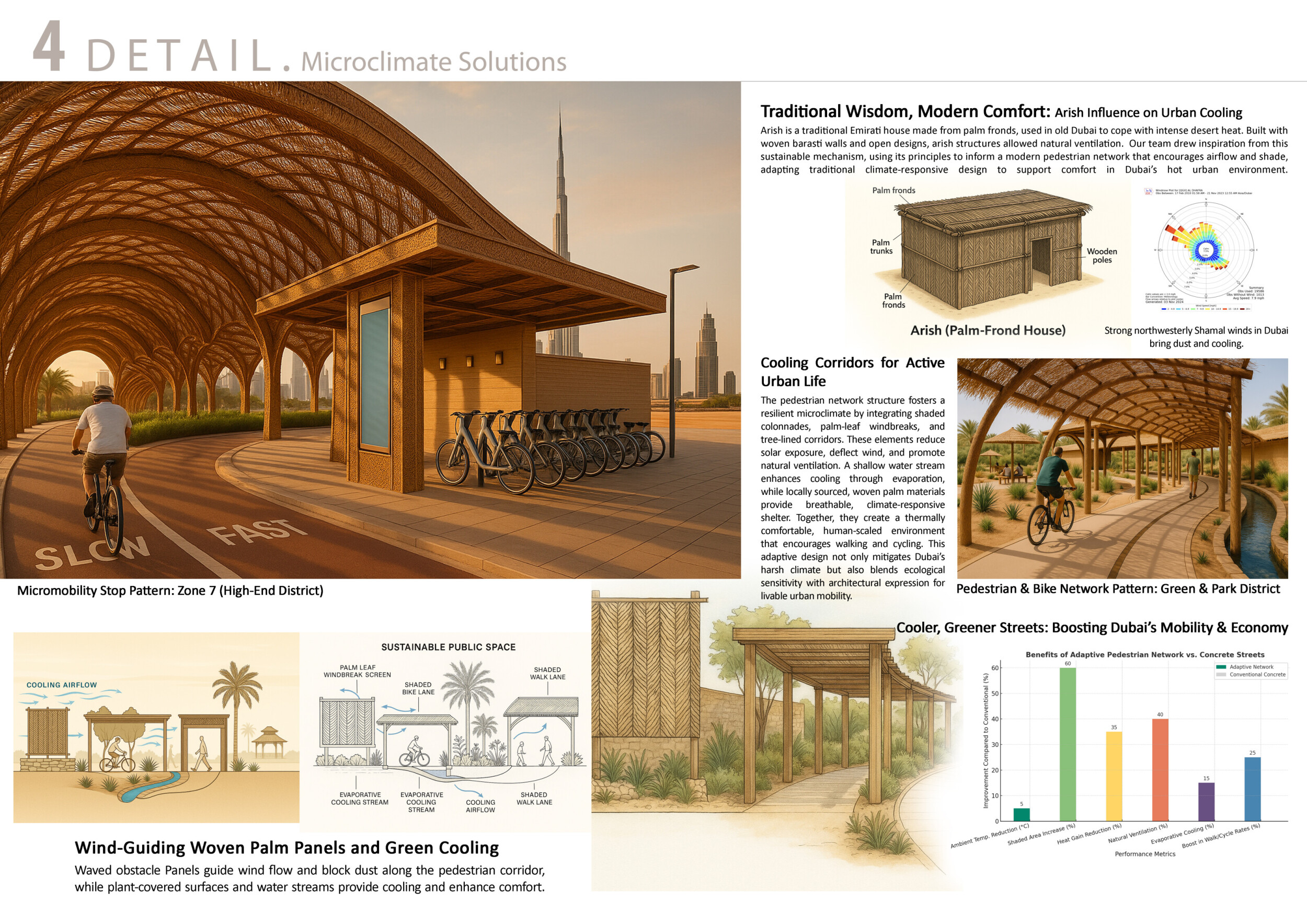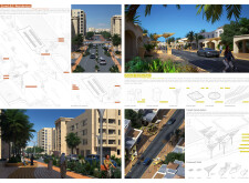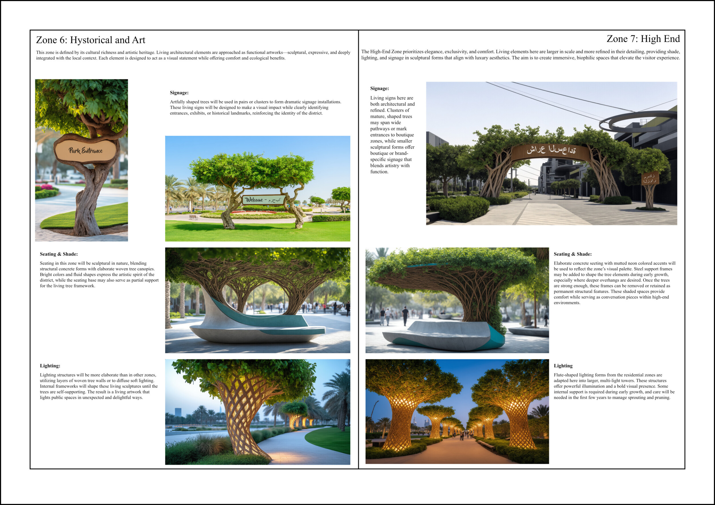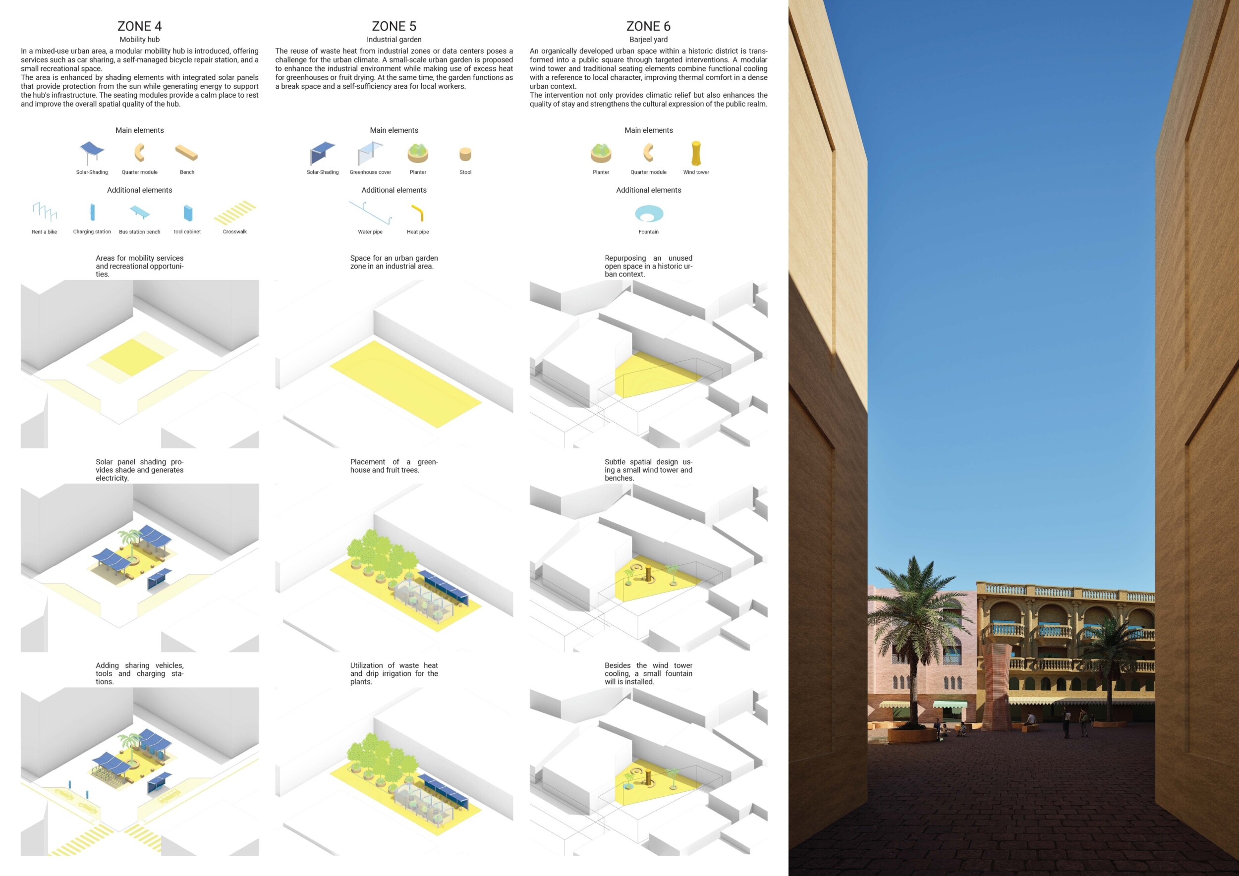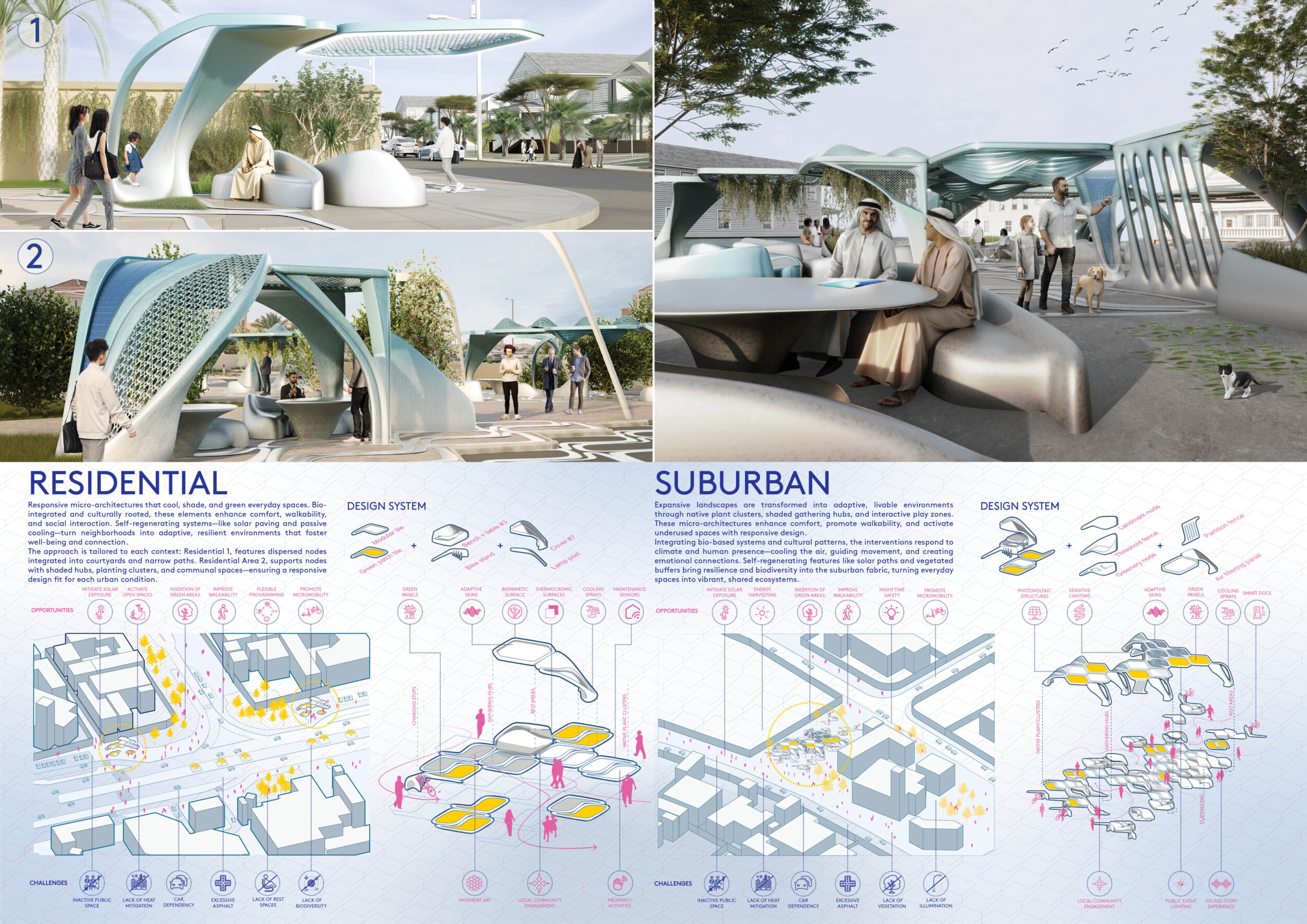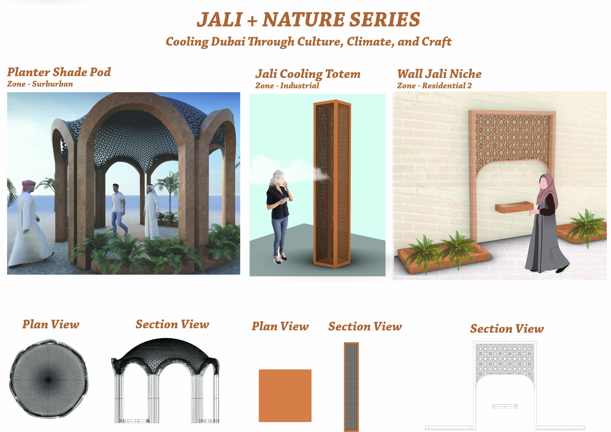 This proposal establishes a cohesive urban design system tailored to Dubai’s diverse zoning contexts, translating each area’s cultural, climatic, and programmatic character into a unified streetscape language. Seven distinct zone typologies—ranging from residential to industrial, heritage, and high-end—are articulated through a matrix of core geometries, modular shading elements, curated material palettes, and contextual wayfinding. Read more Each typology introduces unique visual identifiers: Z1 and Z2 draw on Islamic motifs and neighborhood intimacy, Z3 evokes Bedouin tents and soft landforms, while Z5 and Z7 leverage sharper geometries and premium finishes to express industrial rigor or luxury. The proposal integrates shading, pedestrian bridges, solar infrastructure, and street furniture into cohesive kit-of-parts systems adaptable across road hierarchies and public interfaces. Artistic co-design, climate-responsive strategies, and heritage continuity are embedded throughout, ensuring visual consistency while accommodating Dubai’s rapid growth, diverse urban fabrics, and the need for identity-driven public realm enhancements.