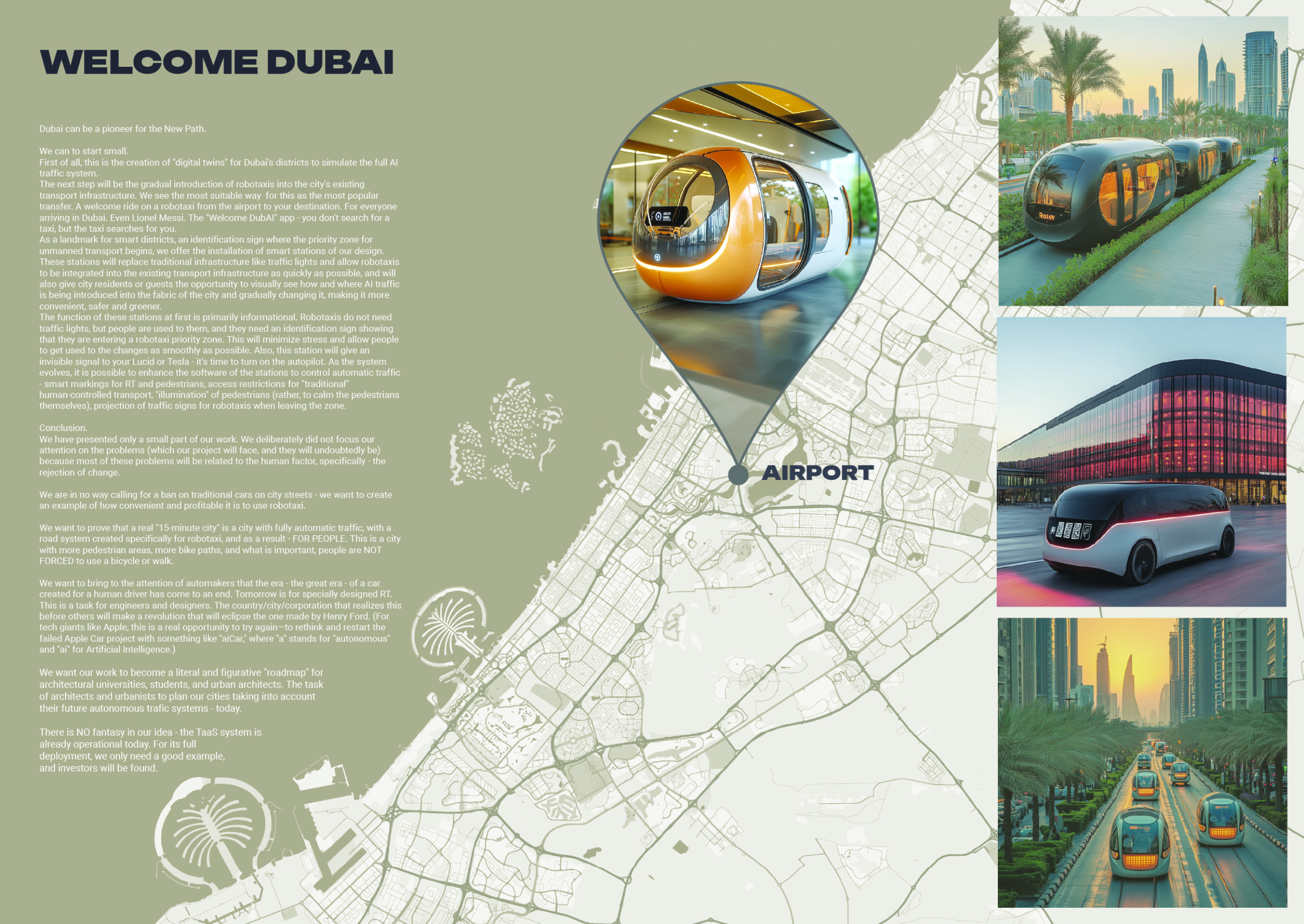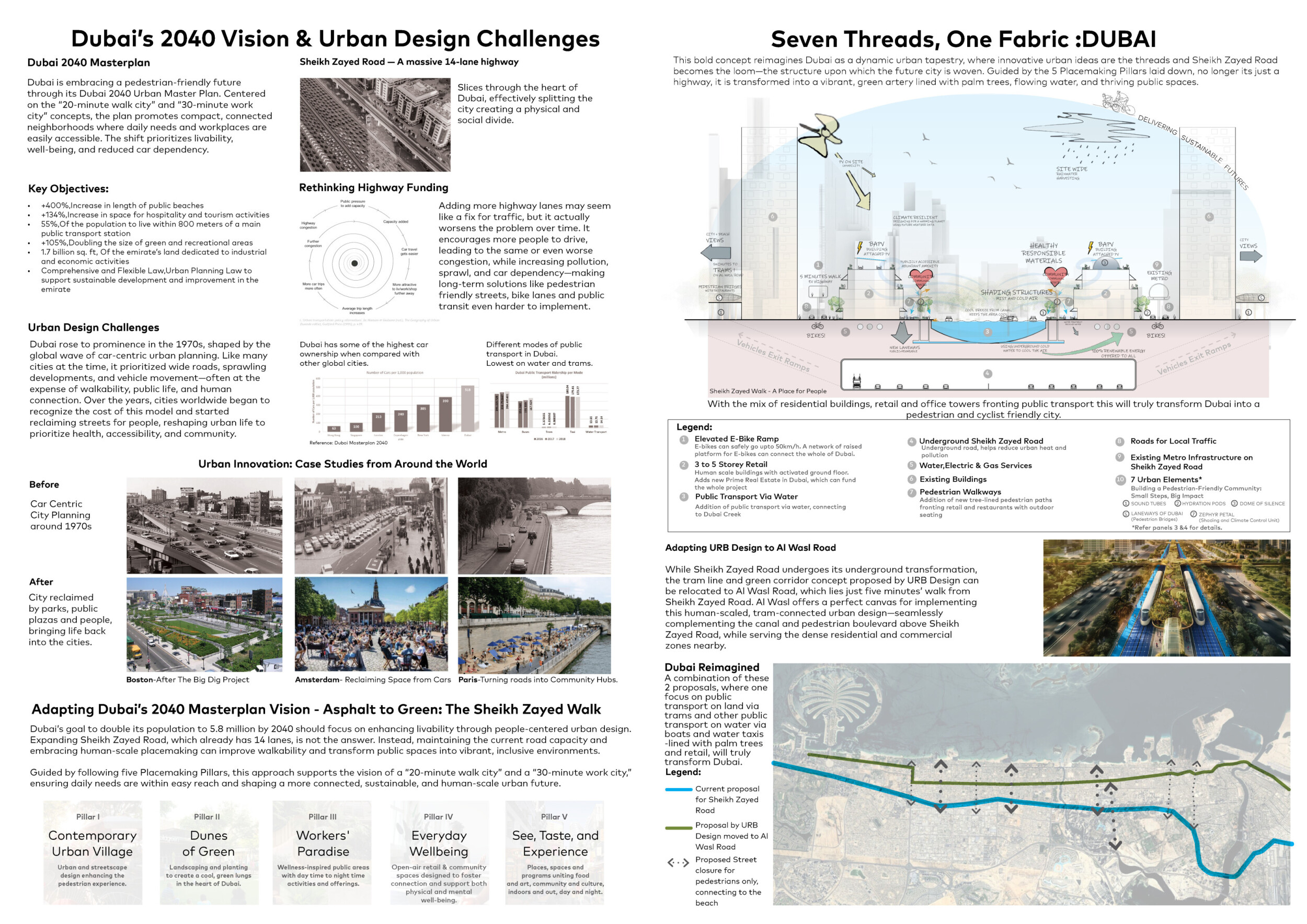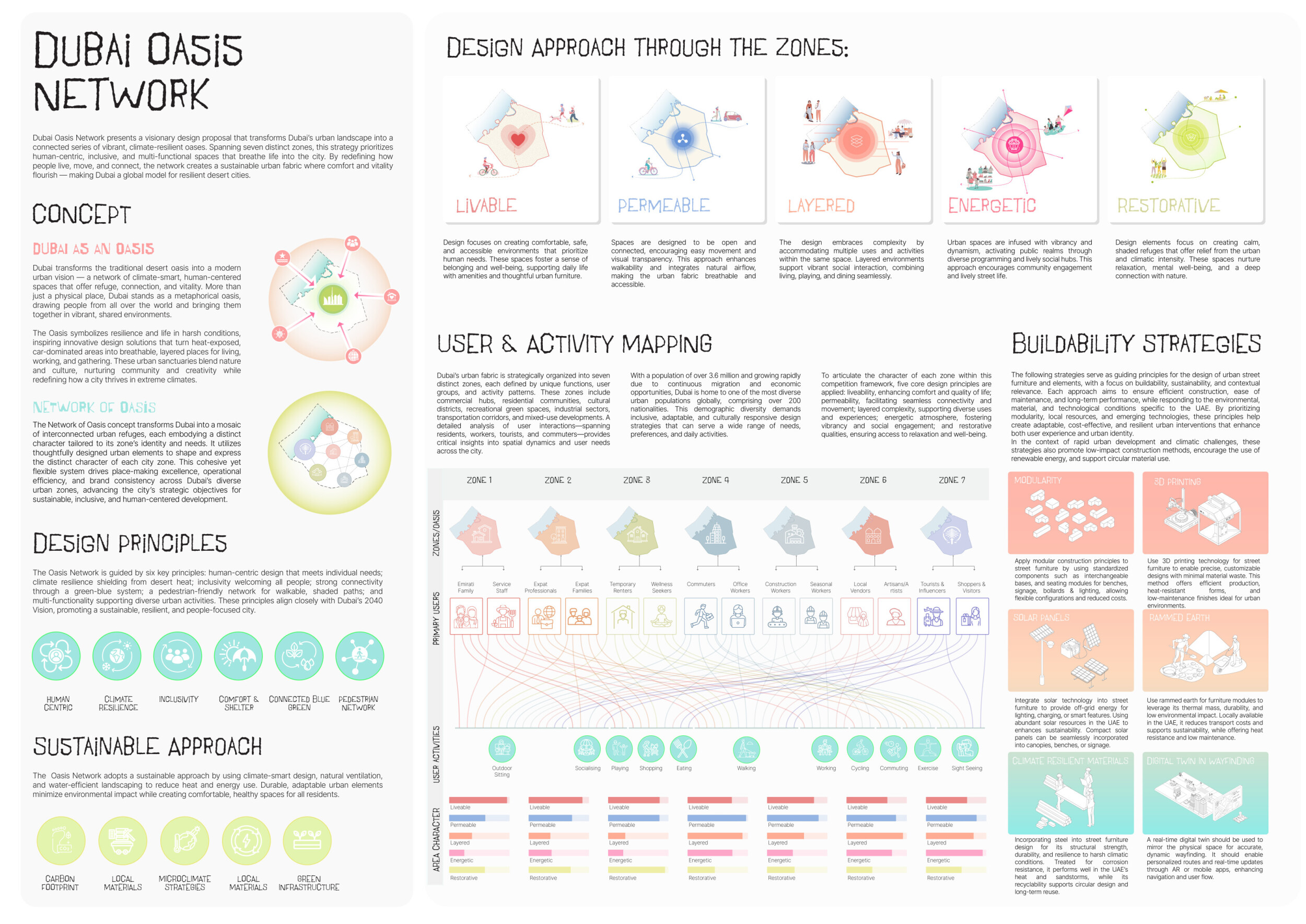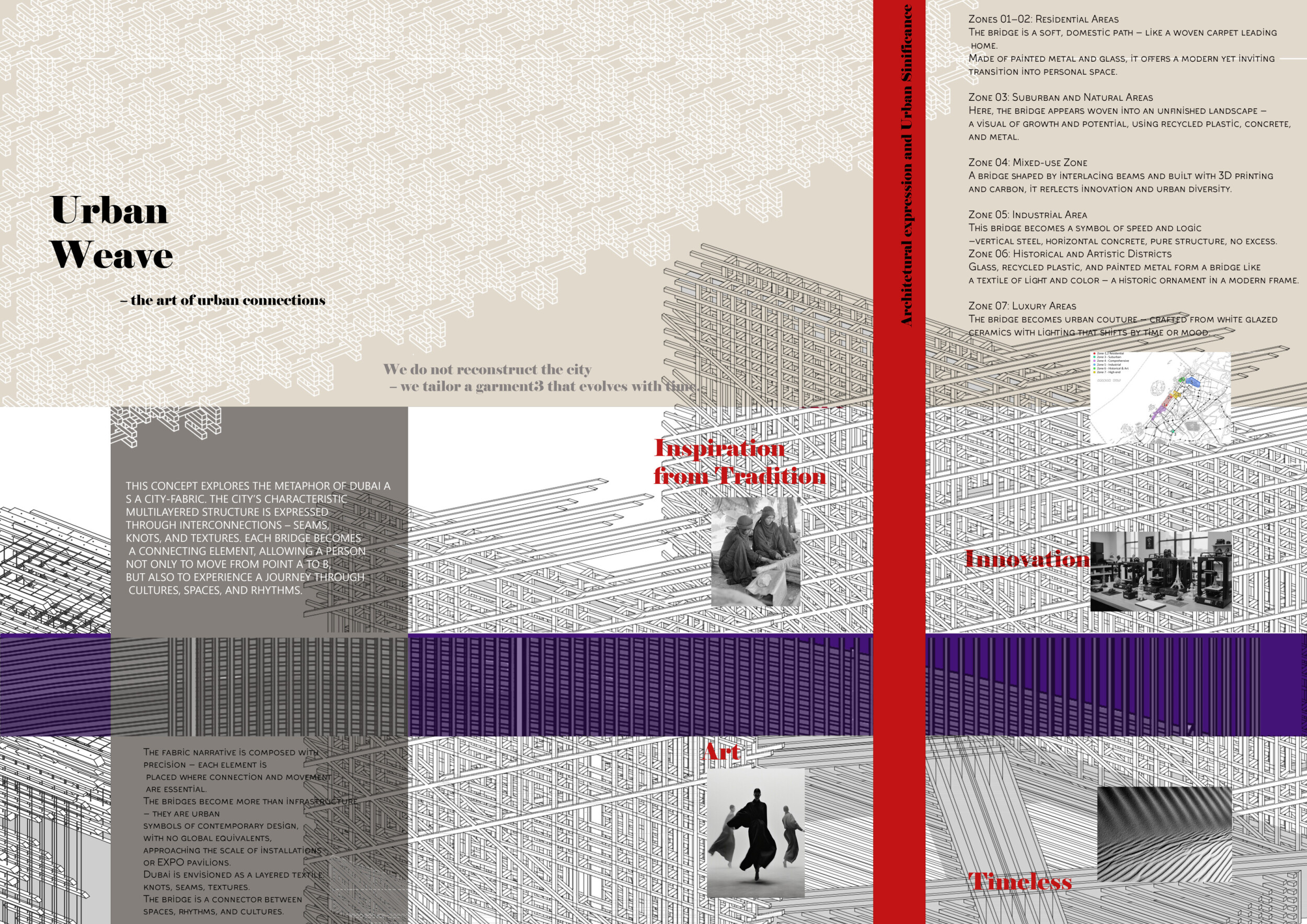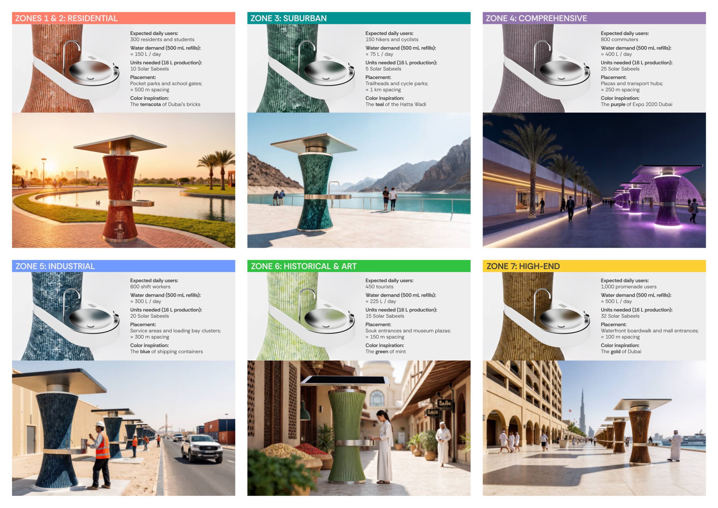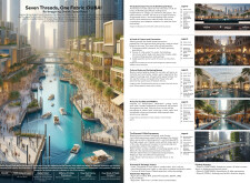 This proposal establishes a cohesive urban design system tailored to Dubai’s diverse zoning contexts, translating each area’s cultural, climatic, and programmatic character into a unified streetscape language. Seven distinct zone typologies—ranging from residential to industrial, heritage, and high-end—are articulated through a matrix of core geometries, modular shading elements, curated material palettes, and contextual wayfinding. Read more Each typology introduces unique visual identifiers: Z1 and Z2 draw on Islamic motifs and neighborhood intimacy, Z3 evokes Bedouin tents and soft landforms, while Z5 and Z7 leverage sharper geometries and premium finishes to express industrial rigor or luxury. The proposal integrates shading, pedestrian bridges, solar infrastructure, and street furniture into cohesive kit-of-parts systems adaptable across road hierarchies and public interfaces. Artistic co-design, climate-responsive strategies, and heritage continuity are embedded throughout, ensuring visual consistency while accommodating Dubai’s rapid growth, diverse urban fabrics, and the need for identity-driven public realm enhancements.