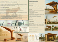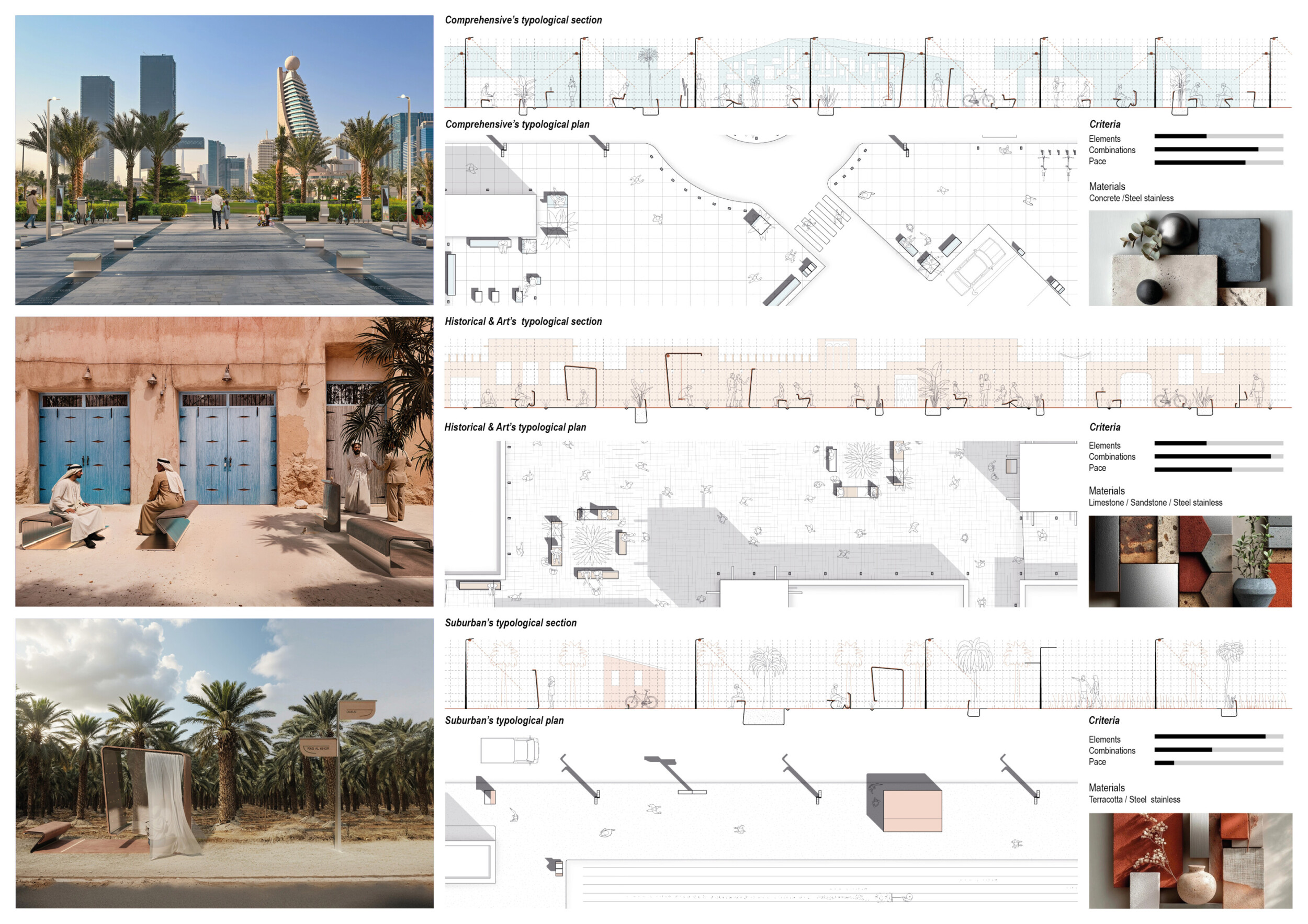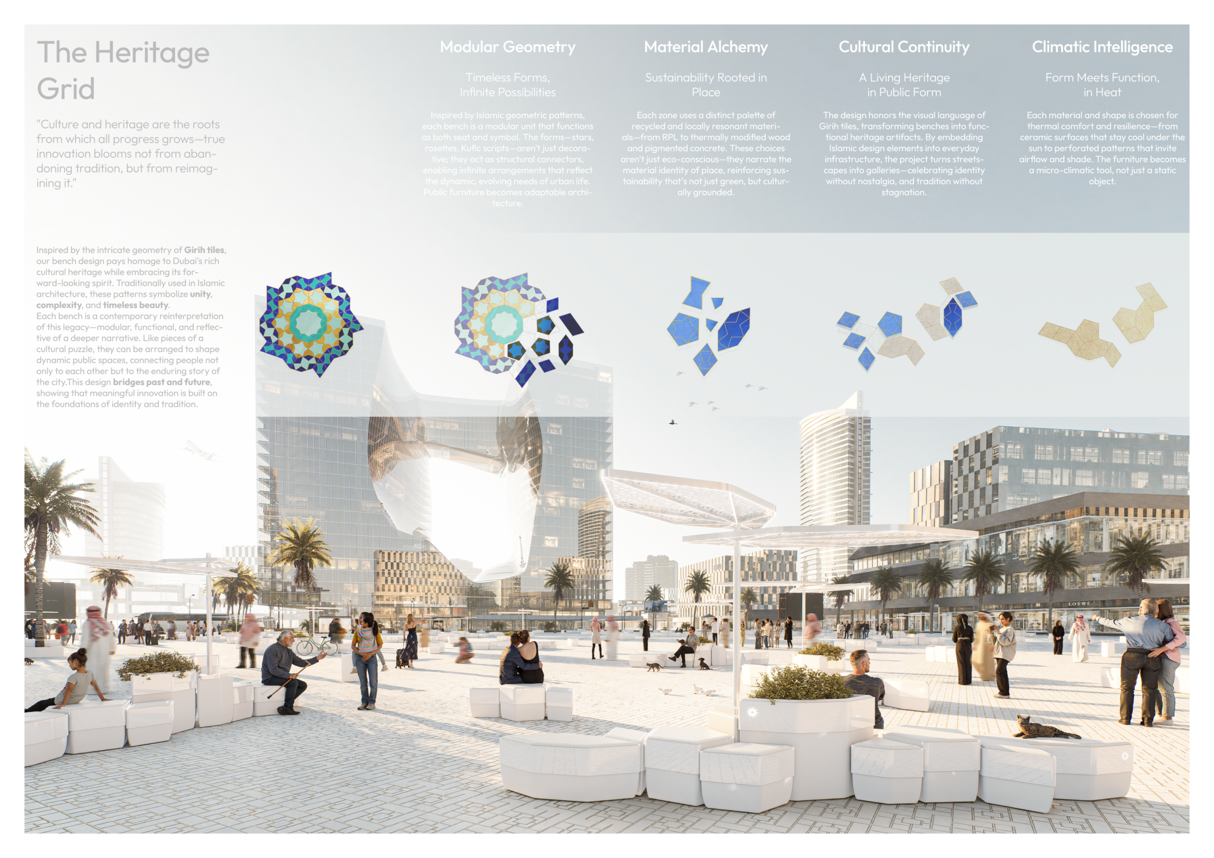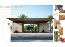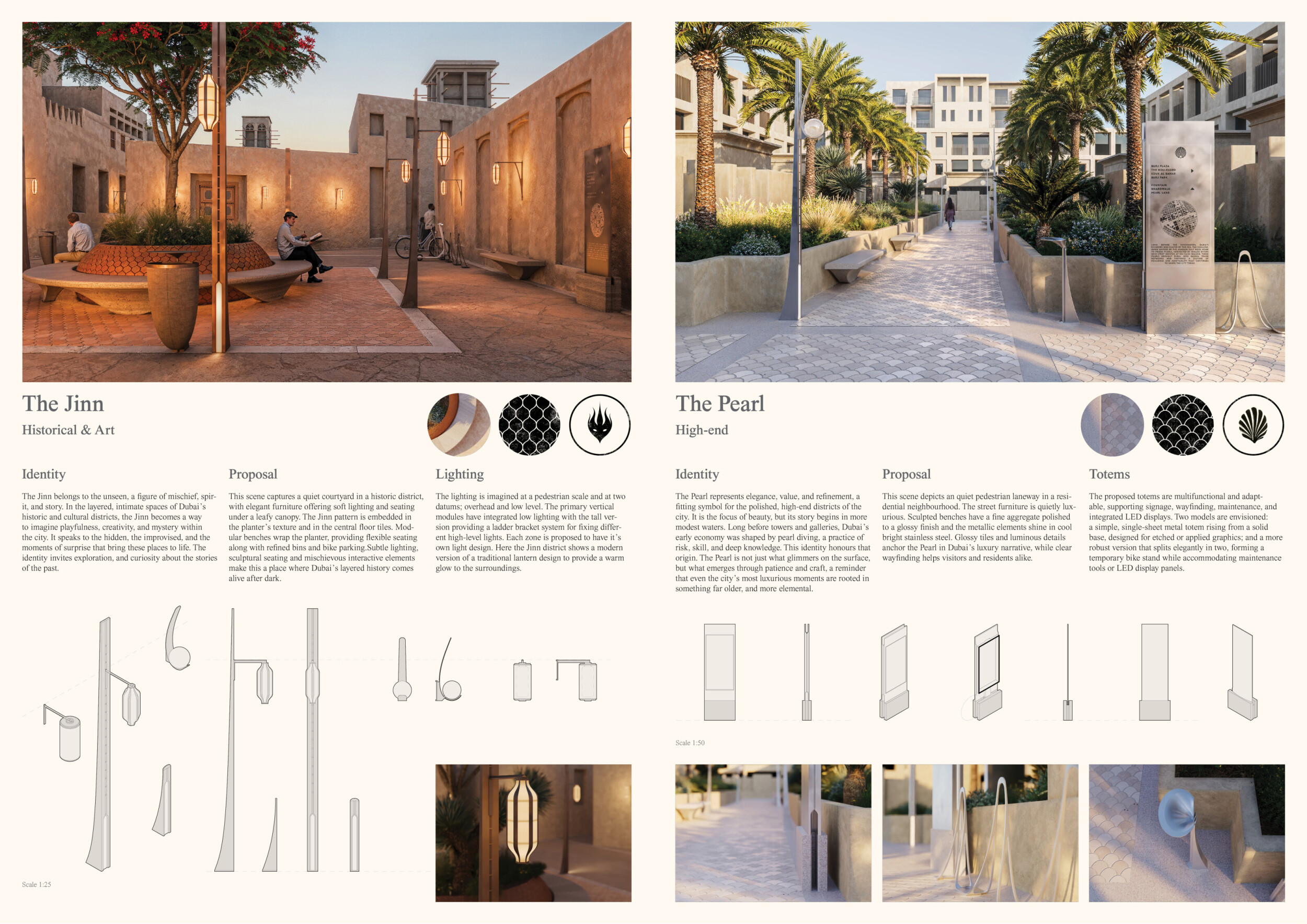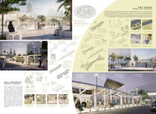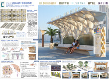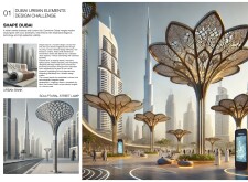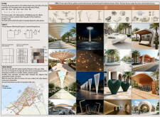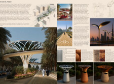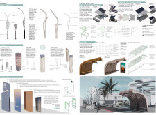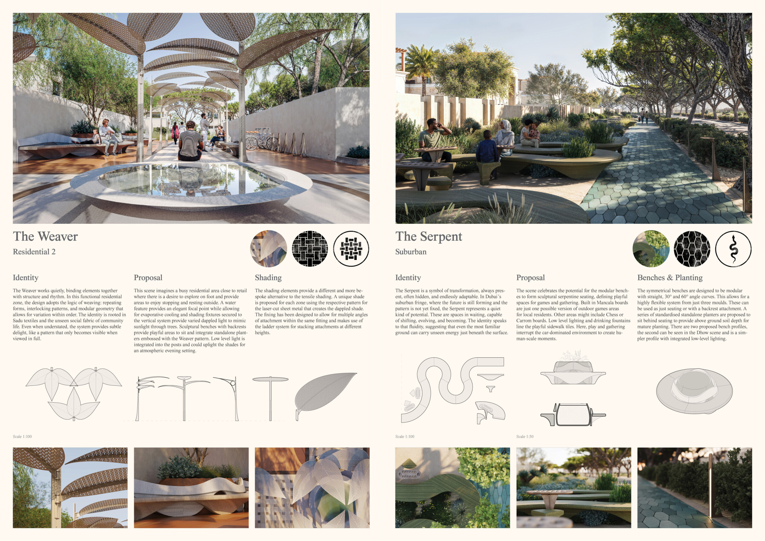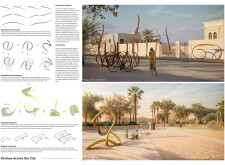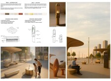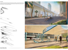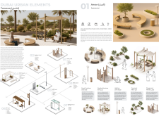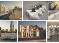 This project proposes a family of urban elements designed as a continuous narrative woven through Dubai’s public realm. Drawing on symbols rooted in local history, landscape, and cultural memory, the system translates motifs such as the palm, weaving, serpents, pearls, and maritime references into site-specific benches, canopies, lighting, railings, bridges, and wayfinding elements. Read more Rather than operating as isolated objects, the interventions function as a coherent kit of parts, calibrated to different urban conditions across residential, suburban, industrial, and civic zones. Material choices and construction strategies respond to climate, durability, and maintenance demands, with an emphasis on shade, comfort, and longevity in extreme environmental conditions. Together, the elements establish a recognizable yet adaptable urban language that aims to connect past narratives with contemporary public life, embedding cultural storytelling directly into everyday spatial experience.