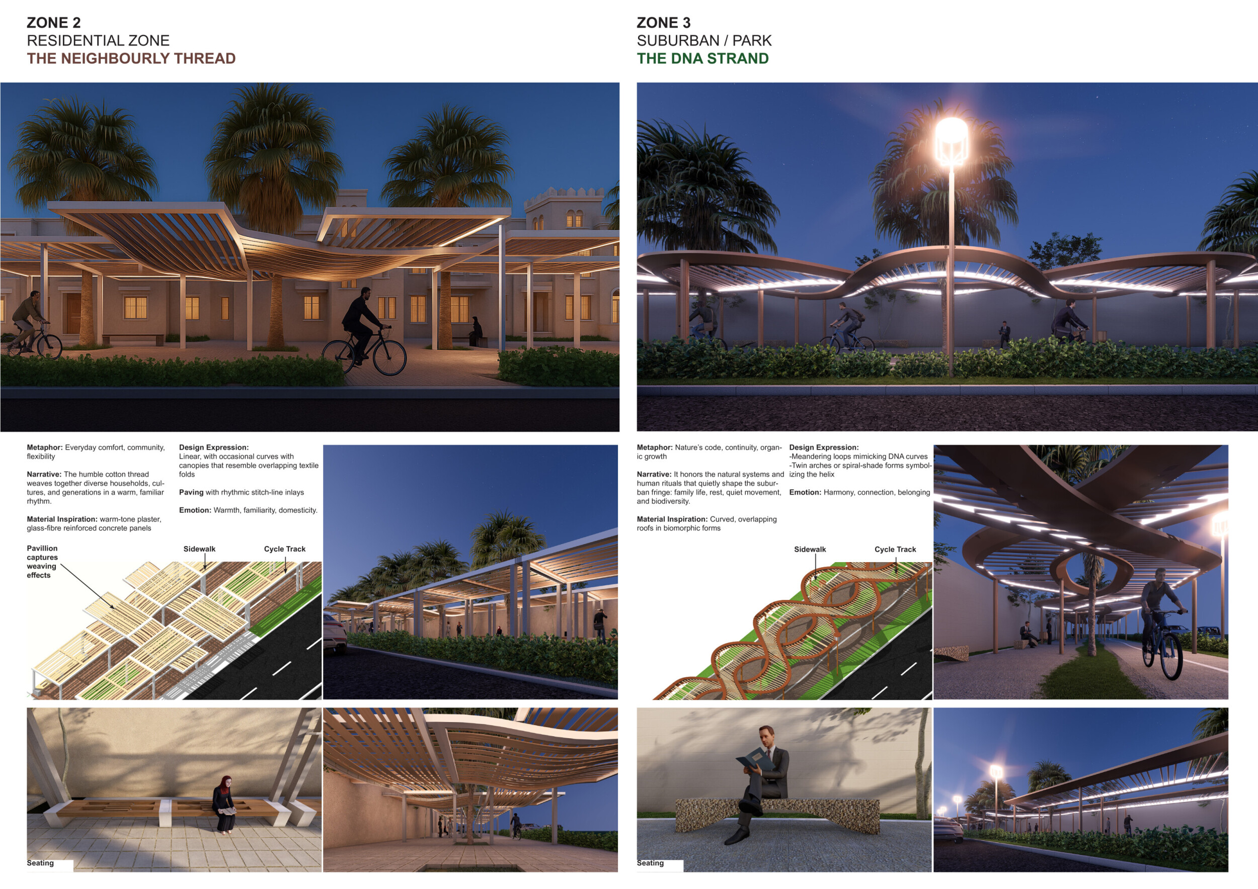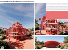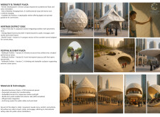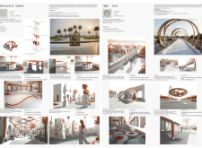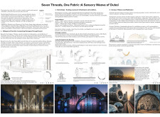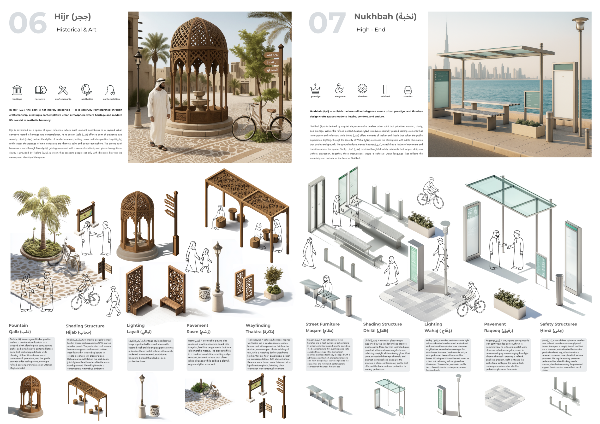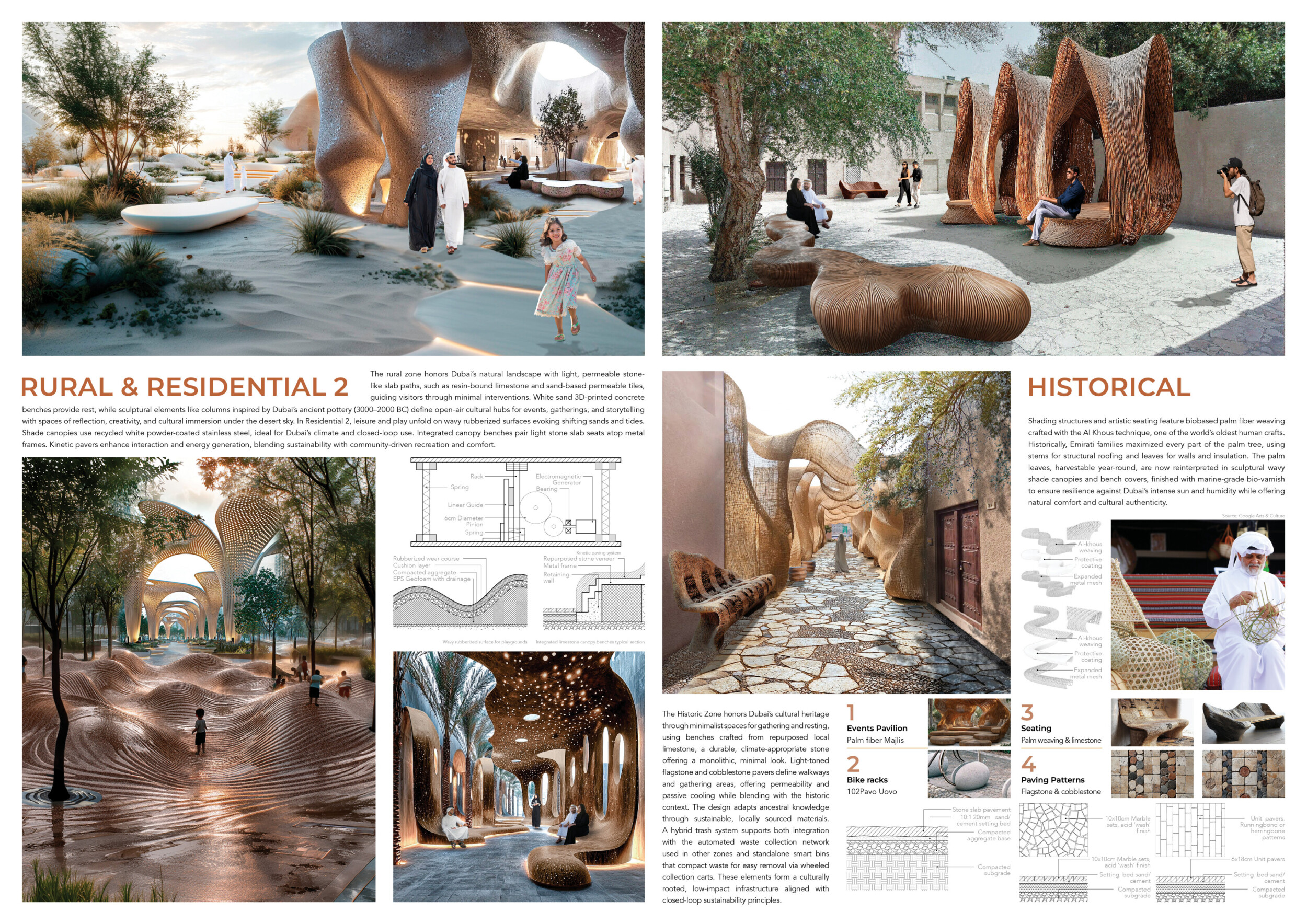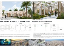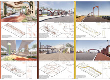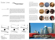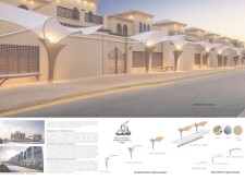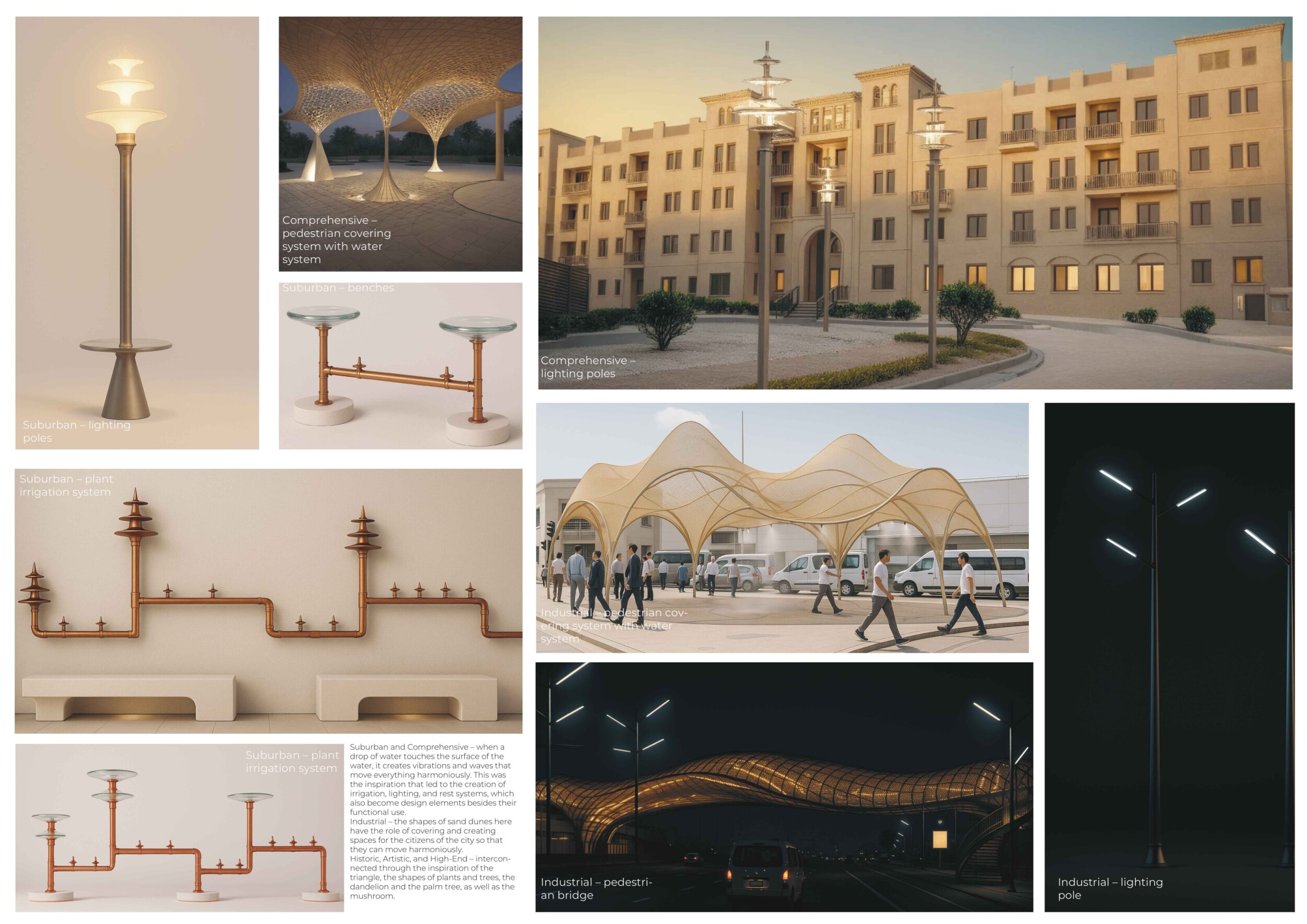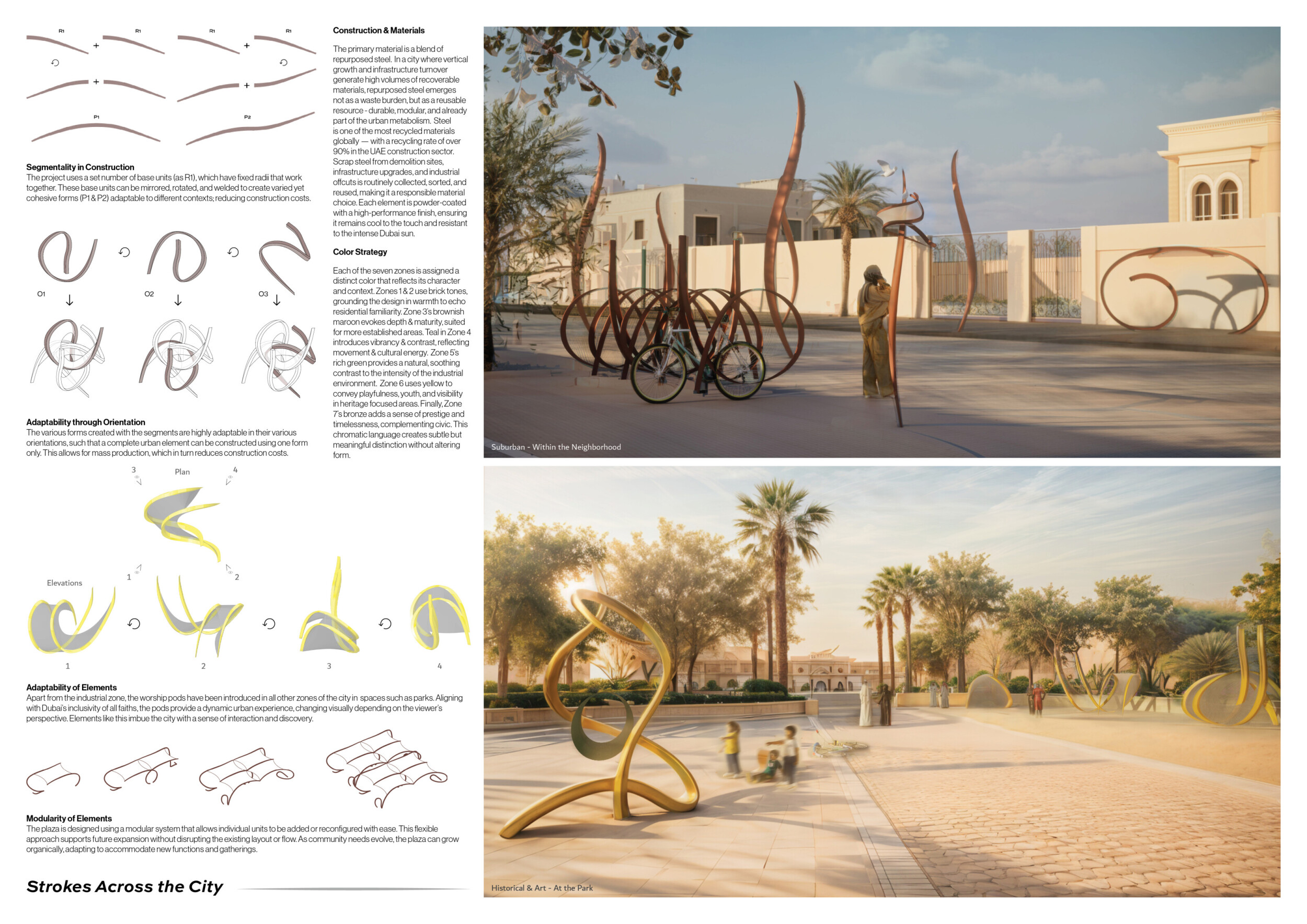 This project proposes a family of urban elements designed as a continuous narrative woven through Dubai’s public realm. Drawing on symbols rooted in local history, landscape, and cultural memory, the system translates motifs such as the palm, weaving, serpents, pearls, and maritime references into site-specific benches, canopies, lighting, railings, bridges, and wayfinding elements. Read more Rather than operating as isolated objects, the interventions function as a coherent kit of parts, calibrated to different urban conditions across residential, suburban, industrial, and civic zones. Material choices and construction strategies respond to climate, durability, and maintenance demands, with an emphasis on shade, comfort, and longevity in extreme environmental conditions. Together, the elements establish a recognizable yet adaptable urban language that aims to connect past narratives with contemporary public life, embedding cultural storytelling directly into everyday spatial experience.