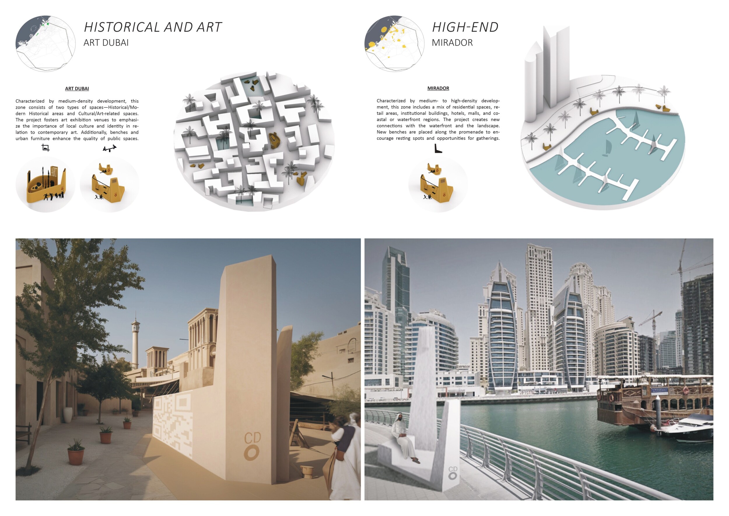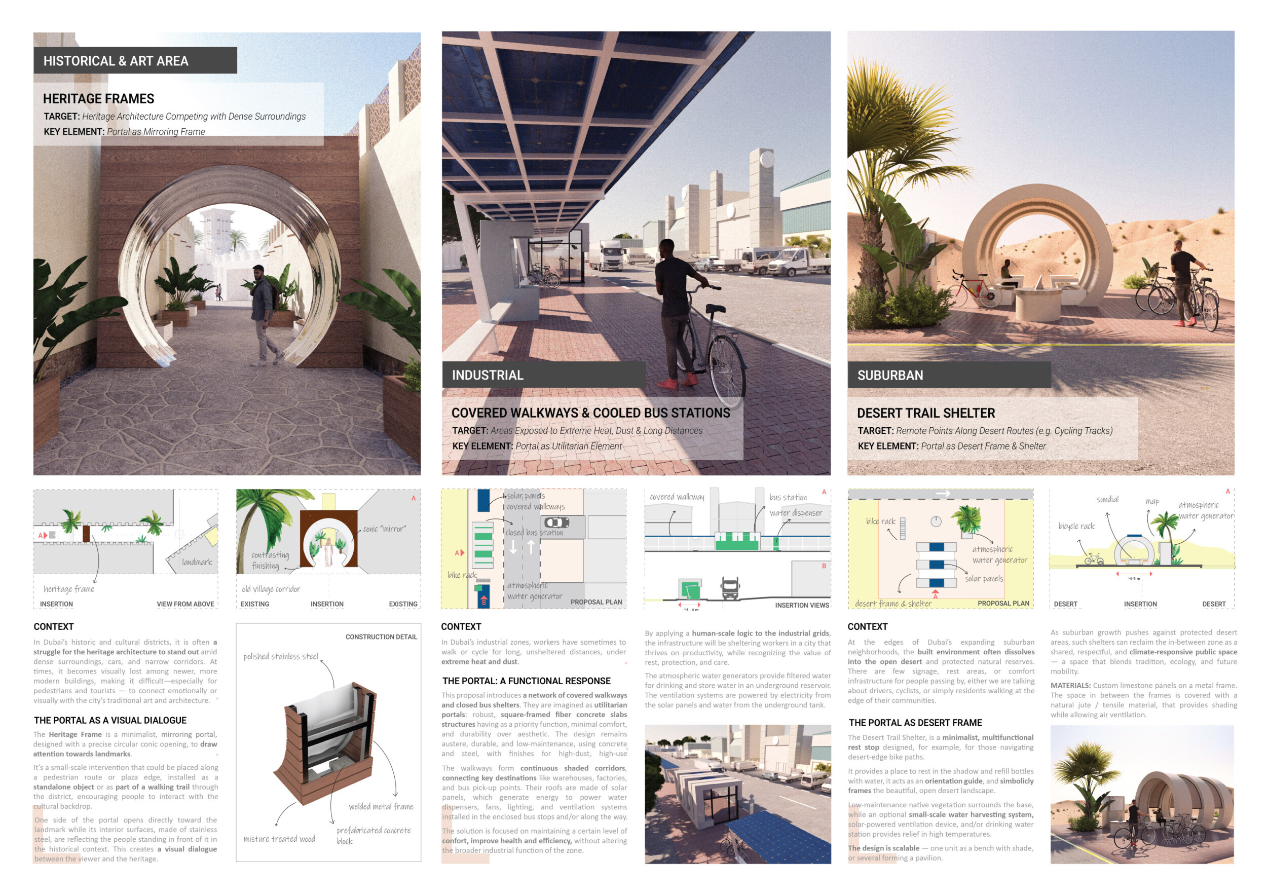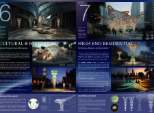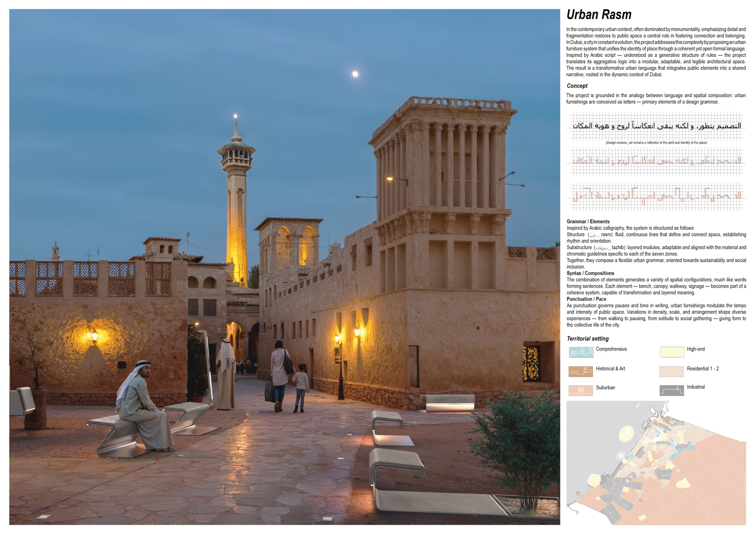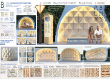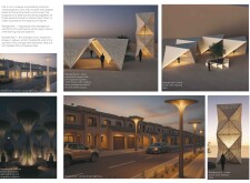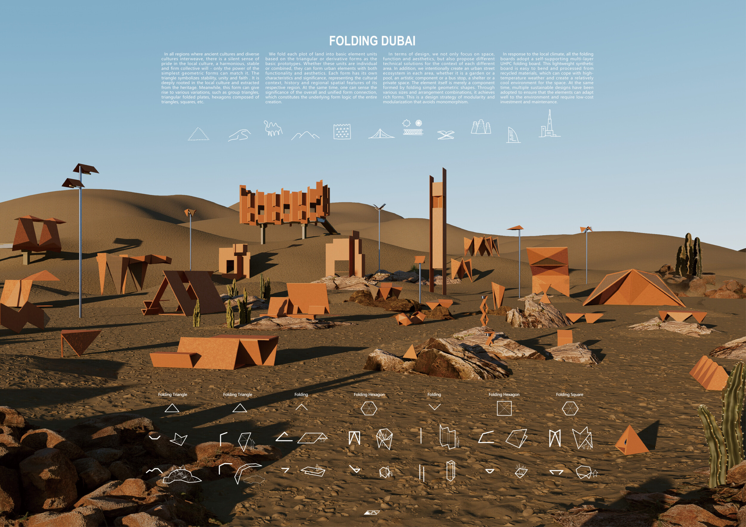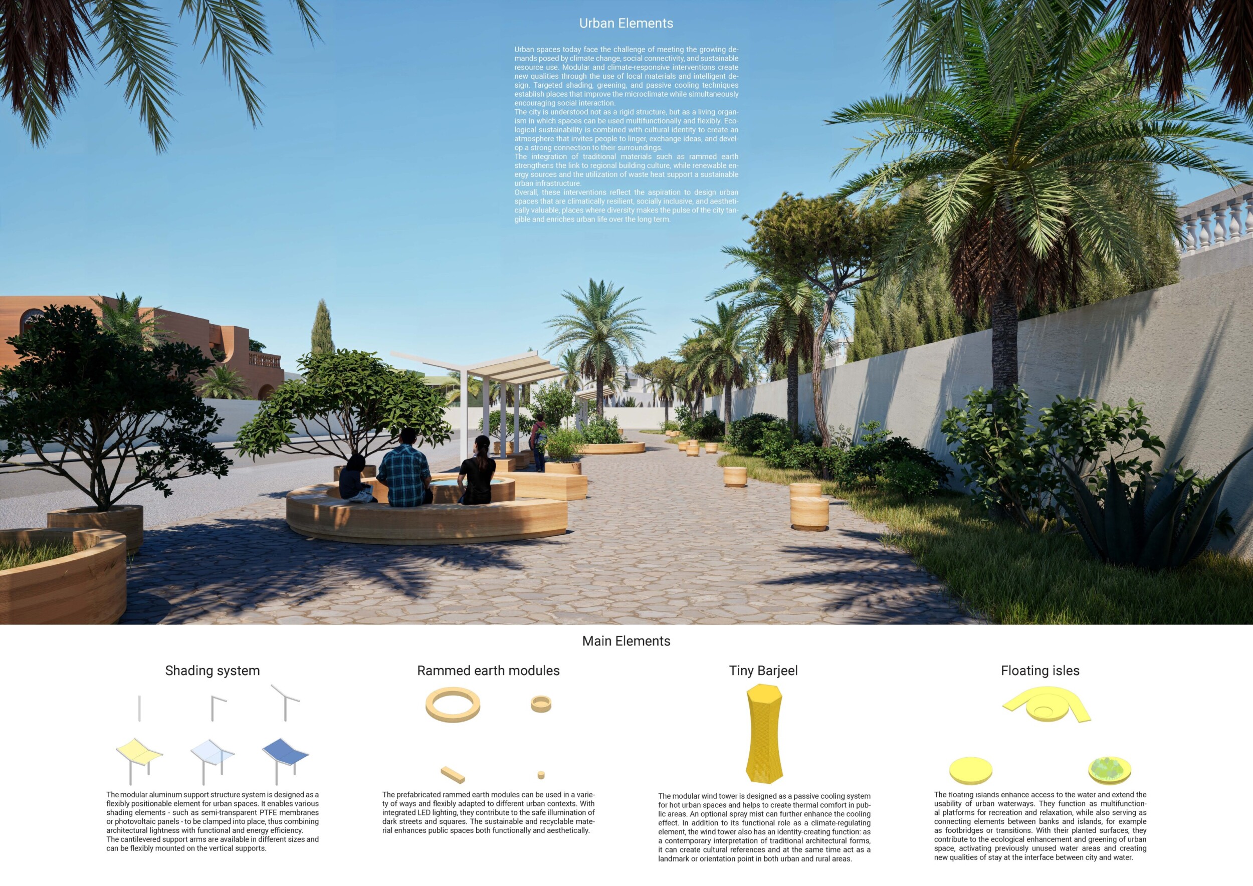 This project proposes a family of urban elements designed as a continuous narrative woven through Dubai’s public realm. Drawing on symbols rooted in local history, landscape, and cultural memory, the system translates motifs such as the palm, weaving, serpents, pearls, and maritime references into site-specific benches, canopies, lighting, railings, bridges, and wayfinding elements. Read more Rather than operating as isolated objects, the interventions function as a coherent kit of parts, calibrated to different urban conditions across residential, suburban, industrial, and civic zones. Material choices and construction strategies respond to climate, durability, and maintenance demands, with an emphasis on shade, comfort, and longevity in extreme environmental conditions. Together, the elements establish a recognizable yet adaptable urban language that aims to connect past narratives with contemporary public life, embedding cultural storytelling directly into everyday spatial experience.