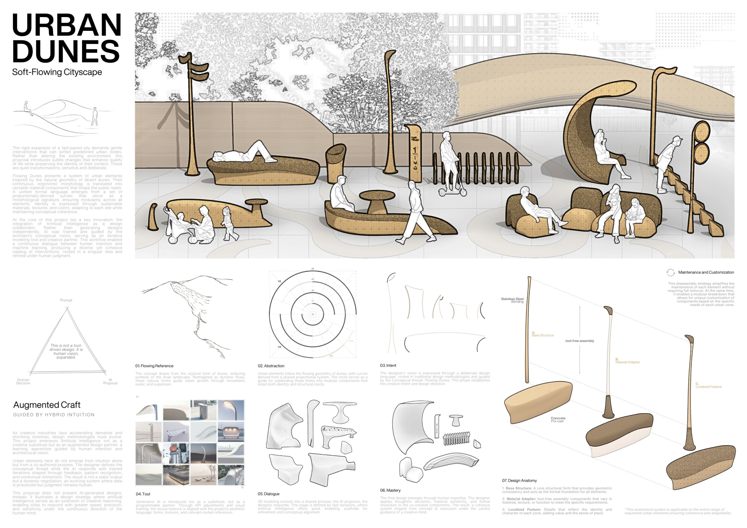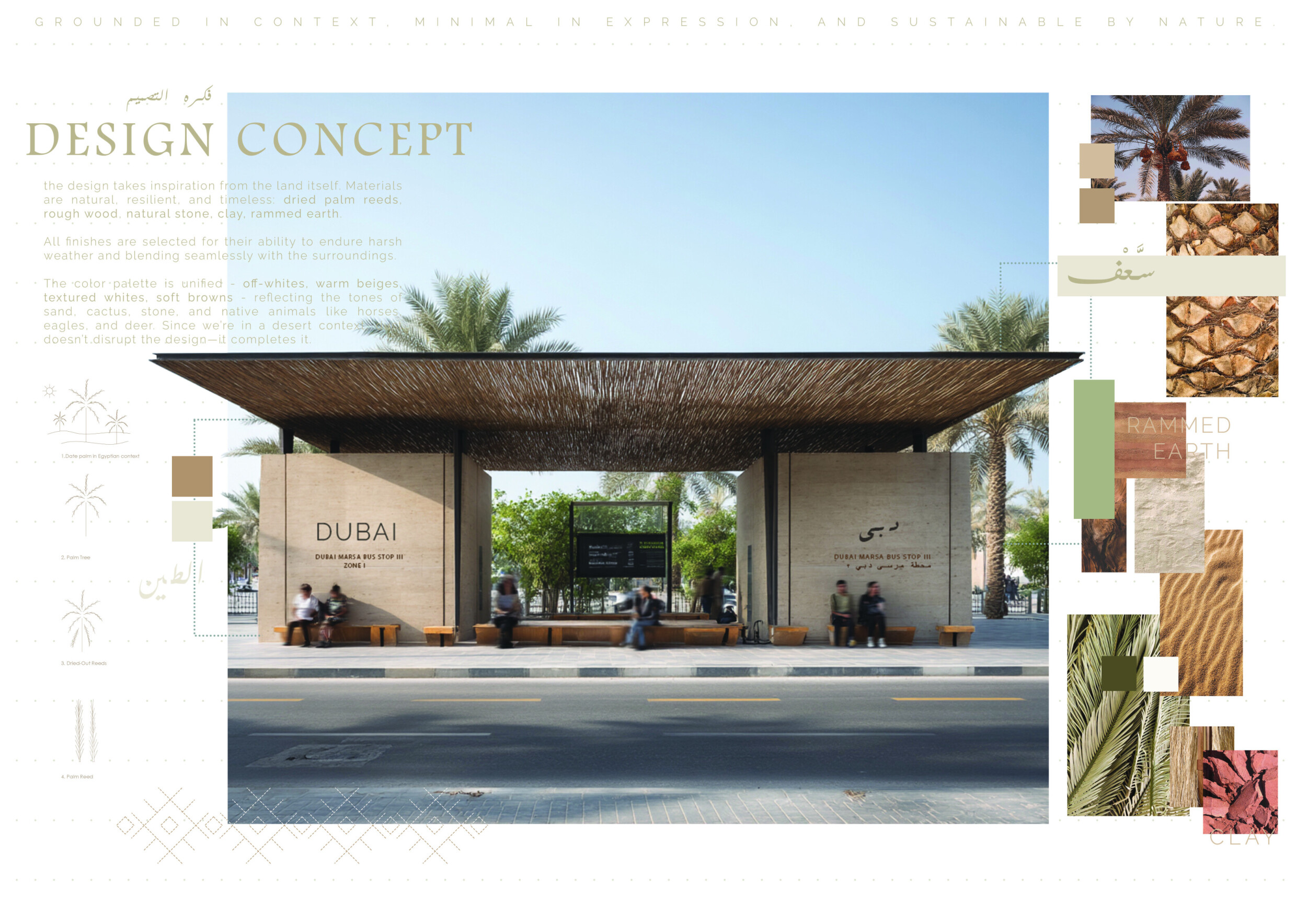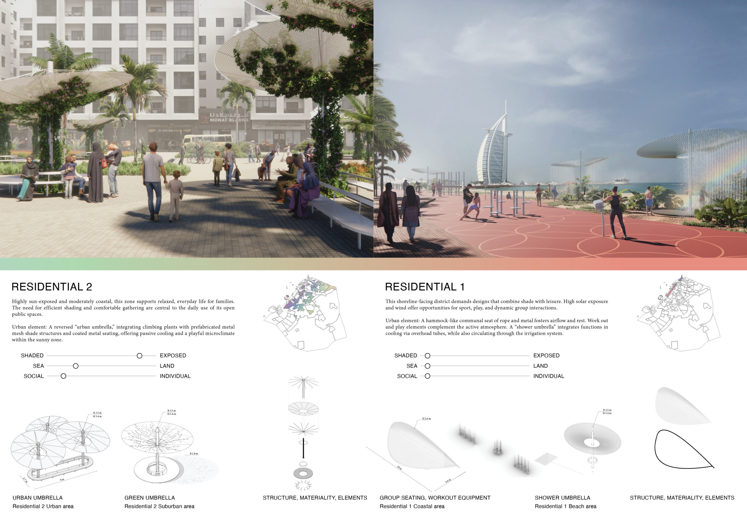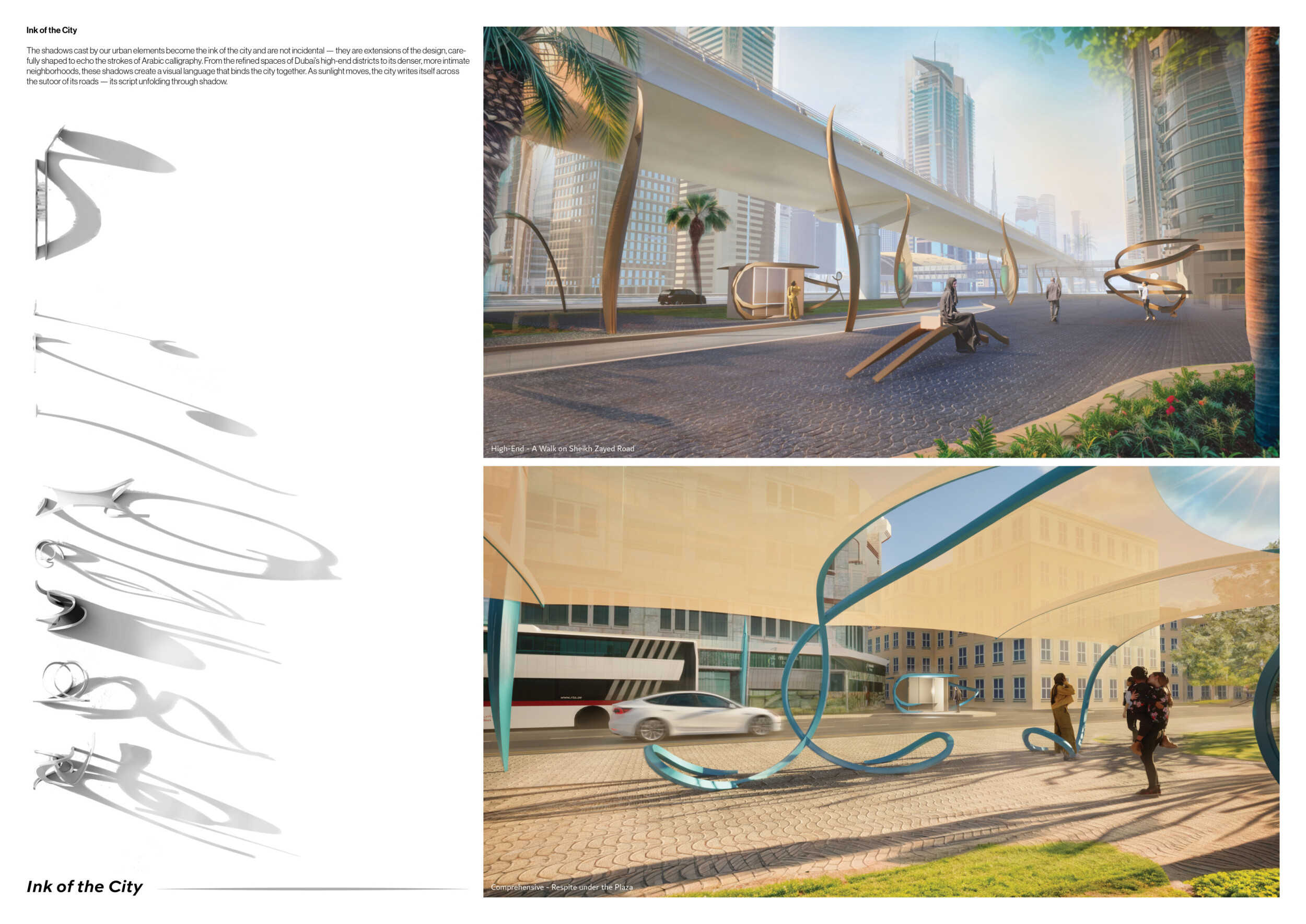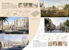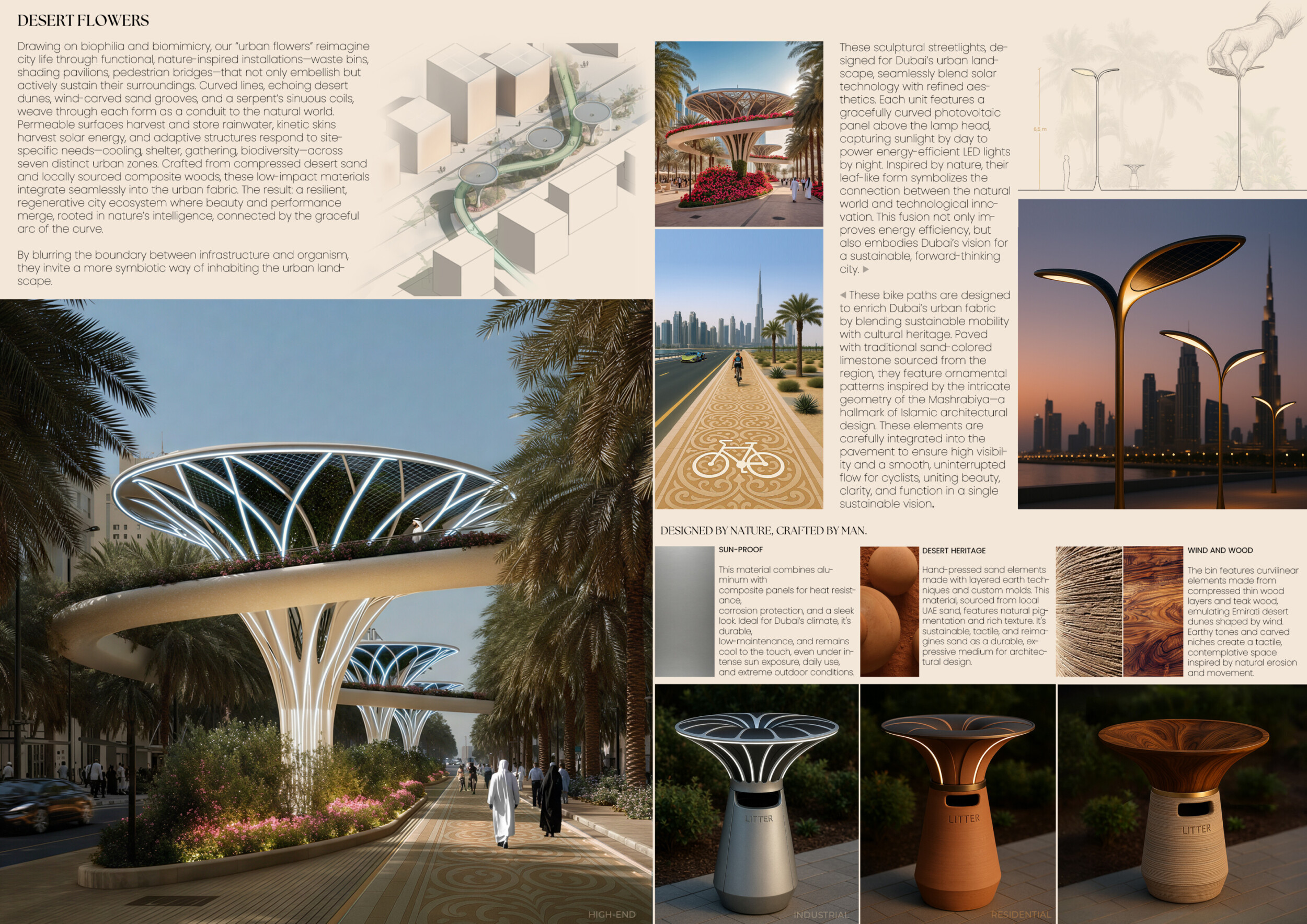This project proposes a family of urban elements designed as a continuous narrative woven through Dubai’s public realm. Drawing on symbols rooted in local history, landscape, and cultural memory, the system translates motifs such as the palm, weaving, serpents, pearls, and maritime references into site-specific benches, canopies, lighting, railings, bridges, and wayfinding elements. Read more Rather than operating as isolated objects, the interventions function as a coherent kit of parts, calibrated to different urban conditions across residential, suburban, industrial, and civic zones. Material choices and construction strategies respond to climate, durability, and maintenance demands, with an emphasis on shade, comfort, and longevity in extreme environmental conditions. Together, the elements establish a recognizable yet adaptable urban language that aims to connect past narratives with contemporary public life, embedding cultural storytelling directly into everyday spatial experience.