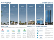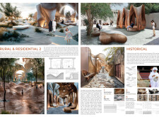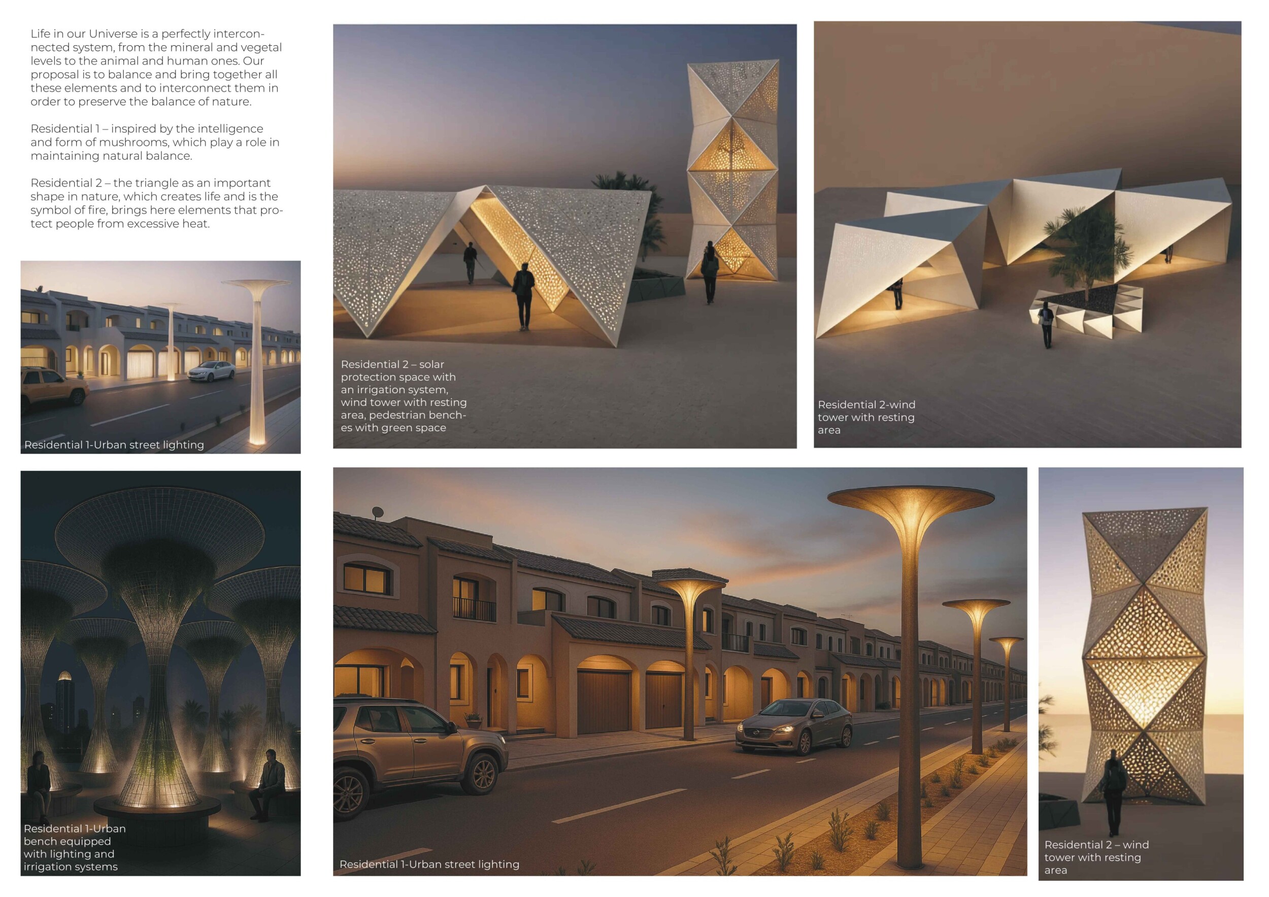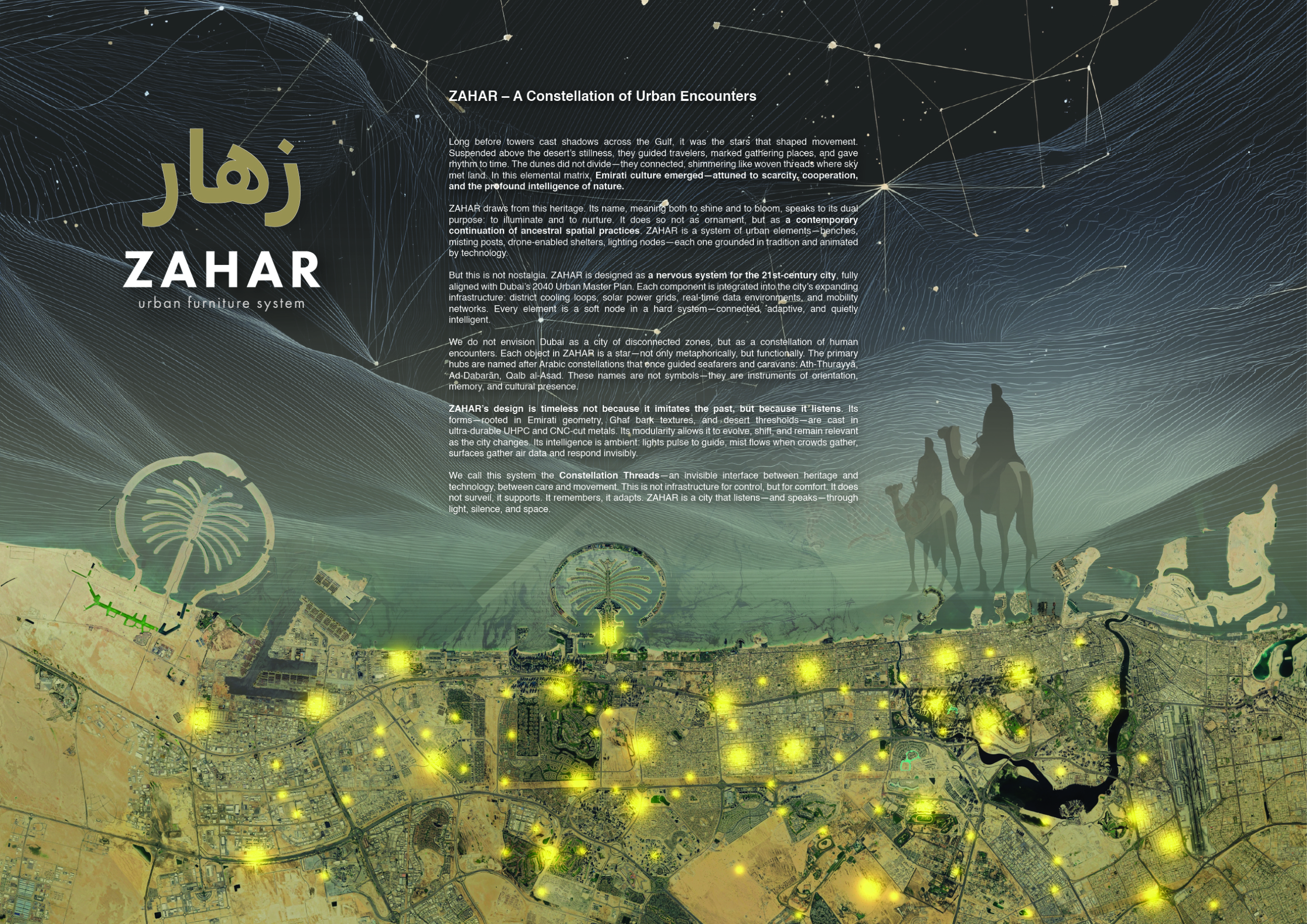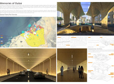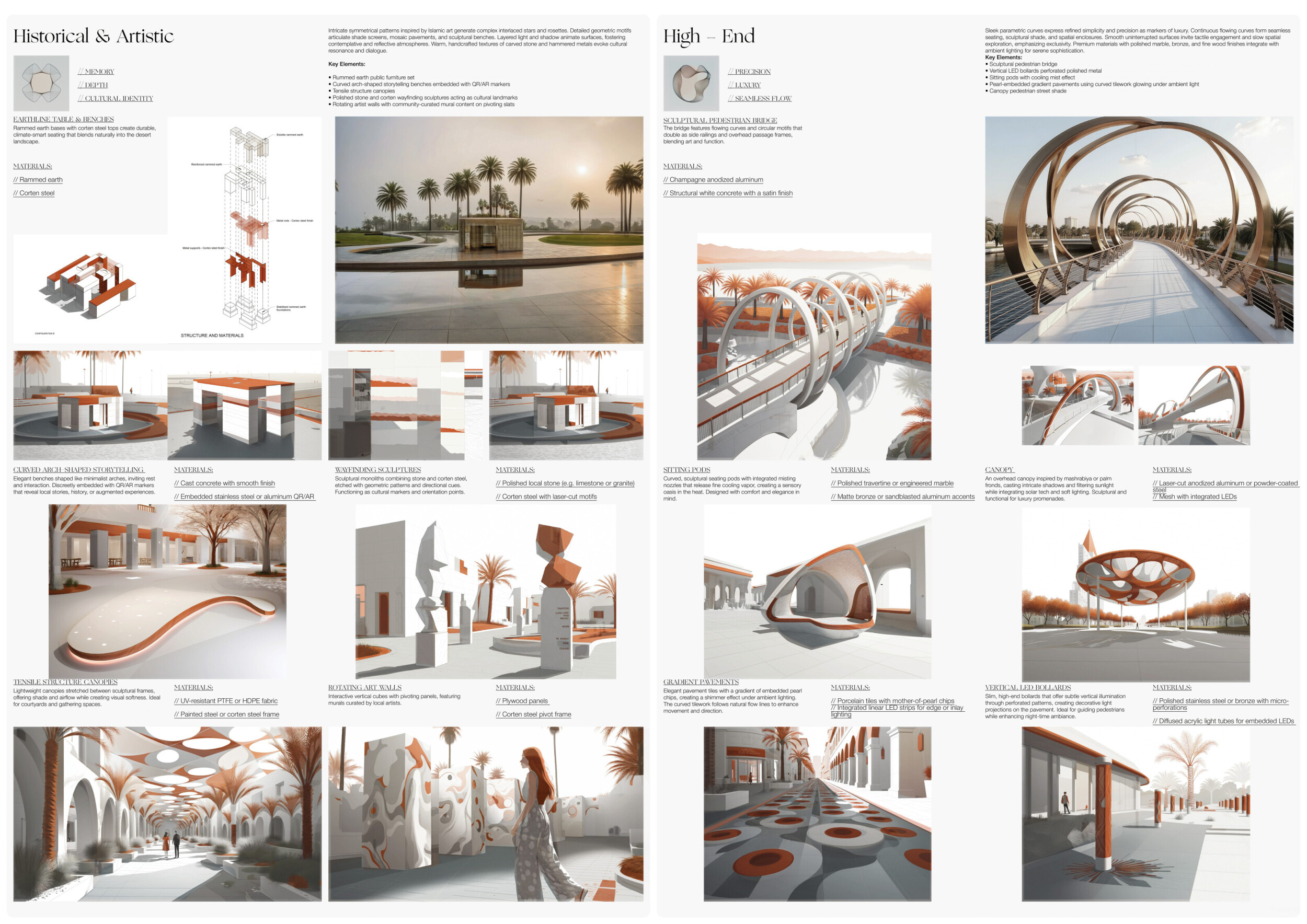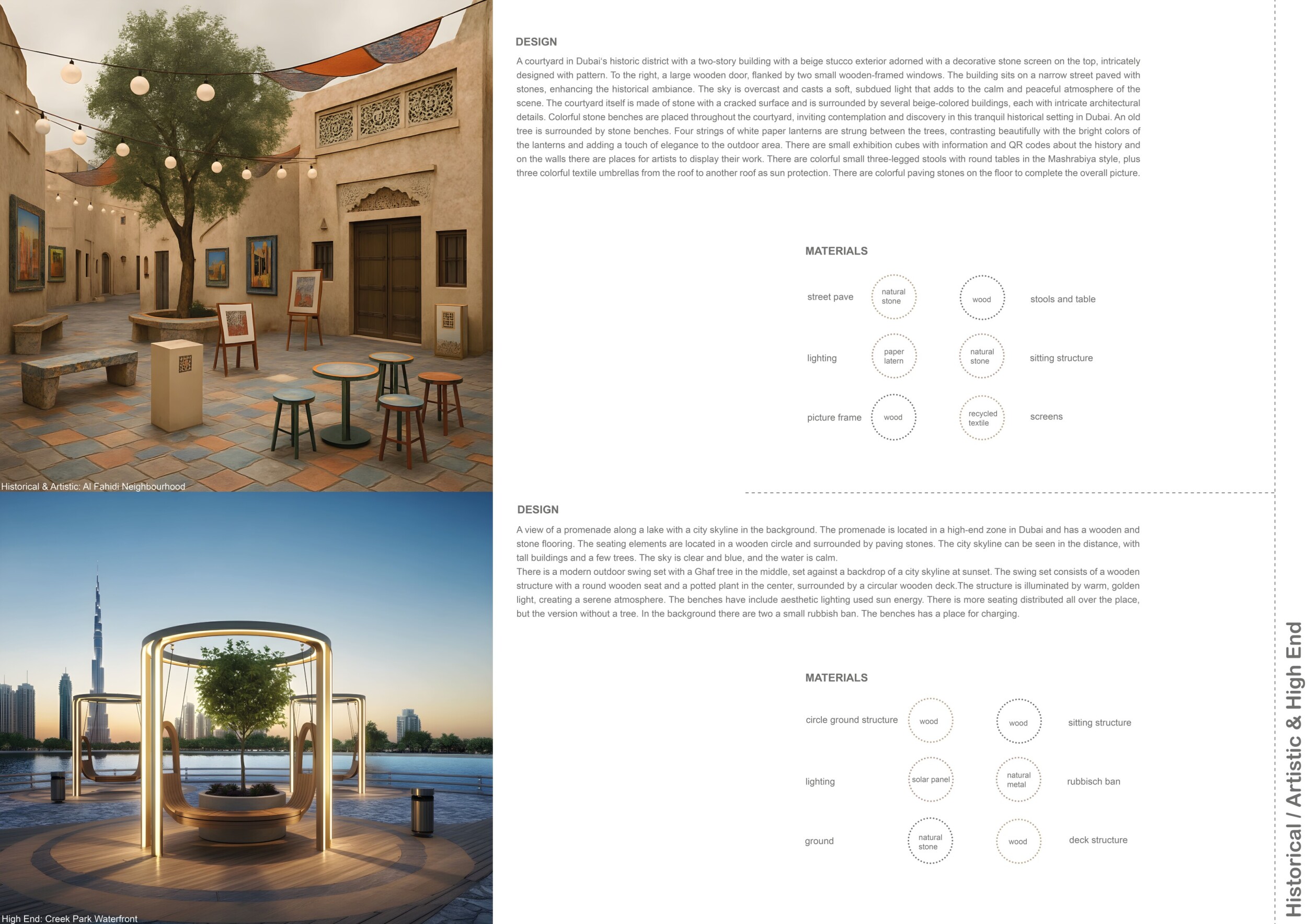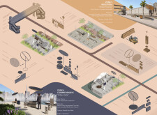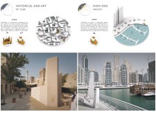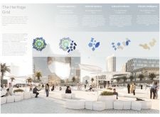 This project proposes a family of urban elements designed as a continuous narrative woven through Dubai’s public realm. Drawing on symbols rooted in local history, landscape, and cultural memory, the system translates motifs such as the palm, weaving, serpents, pearls, and maritime references into site-specific benches, canopies, lighting, railings, bridges, and wayfinding elements. Read more Rather than operating as isolated objects, the interventions function as a coherent kit of parts, calibrated to different urban conditions across residential, suburban, industrial, and civic zones. Material choices and construction strategies respond to climate, durability, and maintenance demands, with an emphasis on shade, comfort, and longevity in extreme environmental conditions. Together, the elements establish a recognizable yet adaptable urban language that aims to connect past narratives with contemporary public life, embedding cultural storytelling directly into everyday spatial experience.