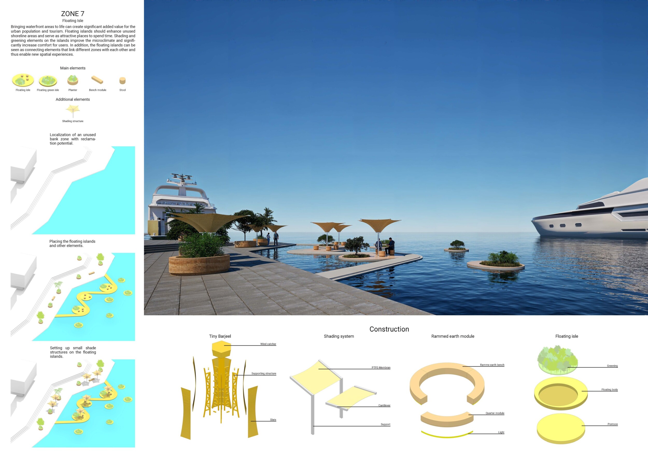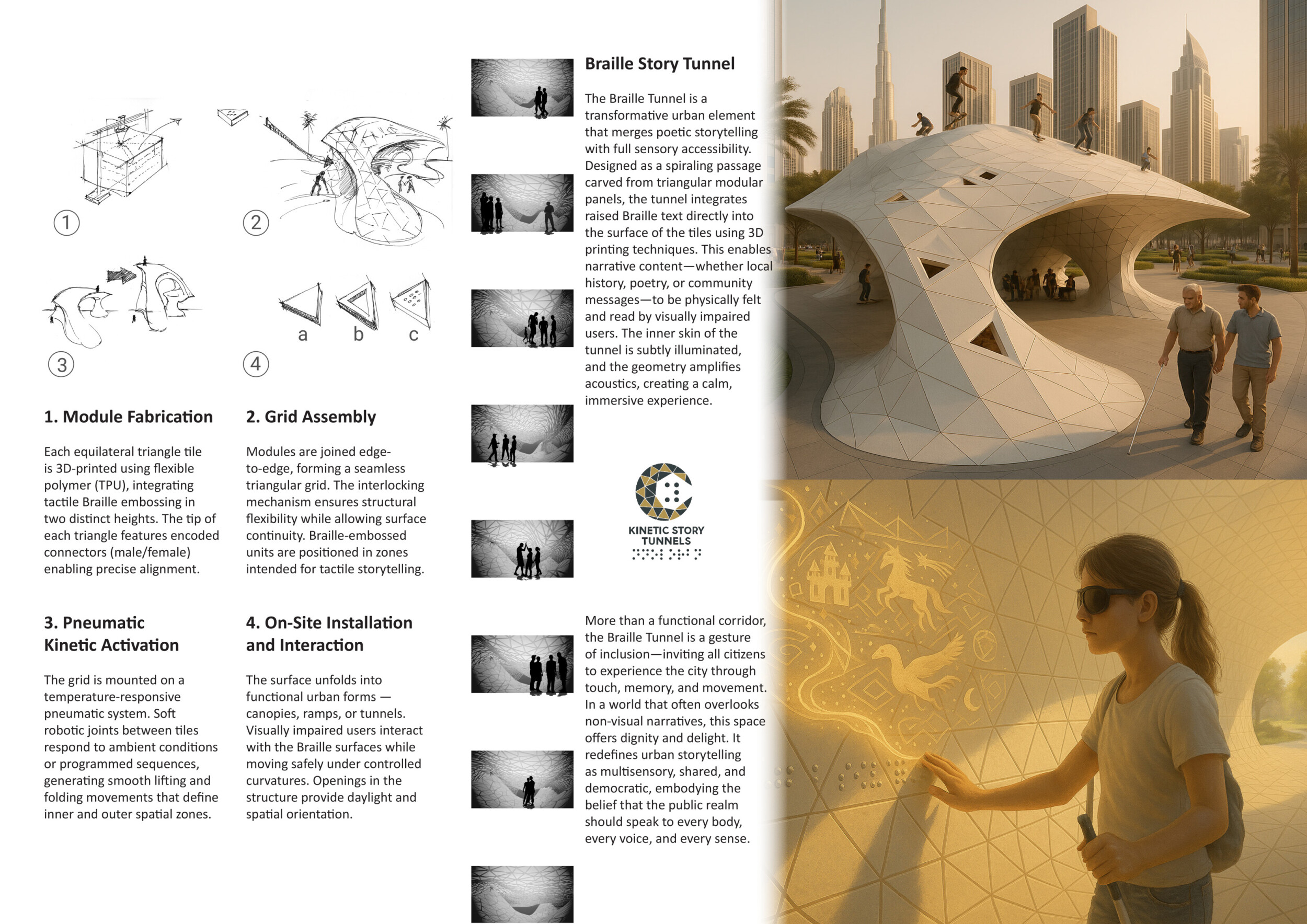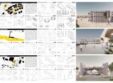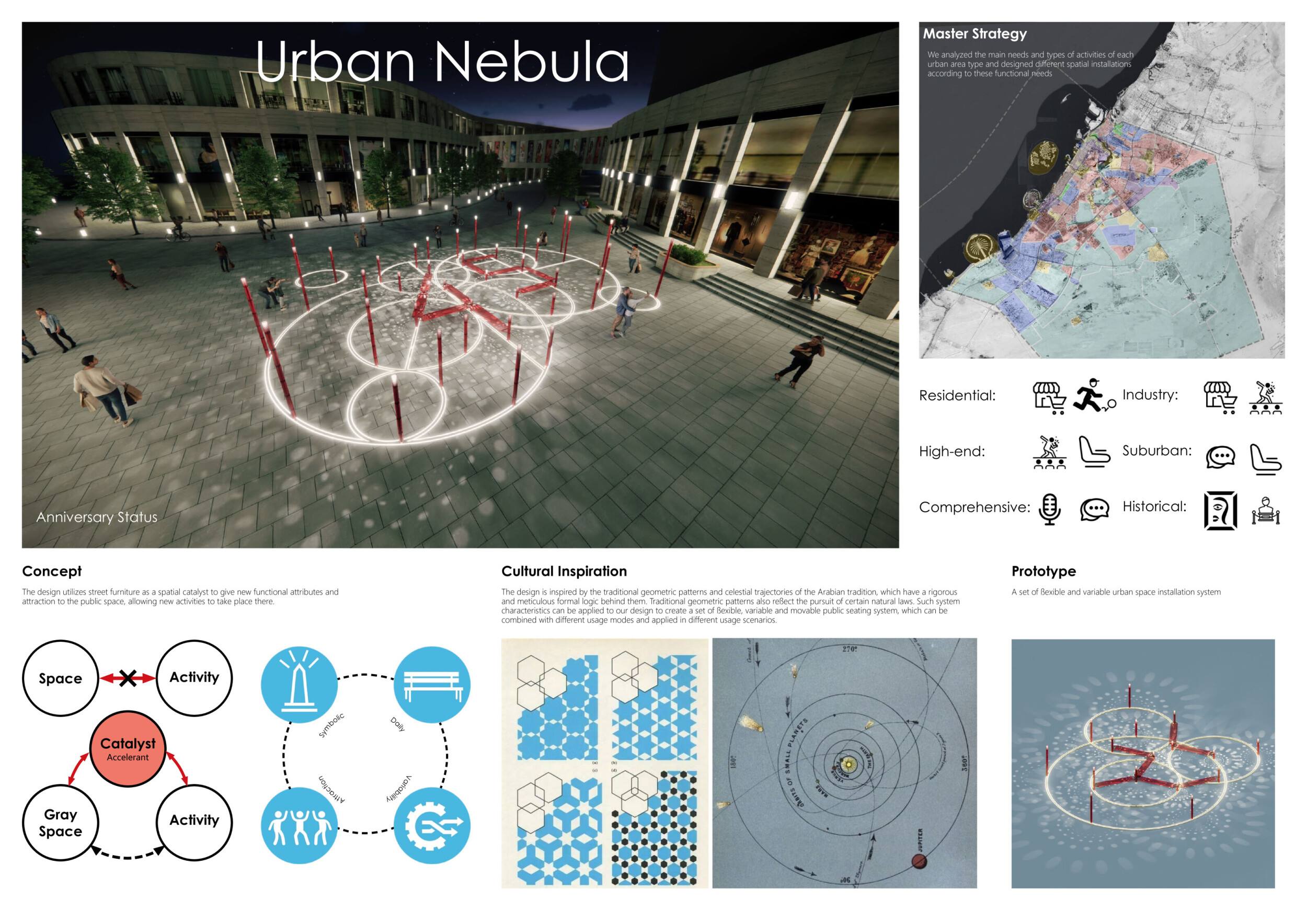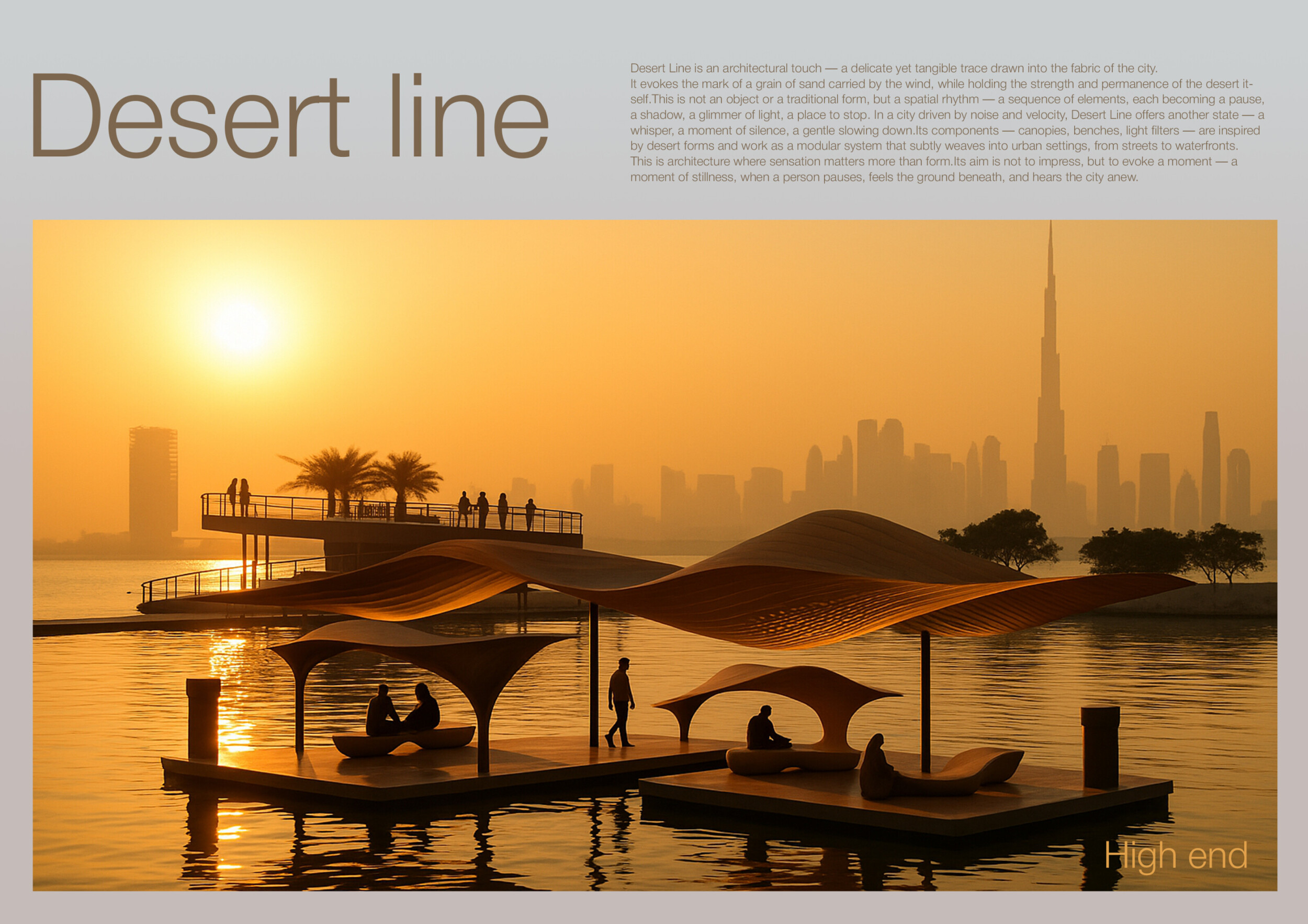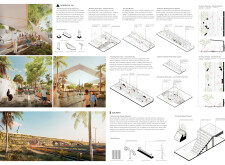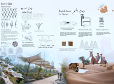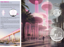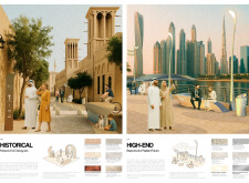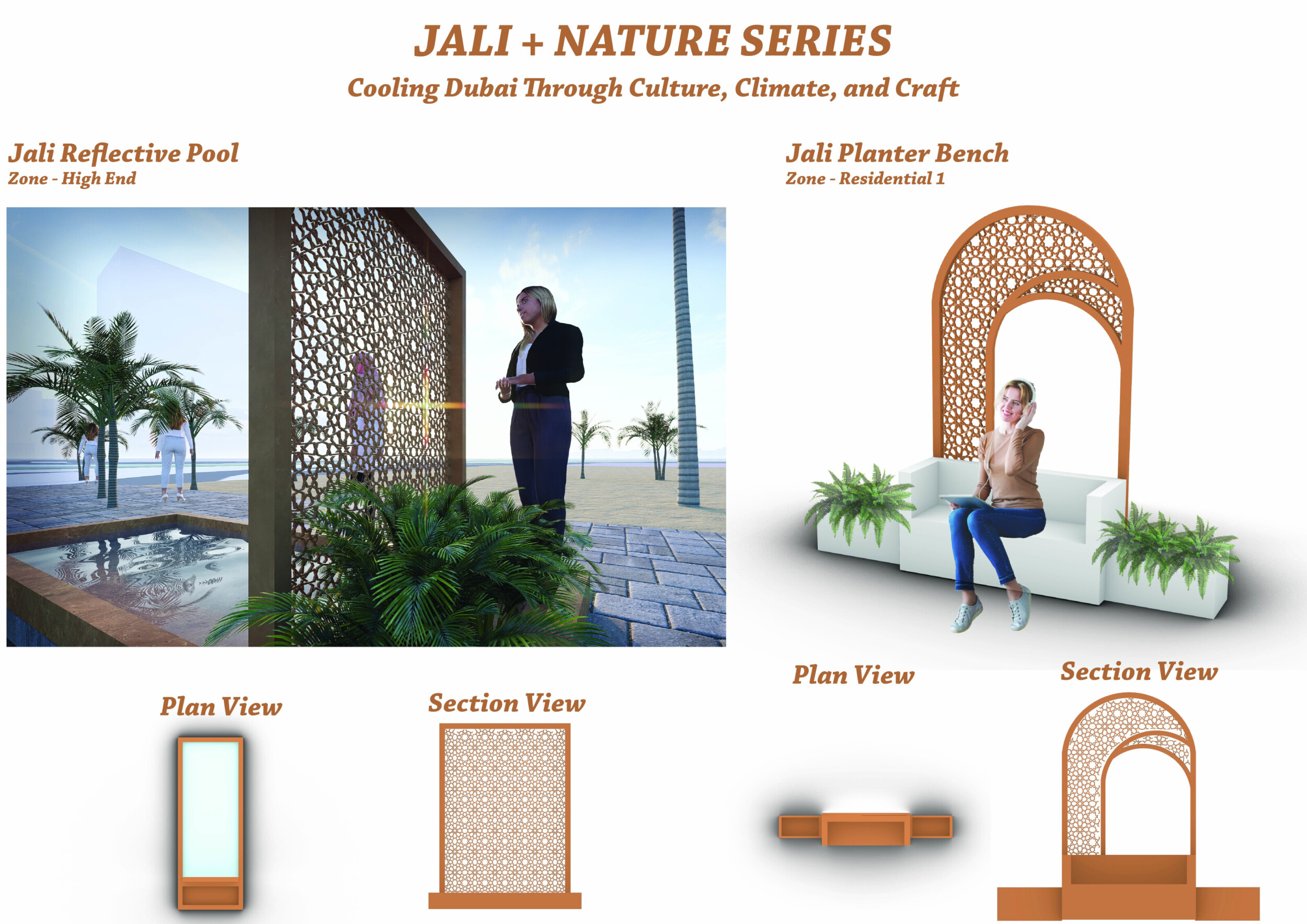 This project proposes a family of urban elements designed as a continuous narrative woven through Dubai’s public realm. Drawing on symbols rooted in local history, landscape, and cultural memory, the system translates motifs such as the palm, weaving, serpents, pearls, and maritime references into site-specific benches, canopies, lighting, railings, bridges, and wayfinding elements. Read more Rather than operating as isolated objects, the interventions function as a coherent kit of parts, calibrated to different urban conditions across residential, suburban, industrial, and civic zones. Material choices and construction strategies respond to climate, durability, and maintenance demands, with an emphasis on shade, comfort, and longevity in extreme environmental conditions. Together, the elements establish a recognizable yet adaptable urban language that aims to connect past narratives with contemporary public life, embedding cultural storytelling directly into everyday spatial experience.