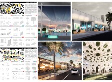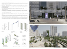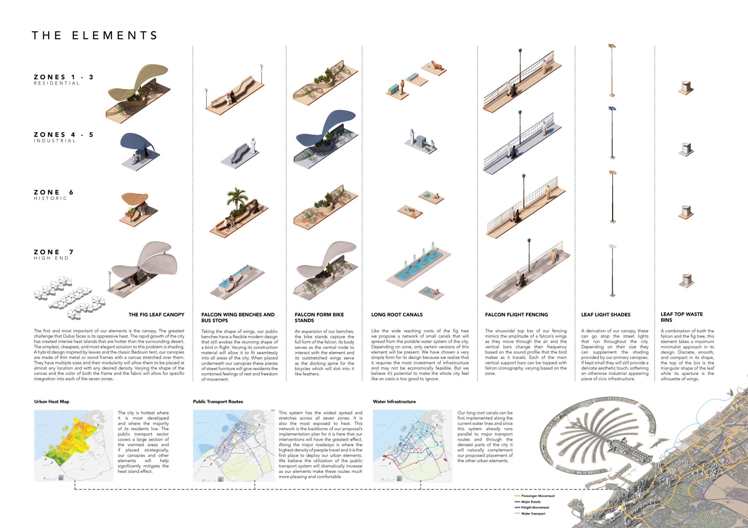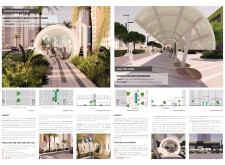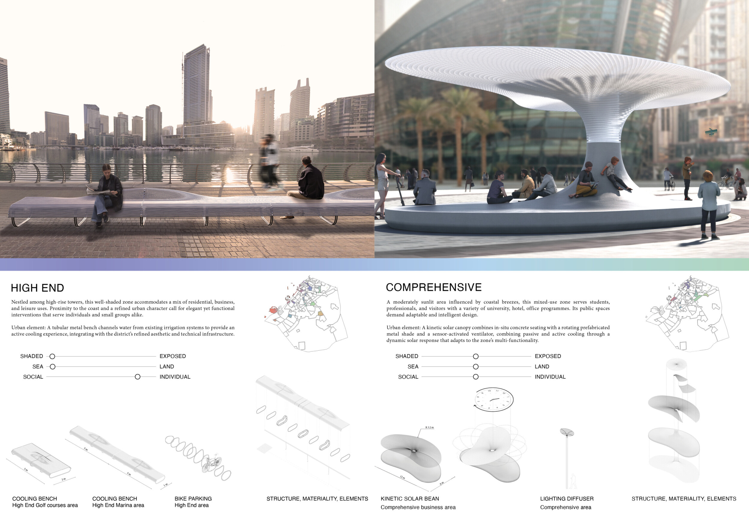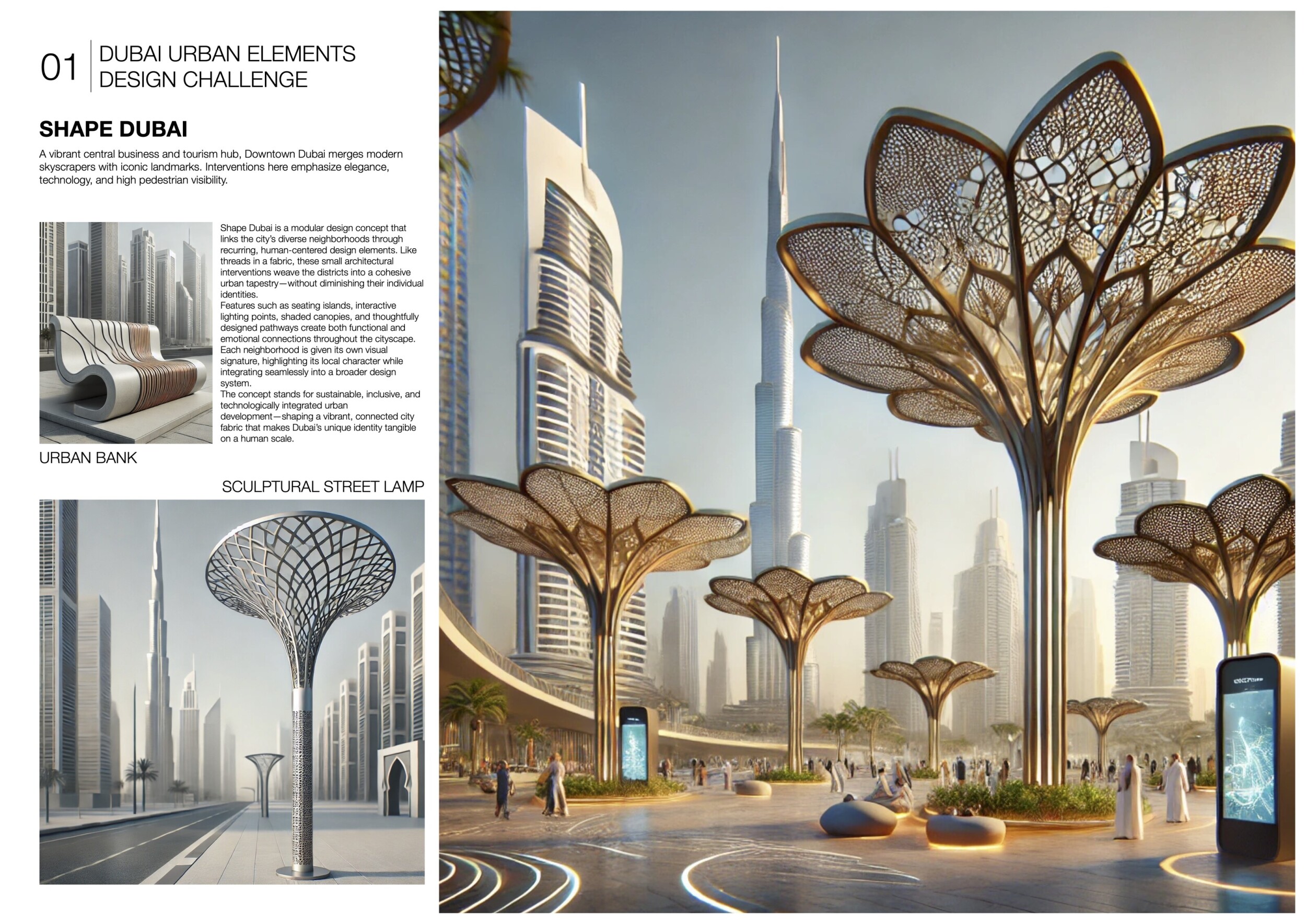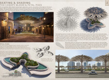 This proposal establishes a cohesive, city-wide design language for Dubai through a modular system of urban elements inspired by the native Ghaf tree. Abstractions of the tree’s leaves inform the geometry of seating, shading structures, lighting, and signage, offering a culturally grounded yet contemporary identity. The design operates at multiple scales, from street-level installations to district-wide coherence. Read more It introduces a curated library of modular elements deployed across eight defined urban zones, each adapted to local architectural and social contexts, from historical areas with rammed earth and warm tones to high-end districts with cool, sleek finishes. A single system accommodates contrasting needs: enhancing walkability, reducing solar exposure, and encouraging spontaneous community interaction. The intervention aligns material and color palettes with context-specific atmospheres while ensuring urban continuity.