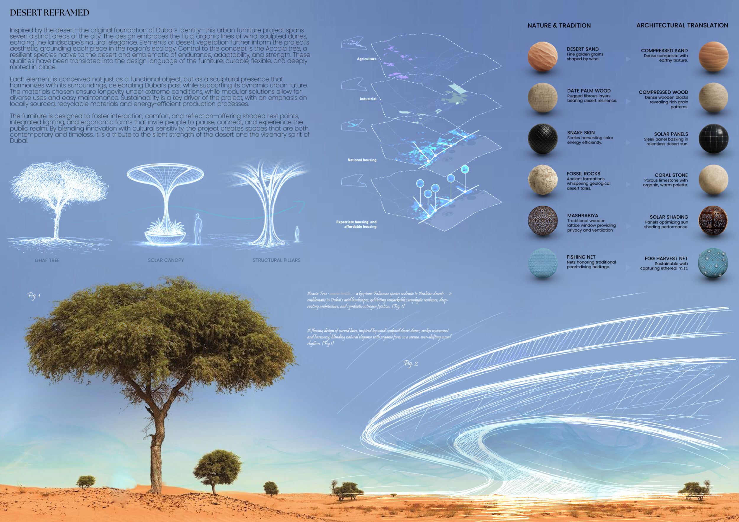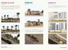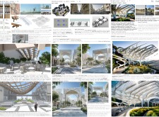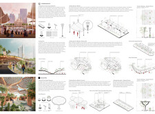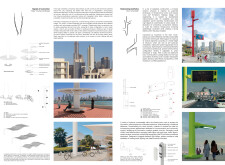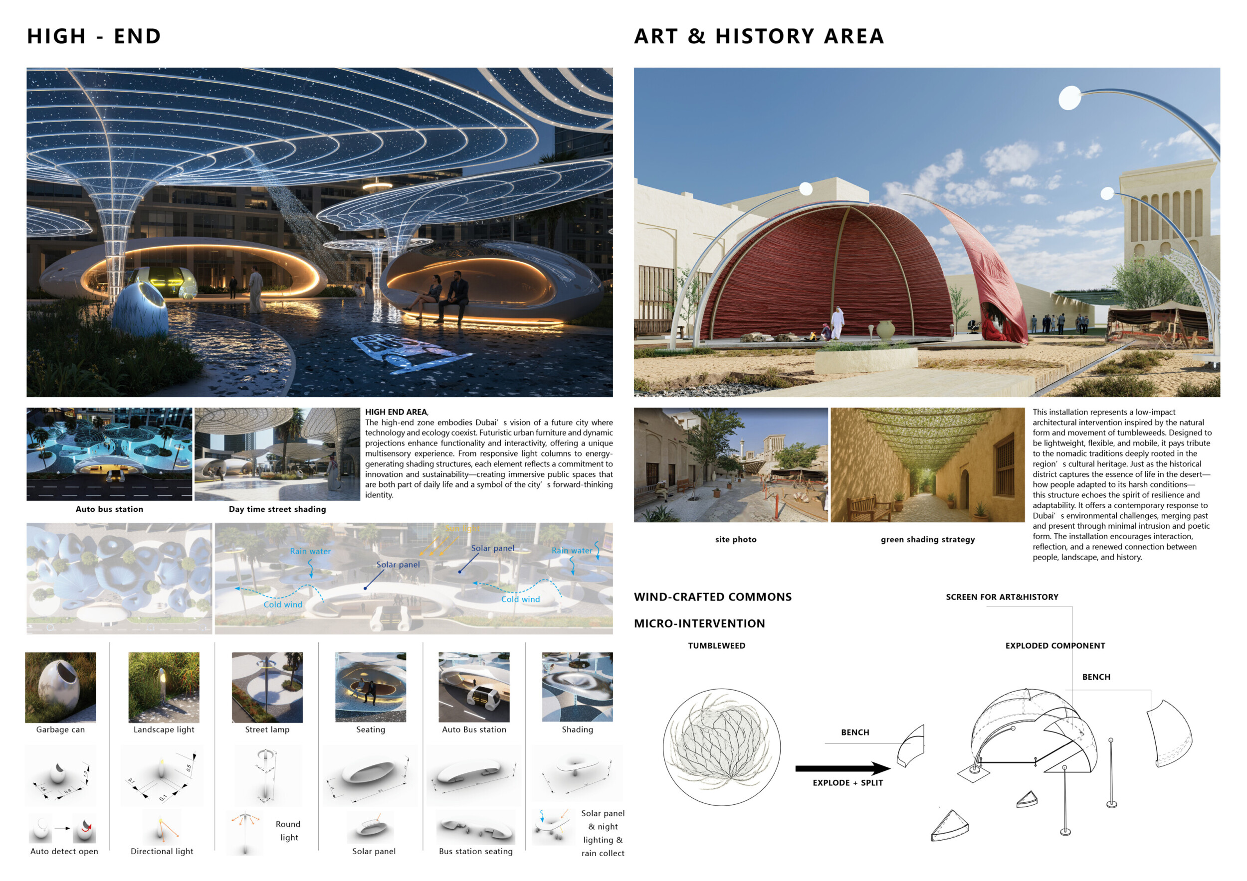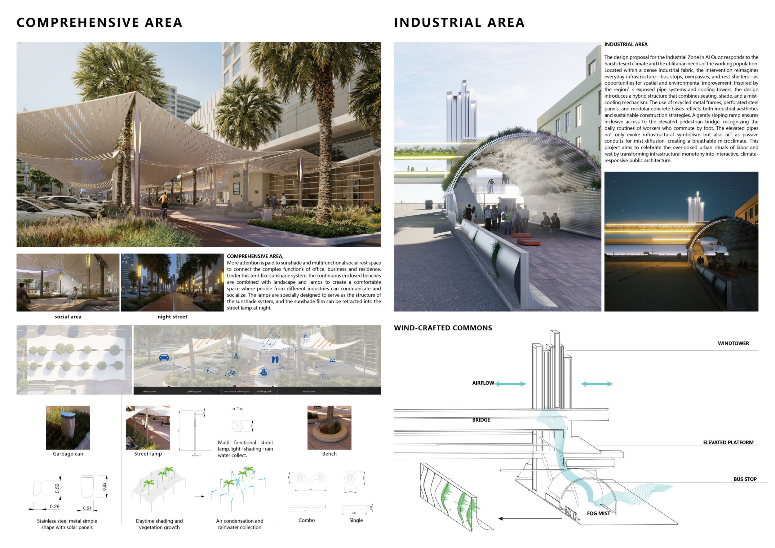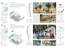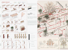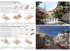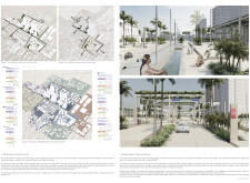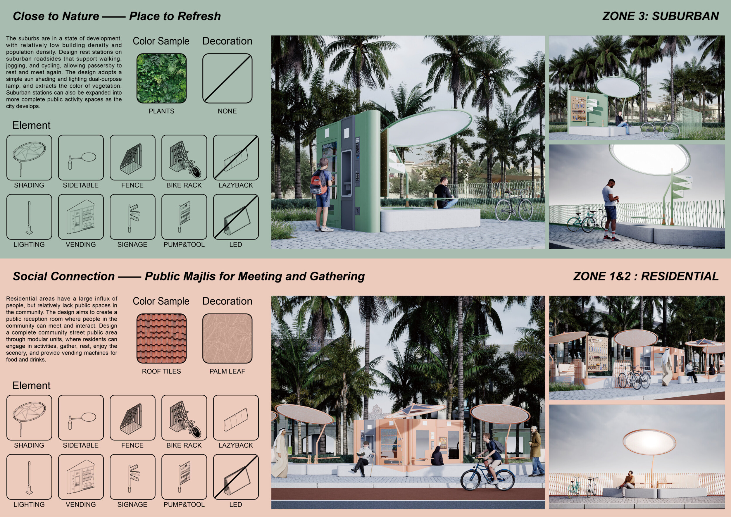 This proposal establishes a cohesive, city-wide design language for Dubai through a modular system of urban elements inspired by the native Ghaf tree. Abstractions of the tree’s leaves inform the geometry of seating, shading structures, lighting, and signage, offering a culturally grounded yet contemporary identity. The design operates at multiple scales, from street-level installations to district-wide coherence. Read more It introduces a curated library of modular elements deployed across eight defined urban zones, each adapted to local architectural and social contexts, from historical areas with rammed earth and warm tones to high-end districts with cool, sleek finishes. A single system accommodates contrasting needs: enhancing walkability, reducing solar exposure, and encouraging spontaneous community interaction. The intervention aligns material and color palettes with context-specific atmospheres while ensuring urban continuity.