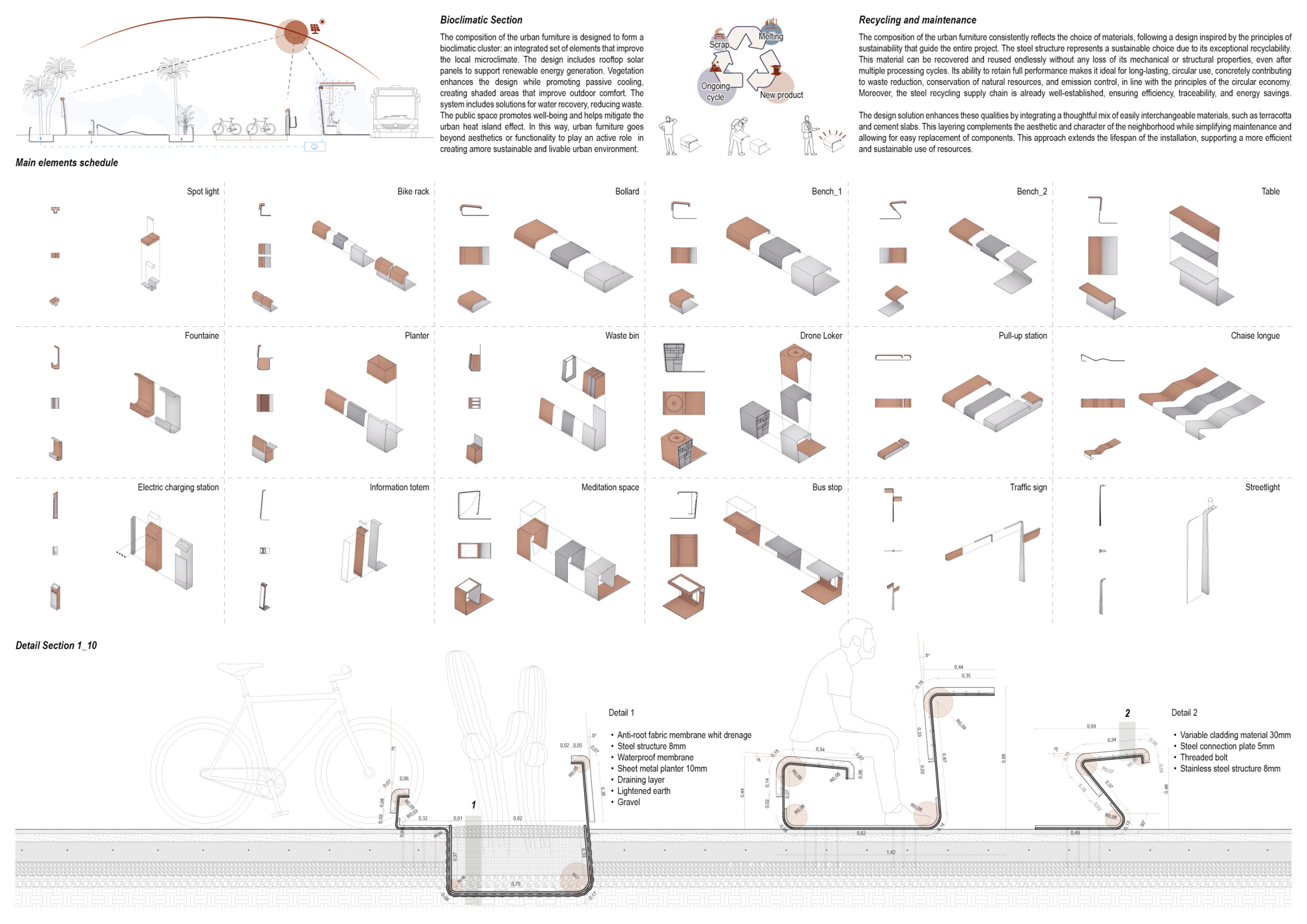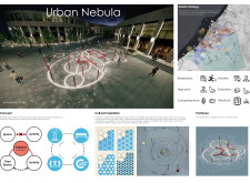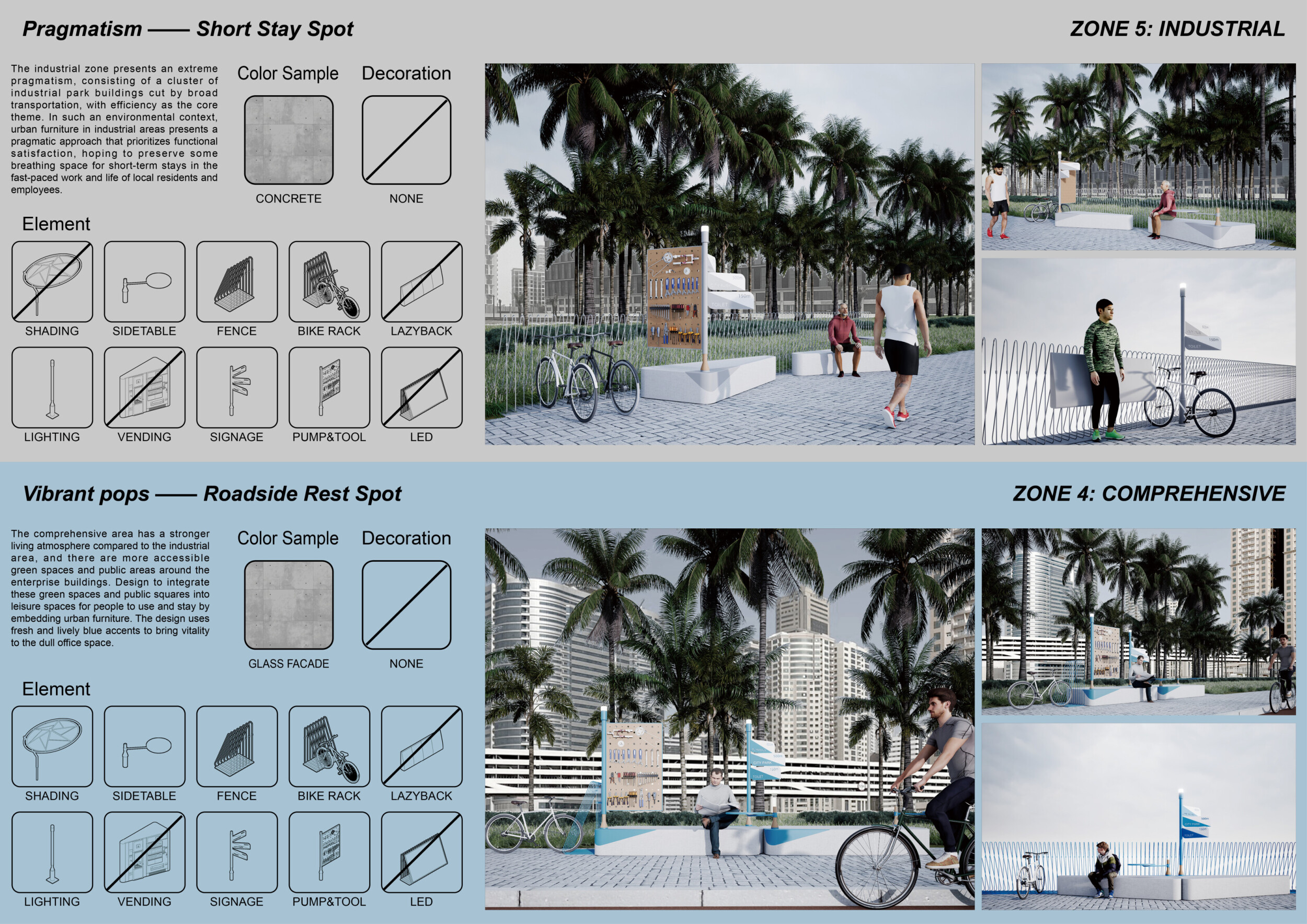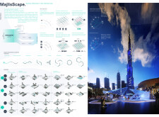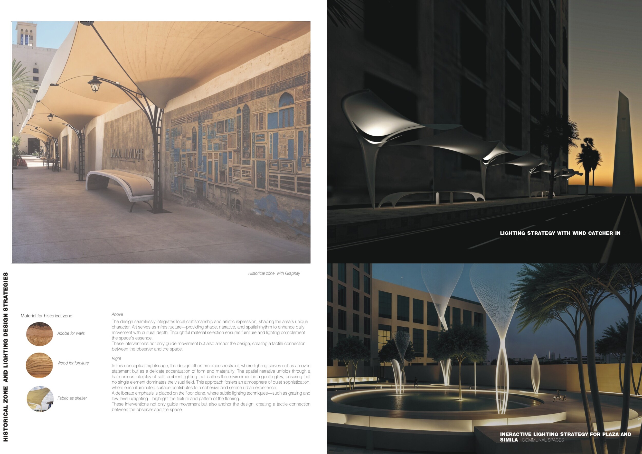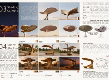 This proposal establishes a cohesive, city-wide design language for Dubai through a modular system of urban elements inspired by the native Ghaf tree. Abstractions of the tree’s leaves inform the geometry of seating, shading structures, lighting, and signage, offering a culturally grounded yet contemporary identity. The design operates at multiple scales, from street-level installations to district-wide coherence. Read more It introduces a curated library of modular elements deployed across eight defined urban zones, each adapted to local architectural and social contexts, from historical areas with rammed earth and warm tones to high-end districts with cool, sleek finishes. A single system accommodates contrasting needs: enhancing walkability, reducing solar exposure, and encouraging spontaneous community interaction. The intervention aligns material and color palettes with context-specific atmospheres while ensuring urban continuity.