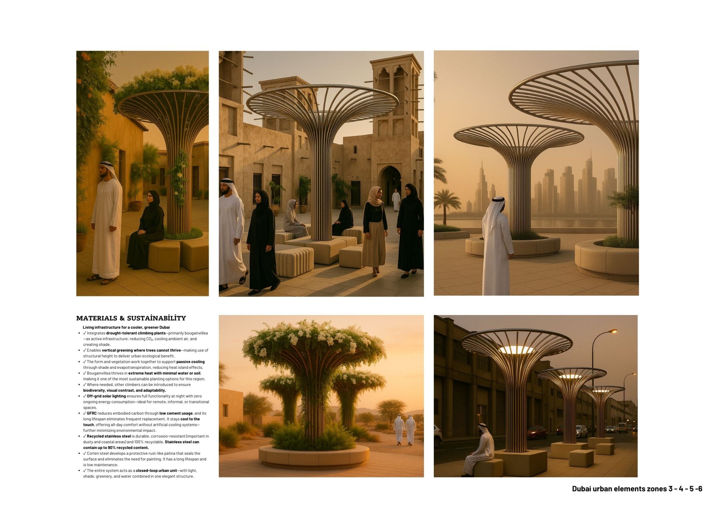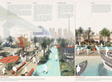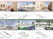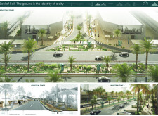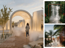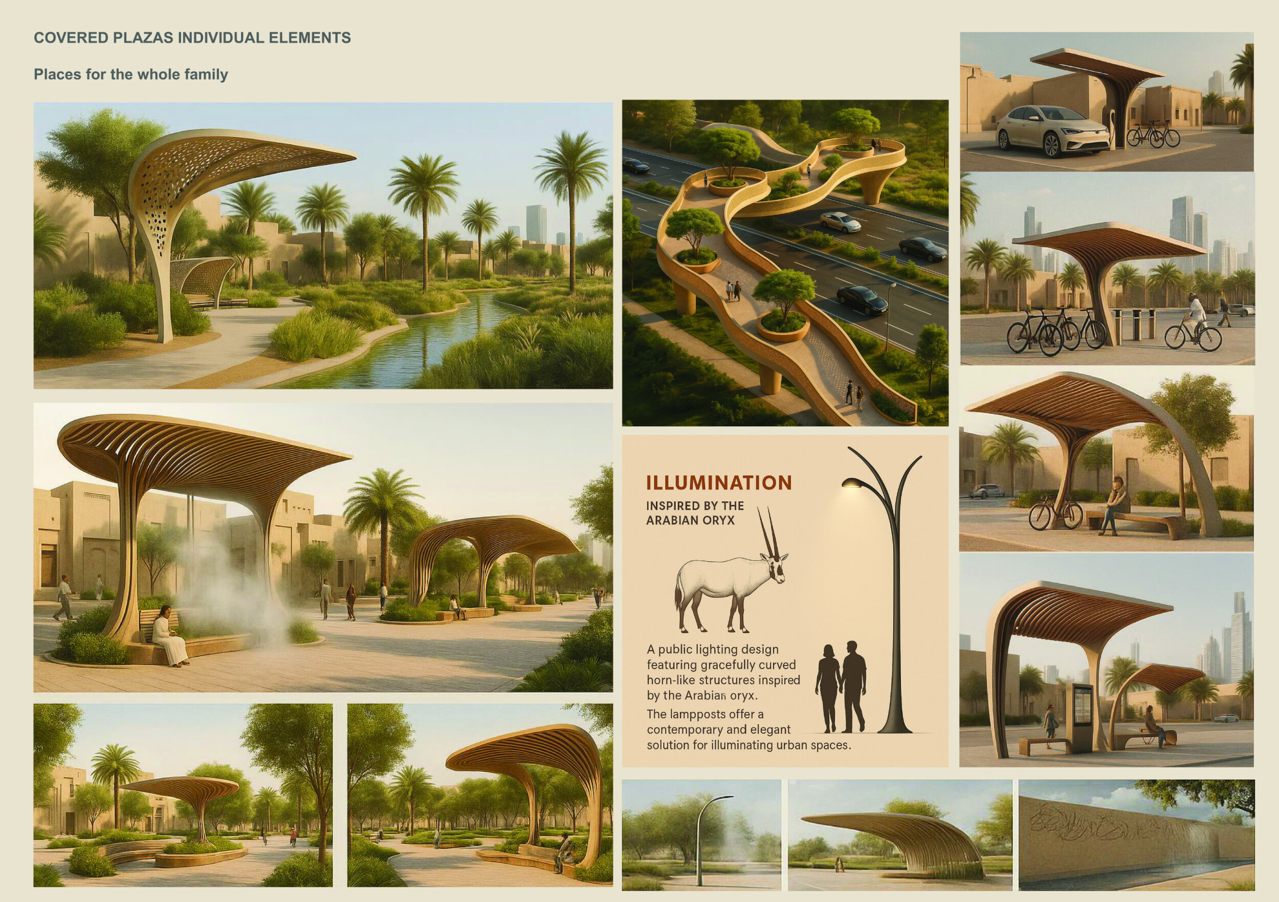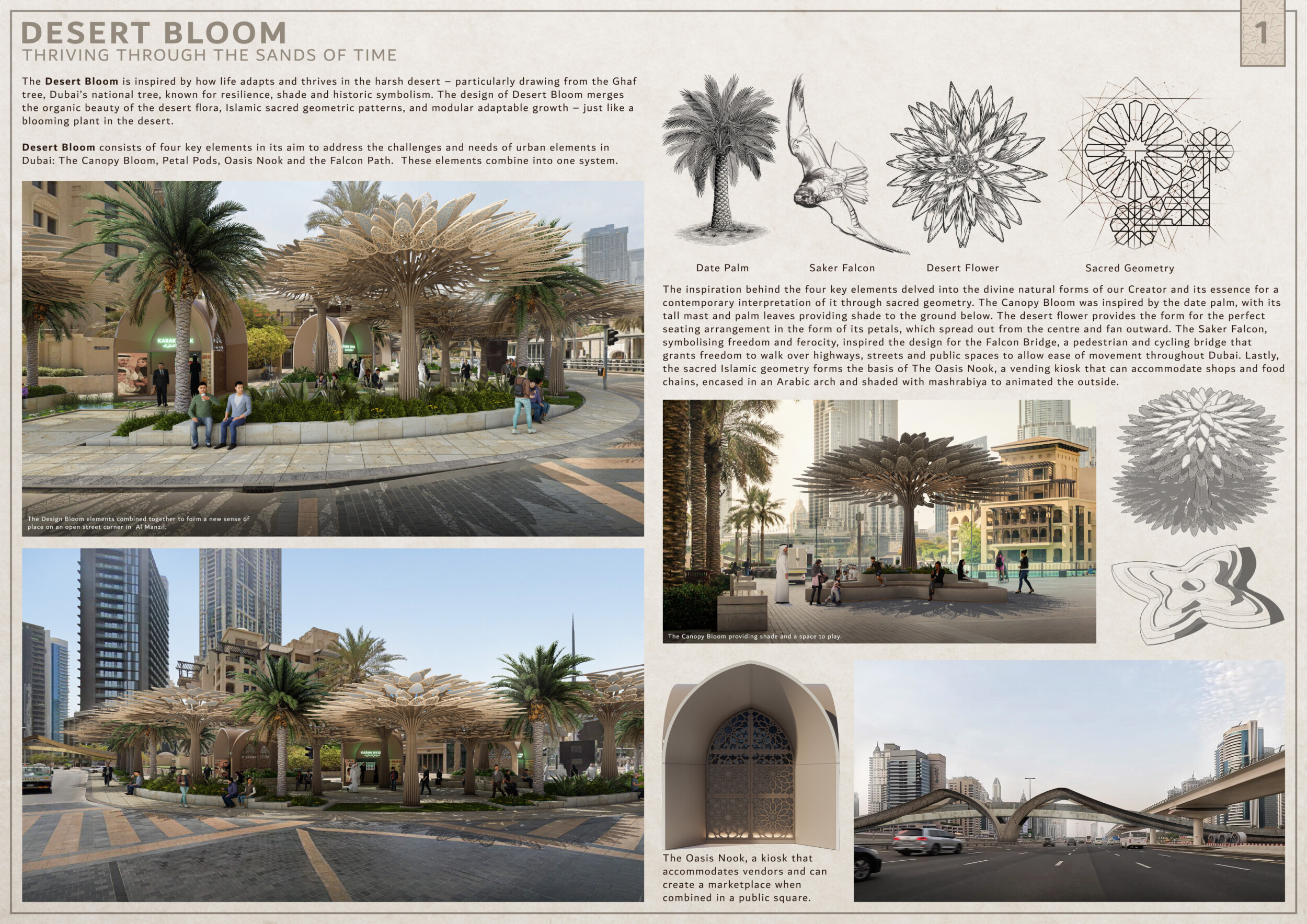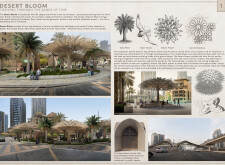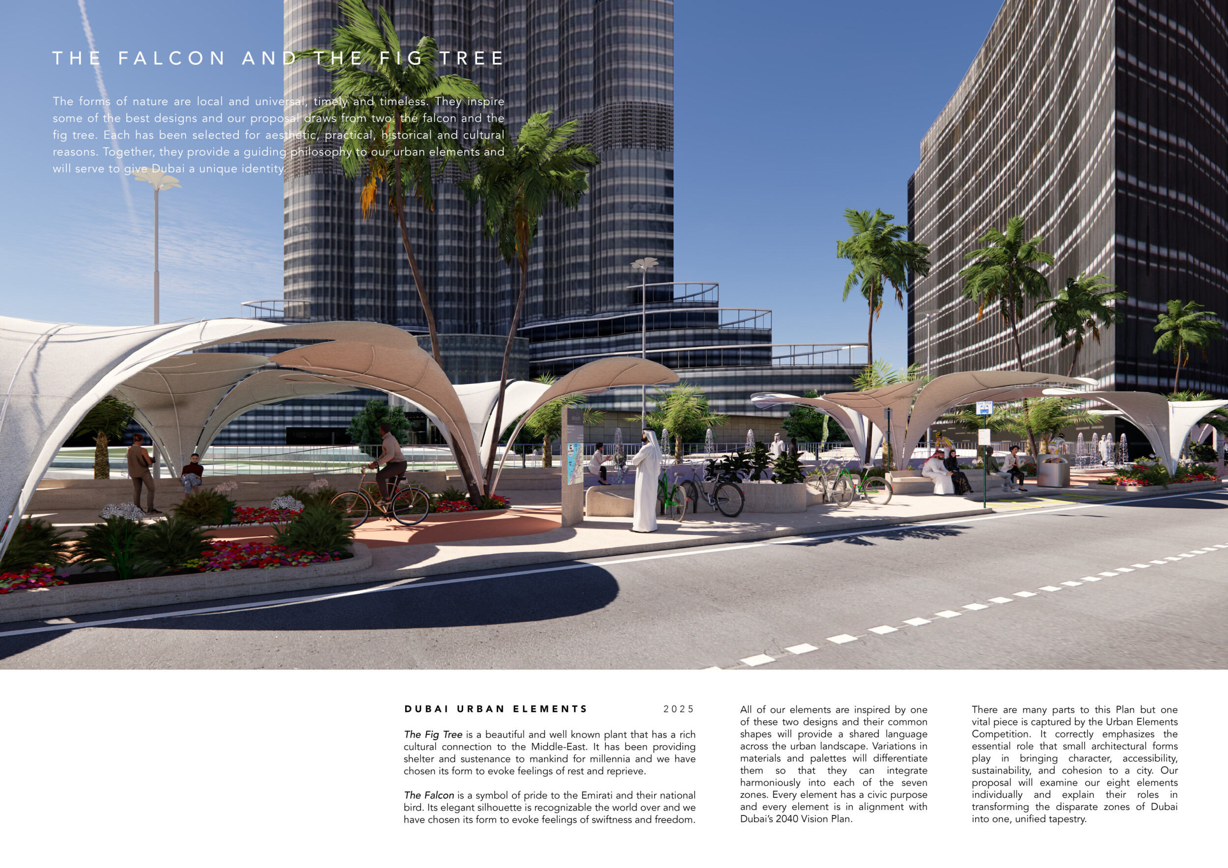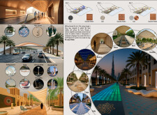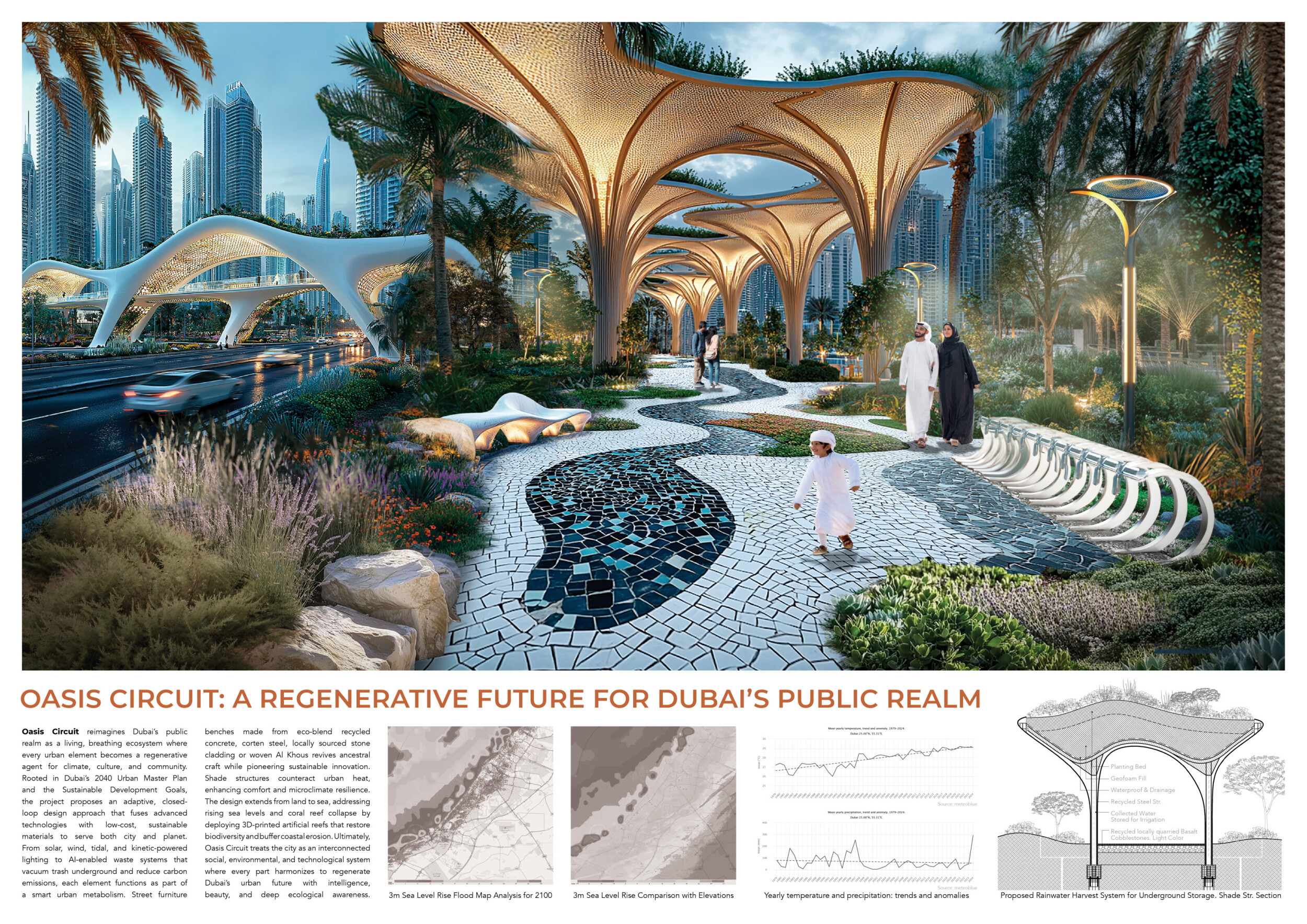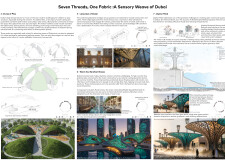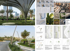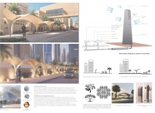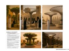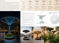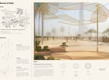 Rooted in symbols that narrate Dubai’s past, present, and future, this proposal articulates and represents that symbolism in astonishing detail within each urban element. The project is truly captivating, utilizing principles of biomimicry in its aesthetics while remaining functional and sustainable through the materials and strategies adopted to provide shade and recycle water.