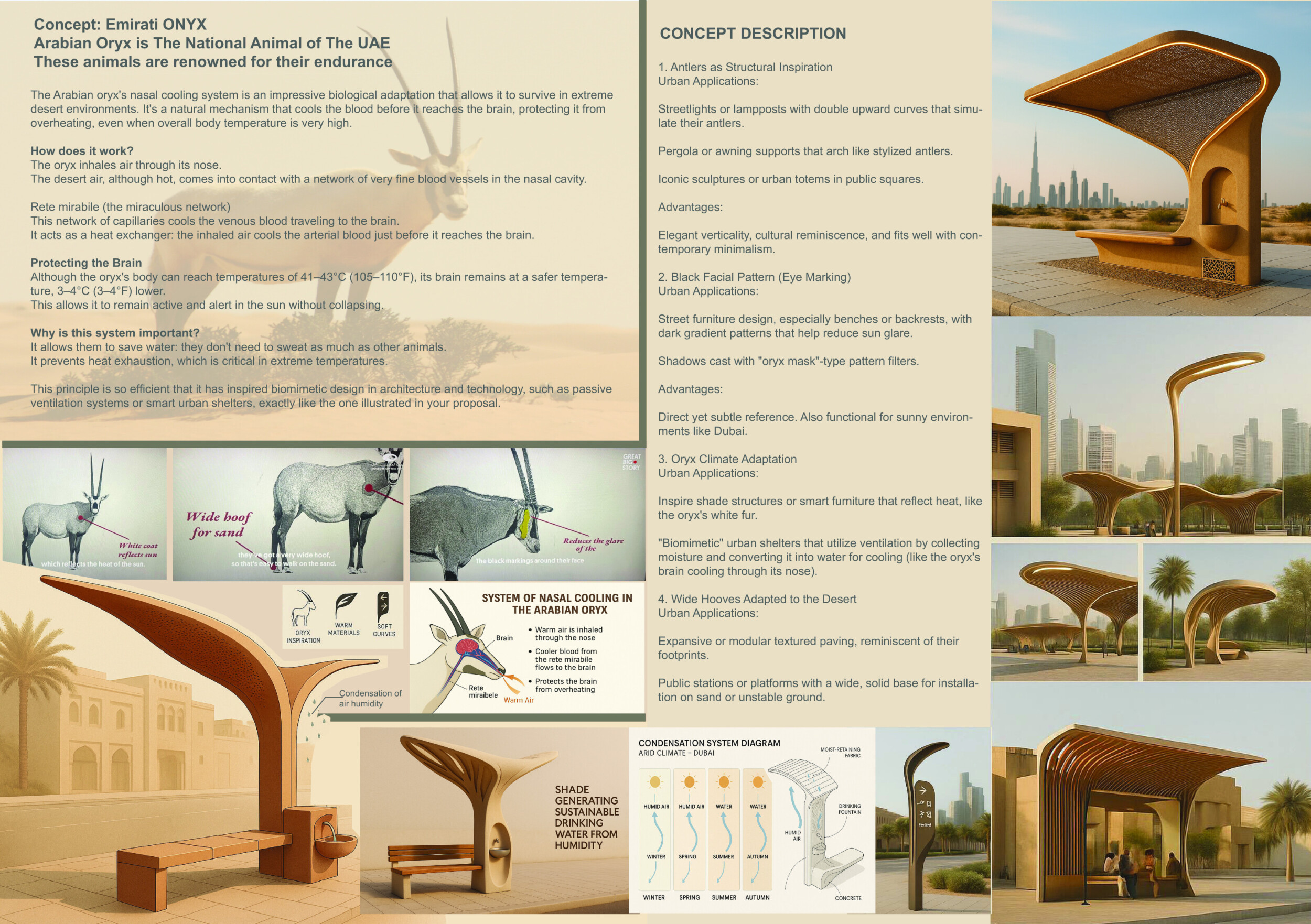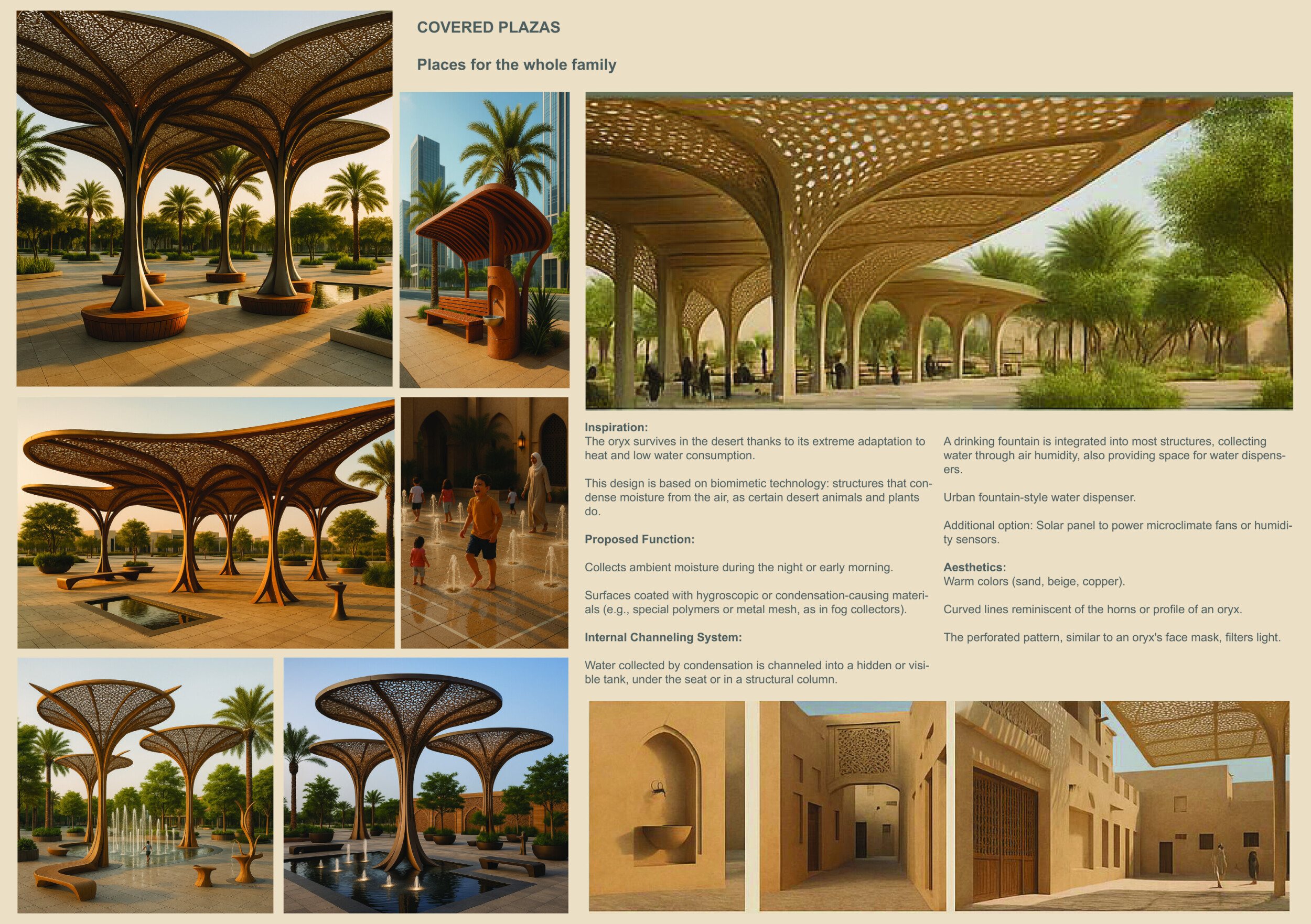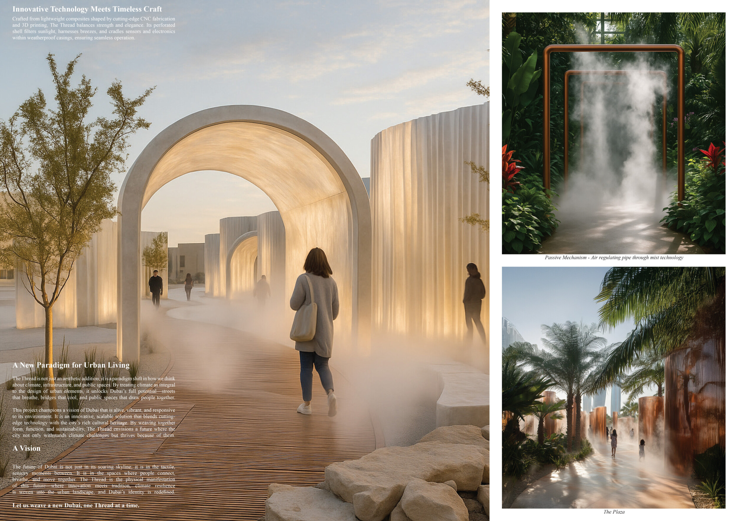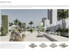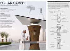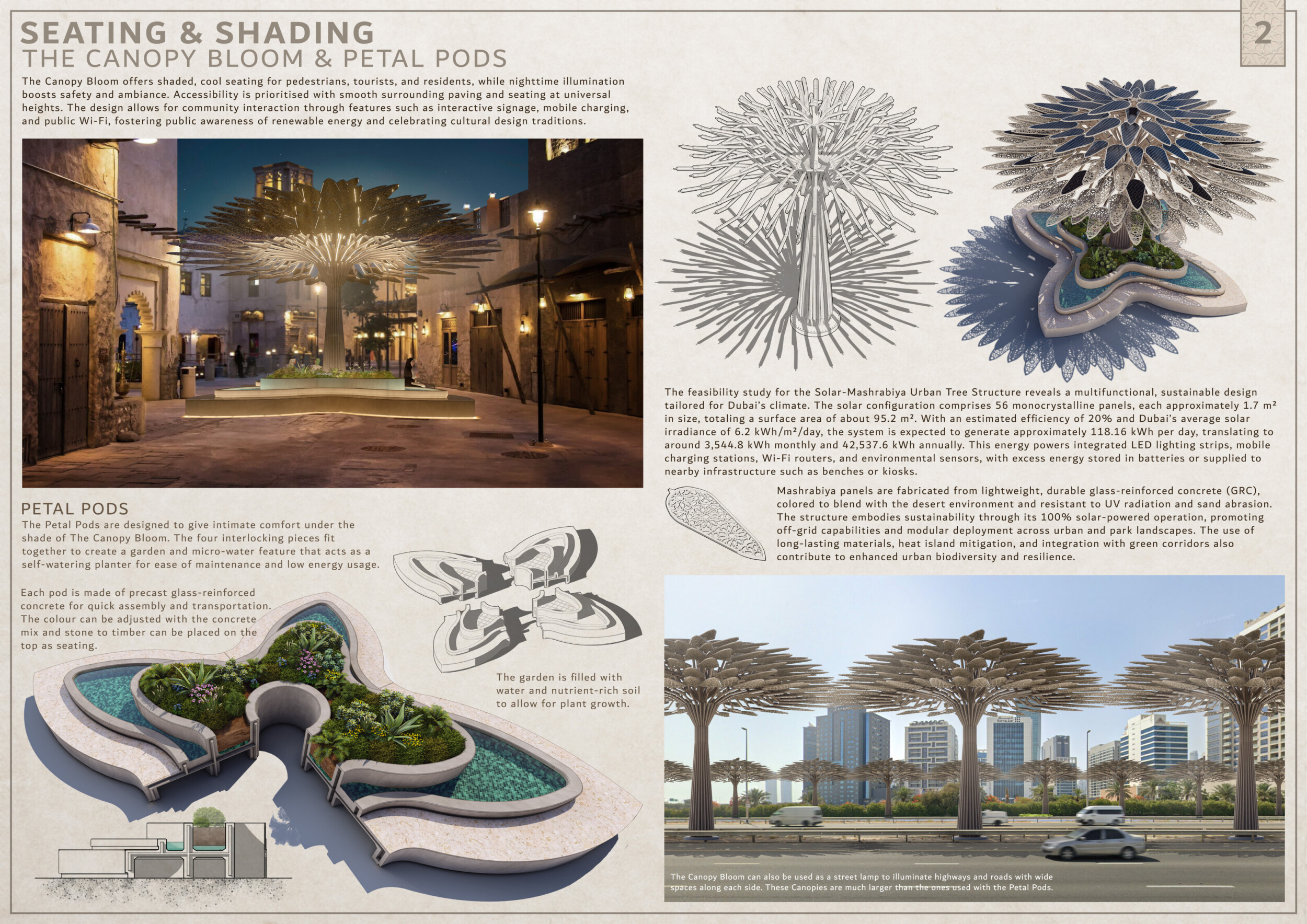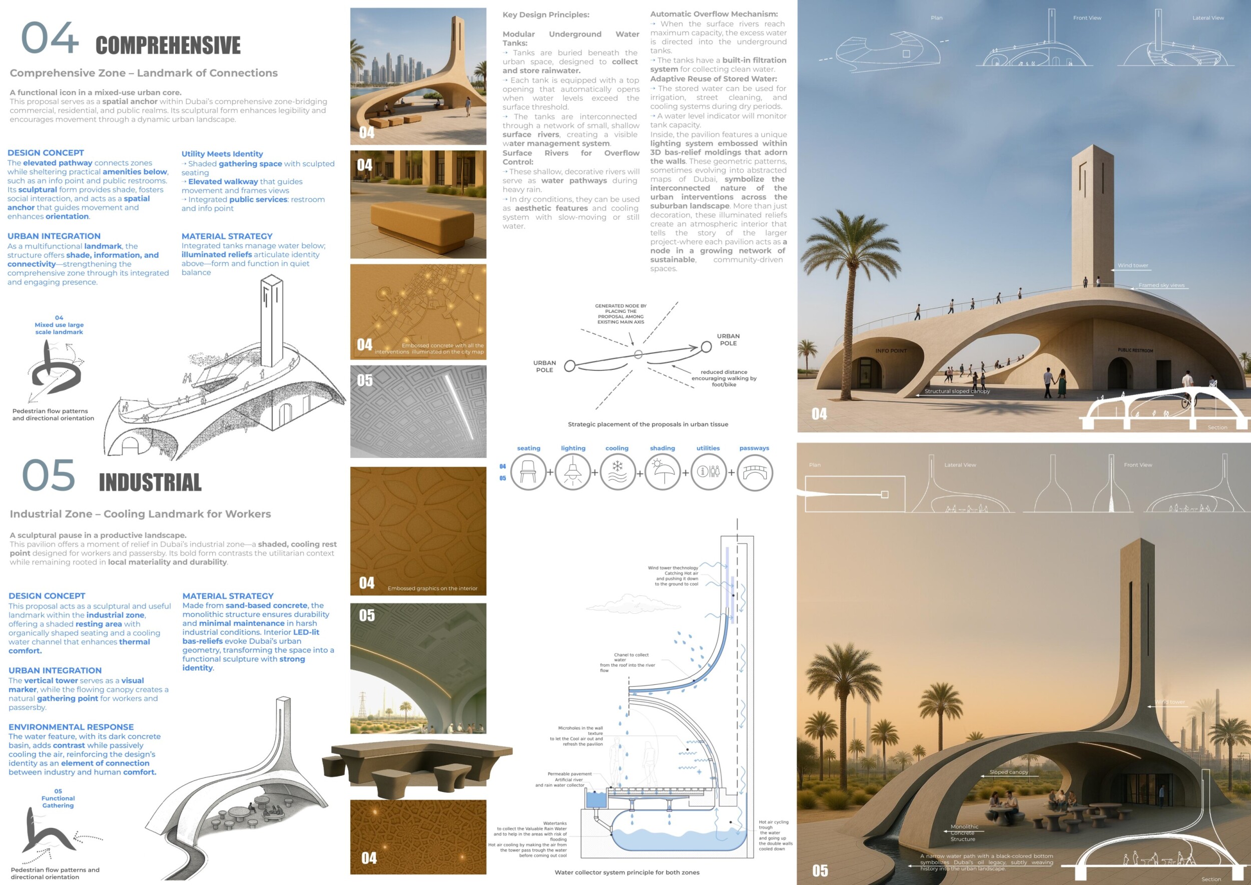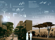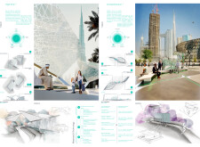 Rooted in symbols that narrate Dubai’s past, present, and future, this proposal articulates and represents that symbolism in astonishing detail within each urban element. The project is truly captivating, utilizing principles of biomimicry in its aesthetics while remaining functional and sustainable through the materials and strategies adopted to provide shade and recycle water.