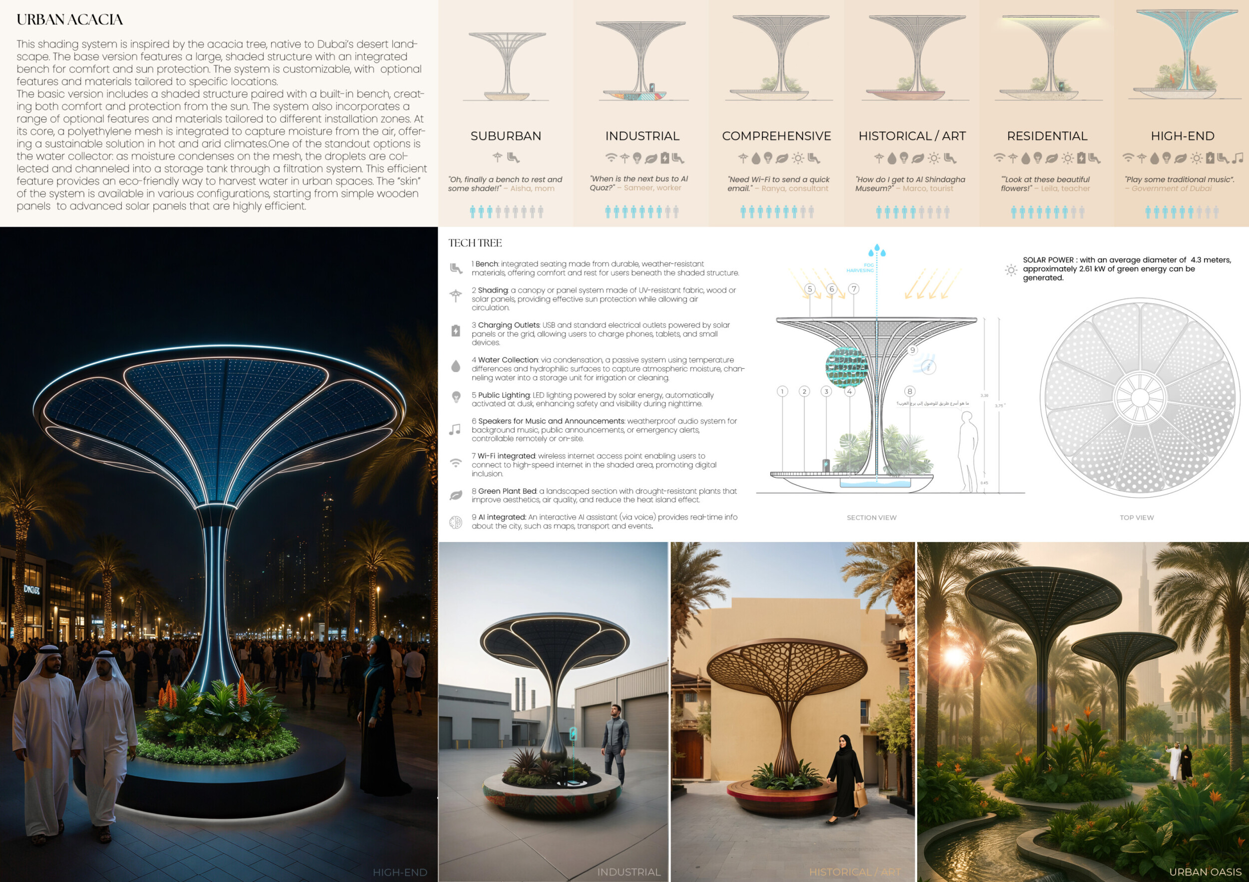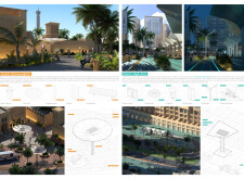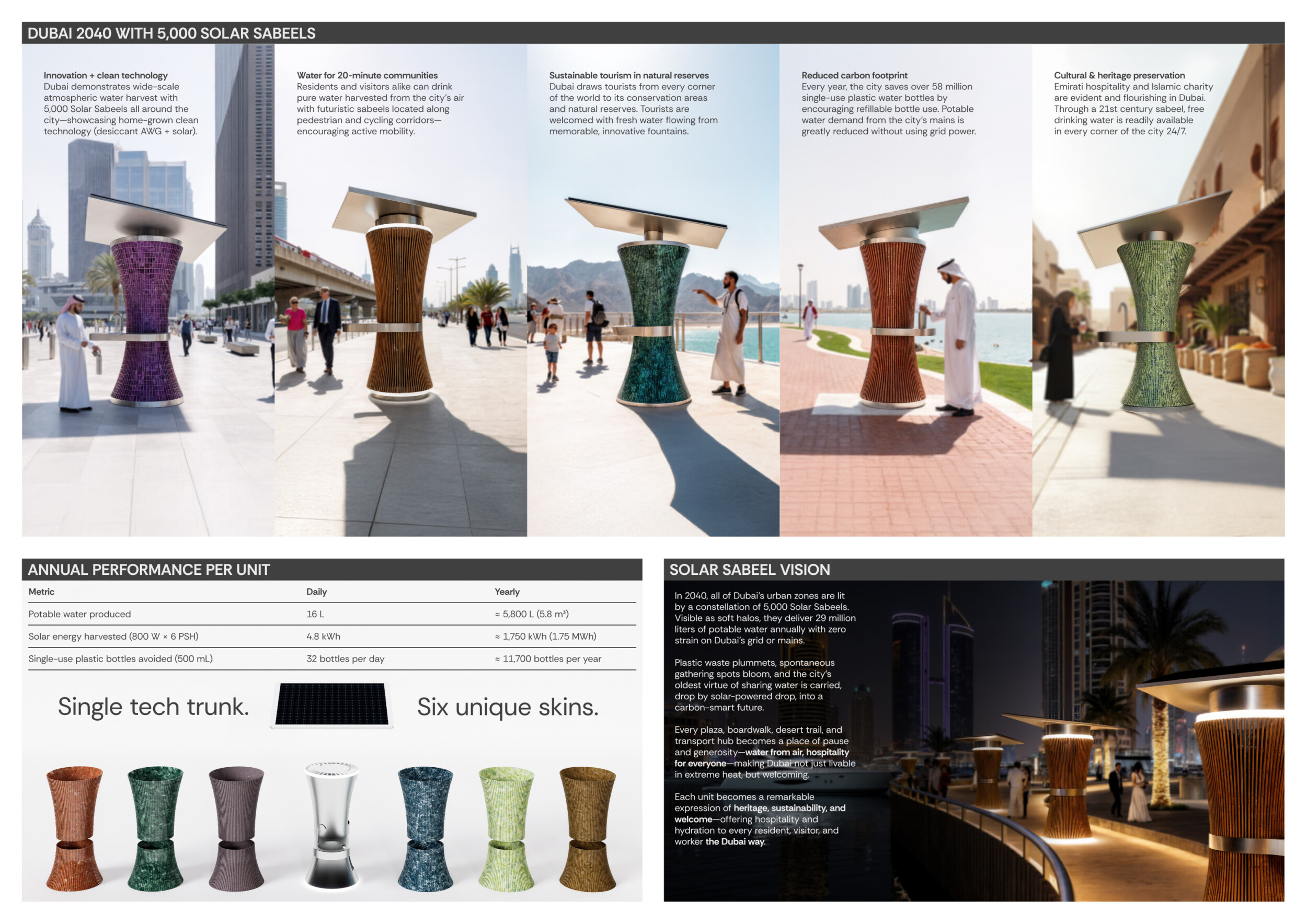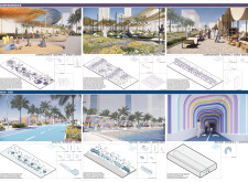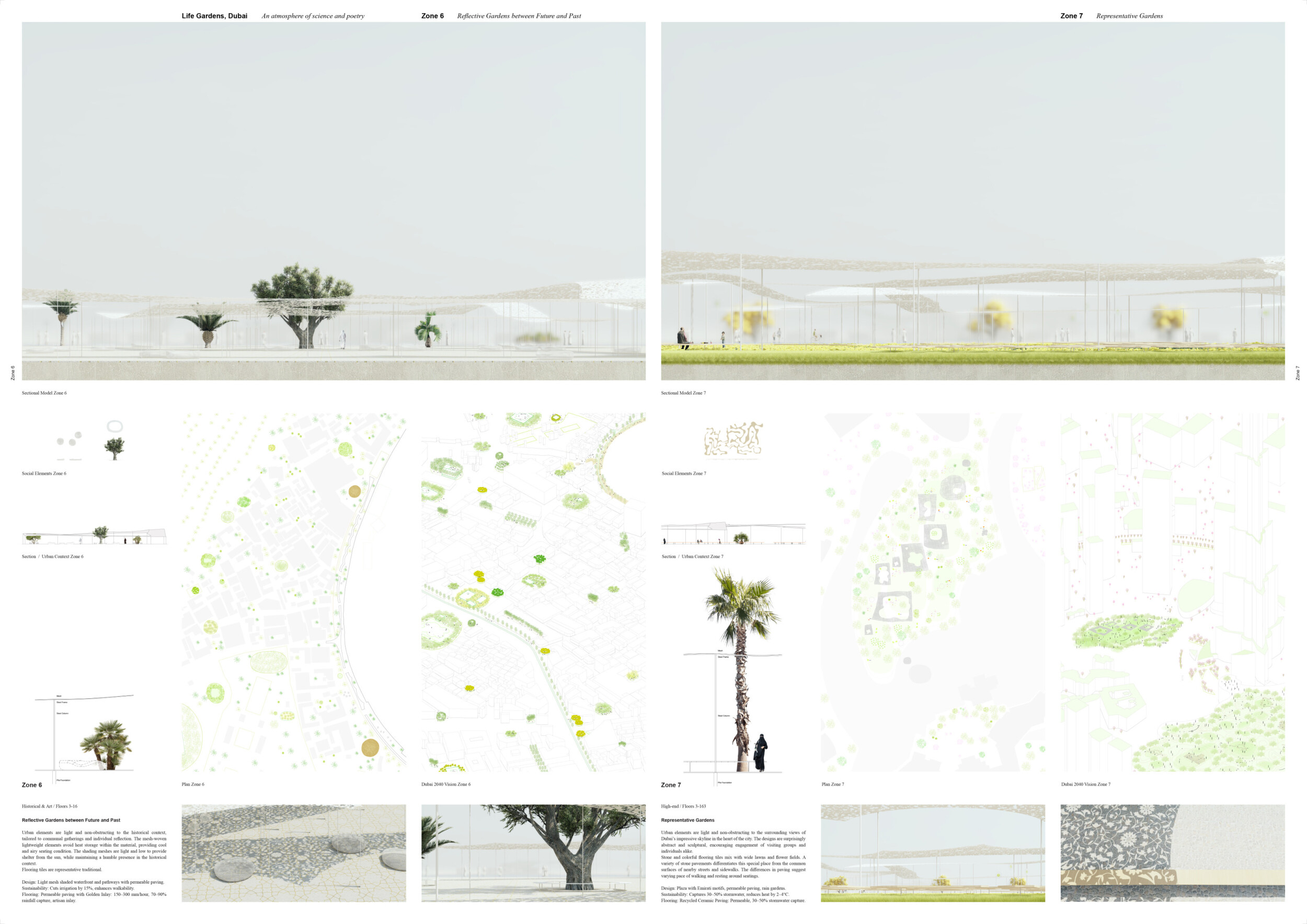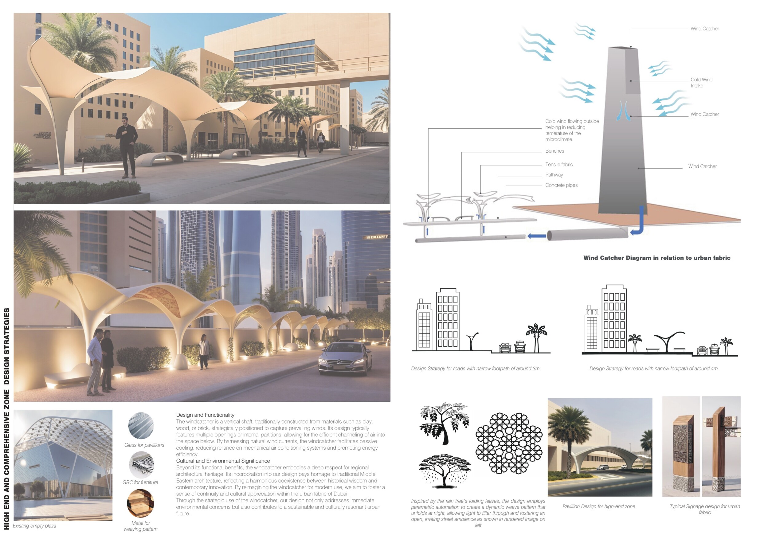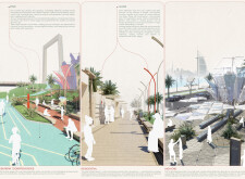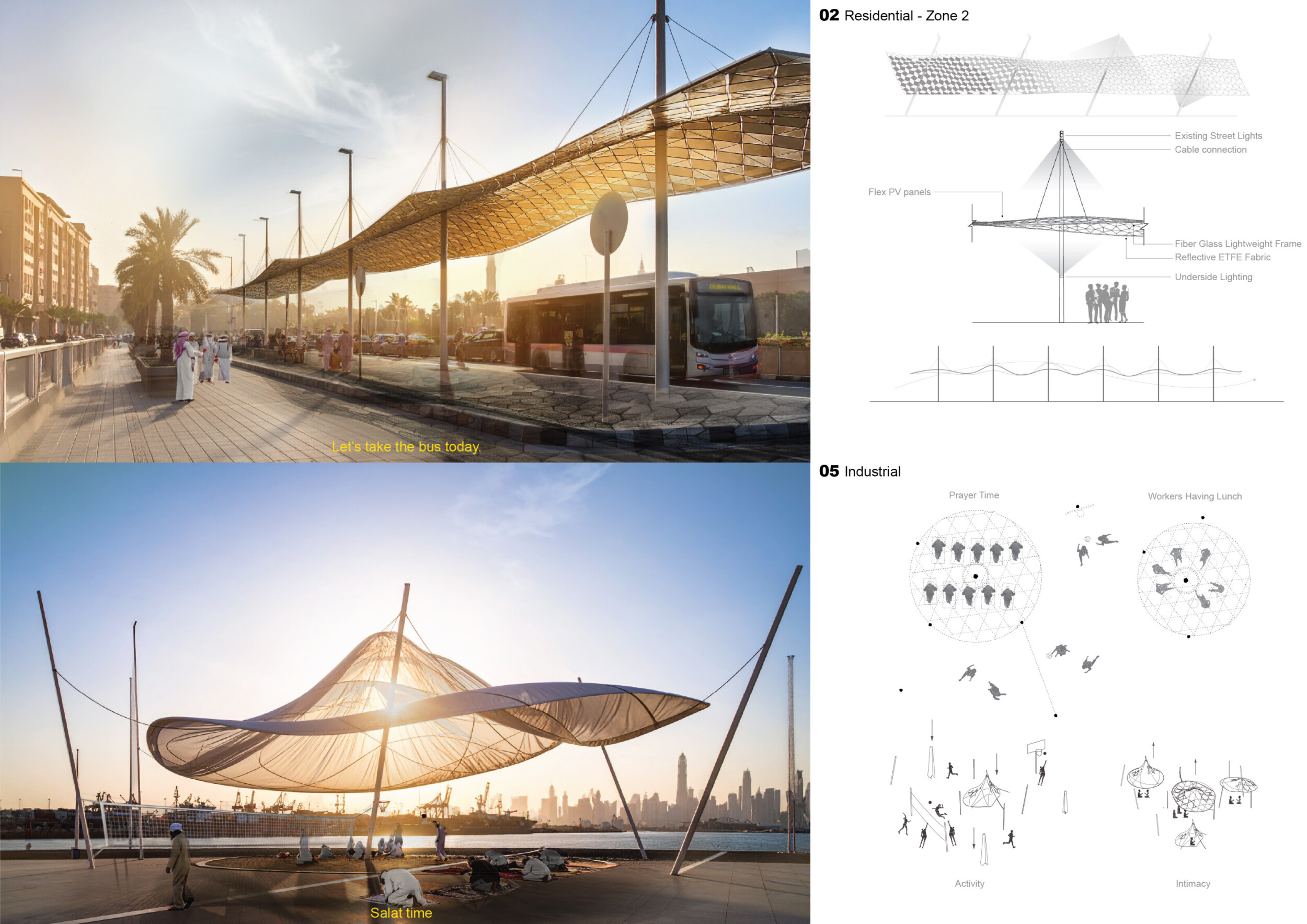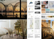 Rooted in symbols that narrate Dubai’s past, present, and future, this proposal articulates and represents that symbolism in astonishing detail within each urban element. The project is truly captivating, utilizing principles of biomimicry in its aesthetics while remaining functional and sustainable through the materials and strategies adopted to provide shade and recycle water.