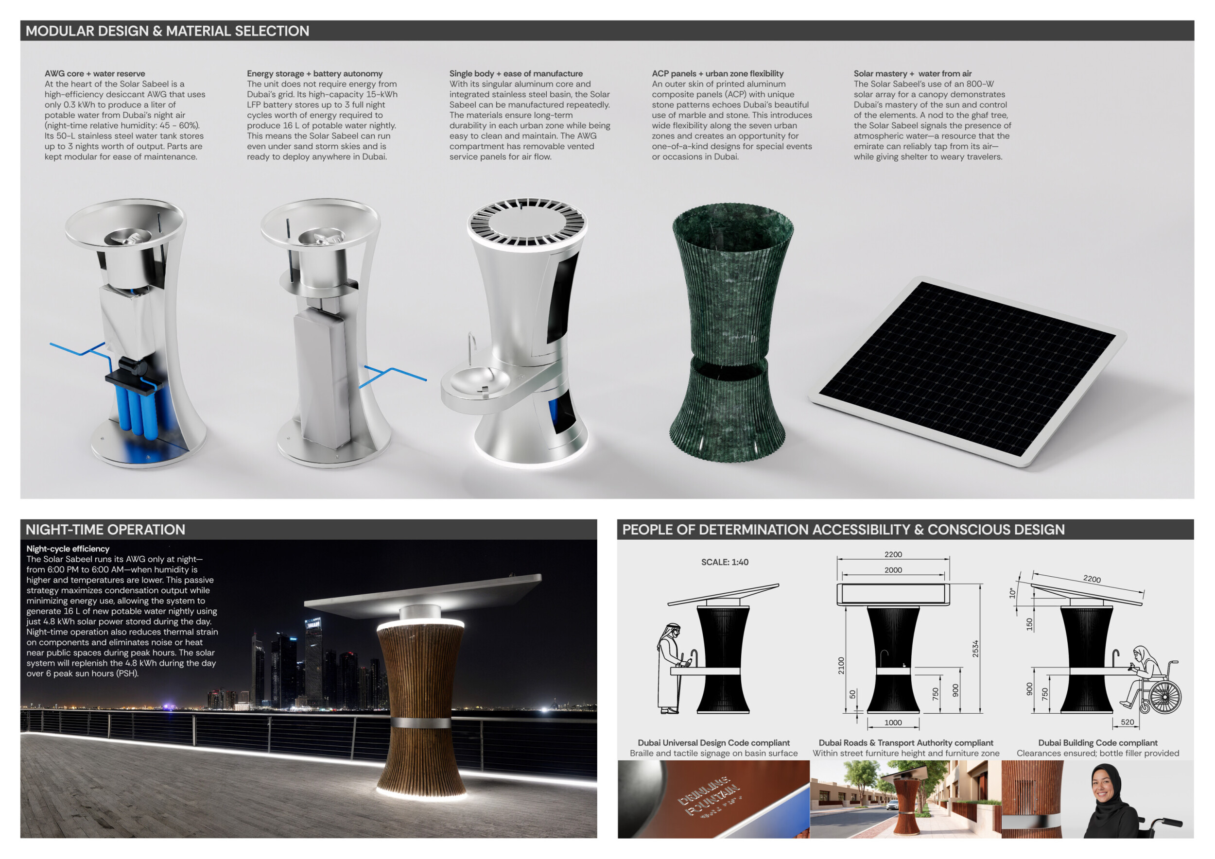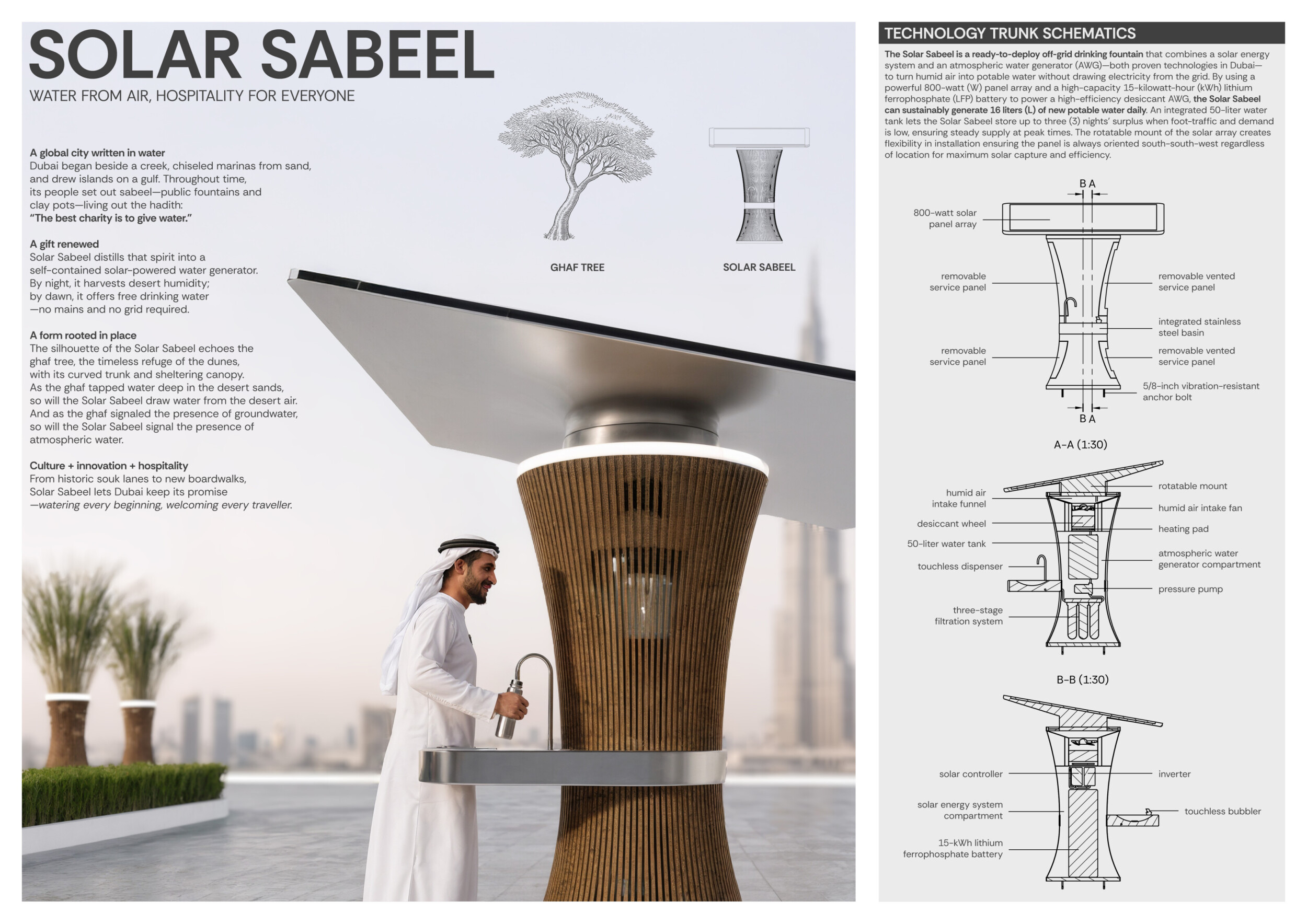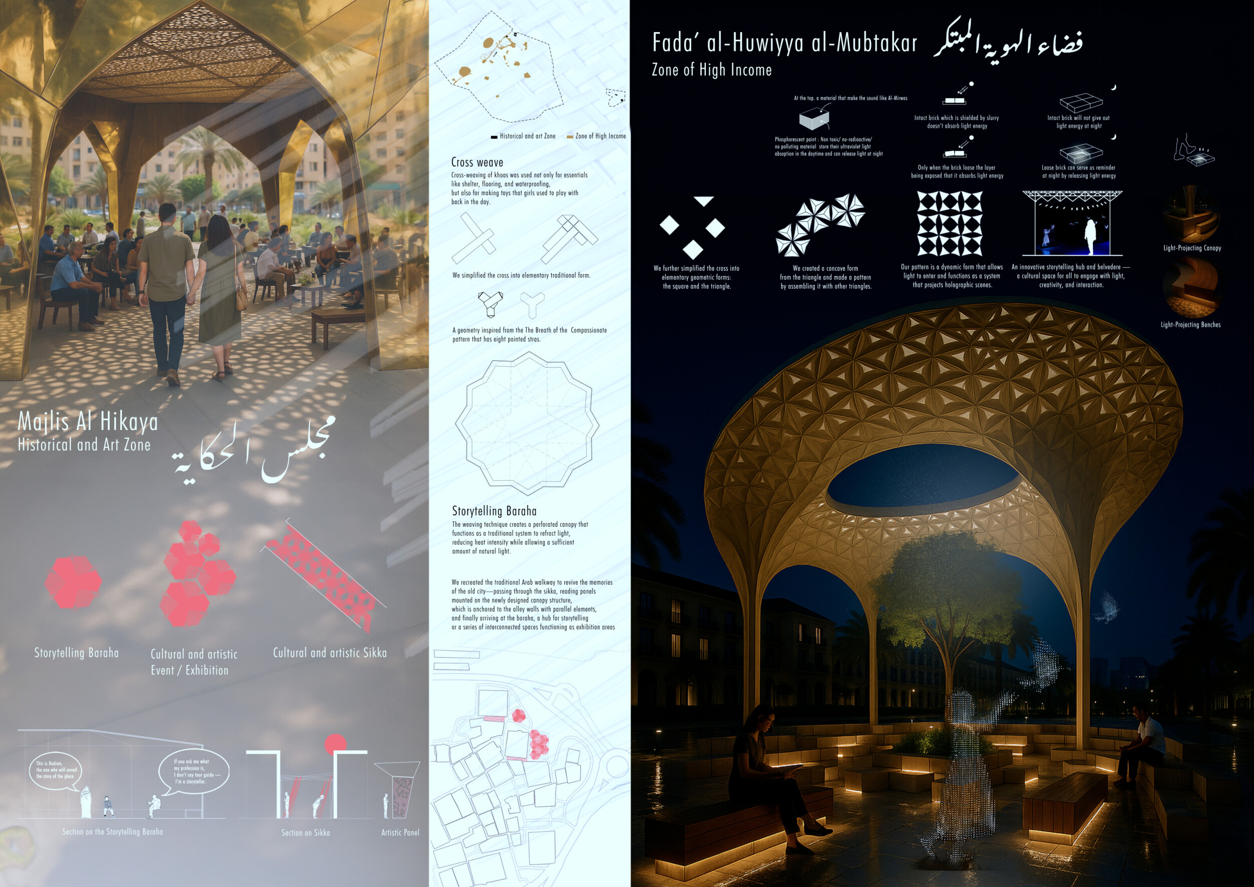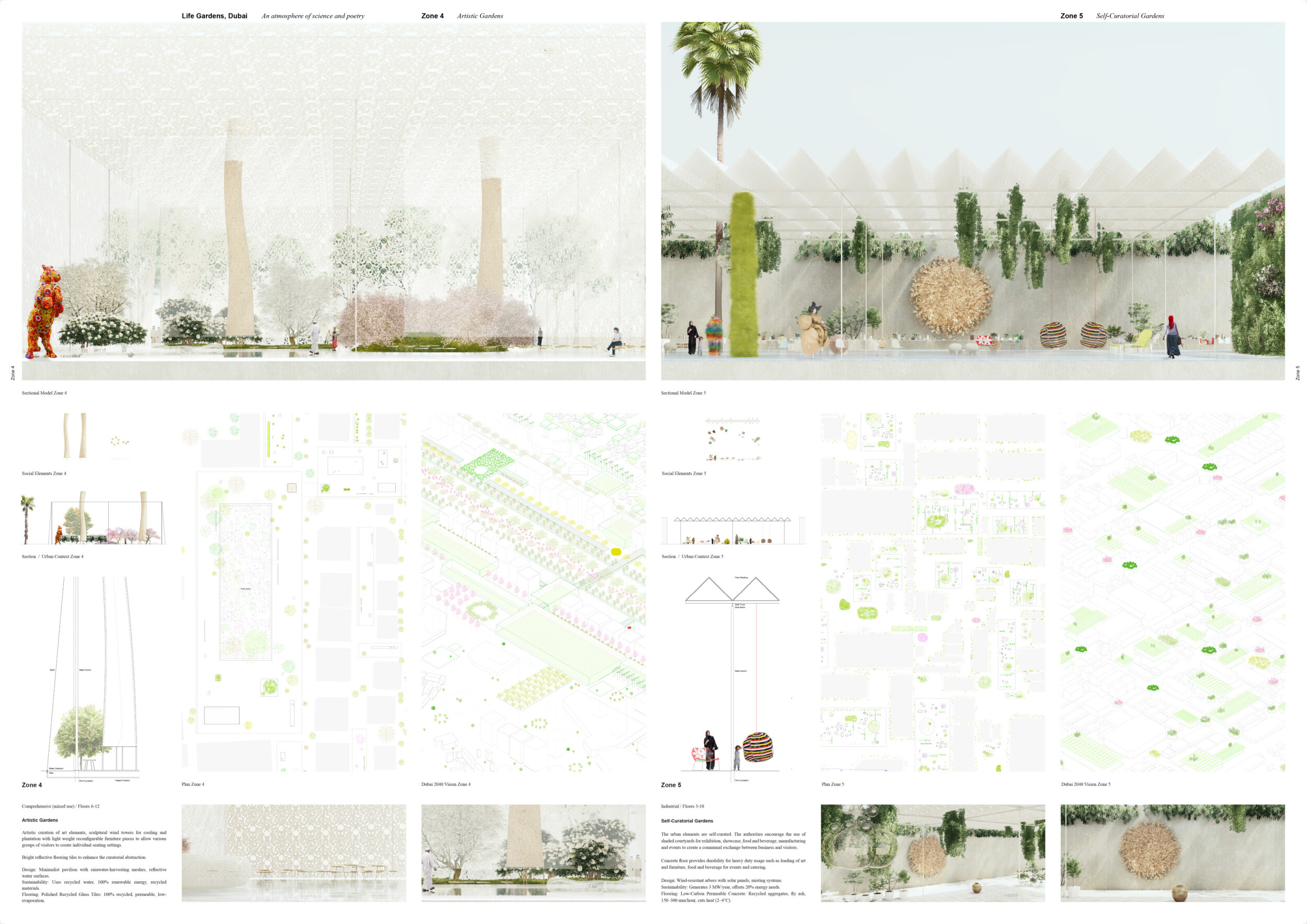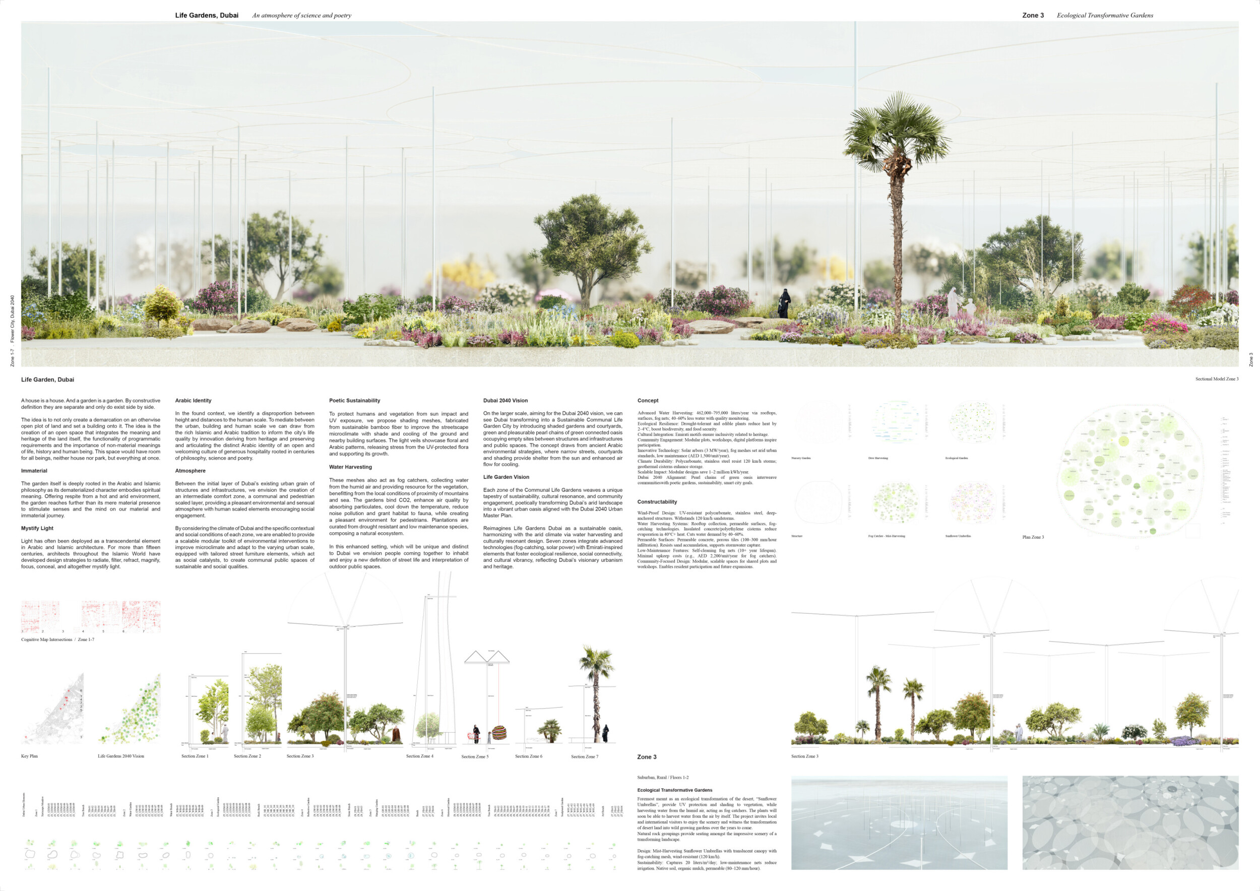 Rooted in symbols that narrate Dubai’s past, present, and future, this proposal articulates and represents that symbolism in astonishing detail within each urban element. The project is truly captivating, utilizing principles of biomimicry in its aesthetics while remaining functional and sustainable through the materials and strategies adopted to provide shade and recycle water.