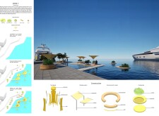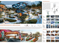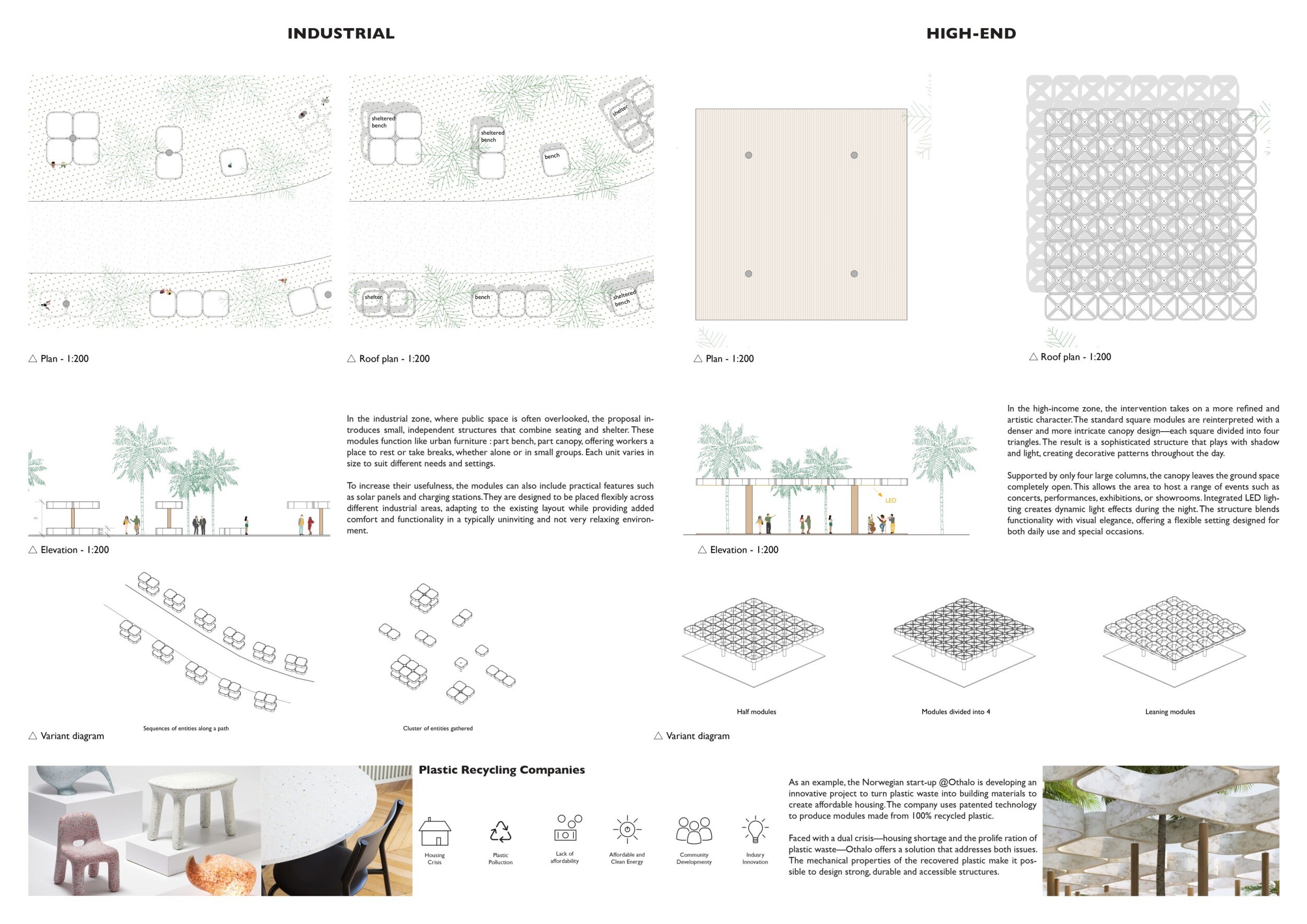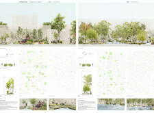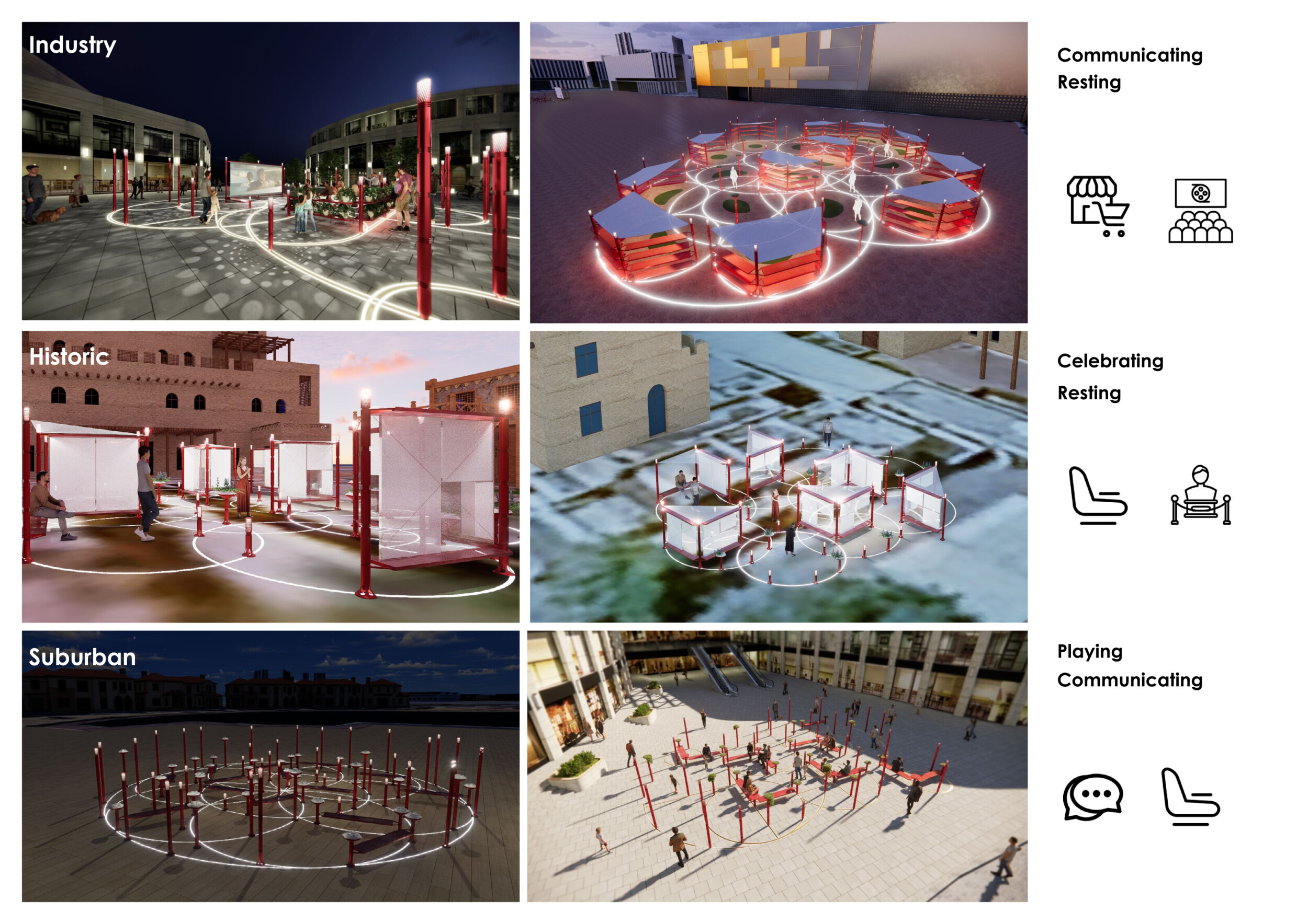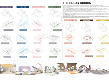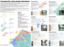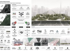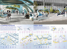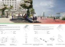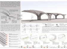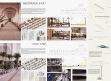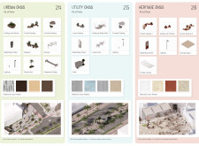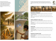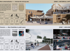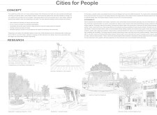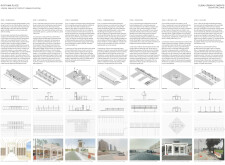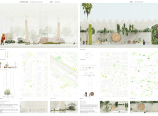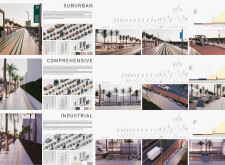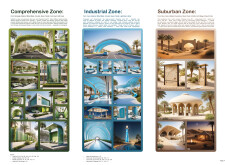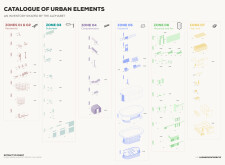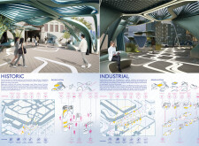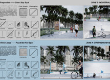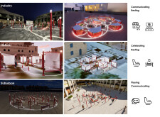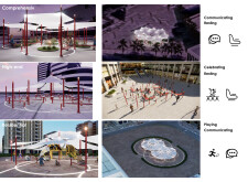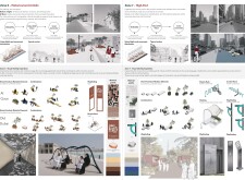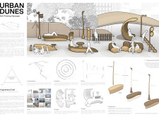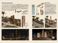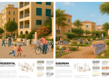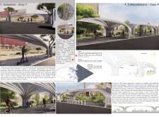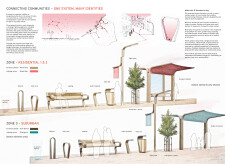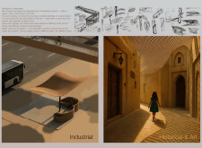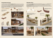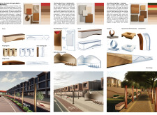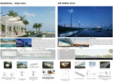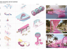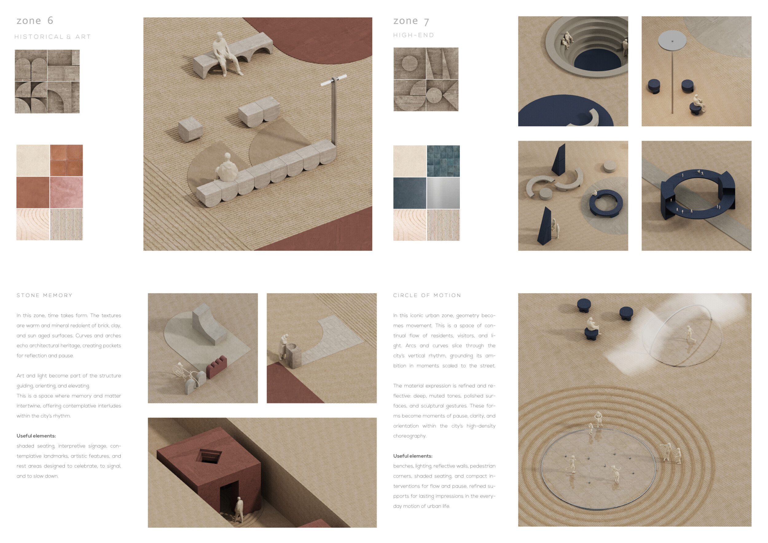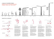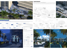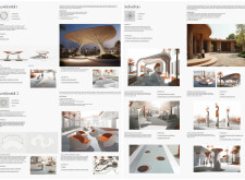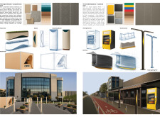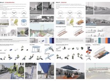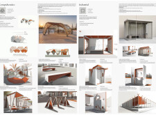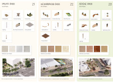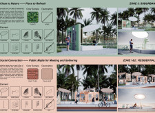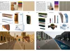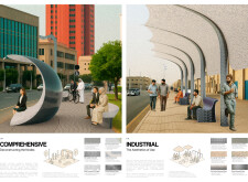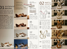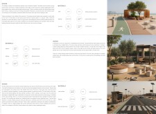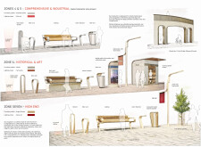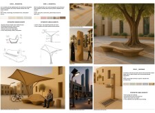 This proposal establishes a modular, scalable urban furniture system rooted in abstraction and symbolism. Drawing on the geometry and textures of local architecture, the design introduces a refined material and formal language across seven urban zones, each tailored to a specific context—from residential to industrial and high-end areas. The result is a coherent and calm spatial identity, where curved and rectilinear elements shape micro-interventions for pause, gathering, or flow. Read more The project's strength lies in its graphic elegance, unified design grammar, and sensitivity to transition, rhythm, and proportion. However, despite its clarity, the system occasionally feels detached from site specificity and cultural particularity, relying more on formal consistency than contextual immersion.