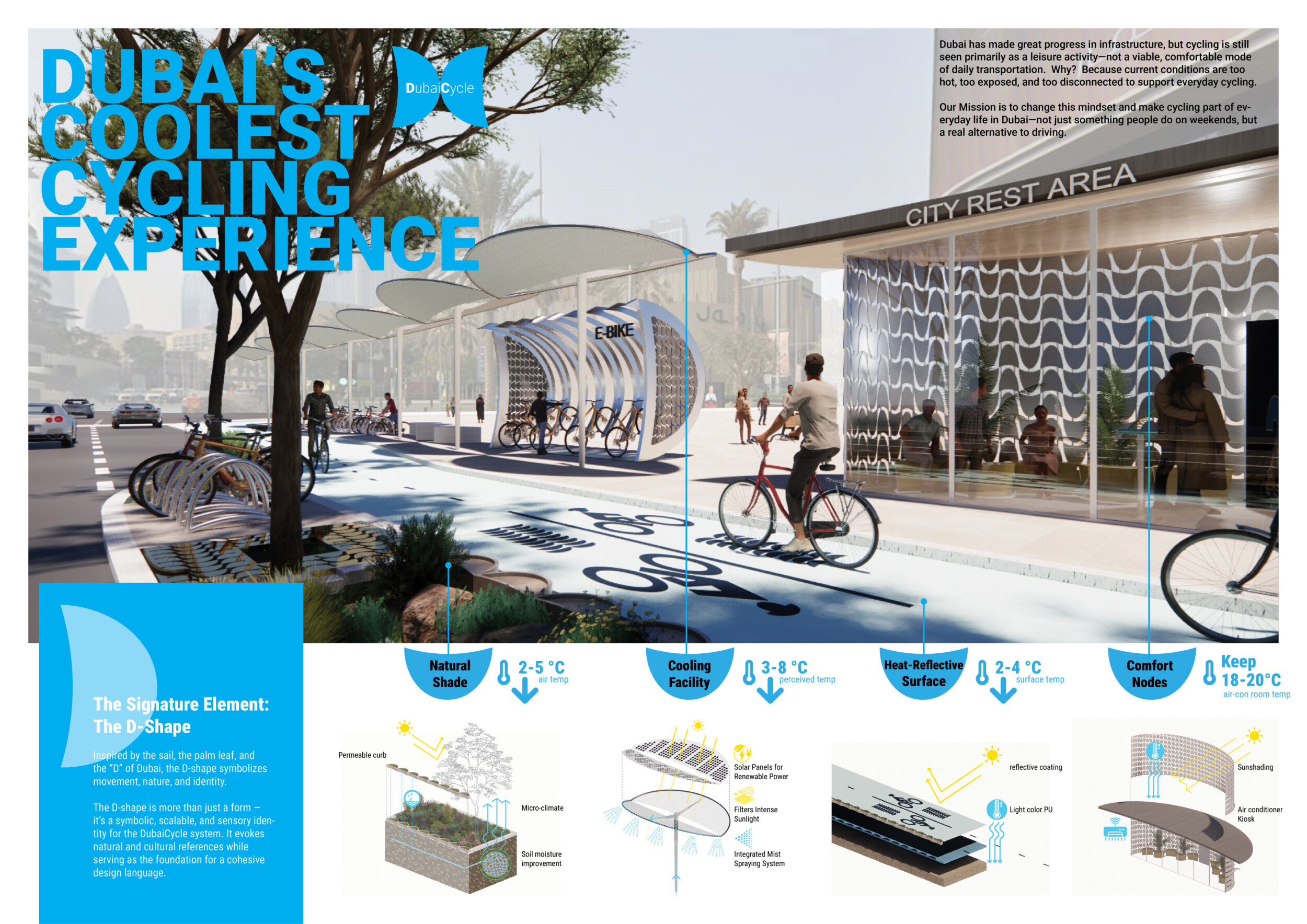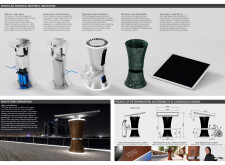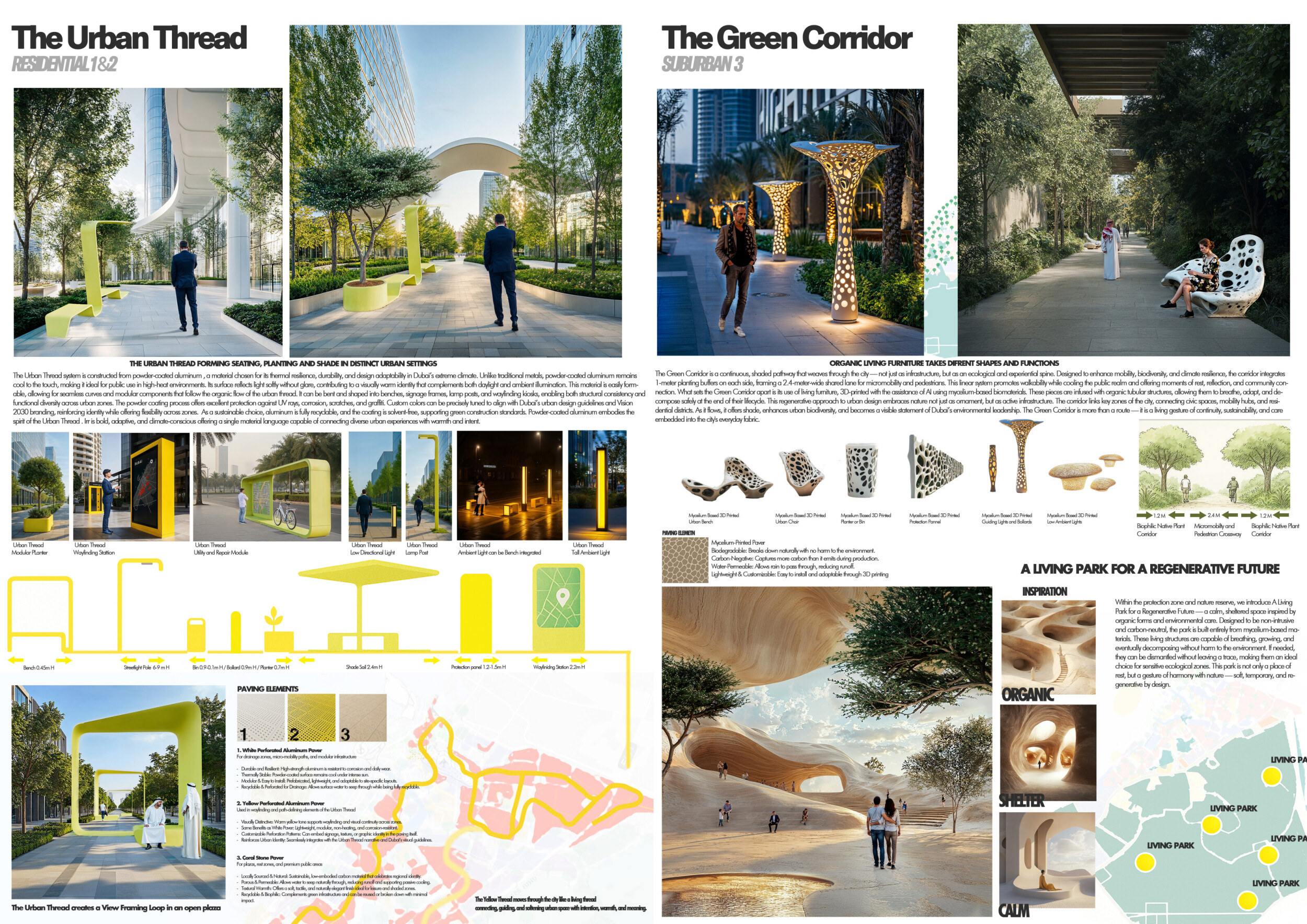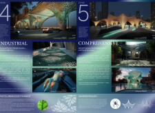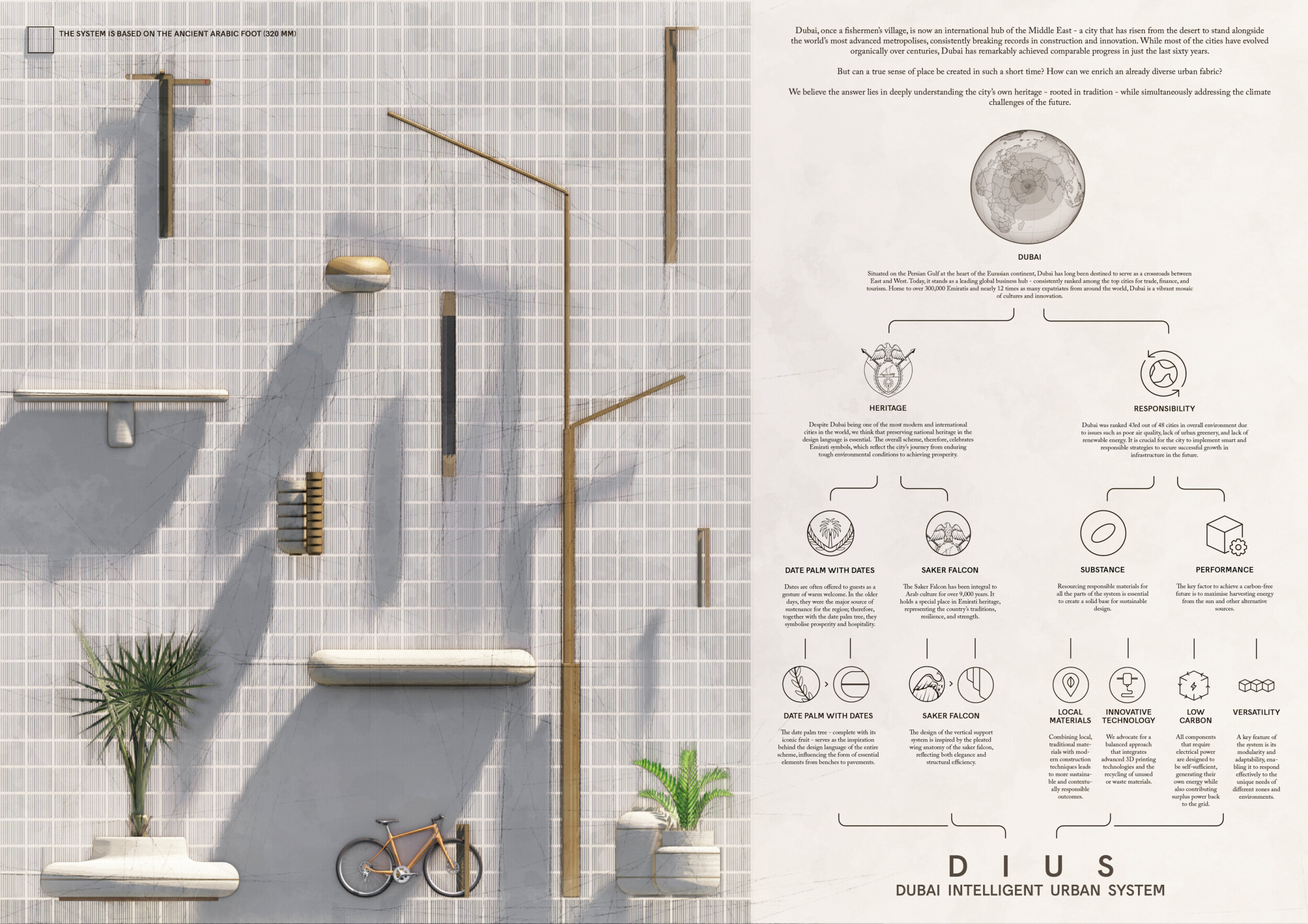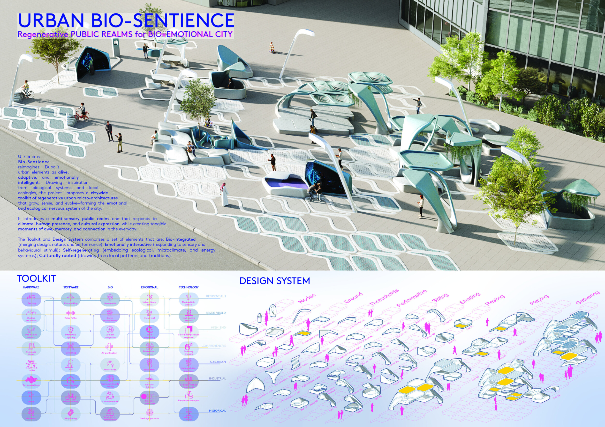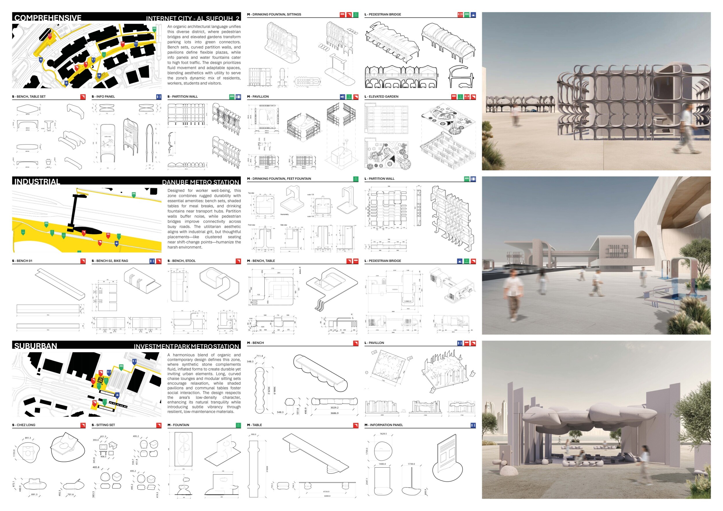 The Dubai Intelligent Urban System (DIUS) outlines a coherent family of modular elements spanning lighting, seating, paving, greenery, and signage, developed around a 280mm grid derived from the ancient Arabic foot. The proposal emphasizes flexibility, local materials, and reduced carbon footprint through interchangeable components that adapt across seven urban zones. Read more Street furniture incorporates renewable and recycled materials, with solar-powered lighting, kinetic shading systems, and seating integrated with planters and bike racks. A consistent formal language based on soft curves and minimal joints links elements like smart lampposts, pedestrian lights, and multifunctional benches. Shading devices track the sun, paving materials embed recycled glass and aggregates, and greenery modules support biodiversity and cooling. The system also enhances existing structures with bio-reactive algae tiles and upgraded underpass walls, offering a comprehensive, scalable design for future-ready urban infrastructure.
