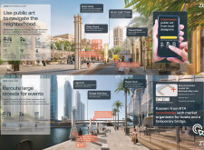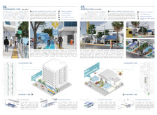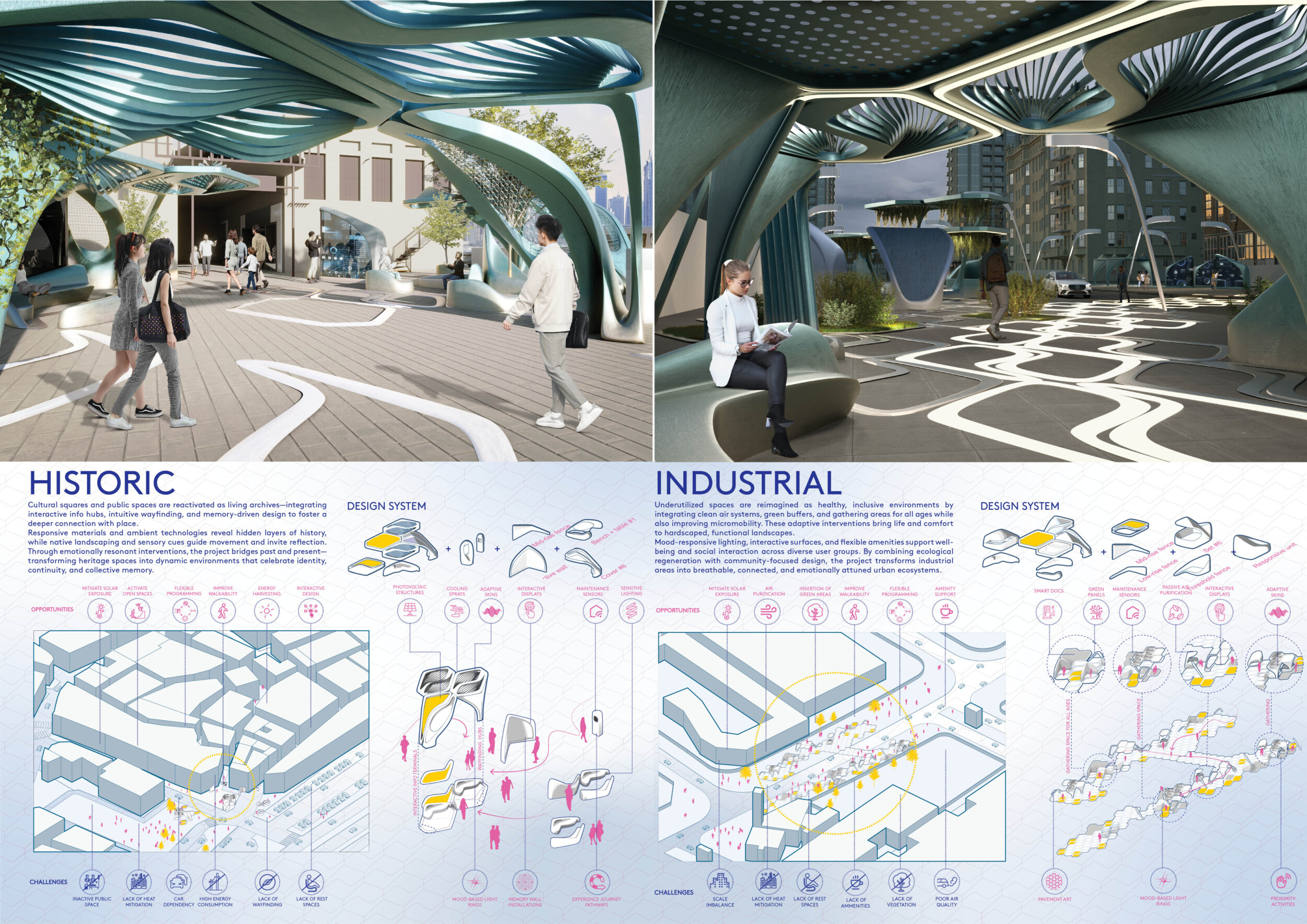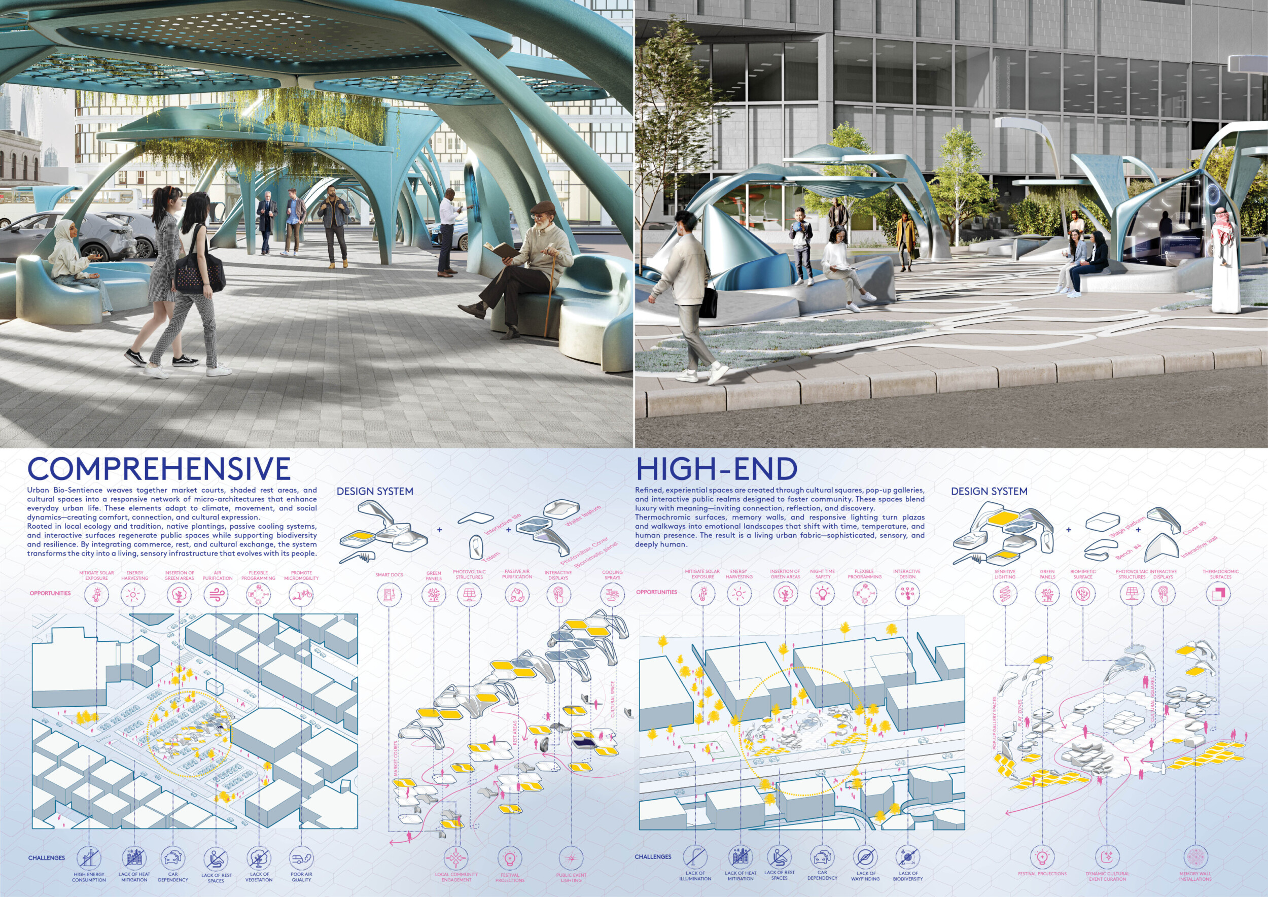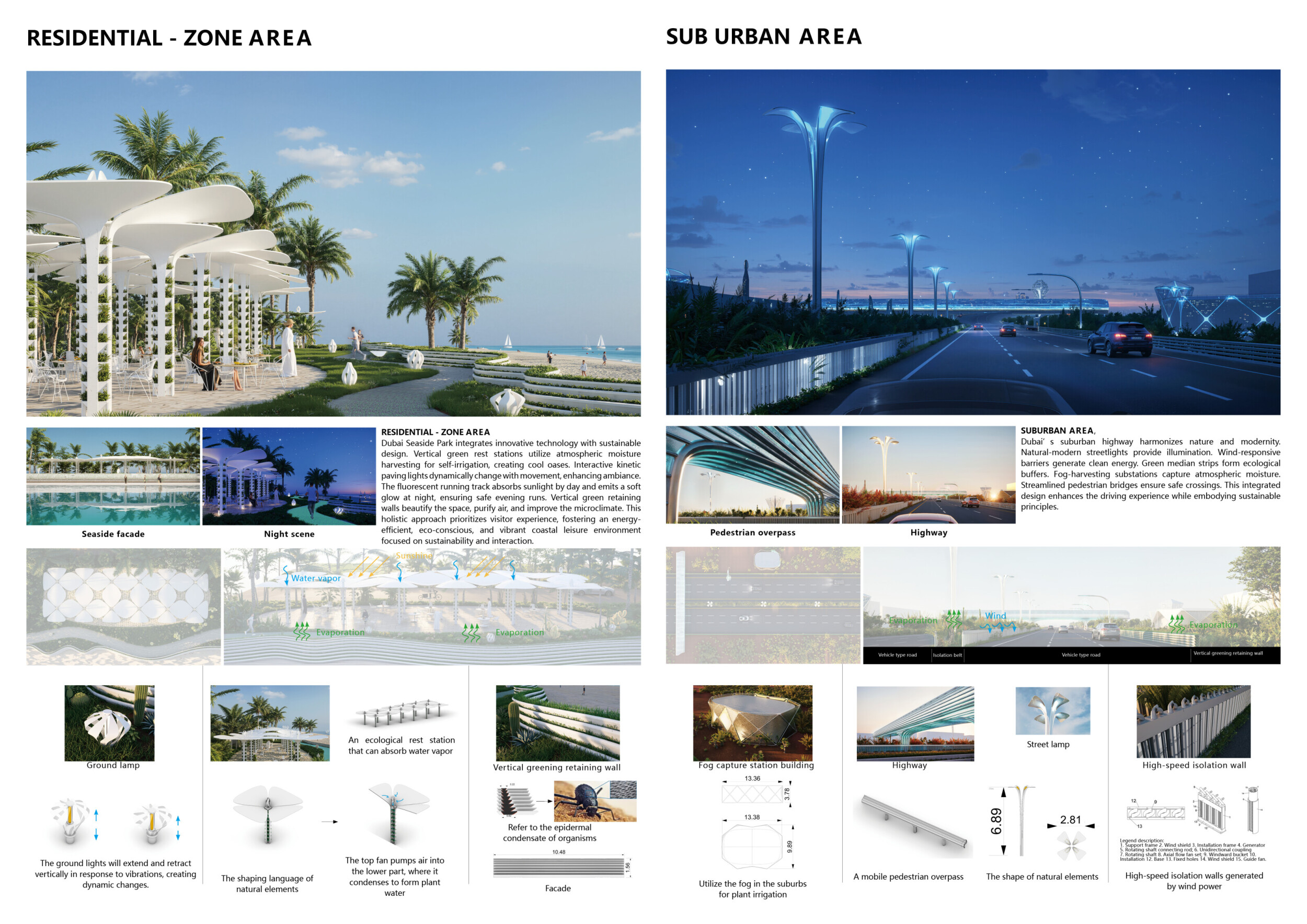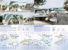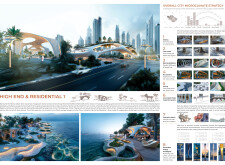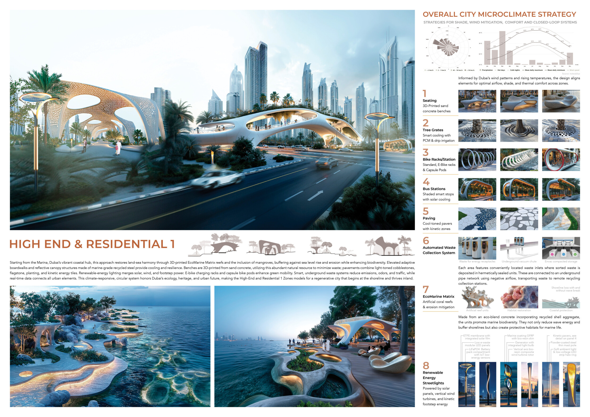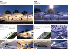 The Dubai Intelligent Urban System (DIUS) outlines a coherent family of modular elements spanning lighting, seating, paving, greenery, and signage, developed around a 280mm grid derived from the ancient Arabic foot. The proposal emphasizes flexibility, local materials, and reduced carbon footprint through interchangeable components that adapt across seven urban zones. Read more Street furniture incorporates renewable and recycled materials, with solar-powered lighting, kinetic shading systems, and seating integrated with planters and bike racks. A consistent formal language based on soft curves and minimal joints links elements like smart lampposts, pedestrian lights, and multifunctional benches. Shading devices track the sun, paving materials embed recycled glass and aggregates, and greenery modules support biodiversity and cooling. The system also enhances existing structures with bio-reactive algae tiles and upgraded underpass walls, offering a comprehensive, scalable design for future-ready urban infrastructure.