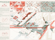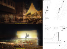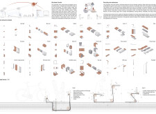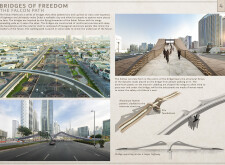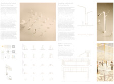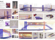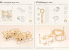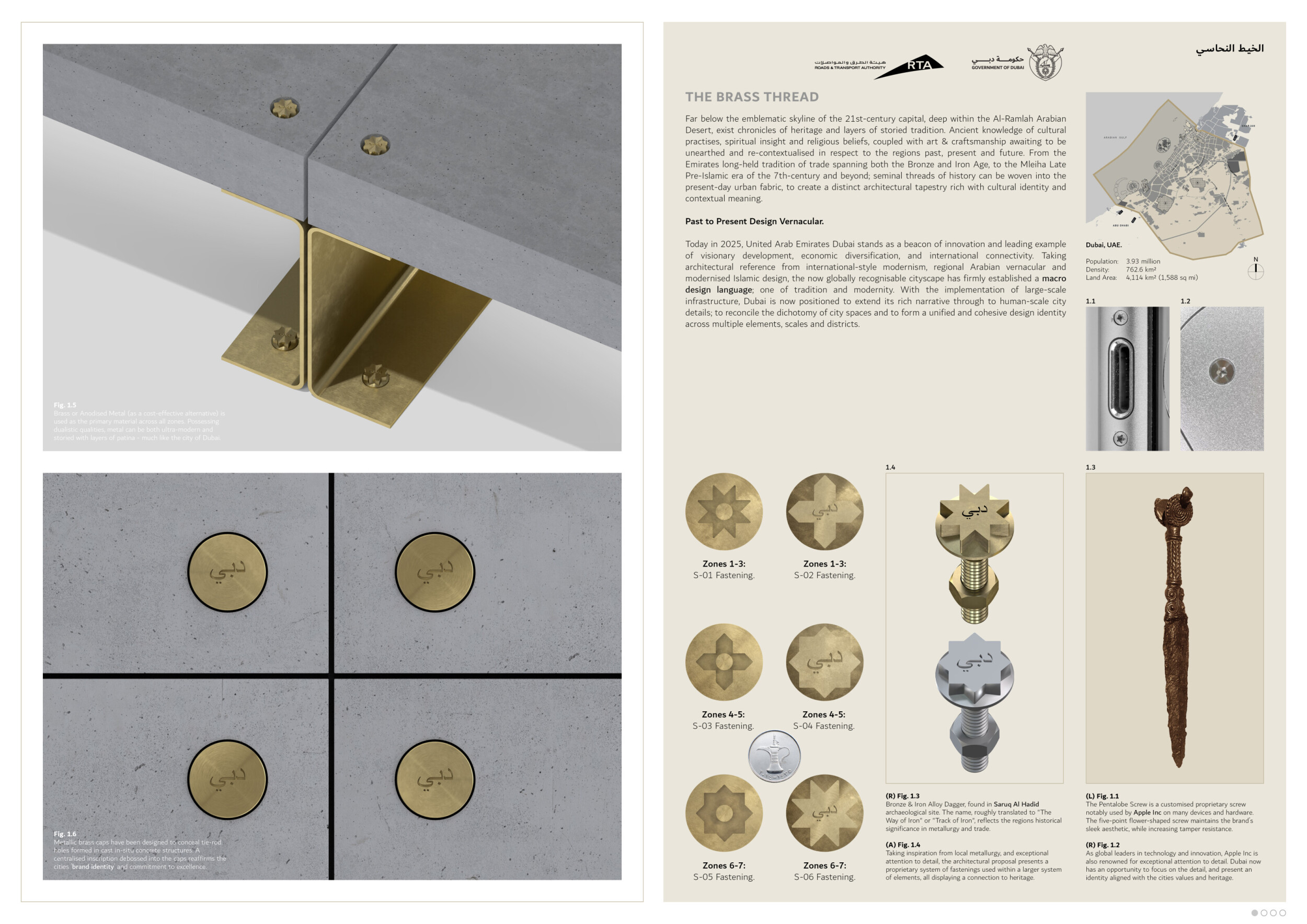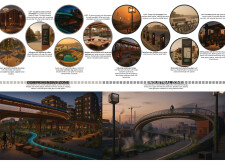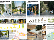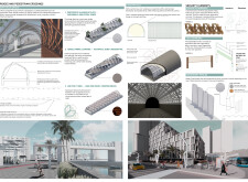 The Brass Thread proposes a network of public realm elements unified through a distinctive brass fastener system used across benches, bins, signage, and lighting components. Drawing on geometric motifs and archeological references, the design integrates materials such as concrete, granite, and anodized metal, with each element tailored to its context. Read more Pavement units use modular cobblestones marked with etched motifs, while benches incorporate recessed metal panels to display context-specific patterns. Signage and lighting columns adopt shared proportions and detailing, with provisions for solar power and LED integration. A modular bridge structure employs diamond-shaped segments with interchangeable cladding, and underpass panels are configured to conceal infrastructure while introducing ambient lighting and cultural ornamentation.