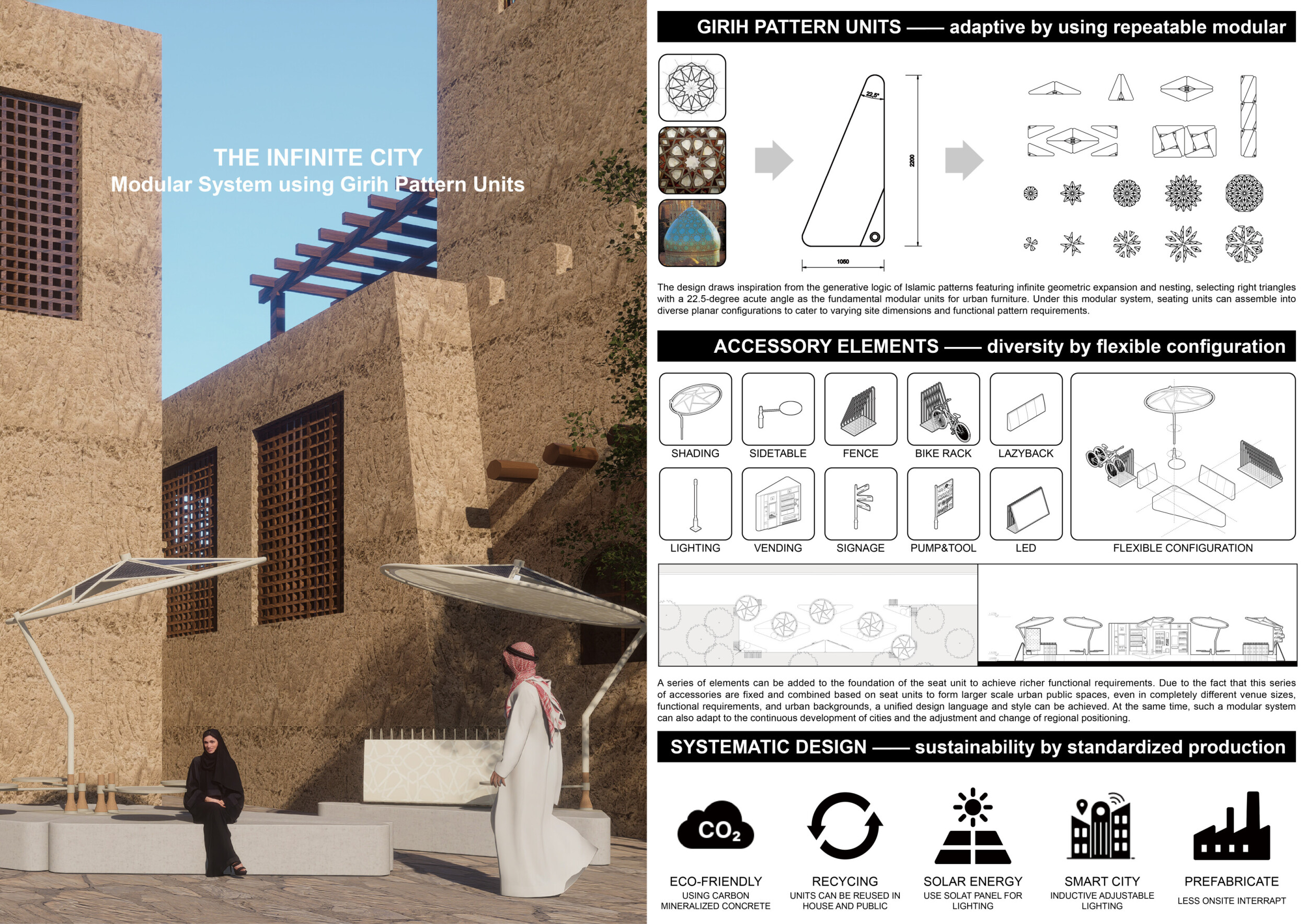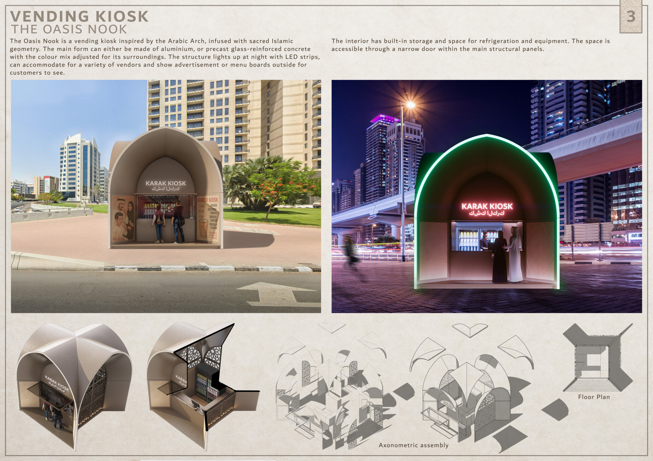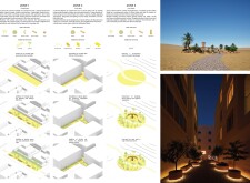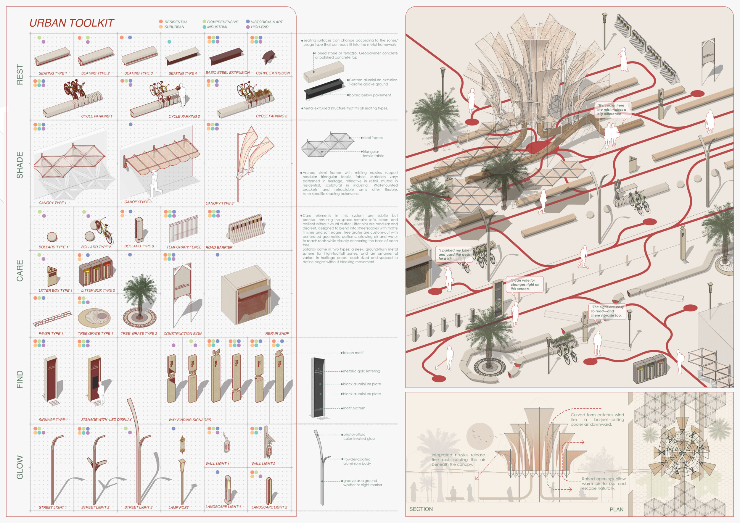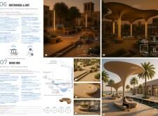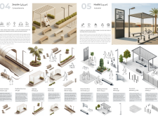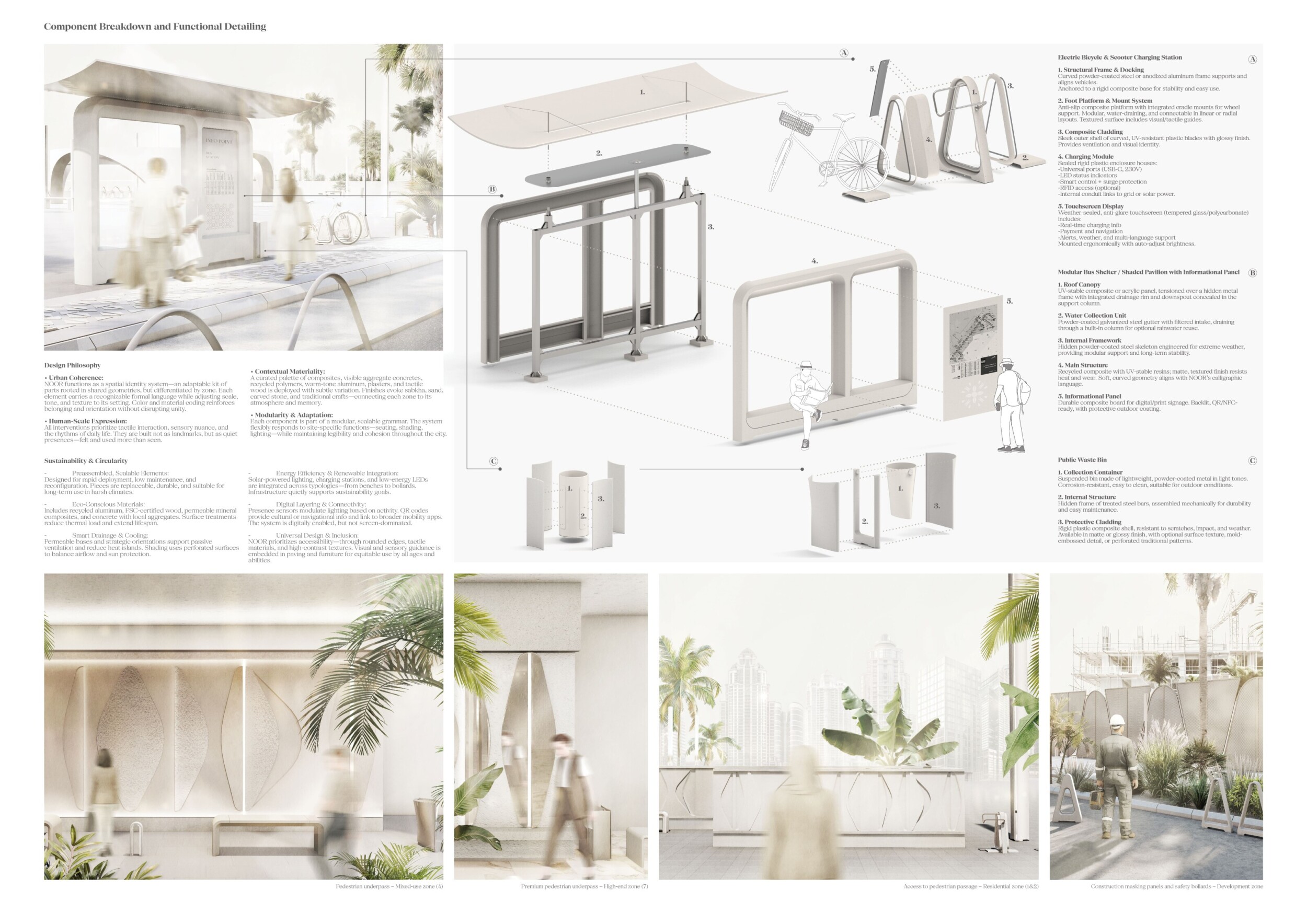 NOOR presents a modular urban furniture system unified by soft geometries, chamfered profiles, and a restrained palette of textured concrete, sand-cast aluminum, and translucent surfaces. Tailored to seven distinct urban zones, each element—from benches and bike racks to shaded shelters and signage—is calibrated to local conditions through material variation and compositional hierarchy. Read more Drawing inspiration from vernacular architecture and the shadow-play of mashrabiya and arcades, the design emphasizes visual lightness, clarity, and civic dignity. A suite of shaded resting areas, water-harvesting canopies, and integrated charging stations supports pedestrian comfort and climate responsiveness. Public amenities feature tactile surfaces and inclusive details to support wayfinding, safety, and narrative engagement. Components are standardized for mass production, durability, and reconfiguration, with a systemic design language that enables both repetition and adaptation.
