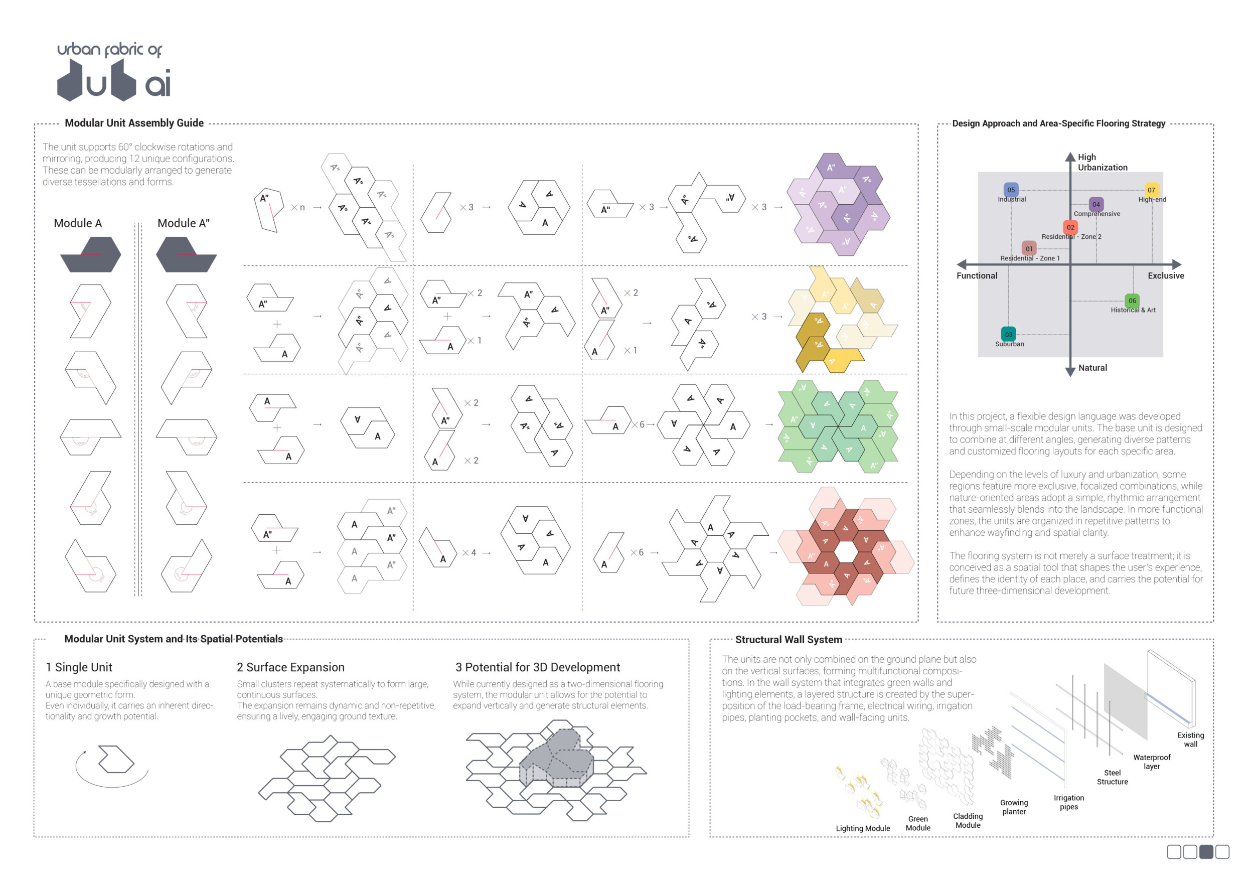 The “Urban Fabric of Dubai” is a modular public realm system designed to unify the city’s diverse neighborhoods through a shared spatial language rooted in Dubai’s dual identity of futuristic ambition and desert heritage. Using two interlocking base tiles rotated and mirrored in 60° increments, the design generates twelve tessellation configurations that define surfaces, vertical structures, and 3D modules across the seven distinct urban typologies. Read more Each area features a customized material palette (stone, brick, concrete, plaster, brass, metal) and unique modular components such as seating, lighting, bike racks, green walls, and playgrounds, tailored to local needs and context. A full-scale flooring strategy maps these typologies across Dubai’s territory, defining transitions and wayfinding through patterns, textures, and vegetation. With potential for 3D structural expansion, this proposal positions flooring not as surface treatment but as connective tissue linking place, identity, and user experience.