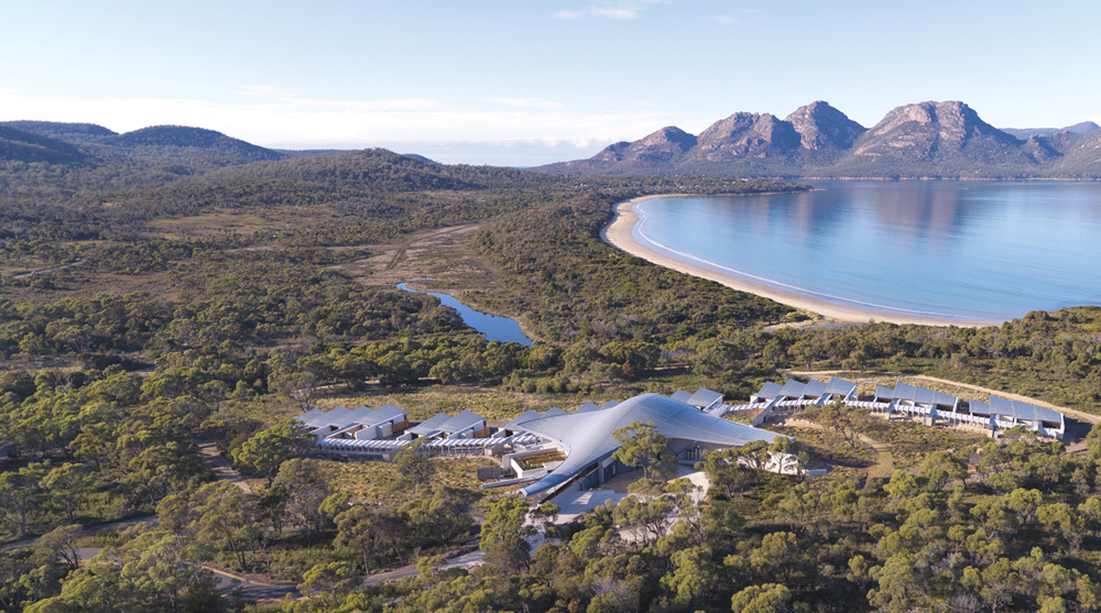 The Saffire Resort is fitted with a complex rainwater harvesting system that keeps the grounds watered while also protecting them from potential bushfires. Guests are treated to incredible views of the landscape and mountains of Oyster Bay, as well as a connection and better understanding of the environment that the resort itself helped to rebuild and protect.