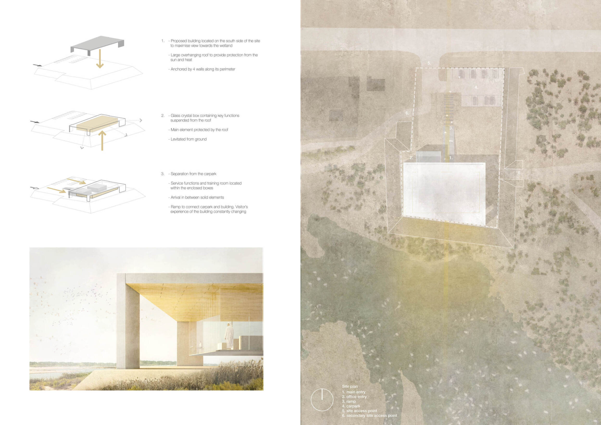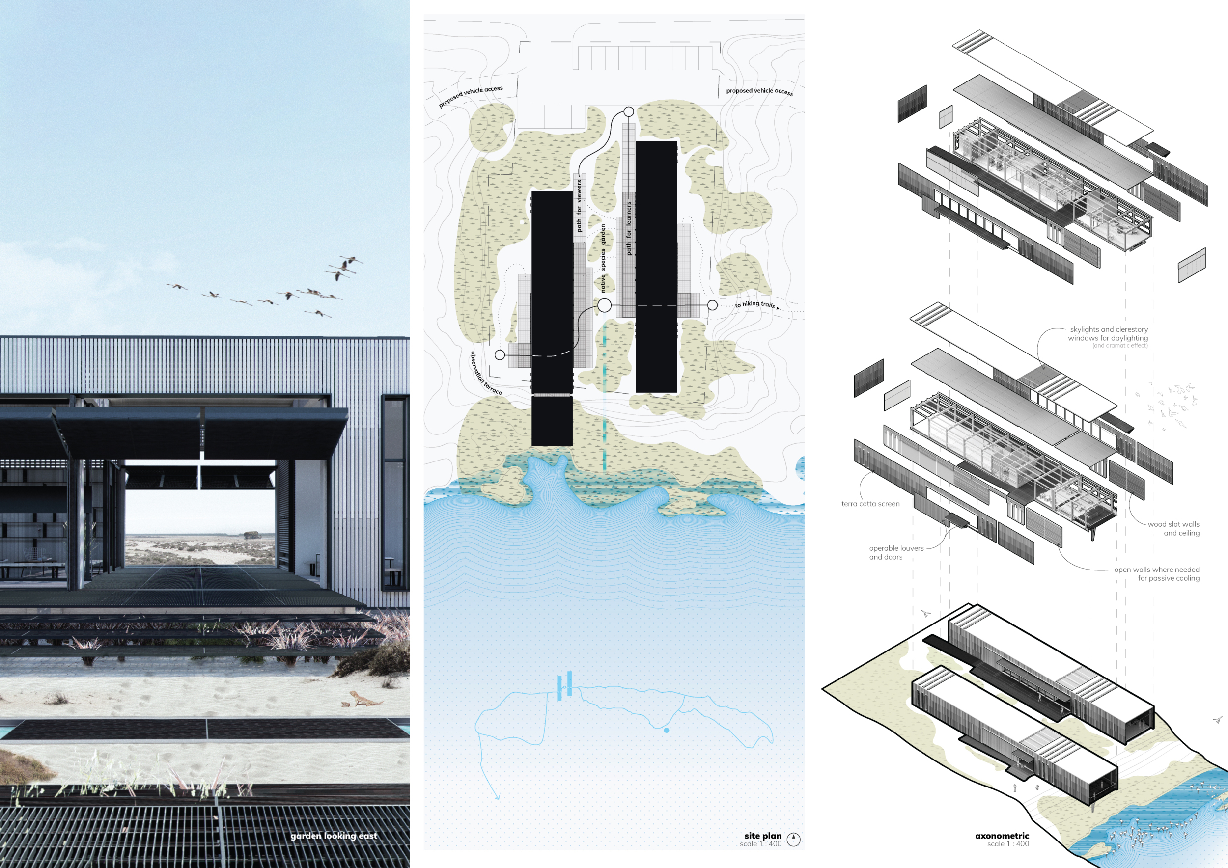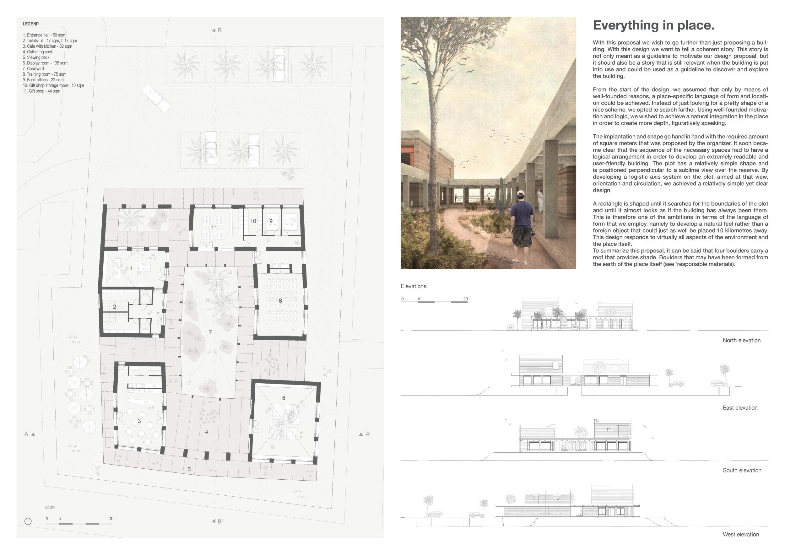 The jury sought designs with sustainability and constructability in mind. Above all, the designs were judged positively if they showed respect for the reserve’s fragile ecosystem. The visitor center is to be both a subtle building in harmony with its context, as well as an iconic architectural landmark.