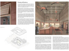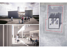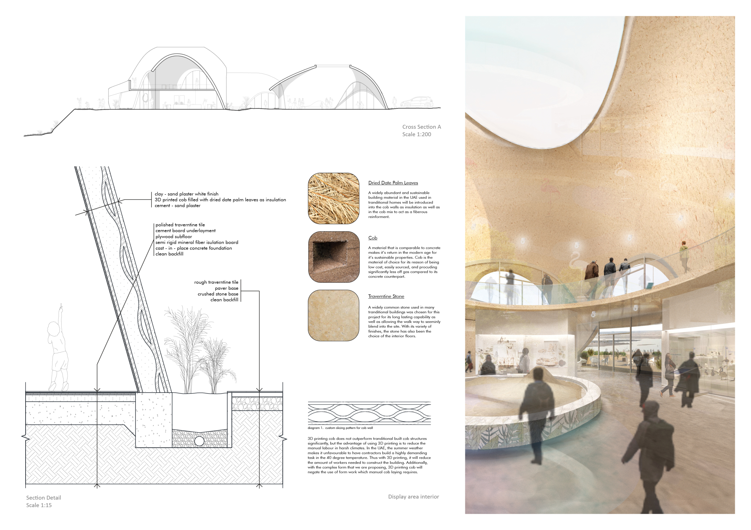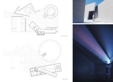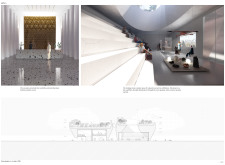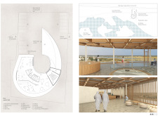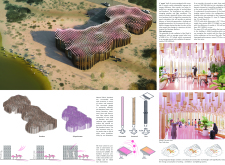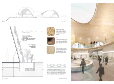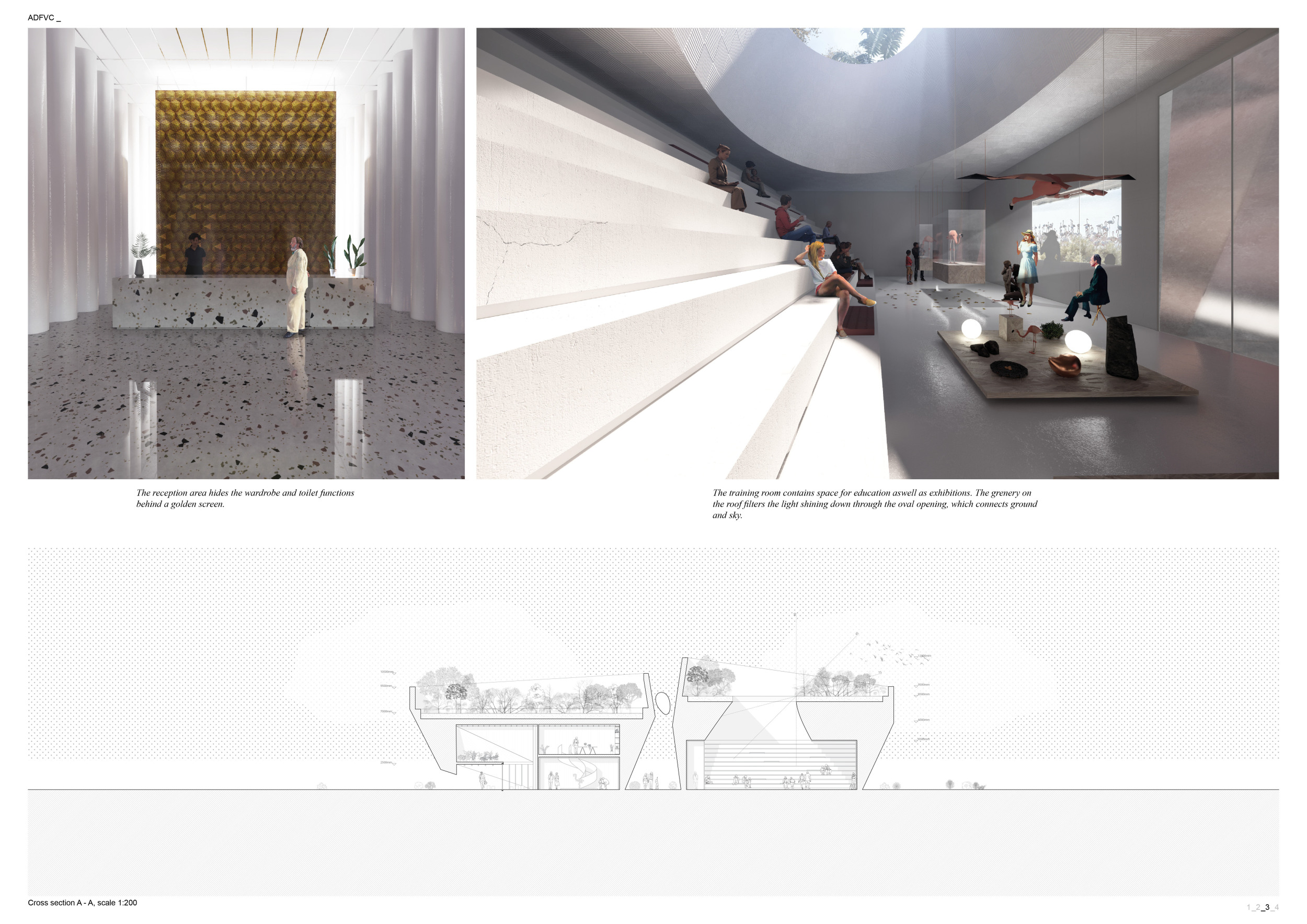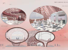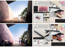 Incubator imagines a rich interior universe sheltered by a delicate shell and an oculus that opens up to the site in a dramatic way. The inner world with point lights, murals, ramps and mini pavilions is convincing, and can be imagined to offer respite to visitors from the harsh exterior environment when needed. The overall form is powerful in its soft iconicity while the materiality anchors it to its context.