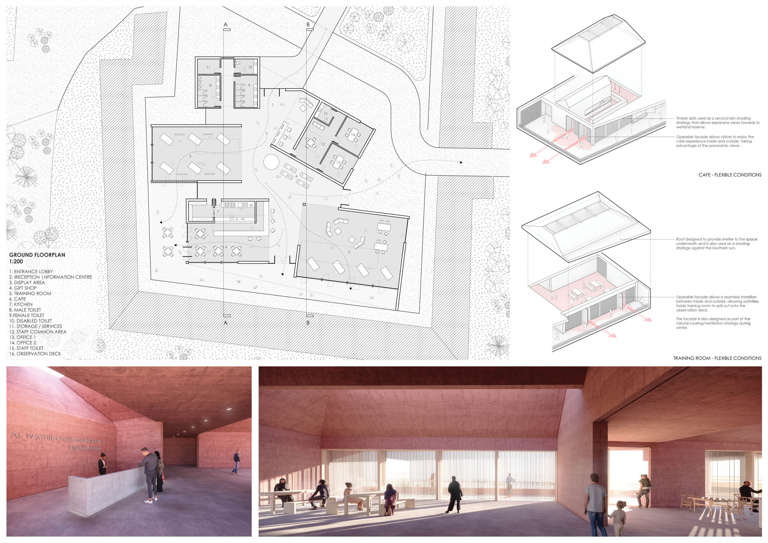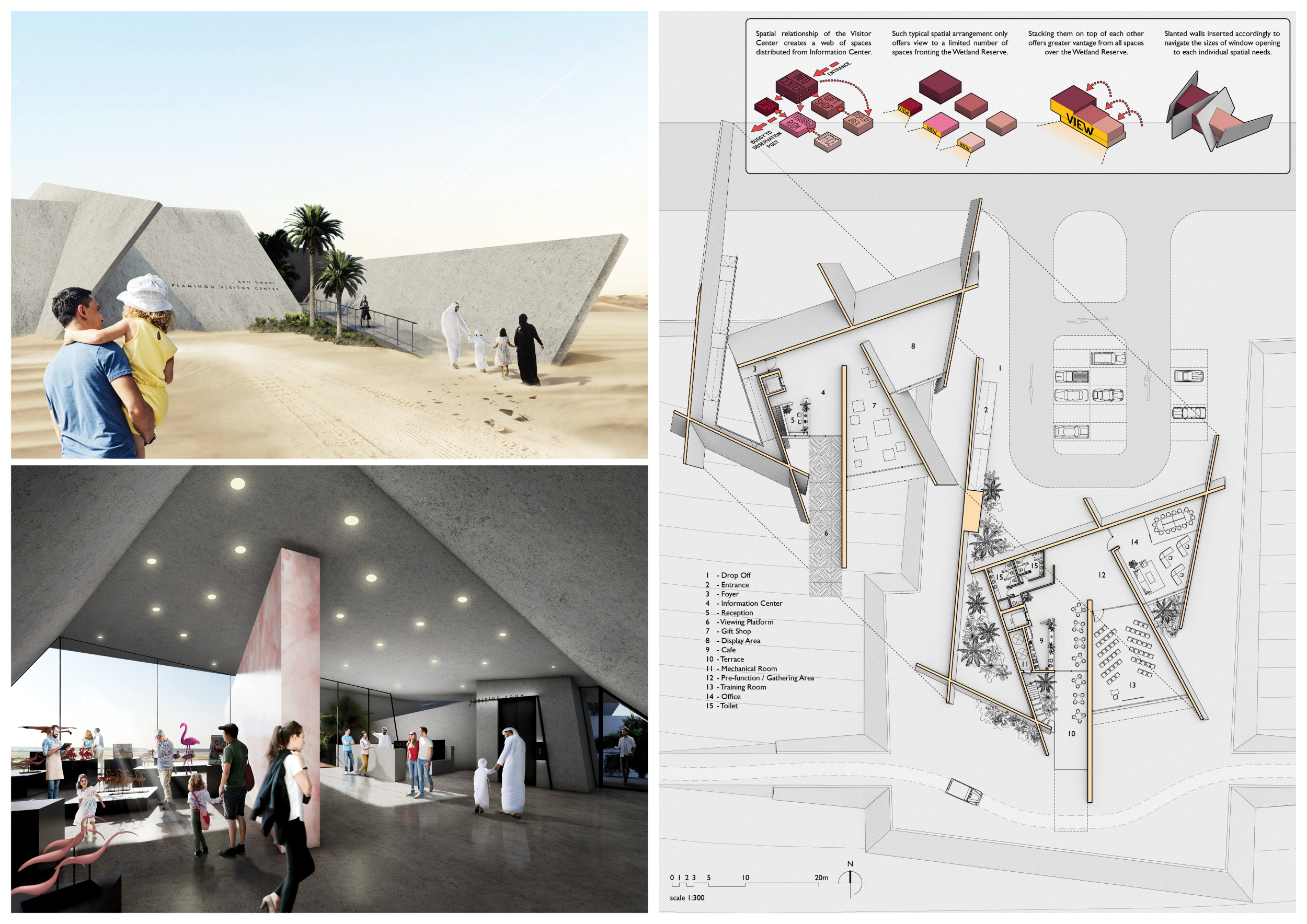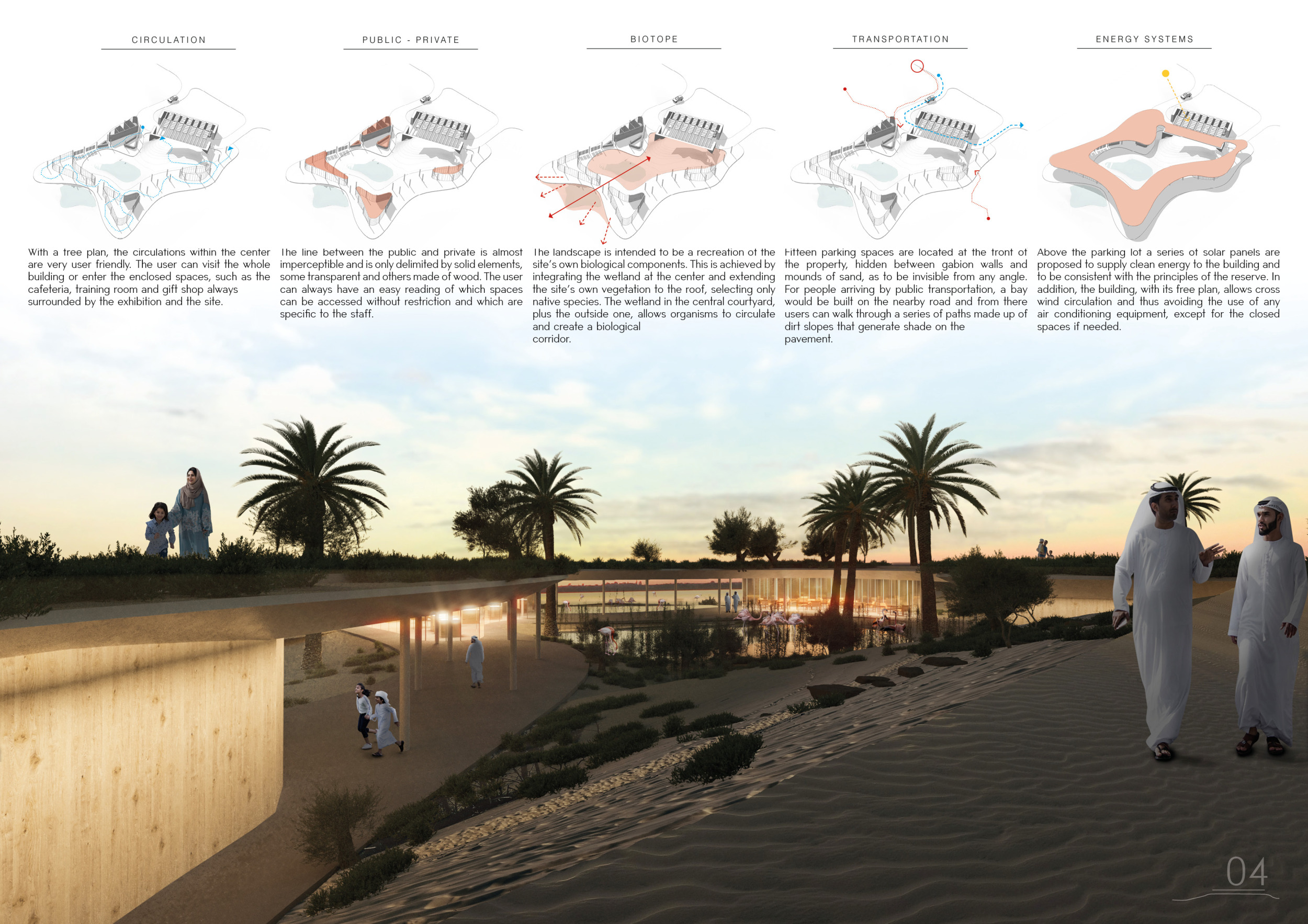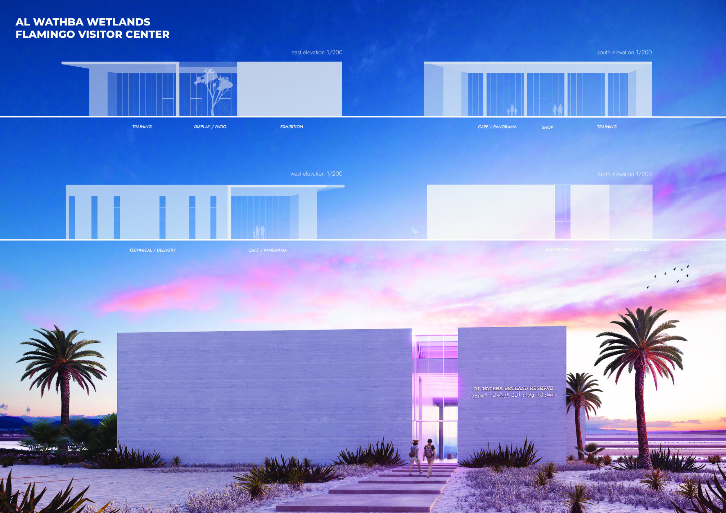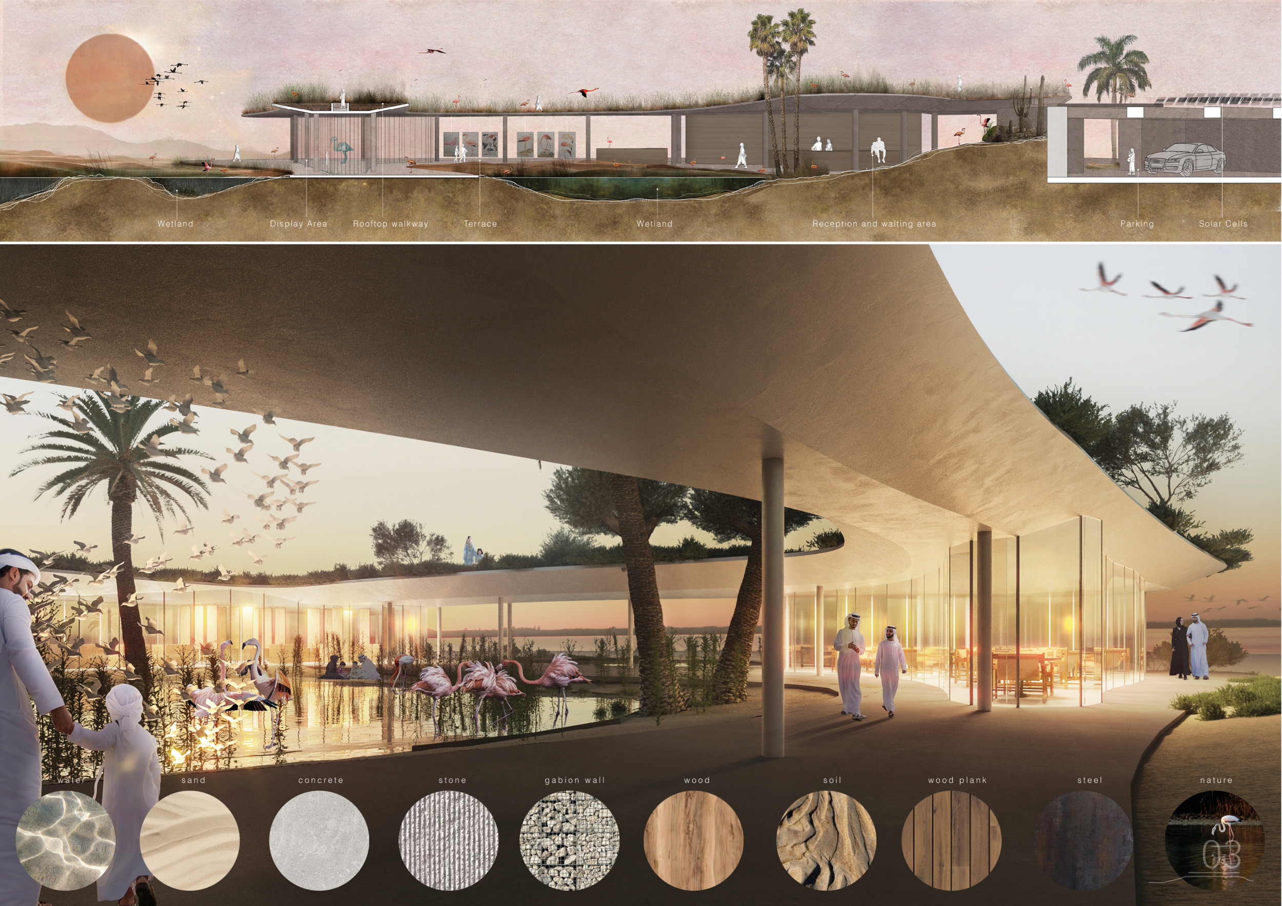 Competition participants were tasked with submitting concepts for a new visitor center, designed in balance with Al Wathba’s unique natural environment. The visitor center is to be programmed with facilities including an information center, cafe, terrace, souvenir shop, display area for specimens, training center, toilets, and a car park.