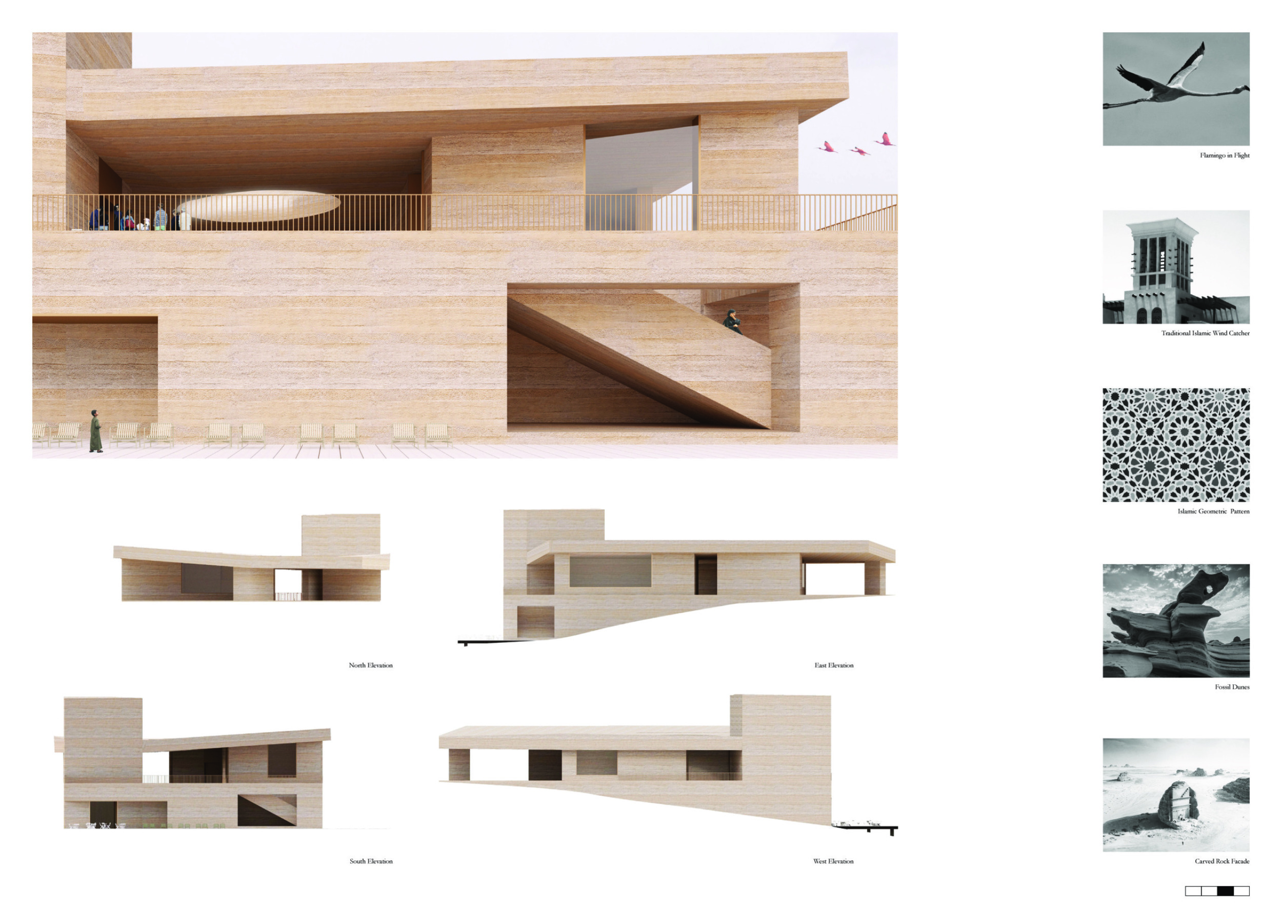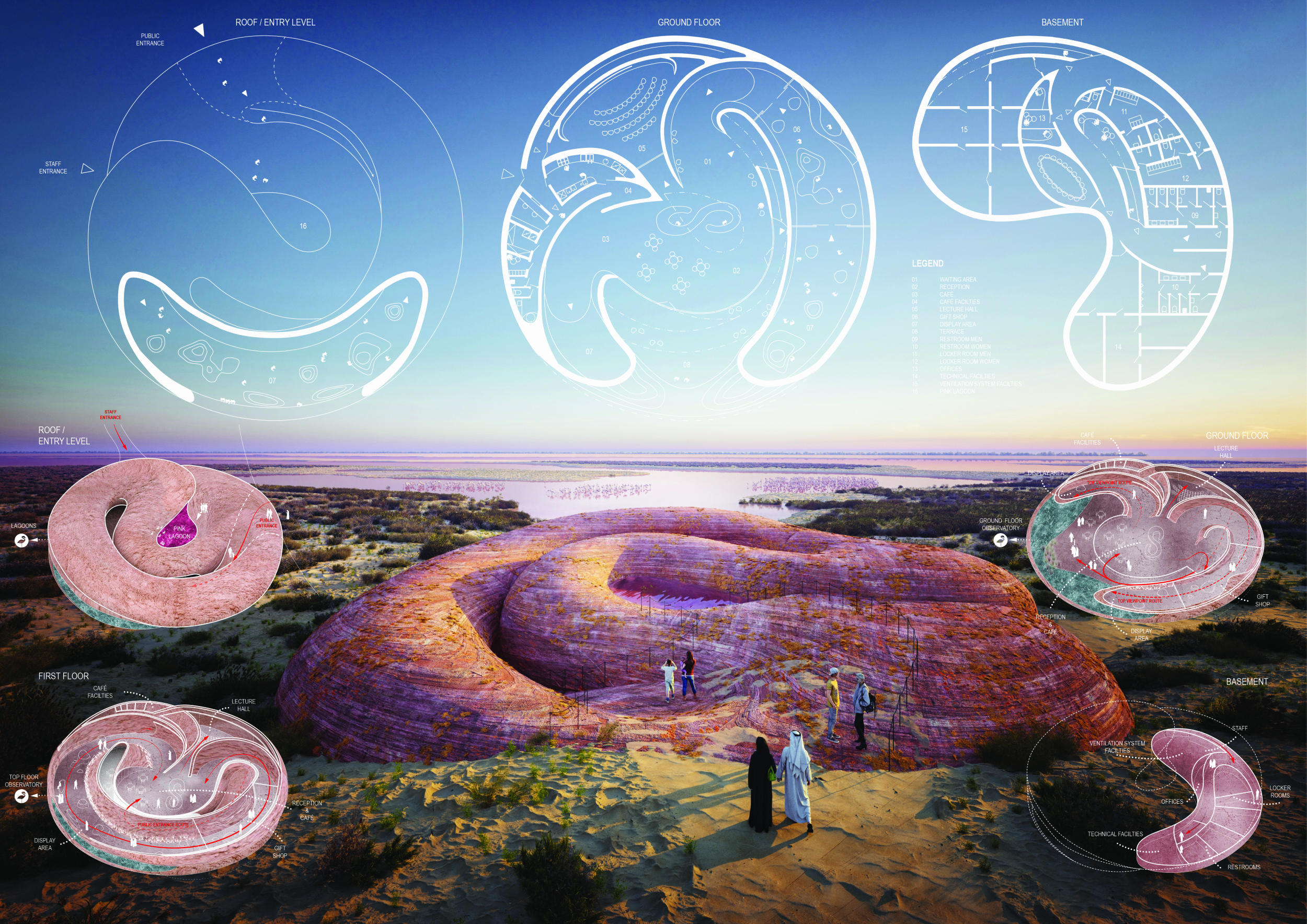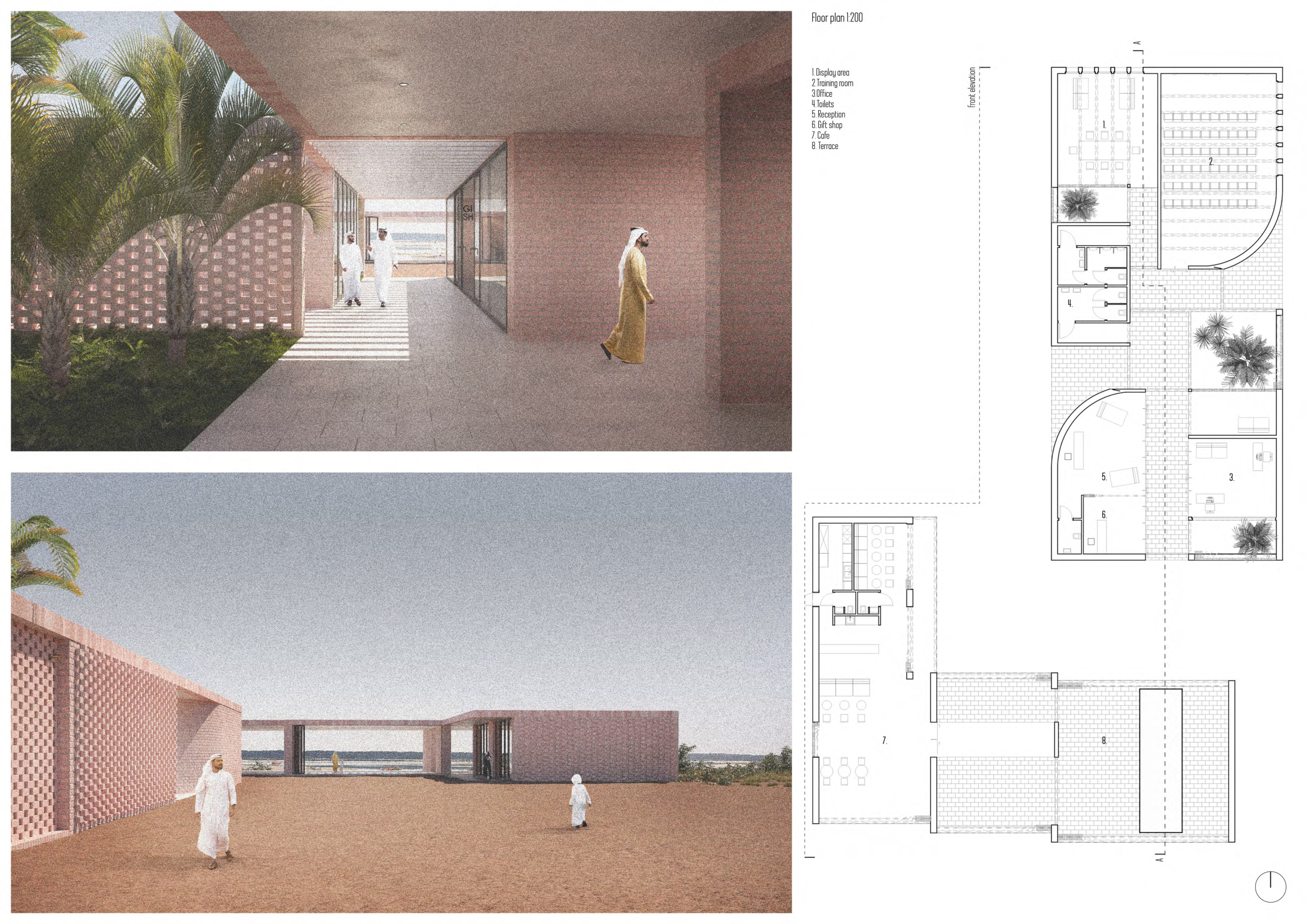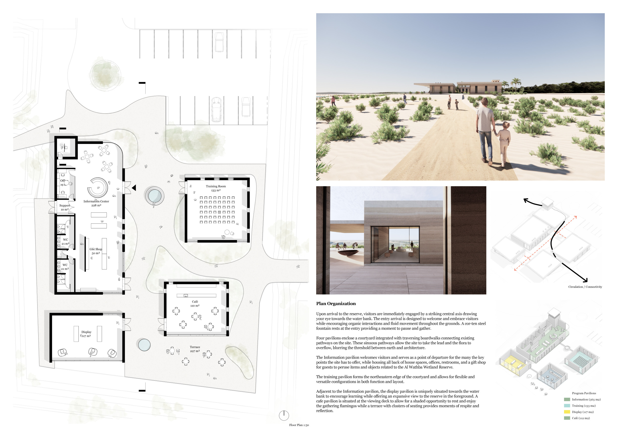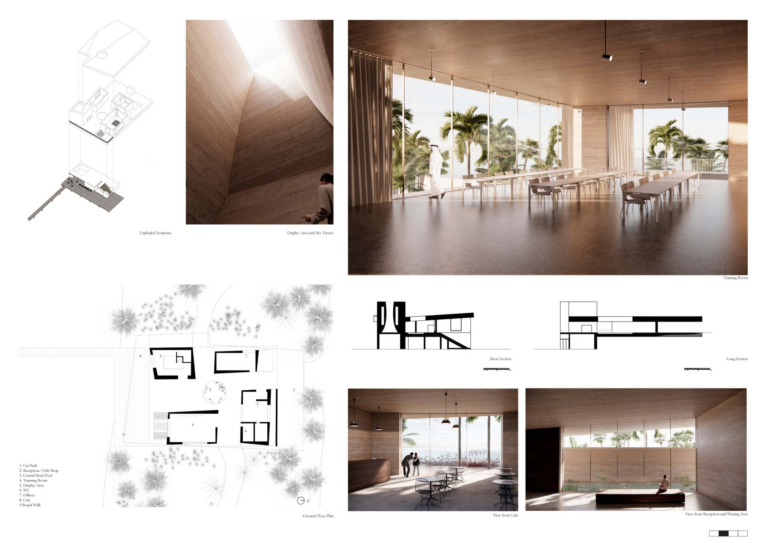 Competition participants were tasked with submitting concepts for a new visitor center, designed in balance with Al Wathba’s unique natural environment. The visitor center is to be programmed with facilities including an information center, cafe, terrace, souvenir shop, display area for specimens, training center, toilets, and a car park.