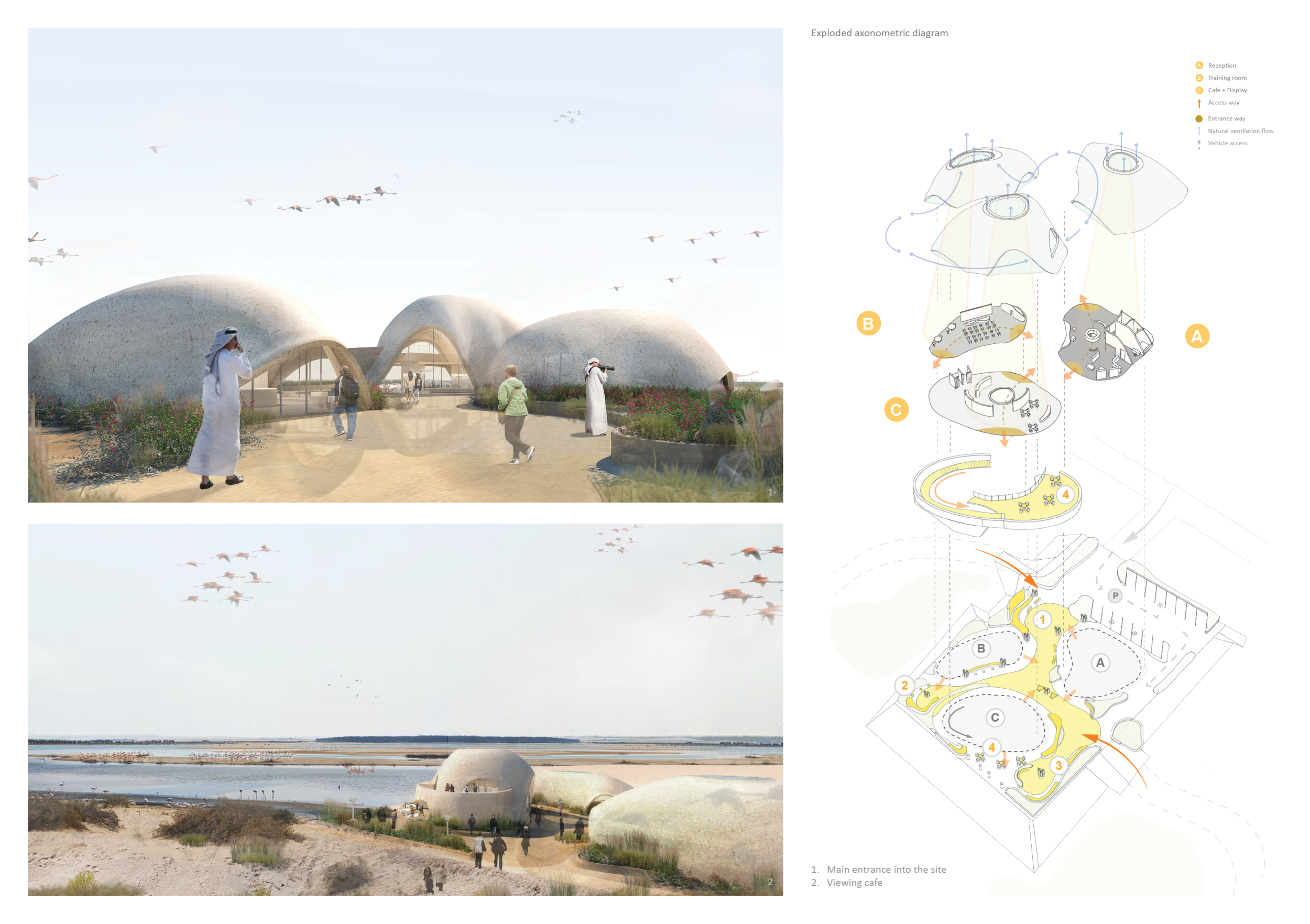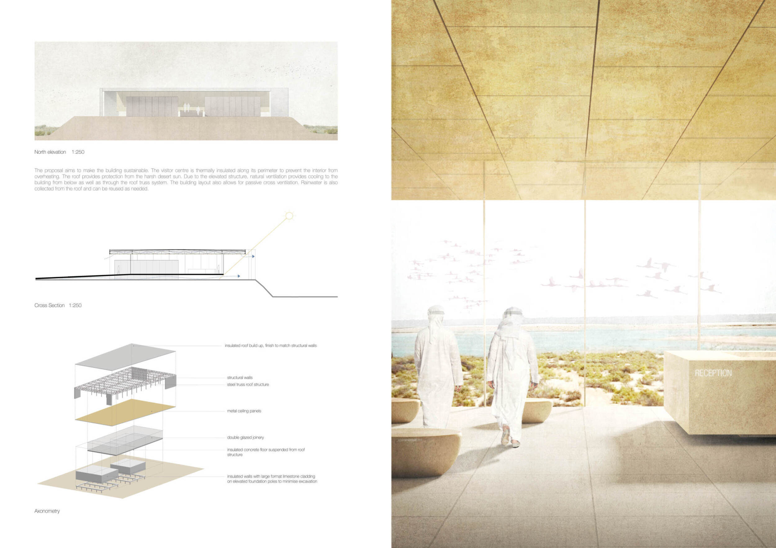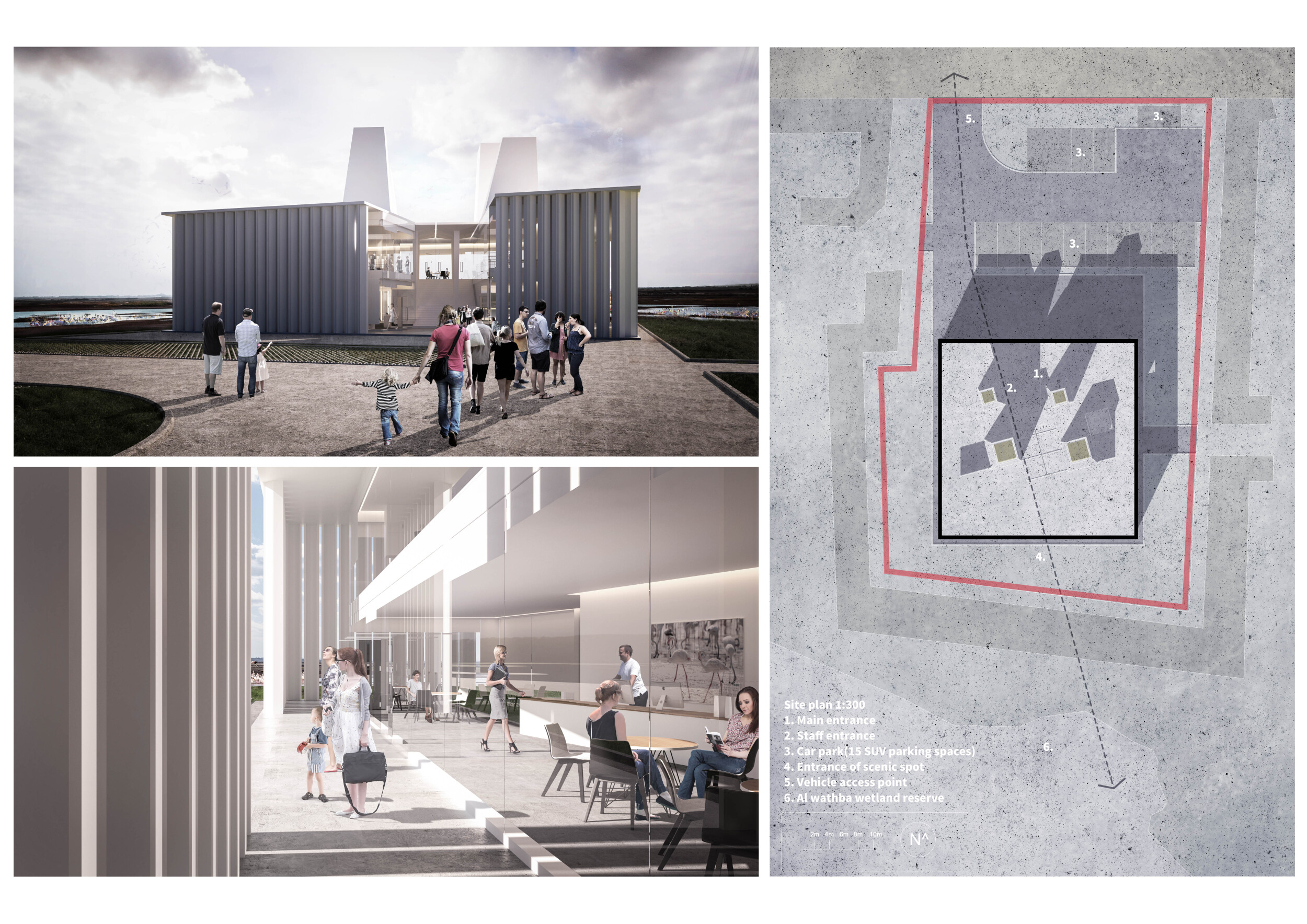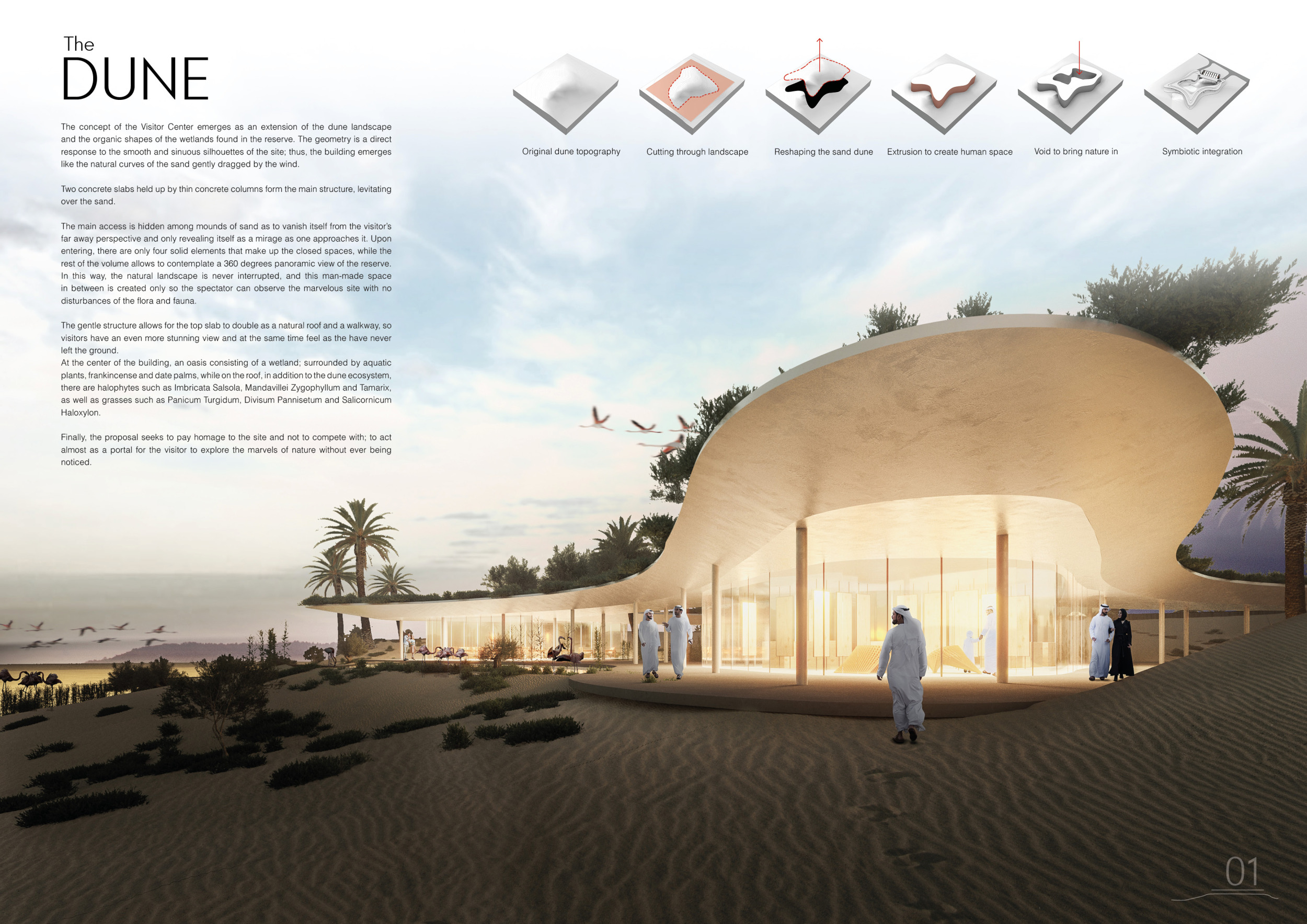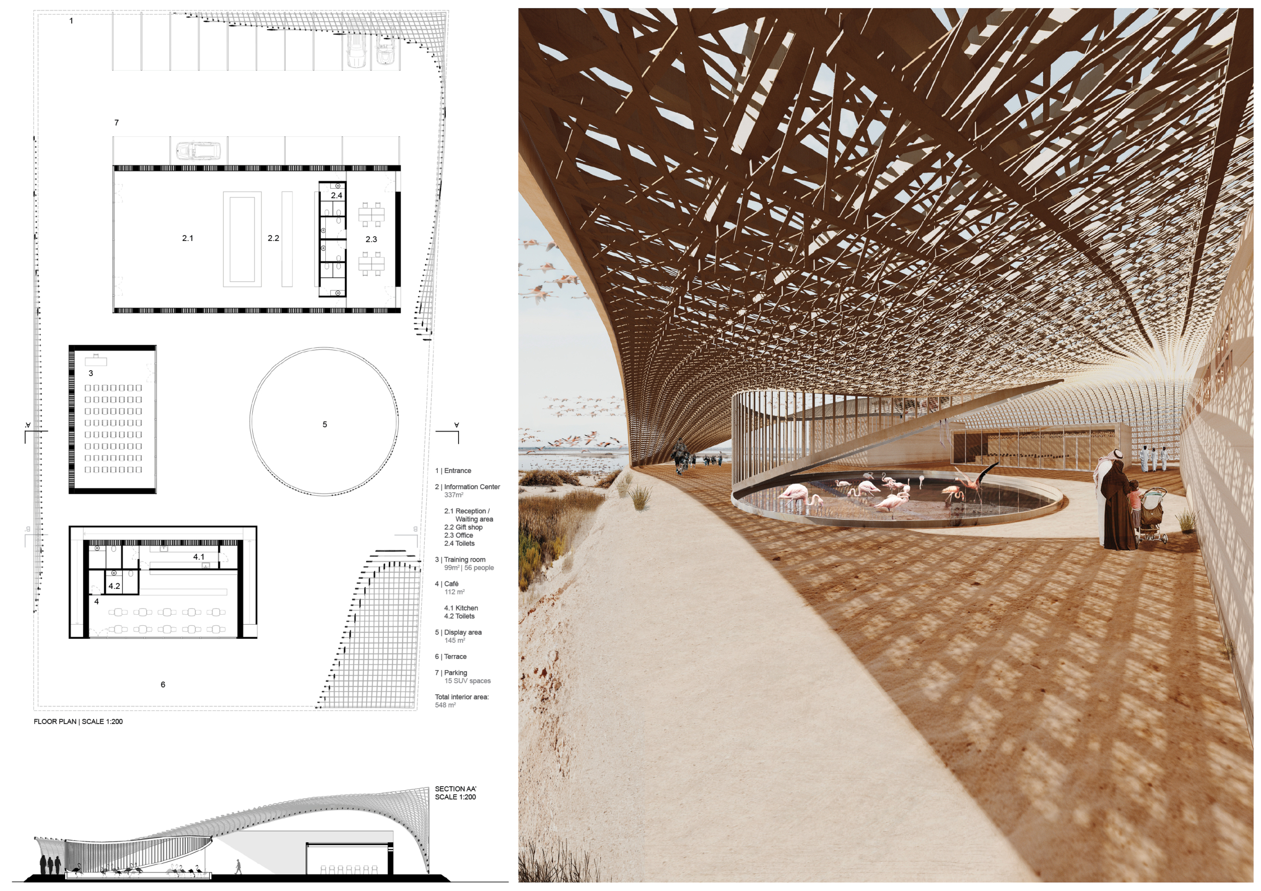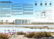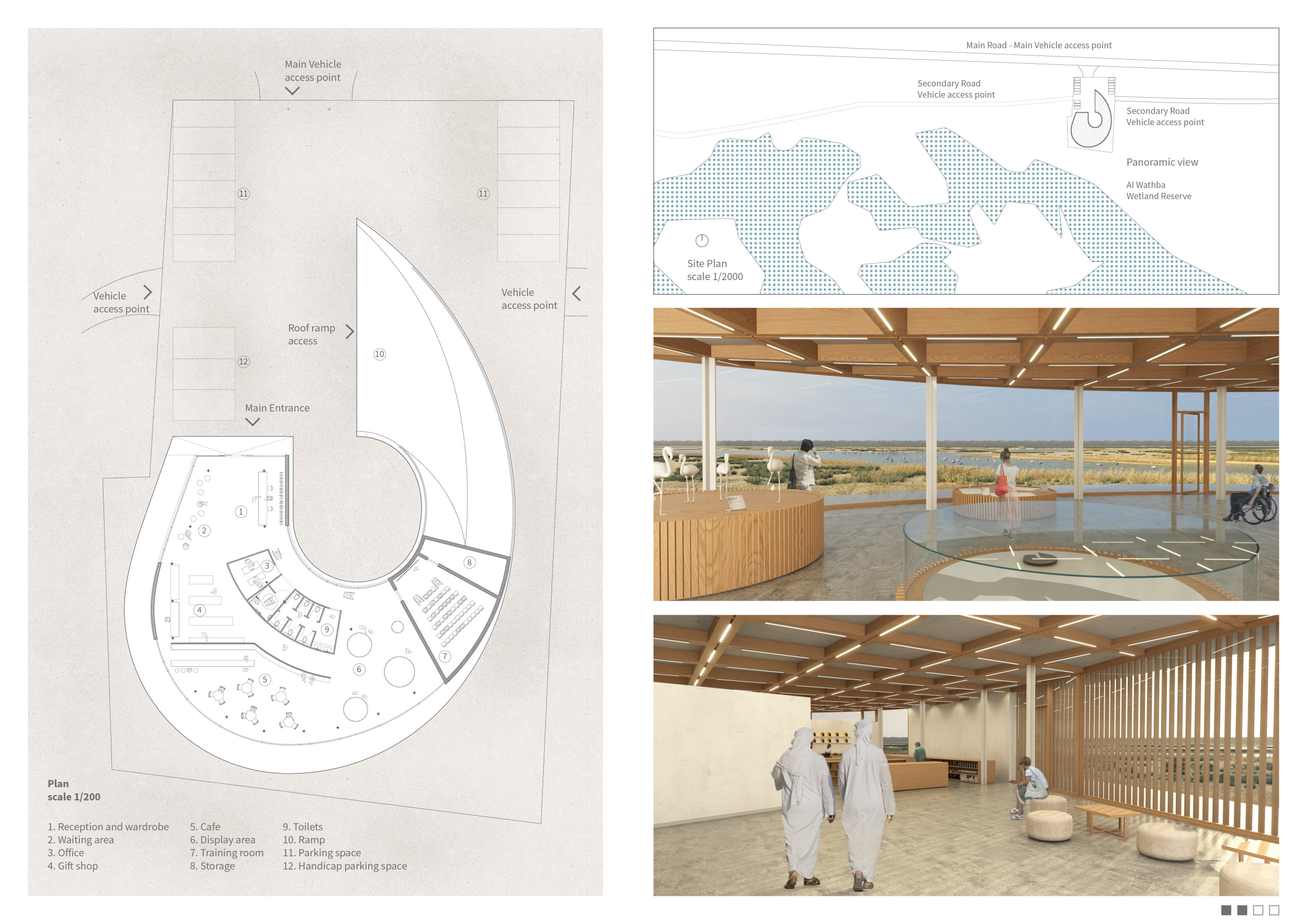 Competition participants were tasked with submitting concepts for a new visitor center, designed in balance with Al Wathba’s unique natural environment. The visitor center is to be programmed with facilities including an information center, cafe, terrace, souvenir shop, display area for specimens, training center, toilets, and a car park.
